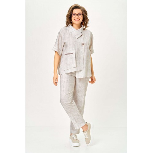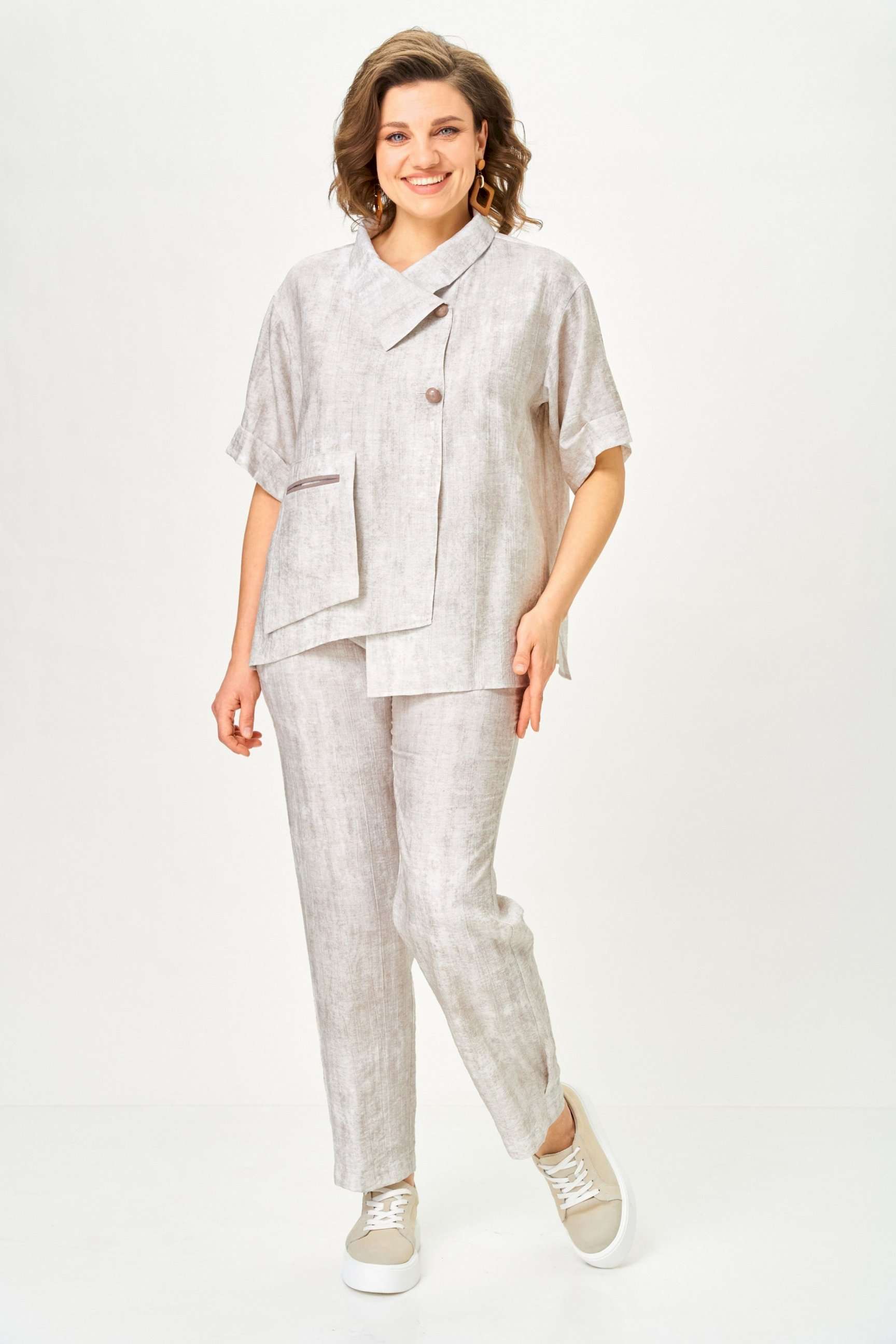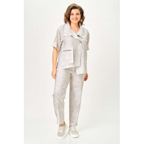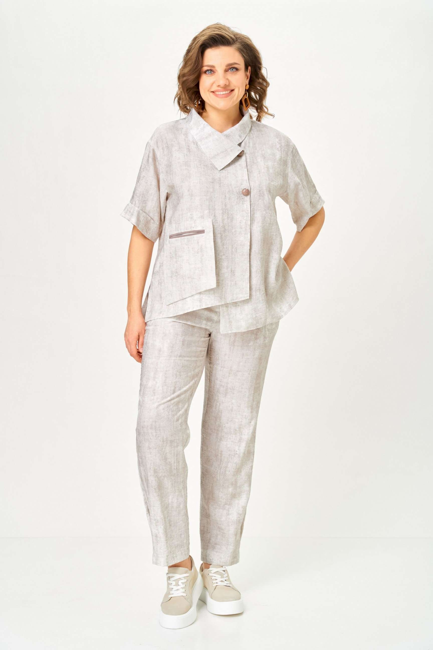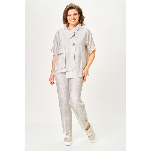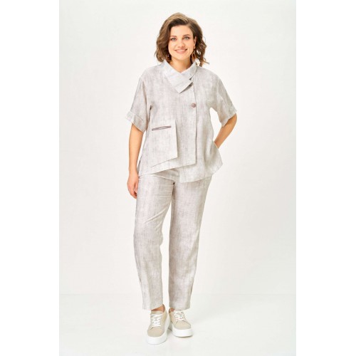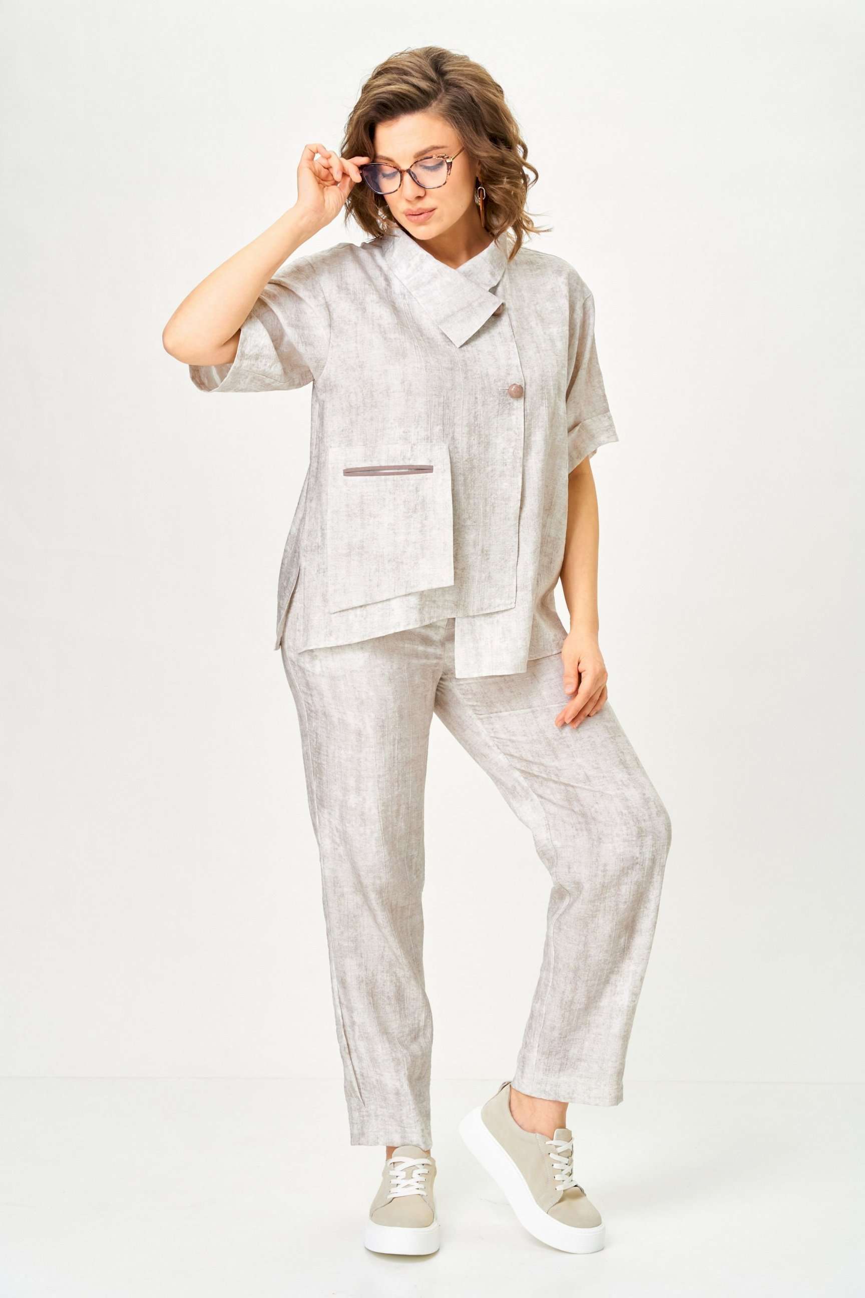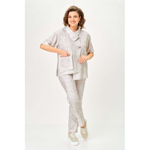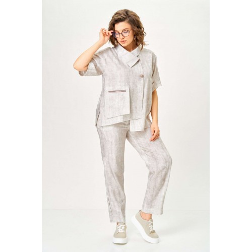Костюм женский двухпредметный, состоящий из блузы и брюк. Блуза со смещенной бортовой застежкой на 2 петли-пуговицы и 1 потайную пуговицу. Перед с накладным отлетным карманом с рамкой по правой части переда фигурной формы. Низ изделия по переду ассиметричной формы. Спинка с горизонтальной кокеткой и двумя односторонними складками. Изделие имеет спущенную линию плеча. Рукав короткий с односторонней застроченной складкой. Воротник с отложными концами. В боковых швах обработаны разрезы. Брюки с притачным поясом сзади на резинке и с завязками от боковых швов пояса. Застежка на петлю-пуговицу по поясу и тесьму-молнию в средних срезах передних половинок брюк. В изделии обработаны карманы, наклонные к боковому шву. Брюки классического кроя, слегка зауженные книзу за счет односторонней складки по низу бокового шва. Рамка кармана блузы и завязки по поясу выполнены из отделочной ткани.