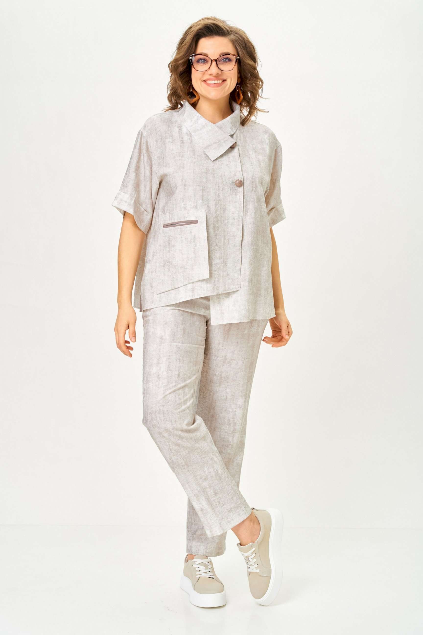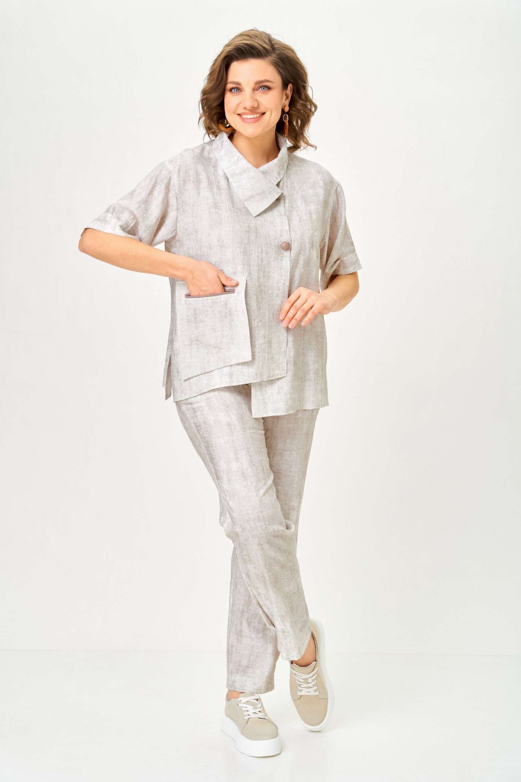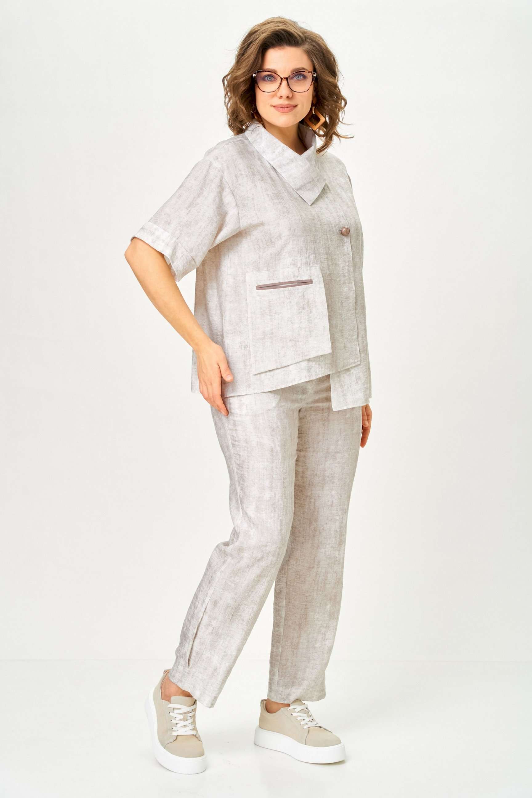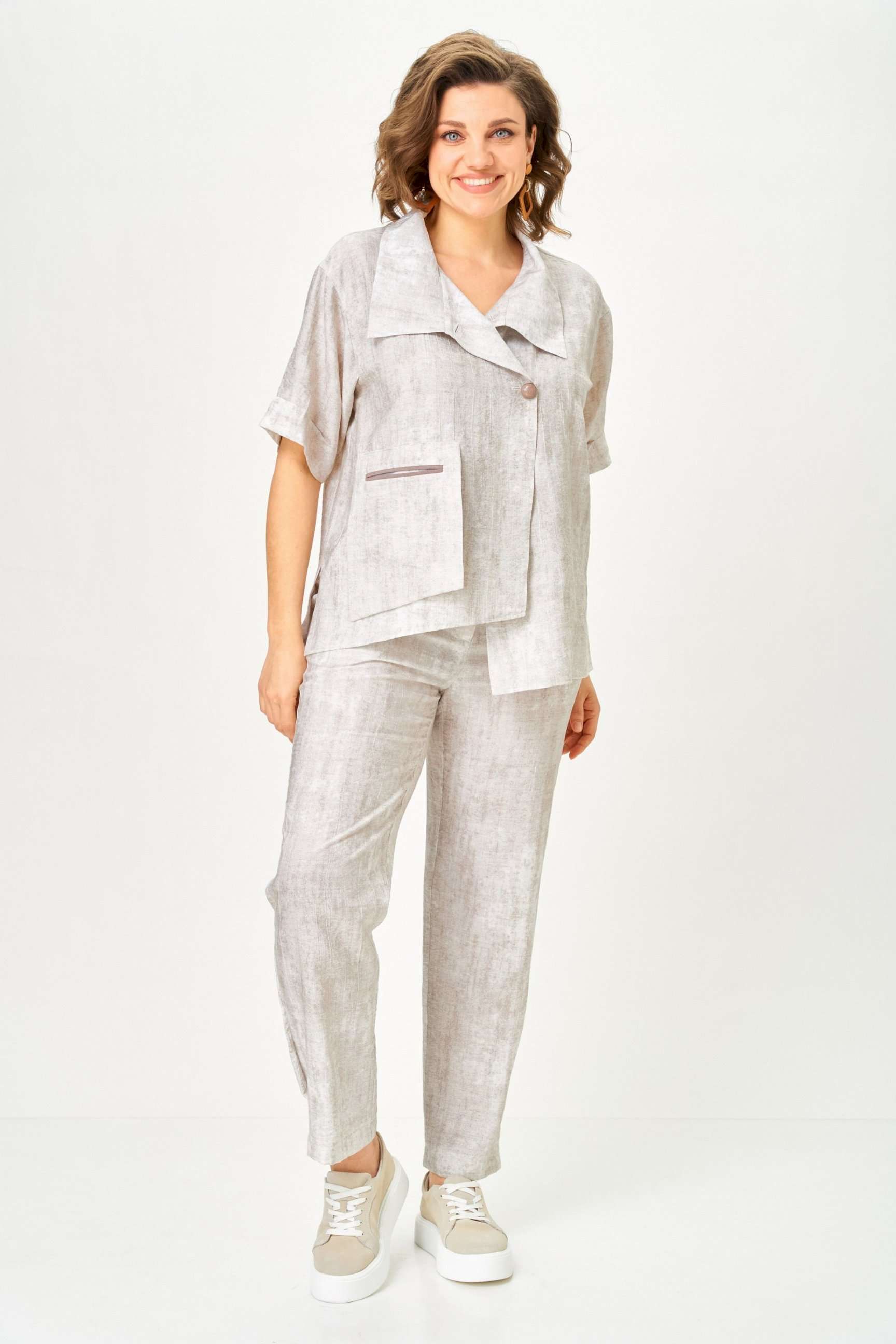 Костюм женский двухпредметный, состоящий из блузы и брюк. Блуза со смещенной бортовой застежкой на 2 петли-пуговицы и 1 потайную пуговицу. Перед с накладным отлетным карманом с рамкой по правой части переда фигурной формы. Низ изделия по переду ассиметричной формы. Спинка с горизонтальной кокеткой и двумя односторонними складками. Изделие имеет спущенную линию плеча. Рукав короткий с односторонней застроченной складкой. Воротник с отложными концами. В боковых швах обработаны разрезы. Брюки с притачным поясом сзади на резинке и с завязками от боковых швов пояса. Застежка на петлю-пуговицу по поясу и тесьму-молнию в средних срезах передних половинок брюк. В изделии обработаны карманы, наклонные к боковому шву. Брюки классического кроя, слегка зауженные книзу за счет односторонней складки по низу бокового шва. Рамка кармана блузы и завязки по поясу выполнены из отделочной ткани.