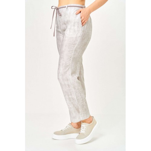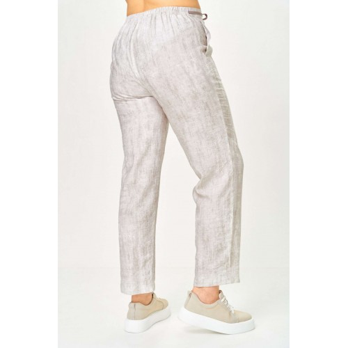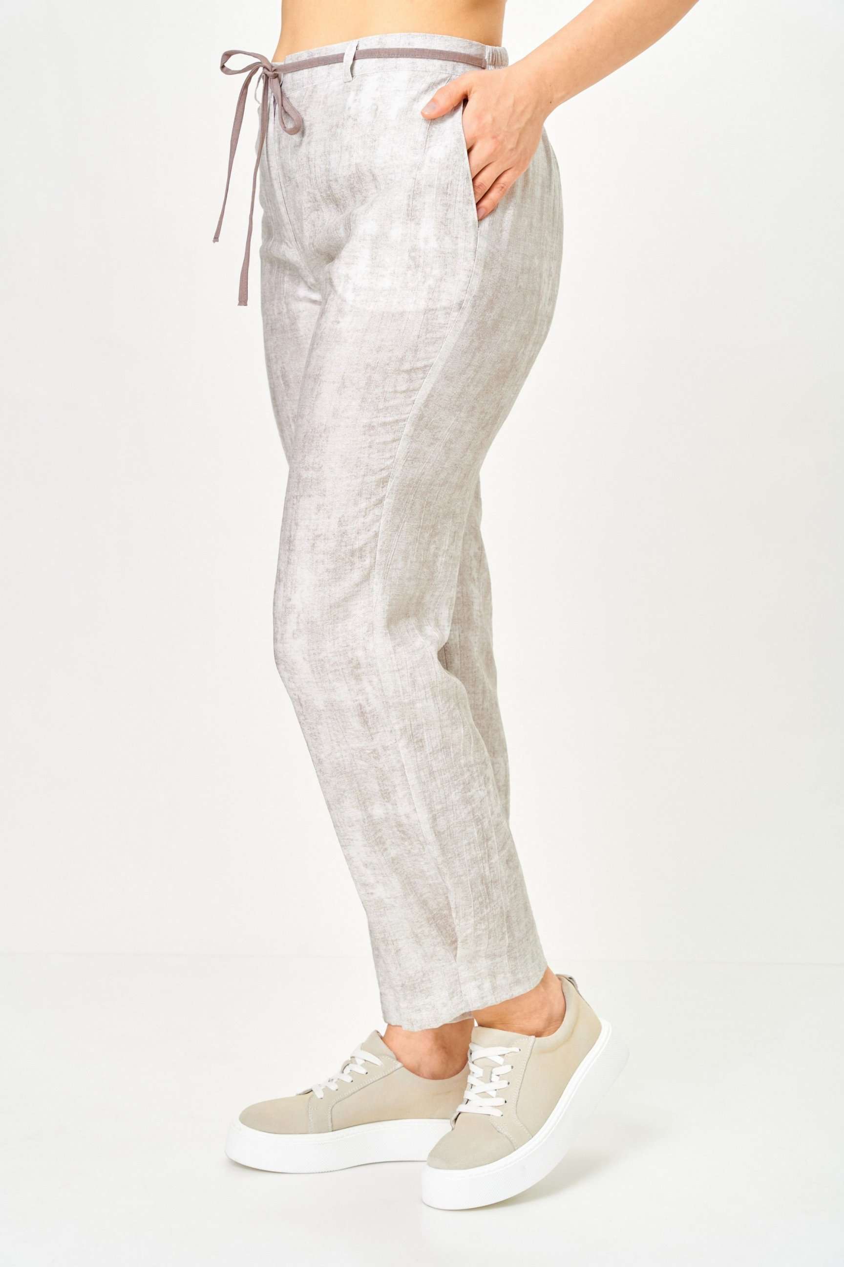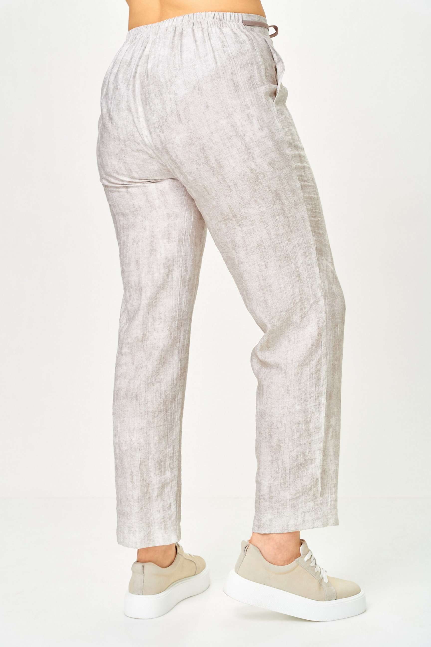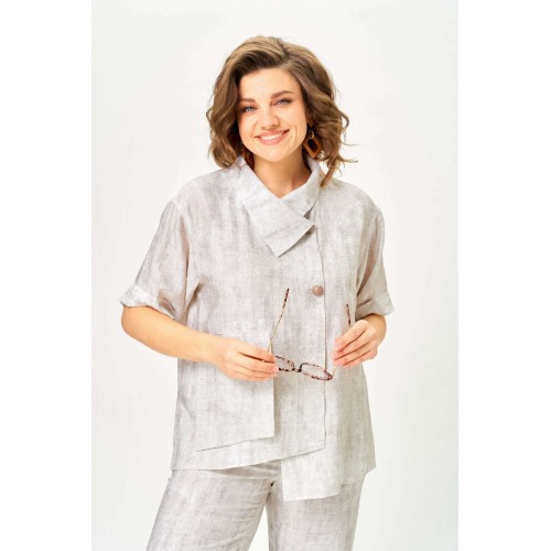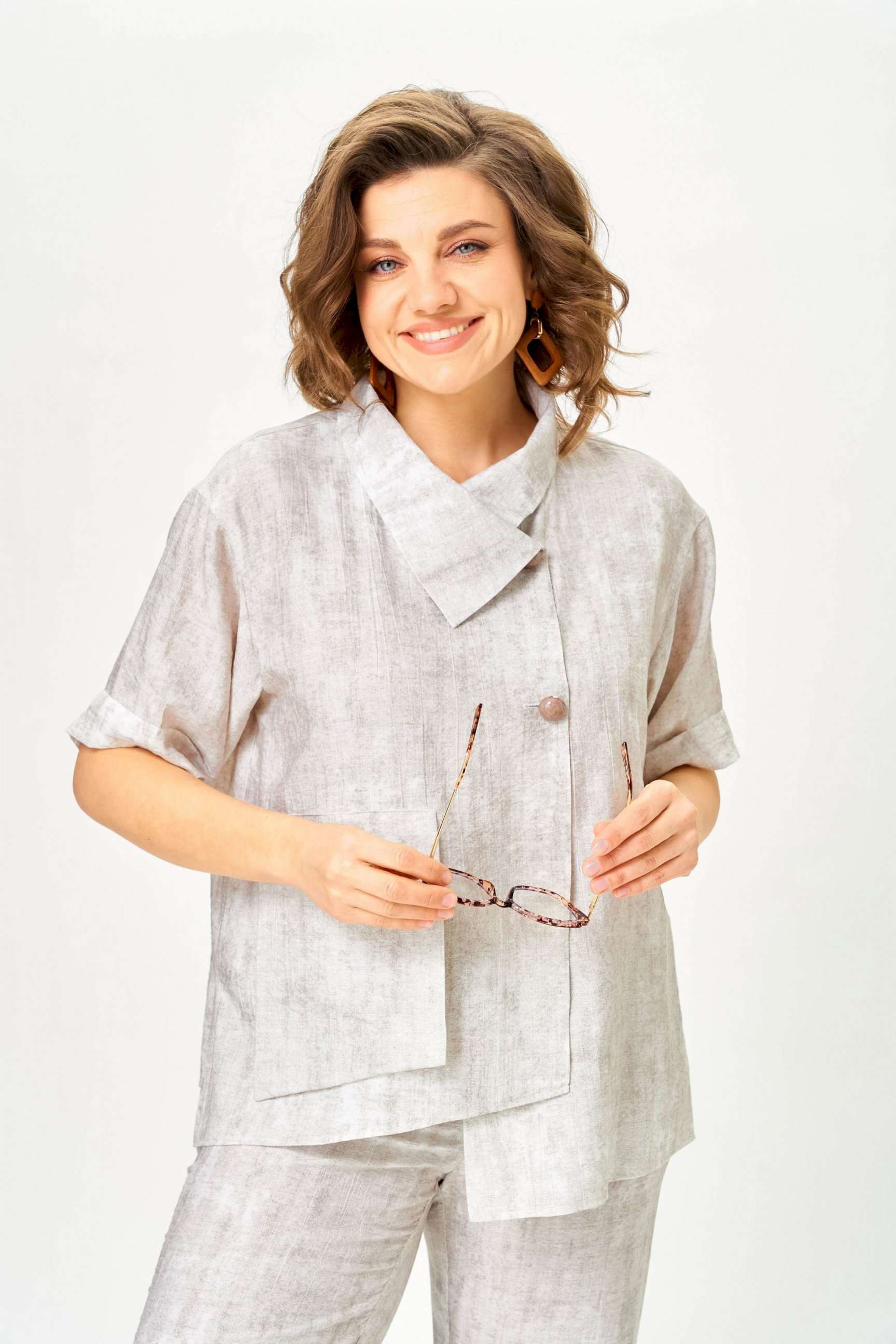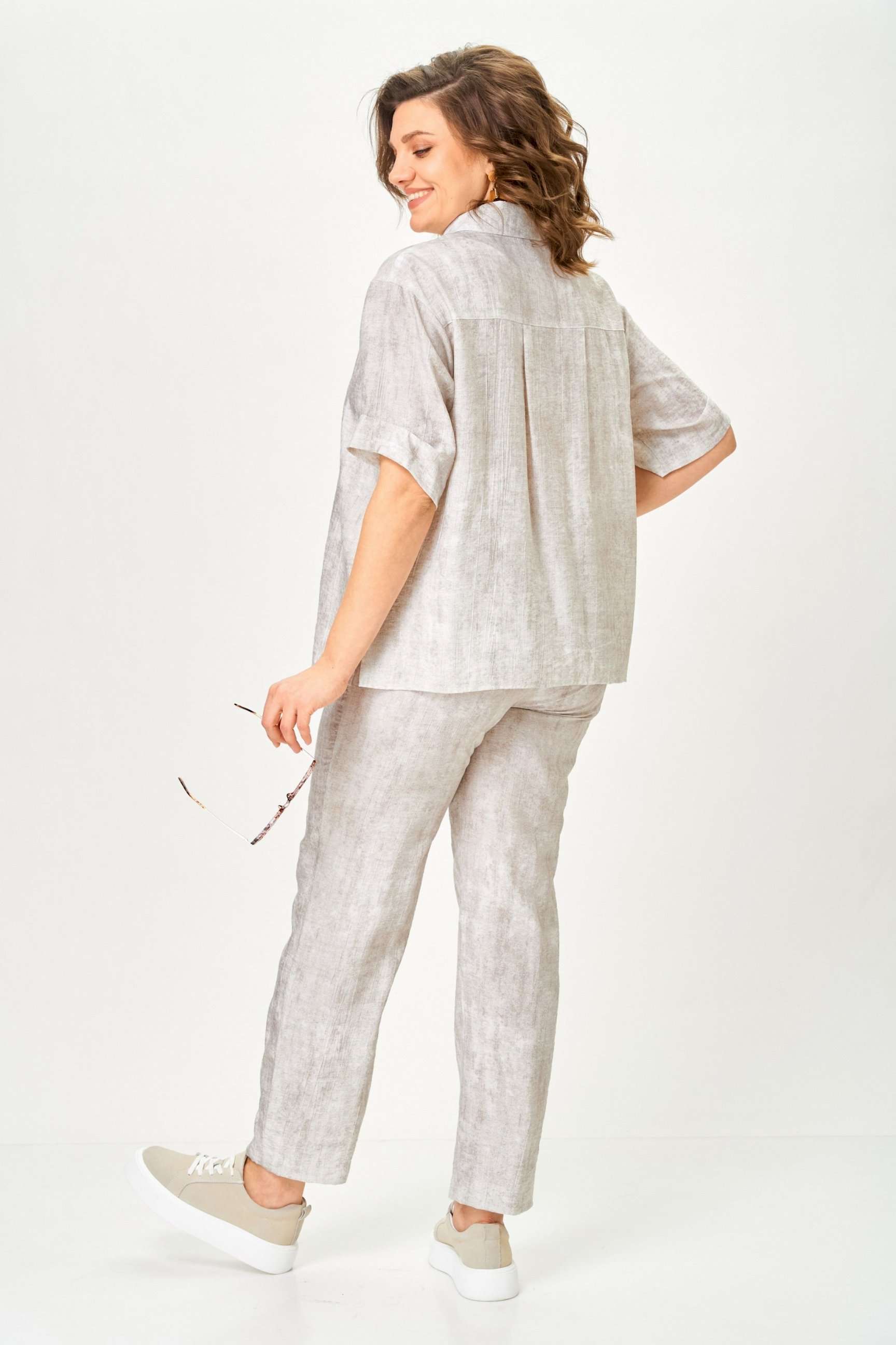 Костюм женский двухпредметный, состоящий из блузы и брюк. Блуза со смещенной бортовой застежкой на 2 петли-пуговицы и 1 потайную пуговицу. Перед с накладным отлетным карманом с рамкой по правой части переда фигурной формы. Низ изделия по переду ассиметричной формы. Спинка с горизонтальной кокеткой и двумя односторонними складками. Изделие имеет спущенную линию плеча. Рукав короткий с односторонней застроченной складкой. Воротник с отложными концами. В боковых швах обработаны разрезы. Брюки с притачным поясом сзади на резинке и с завязками от боковых швов пояса. Застежка на петлю-пуговицу по поясу и тесьму-молнию в средних срезах передних половинок брюк. В изделии обработаны карманы, наклонные к боковому шву. Брюки классического кроя, слегка зауженные книзу за счет односторонней складки по низу бокового шва. Рамка кармана блузы и завязки по поясу выполнены из отделочной ткани.