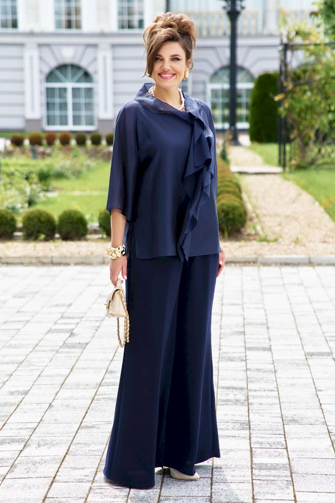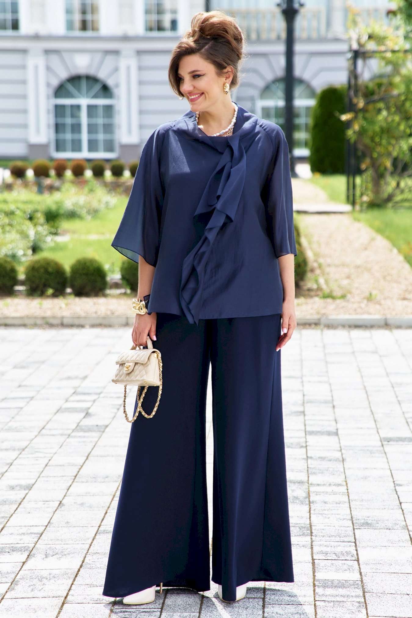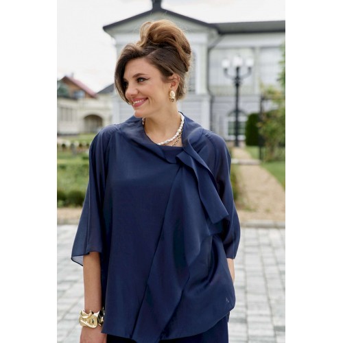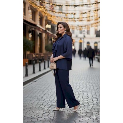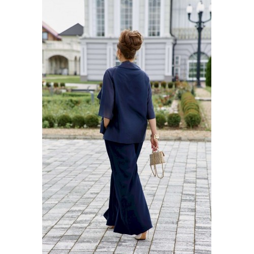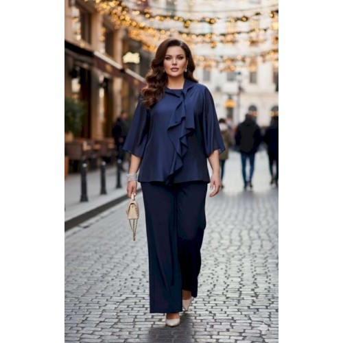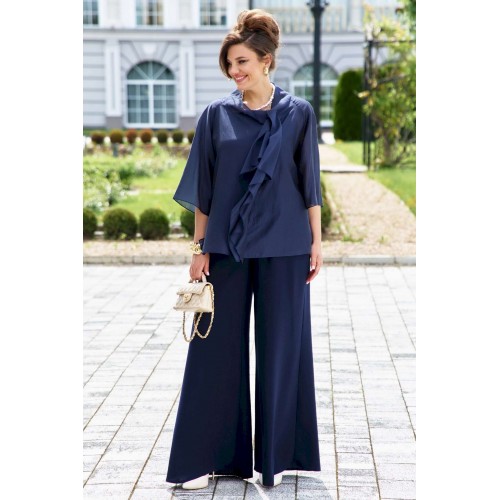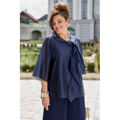 Элегантный брючный костюм, выполненный в мерцающем оттенке, который идеально подходит для создания утонченных образов. Комплект состоит из свободной блузы широких брюк палаццо, обеспечивая непревзойденный комфорт и легкость движений. Блуза привлекает внимание своим асимметричным дизайном с драпировками и широким, ниспадающим воротником, который придает образу динамичность и изысканность. Блуза свободного силуэта, с двойными деталями переда и спинки. Головина округлой формы. Рукав в блузе реглан, длиной ¾, что добавляет силуэту легкости и воздушности. В боковых швах блузы разрезы. Брюки с высокой посадкой и струящимся кроем визуально удлиняют ноги, создавая безупречный и гармоничный ансамбль. Этот костюм идеально подходит как для торжественных мероприятий, так и для деловых встреч, подчеркивая ваш безупречный вкус и чувство стиля. Длина блузы по спинке 68 см. Длина рукава блузы 48 см (р 50-54), 49 см (р 56-60). Длина брюк по боковому шву 108см (р 50-56), 108,5 см (р 58-60).