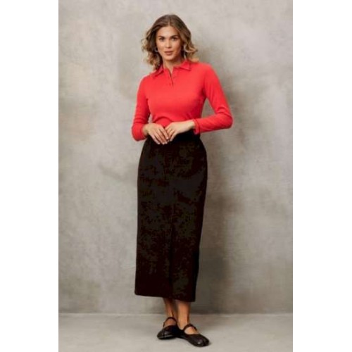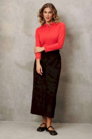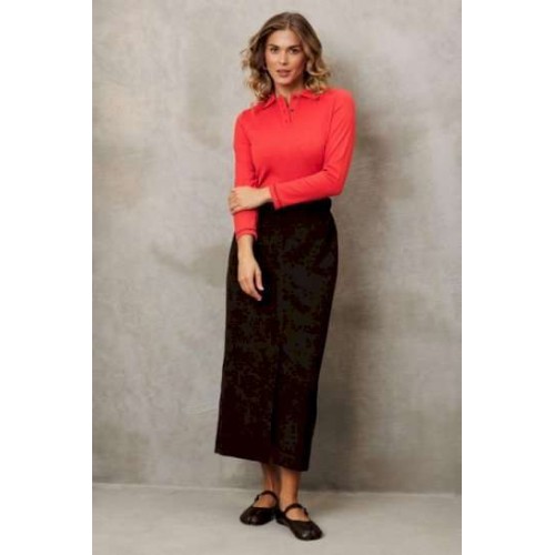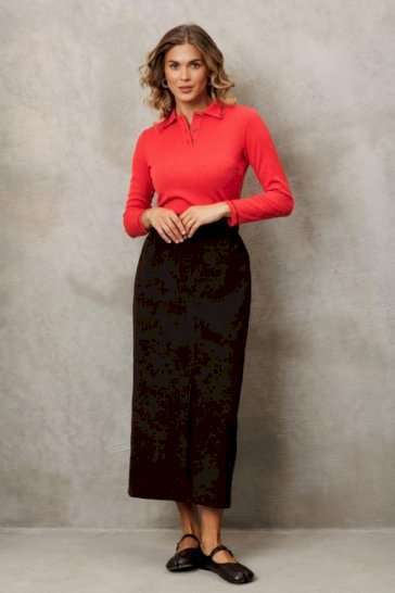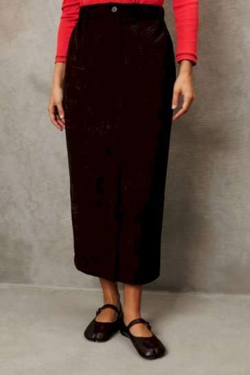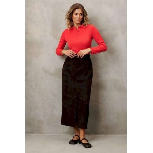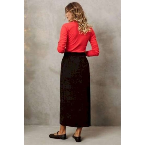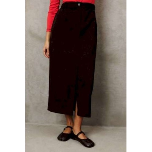 Костюм состоит из джемпера и юбки. Джемпер приталеного силуэта с воротником поло из трикотажного полотна. Рукав втачной одношовный. Юбка прямого силуэта выполненная из мягкой вельветовой ткани. Передняя честь юбки с вытачками, со средним швом и застежкой гульфиком на молнии и щлицей спереди. Задняя часть юбки с вытачками. Юбка на притачном поясе с затежкой на петлю и пуговицу спереди и резинками по бокам. Юбка на подкладке. Длина джемпера - 57 см. Длина рукава - 60 см. Длина юбки с учетом пояса - 90 см.