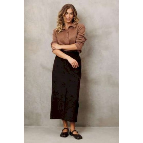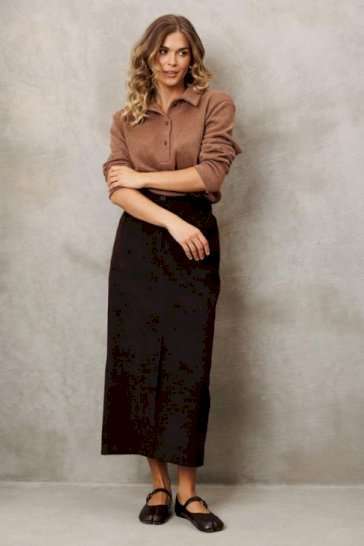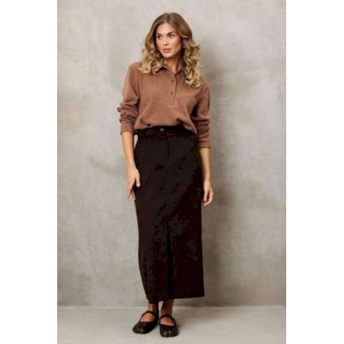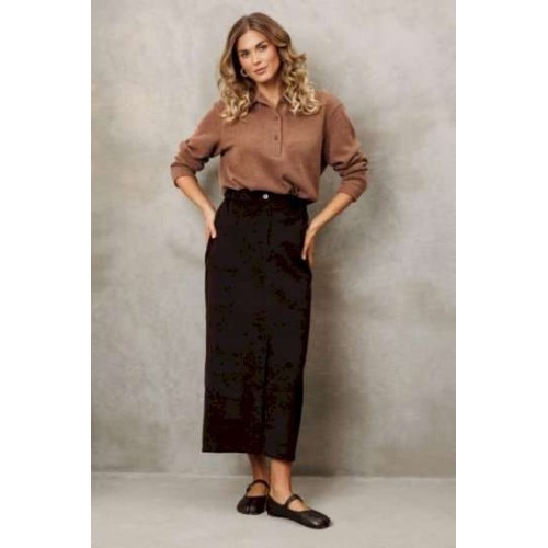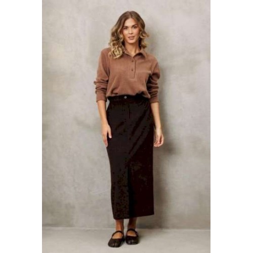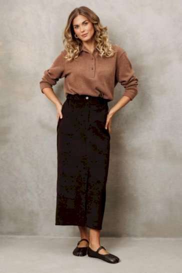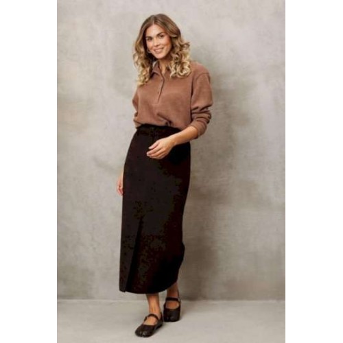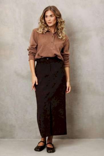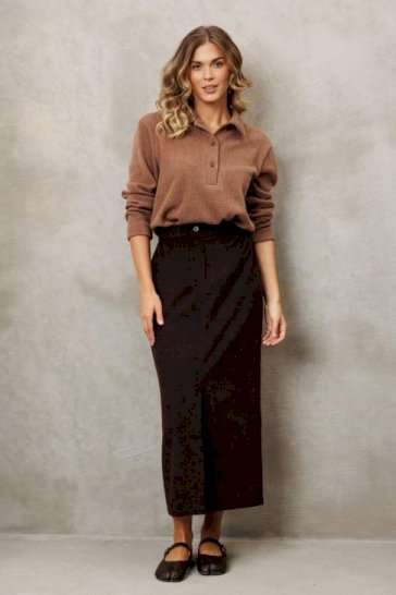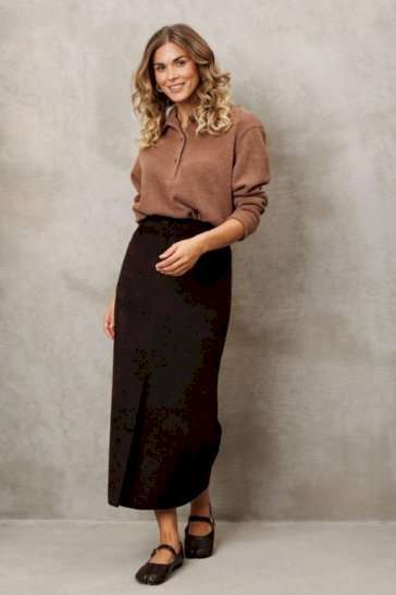 Костюм состоит из джемпера и юбки. Джемпер прямого силуэта с воротником поло из теплого трикотажного полотна. Рукав втачной одношовный. Юбка прямого силуэта выполненная из мягкой вельветовой ткани. Передняя честь юбки с вытачками, со средним швом и застежкой гульфиком на молнии и щлицей спереди. Задняя часть юбки с вытачками. Юбка на притачном поясе с затежкой на петлю и пуговицу спереди и резинками по бокам. Юбка на подкладке. Длина джемпера- 66 см. Длина рукава - 60 см. Длина юбки с учетом пояса - 90 см.