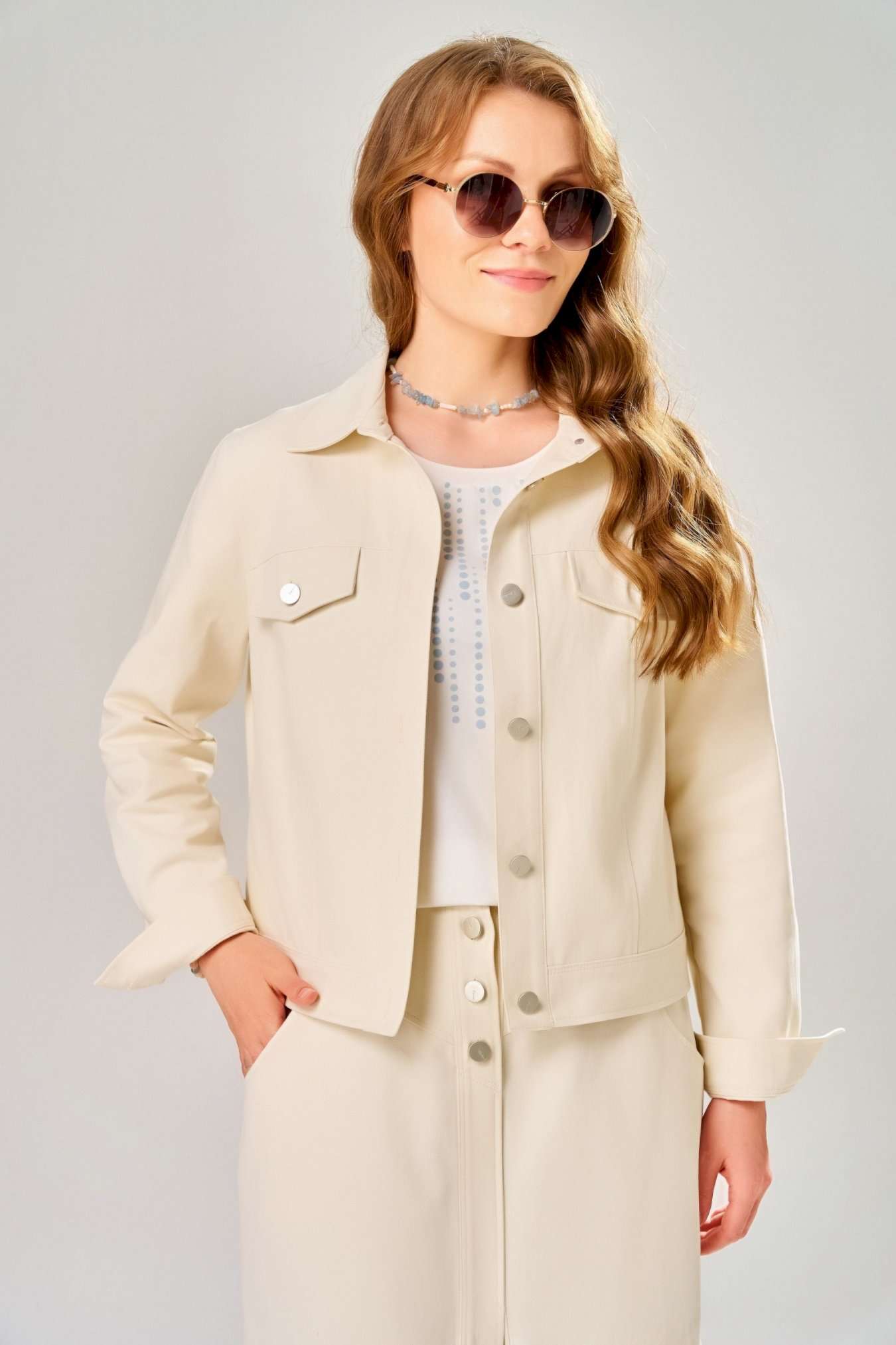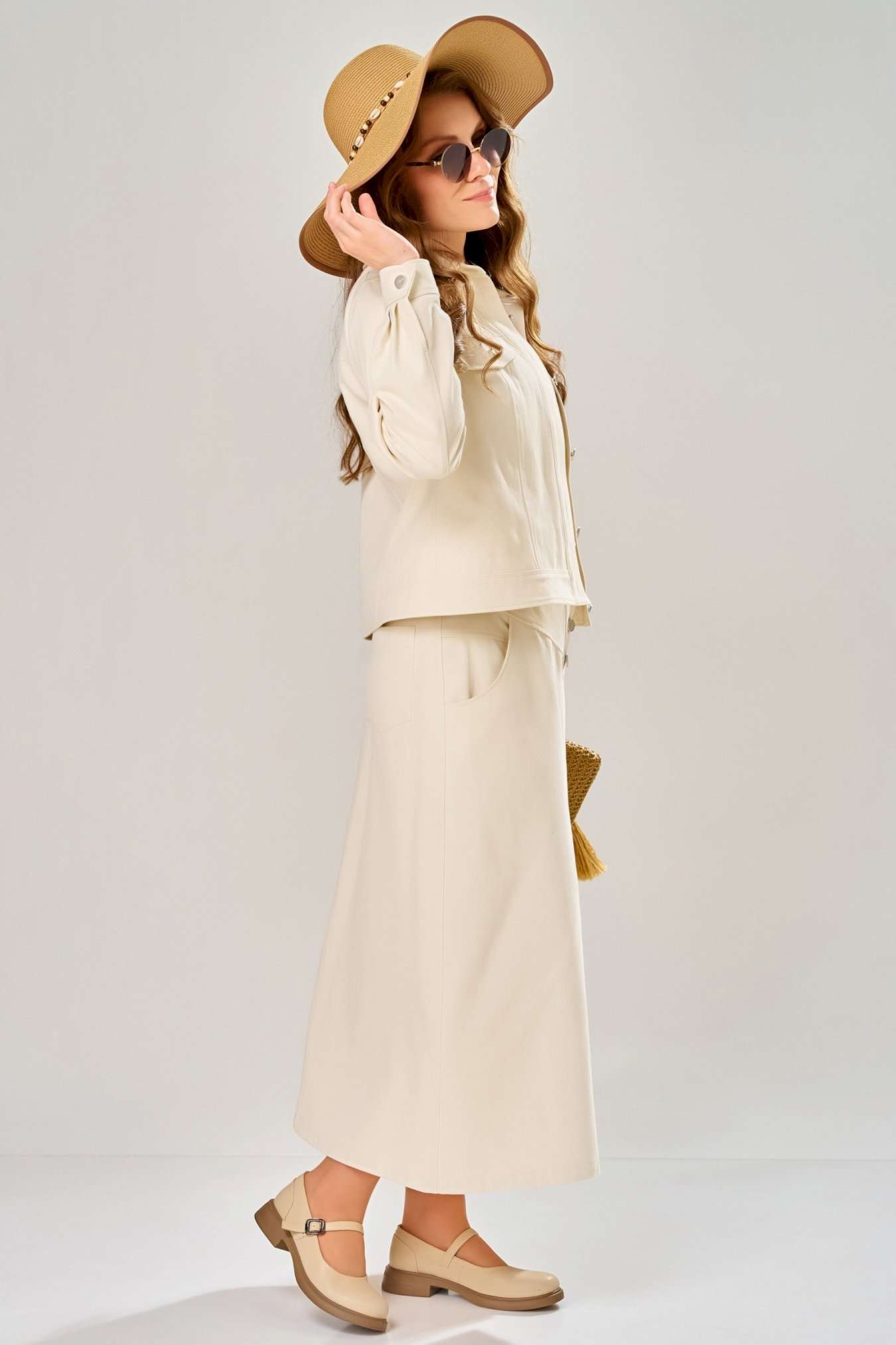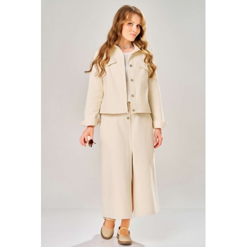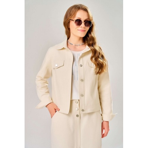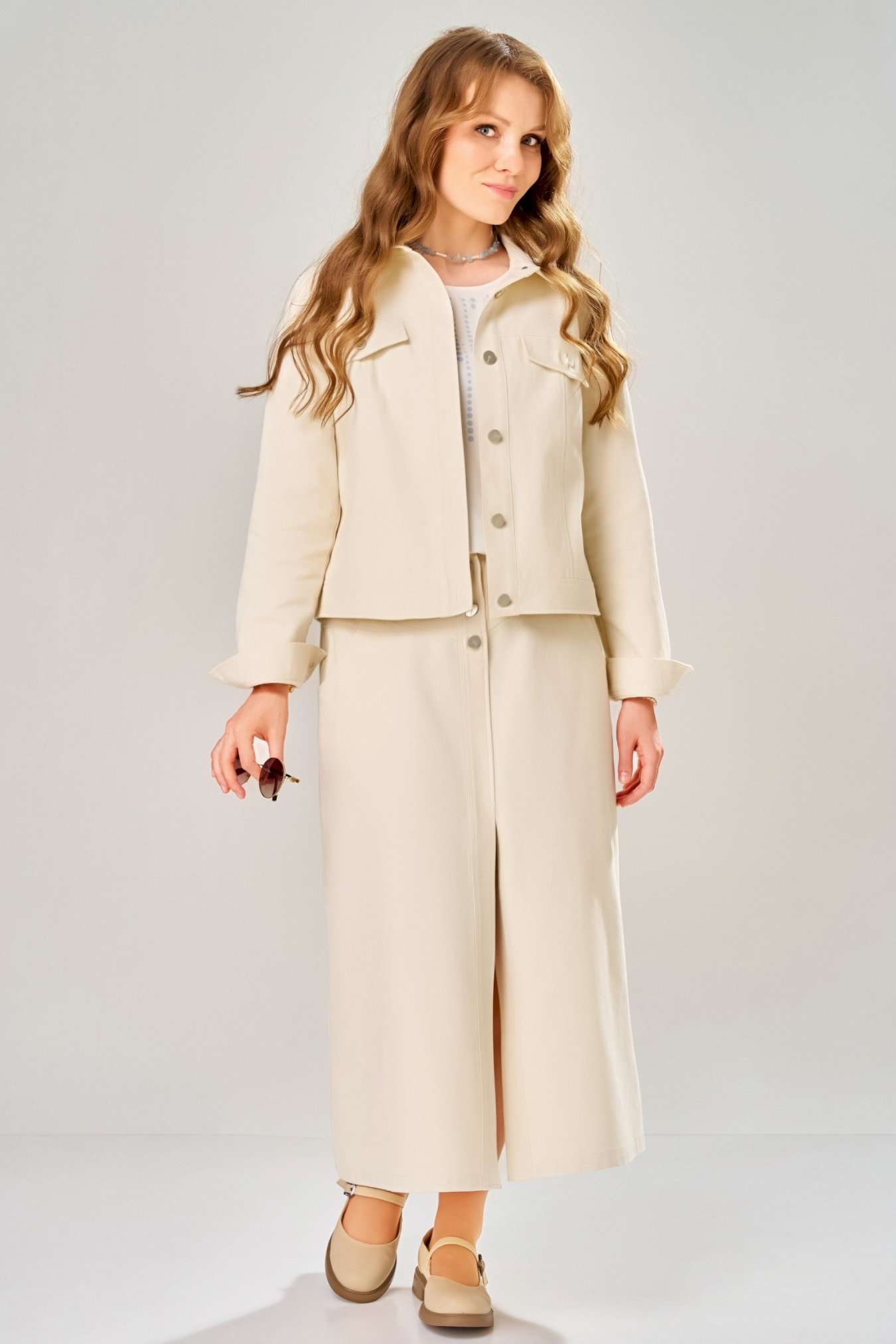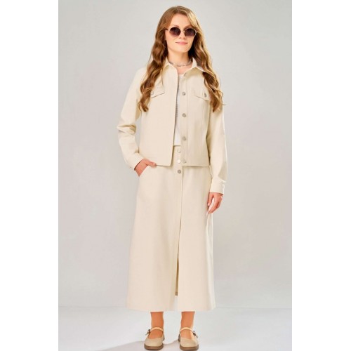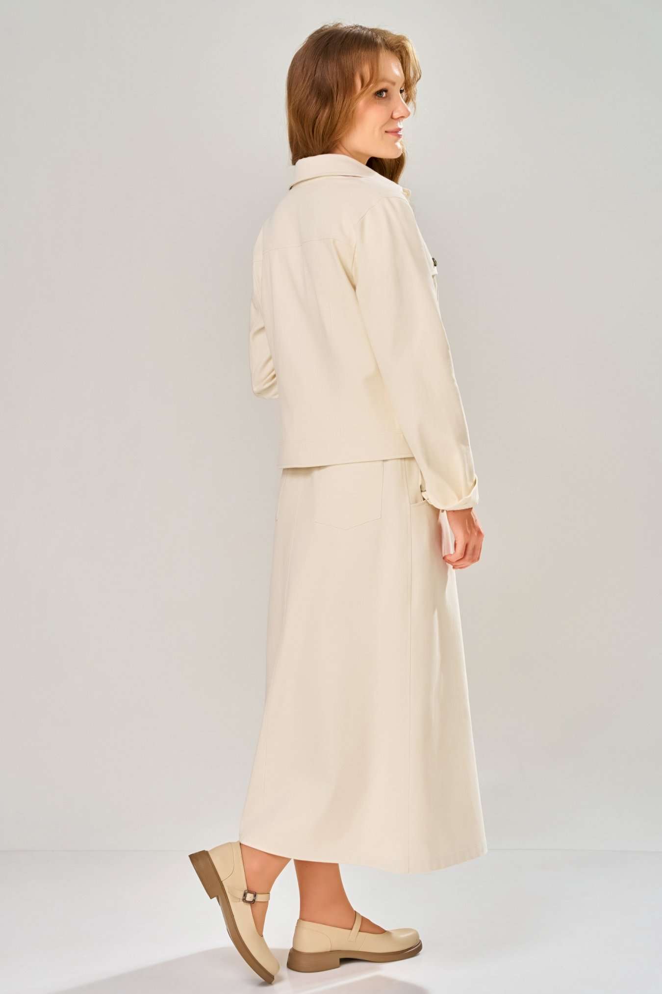 Комплект тройка \"\"Дамира\"\" состоит из бомбера, юбки и джемпера. Бомбер полуприлегающего силуэта выполнен из нежной хлопковой итальянской джинсовой ткани, бомбер без подкладки. Застежка в бомбере однобортная на петли и пуговицы, планка по борту отрезная, отсроченная отделочными строчками. По полочке - кокетка и рельефы. В шов в притачивание кокетки вставлены клапаны, с застежкой на петлю и пуговицу. По спинке - кокетка и рельефы. Рукава в бомбере втачные двухшовные, по низу рукава - манжет с застежкой на петли и пуговицы. Воротник отложной рубашечного типа со стойкой, по низу бомбера отрезной пояс, отсроченный отделочной строчкой. На кокетке полочки, с левой стороны декоративная нашивка. Юбка, слегка расширенная к низу, выполнена из нежной итальянской джинсовой ткани, без подкладки. По переднему полотнищу юбки застежка на петли и пуговицы. По среднему шву юбки идет сквозная планка. По полочке кокетка и рельефные карманы. На заднем полотнище юбки - кокетка и накладные карманы. Верх юбки обработан притачным поясом, низ изделия обработан швом в подгибку с закрытым срезом. Джемпер в комплекте \"\"ДАМИРА\"\" прилегающего силуэта. Горловина обработана притачной планкой. Рукав втачной одношовный. Низ джемпера и рукава обработан распошивалкой. Это новый городской стиль, качественные материалы и изыск! НАТУРАЛЬНАЯ ИТАЛЬЯНСКАЯ ДЖИНСОВАЯ ТКАНЬ, ОЧЕНЬ ПРАКТИЧНАЯ И УДОБНАЯ В НОСКЕ!