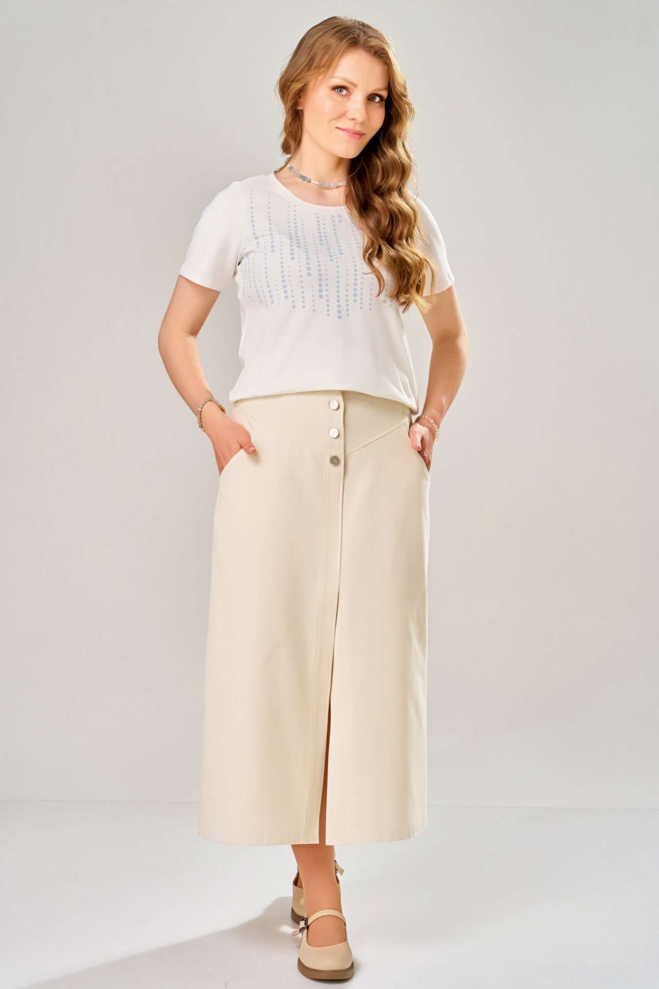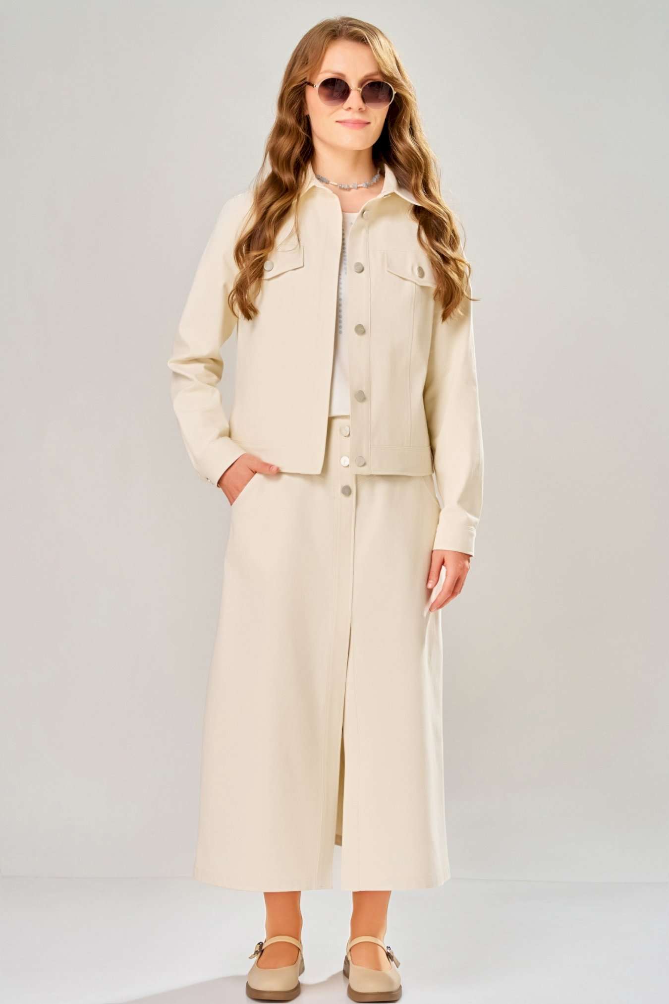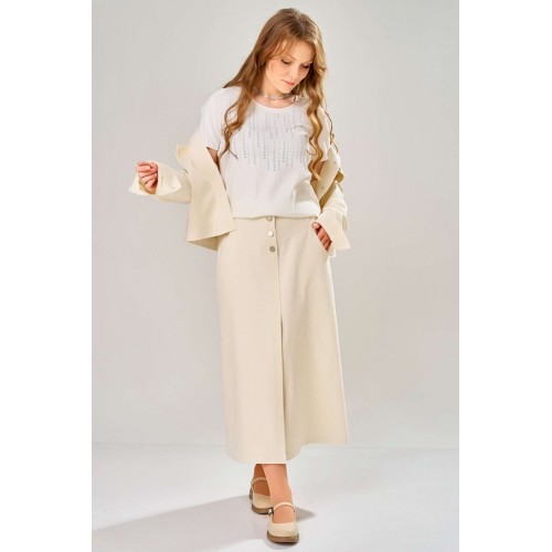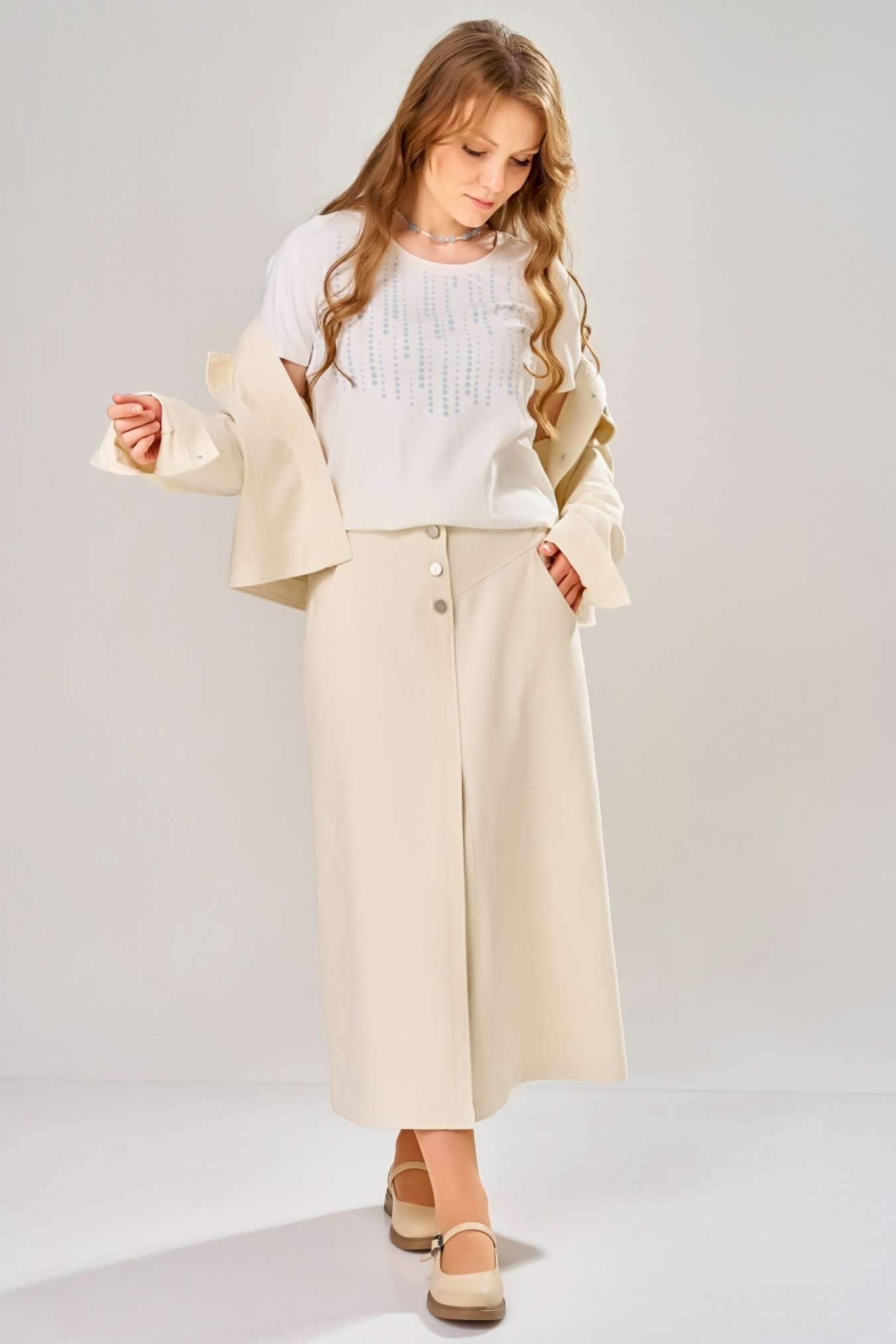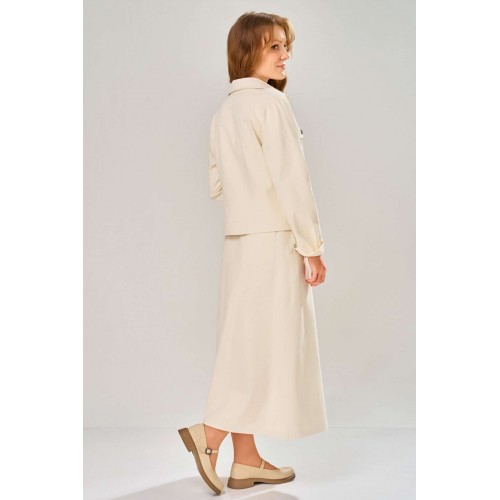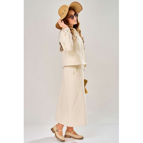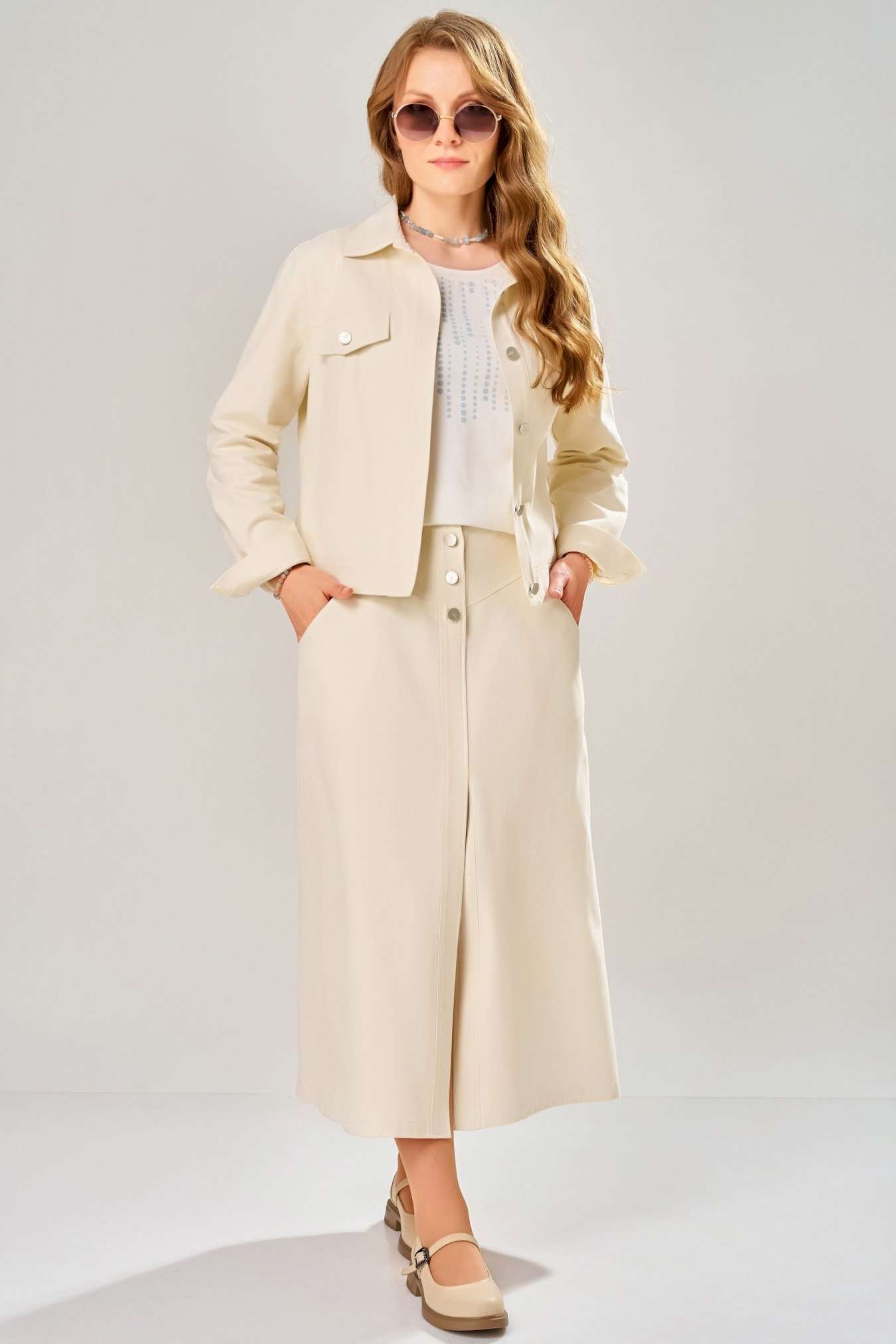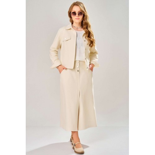 Комплект тройка \"\"Дамира\"\" состоит из бомбера, юбки и джемпера. Бомбер полуприлегающего силуэта выполнен из нежной хлопковой итальянской джинсовой ткани, бомбер без подкладки. Застежка в бомбере однобортная на петли и пуговицы, планка по борту отрезная, отсроченная отделочными строчками. По полочке - кокетка и рельефы. В шов в притачивание кокетки вставлены клапаны, с застежкой на петлю и пуговицу. По спинке - кокетка и рельефы. Рукава в бомбере втачные двухшовные, по низу рукава - манжет с застежкой на петли и пуговицы. Воротник отложной рубашечного типа со стойкой, по низу бомбера отрезной пояс, отсроченный отделочной строчкой. На кокетке полочки, с левой стороны декоративная нашивка. Юбка, слегка расширенная к низу, выполнена из нежной итальянской джинсовой ткани, без подкладки. По переднему полотнищу юбки застежка на петли и пуговицы. По среднему шву юбки идет сквозная планка. По полочке кокетка и рельефные карманы. На заднем полотнище юбки - кокетка и накладные карманы. Верх юбки обработан притачным поясом, низ изделия обработан швом в подгибку с закрытым срезом. Джемпер в комплекте \"\"ДАМИРА\"\" прилегающего силуэта. Горловина обработана притачной планкой. Рукав втачной одношовный. Низ джемпера и рукава обработан распошивалкой. Это новый городской стиль, качественные материалы и изыск! НАТУРАЛЬНАЯ ИТАЛЬЯНСКАЯ ДЖИНСОВАЯ ТКАНЬ, ОЧЕНЬ ПРАКТИЧНАЯ И УДОБНАЯ В НОСКЕ!