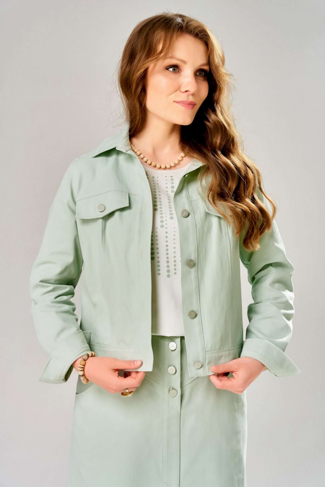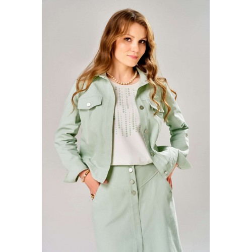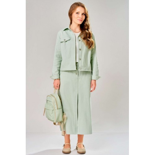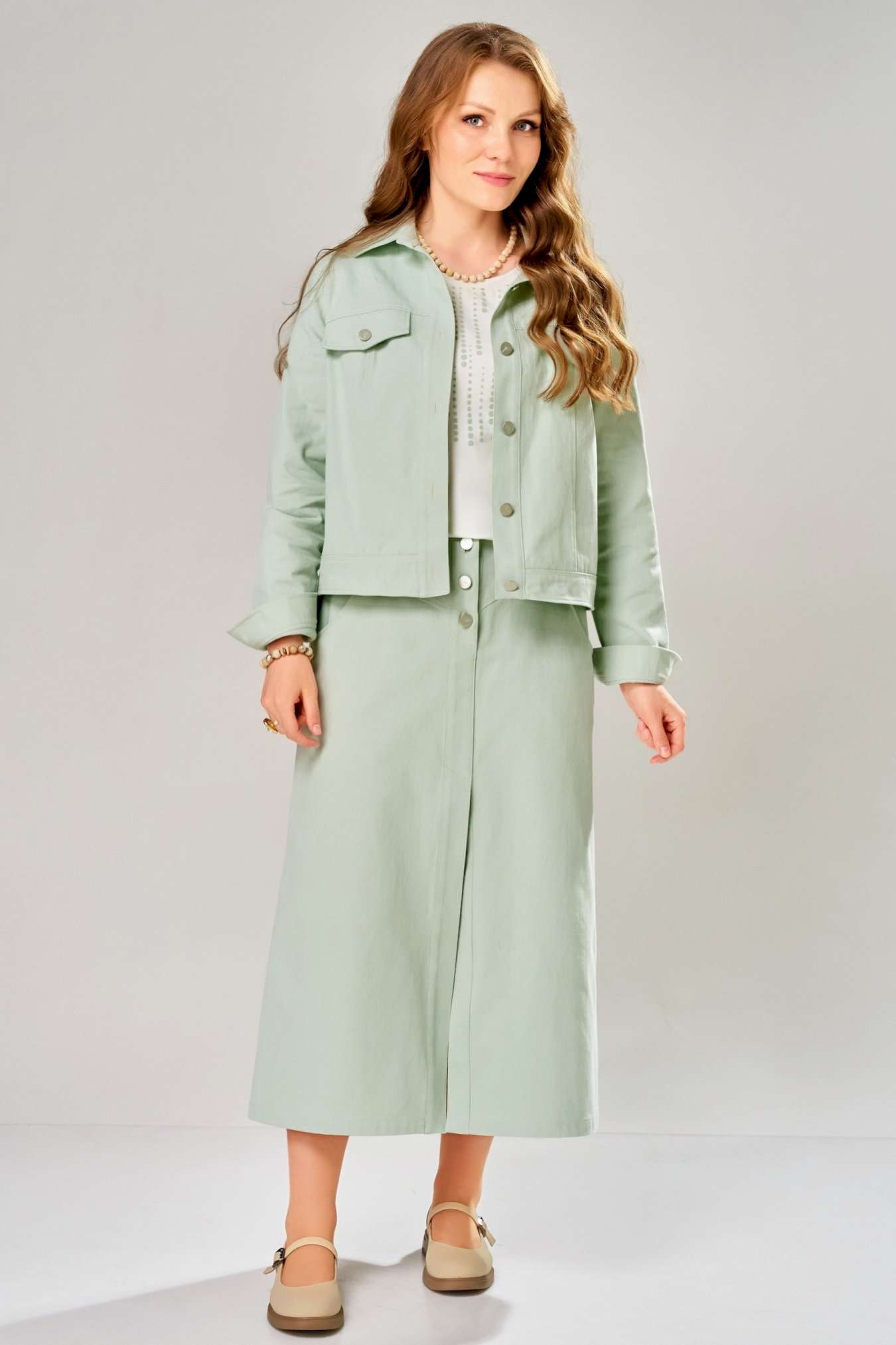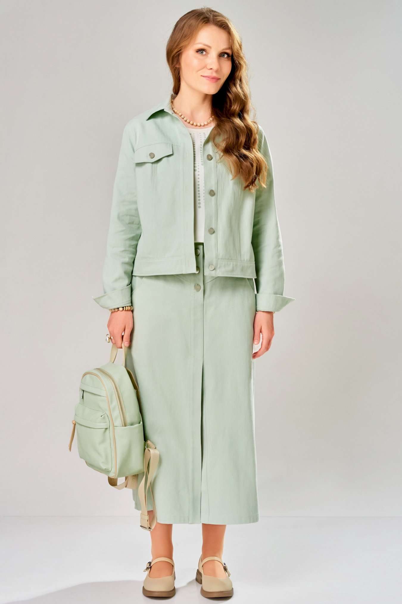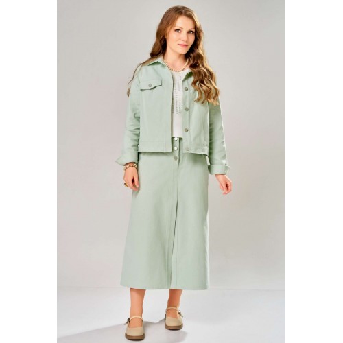 Комплект тройка \"\"Дамира\"\" состоит из бомбера, юбки и джемпера. Бомбер полуприлегающего силуэта выполнен из нежной хлопковой итальянской джинсовой ткани, бомбер без подкладки. Застежка в бомбере однобортная на петли и пуговицы, планка по борту отрезная, отсроченная отделочными строчками. По полочке - кокетка и рельефы. В шов в притачивание кокетки вставлены клапаны, с застежкой на петлю и пуговицу. По спинке - кокетка и рельефы. Рукава в бомбере втачные двухшовные, по низу рукава - манжет с застежкой на петли и пуговицы. Воротник отложной рубашечного типа со стойкой, по низу бомбера отрезной пояс, отсроченный отделочной строчкой. На кокетке полочки, с левой стороны декоративная нашивка. Юбка, слегка расширенная к низу, выполнена из нежной итальянской джинсовой ткани, без подкладки. По переднему полотнищу юбки застежка на петли и пуговицы. По среднему шву юбки идет сквозная планка. По полочке кокетка и рельефные карманы. На заднем полотнище юбки - кокетка и накладные карманы. Верх юбки обработан притачным поясом, низ изделия обработан швом в подгибку с закрытым срезом. Джемпер в комплекте \"\"ДАМИРА\"\" прилегающего силуэта. Горловина обработана притачной планкой. Рукав втачной одношовный. Низ джемпера и рукава обработан распошивалкой. Это новый городской стиль, качественные материалы и изыск! НАТУРАЛЬНАЯ ИТАЛЬЯНСКАЯ ДЖИНСОВАЯ ТКАНЬ, ОЧЕНЬ ПРАКТИЧНАЯ И УДОБНАЯ В НОСКЕ!