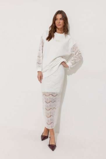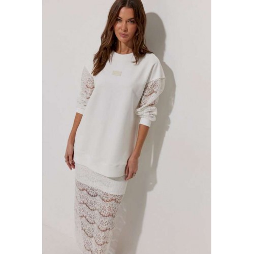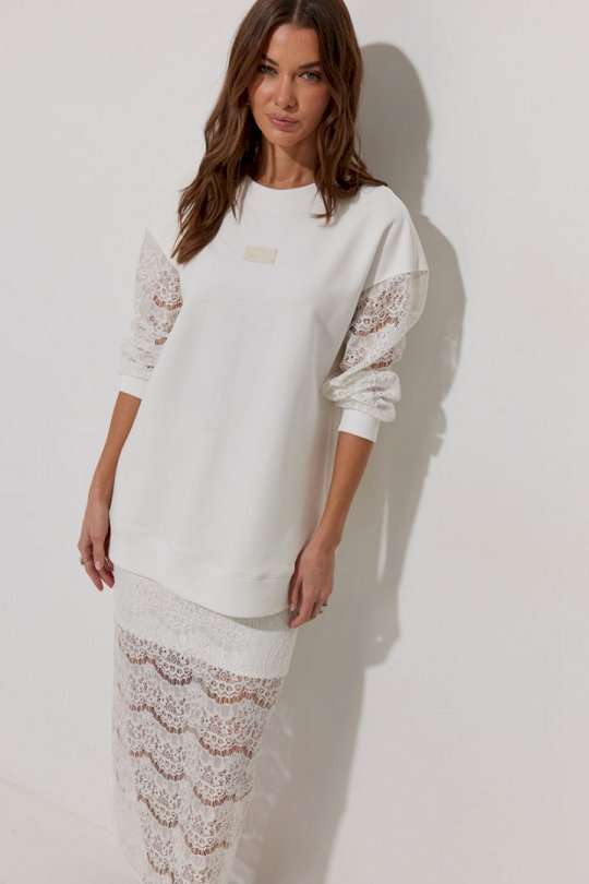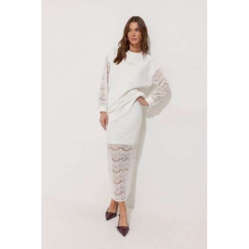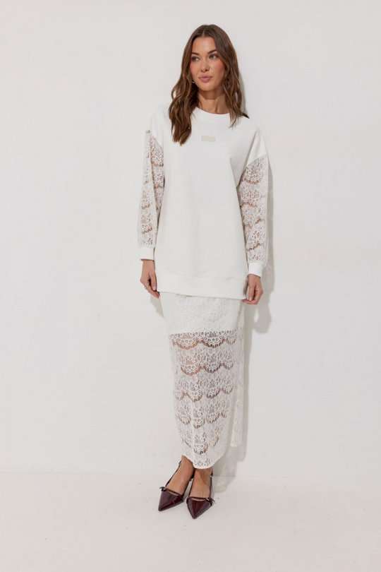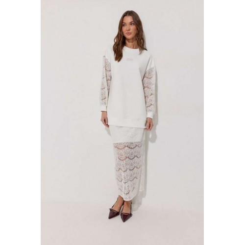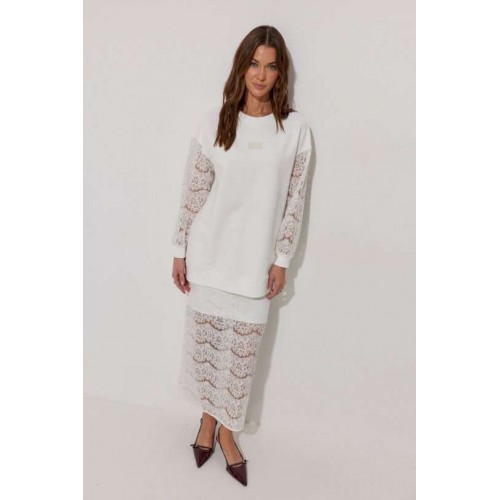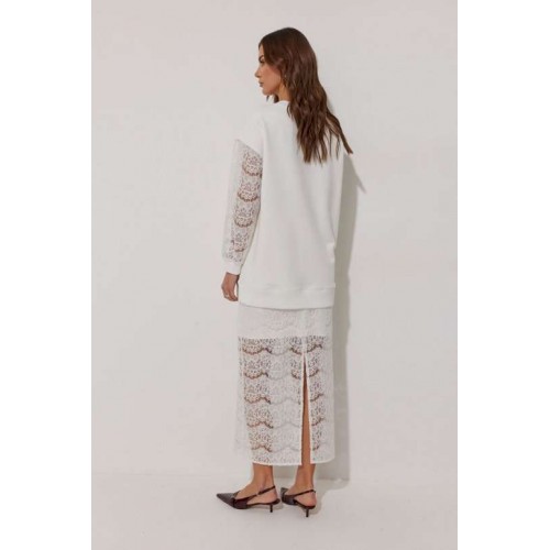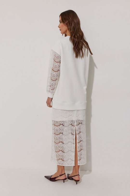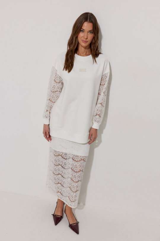 Джемпер из трикотажного полотна, свободного кроя, удлиненный, со спущенной линией плеча. С круглым вырезом горловины, с планкой из кашкорсе. С изнаночной стороны по спинке на горловине настрочена декоративная тесьма. По переду декор в виде нашивки. Обращаем Ваше внимание, что декор может незначительно отличаться от фото. Рукав выполнен из кружевной ткани, по низу рукава манжета из кашкорсе. Джемпер с поясом из кашкорсе. Юбка выполнена из кружевной ткани, длина миди. Юбка прямого силуэта. Нижний слой юбки выполнен из тонкого трикотажа в тон основной ткани. Юбка на резинке. По среднему шву заднего полотнища разрез. Подходит на рост 164-170 см Длина джемпера во всех размерах 73 см. Длина рукава от горловины (44-48р 74 см) (50-54р 76 см). Длина юбки во всех размерах 93 см, резинка 3 см.