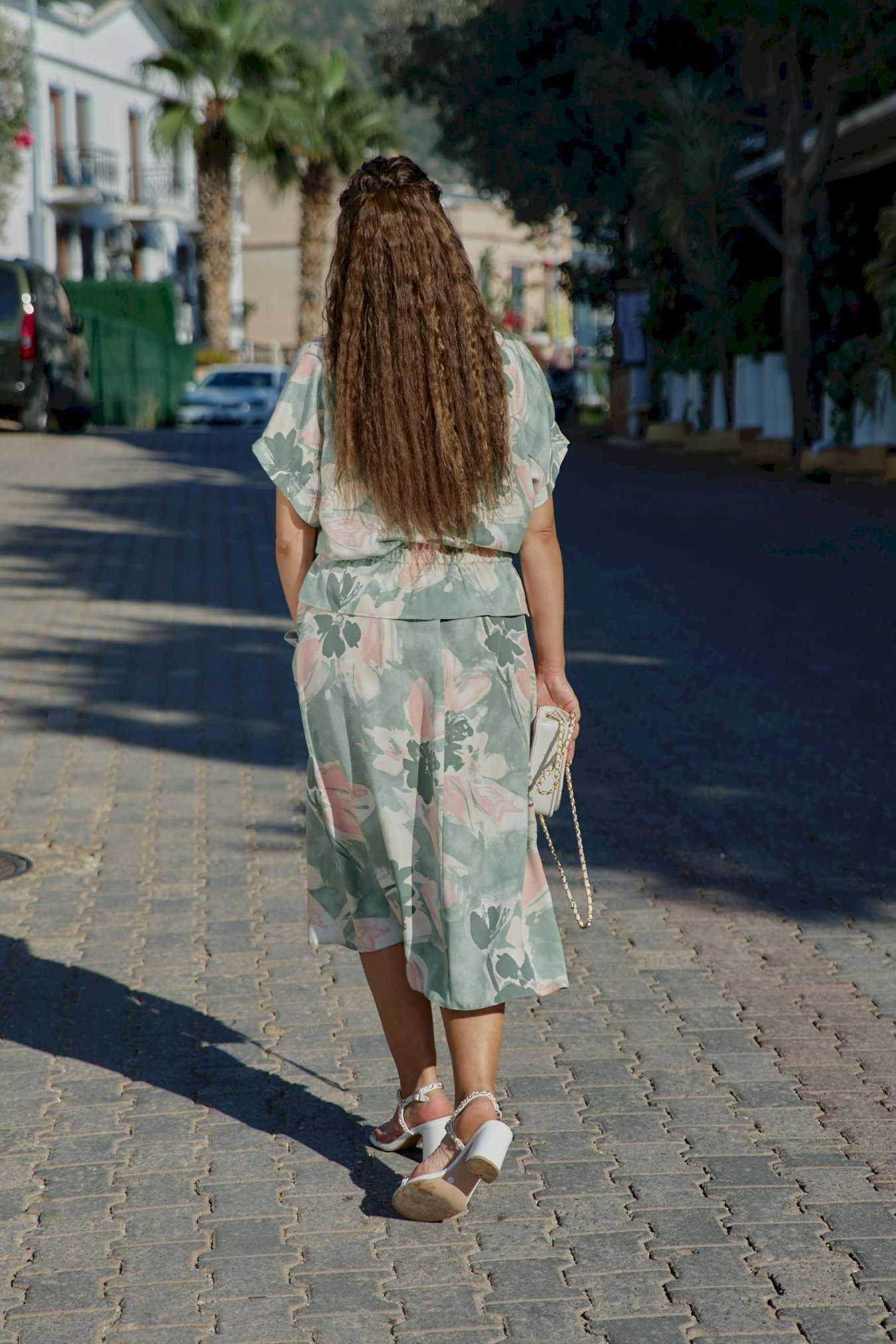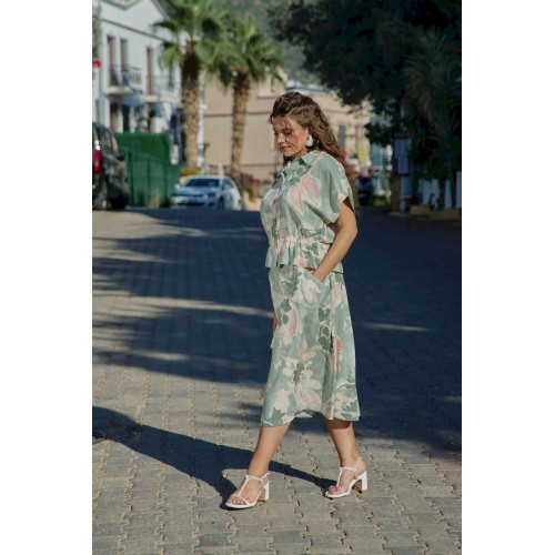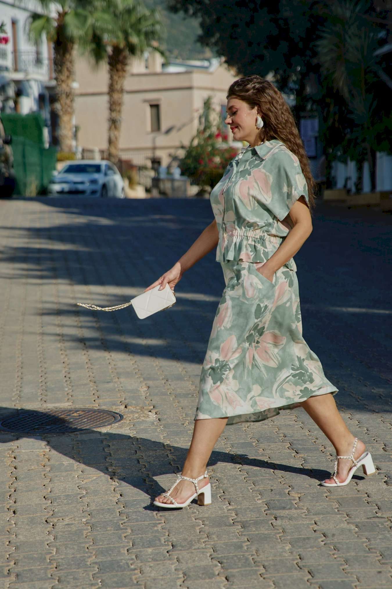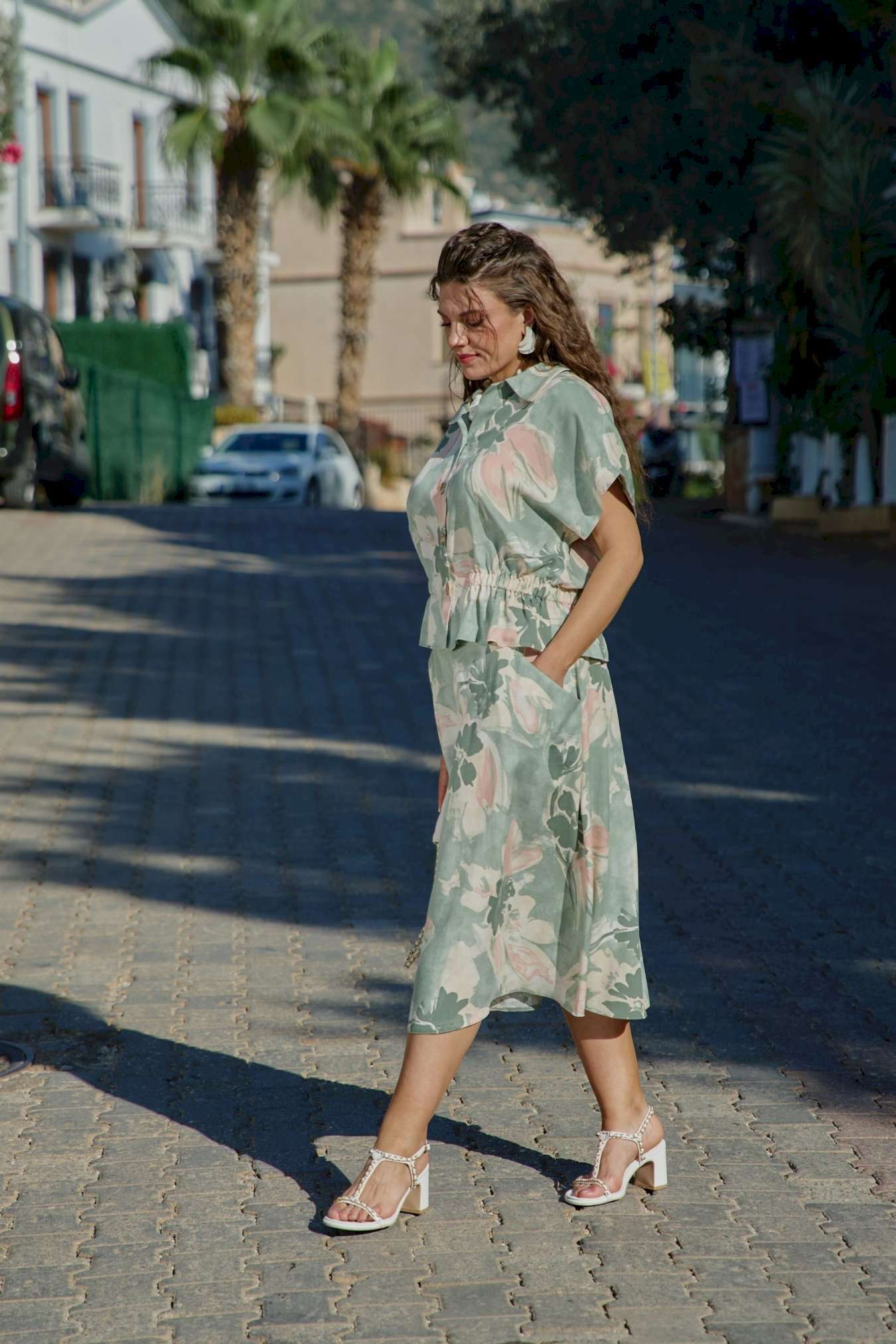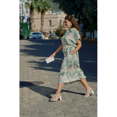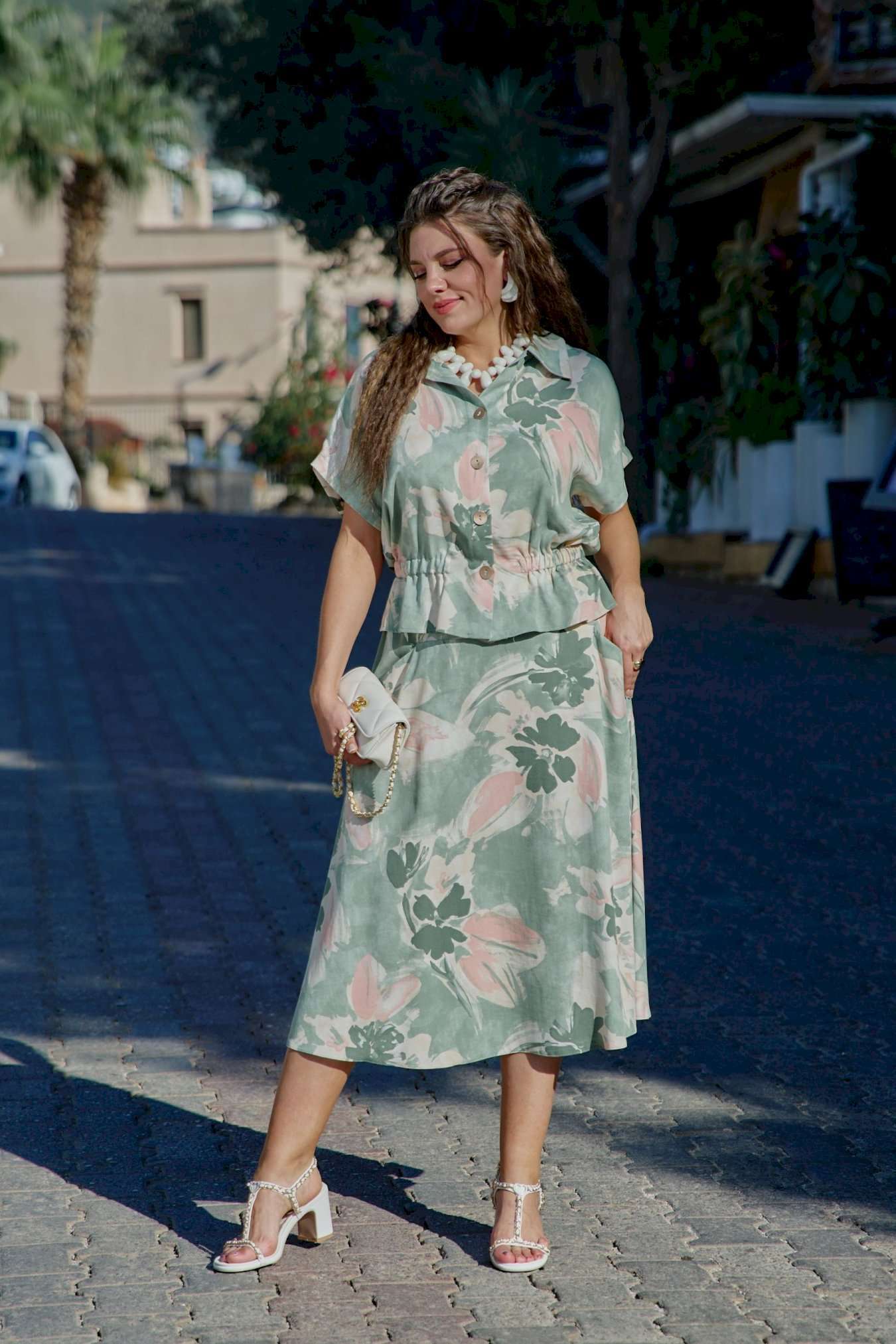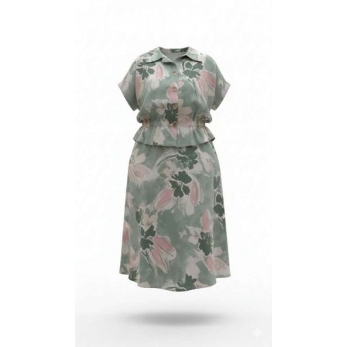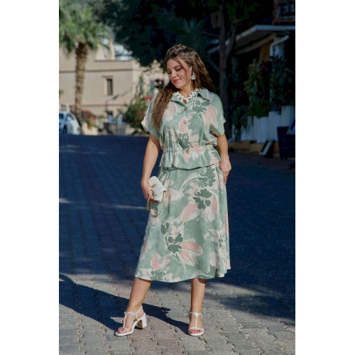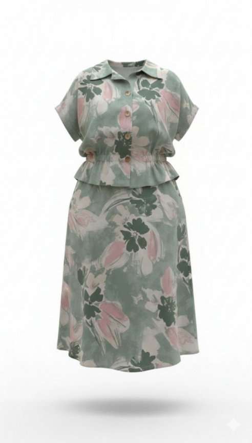 Летний костюм, состоящий из блузки и юбки, представляет собой идеальное сочетание стиля и комфорта, которое словно создано для теплых солнечных дней. Невероятный принт, текстура ткани и крой создадут образ, в котором вы будете блистать. Он так же идеален для повседневных образов, путешествий, а приятная к телу ткань создаст комфорт при носке. Каждая деталь, от аккуратных швов до разнообразия текстур, придаёт костюму завершенность и стиль, позволяя каждой женщине чувствовать себя уверенно и привлекательно. Блузка свободного силуэта с центральной застёжкой на петли-пуговицы по краю борта, воротником отложного типа, спущенной линией плеча. В качестве отделочного элемента в блузке по талии вставка эластичной тесьмы резинки. Спинка в блузке с отрезной кокеткой. Юбка трапециевидного силуэта, с притачным поясом со вставкой резинки в бочках; по переду юбки отрезная кокетка и фигурные прорезные карманы. В среднем шве юбки застёжка на потайную тесьму-молнию и пуговиц по центру пояса. Длина блузки 60 см (р 50-54), 61 см (р 56-60). Длина рукава 29 см (р 50-54), 30,5 см (р 56-60). Длина юбки 86 см.