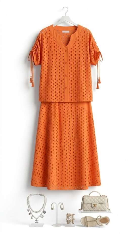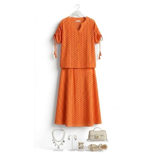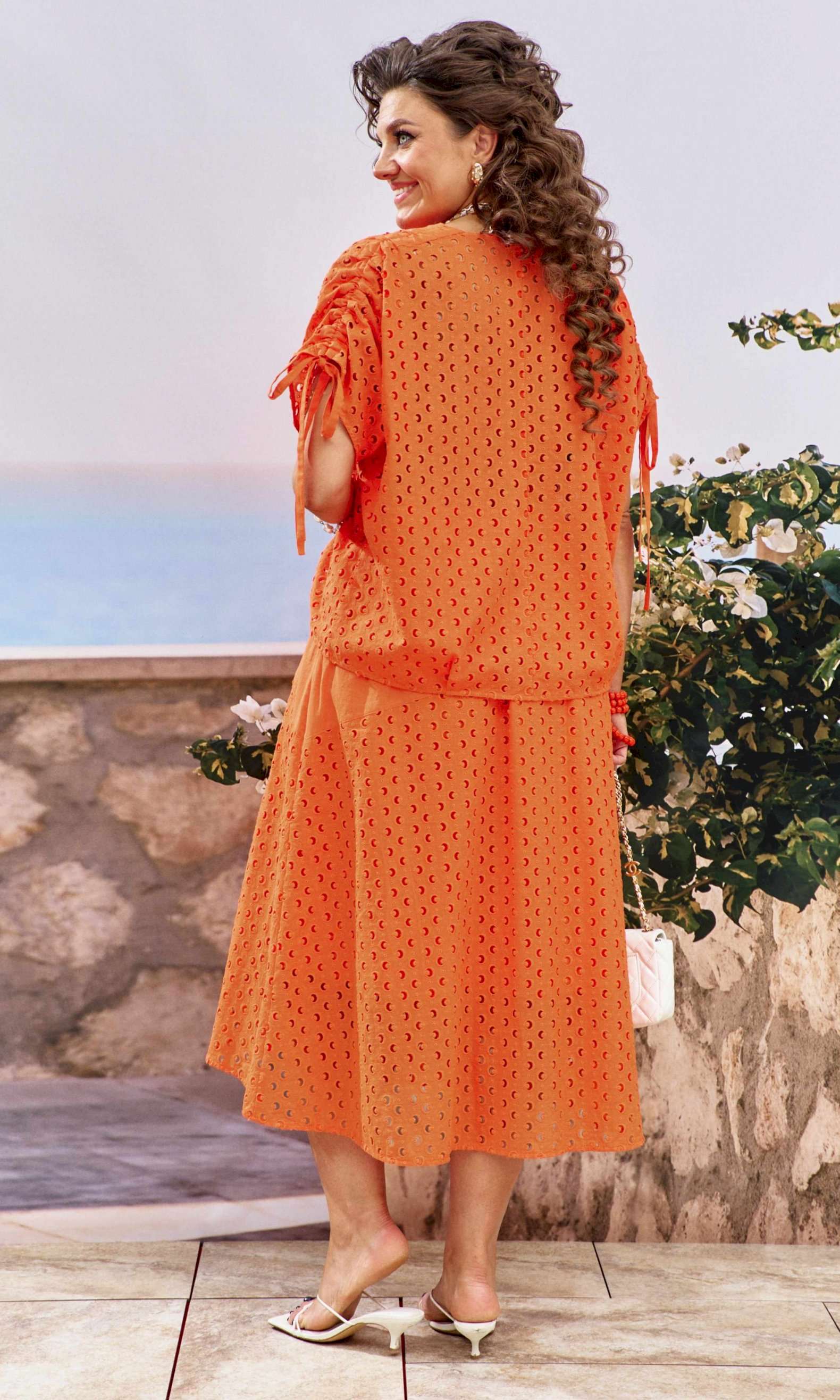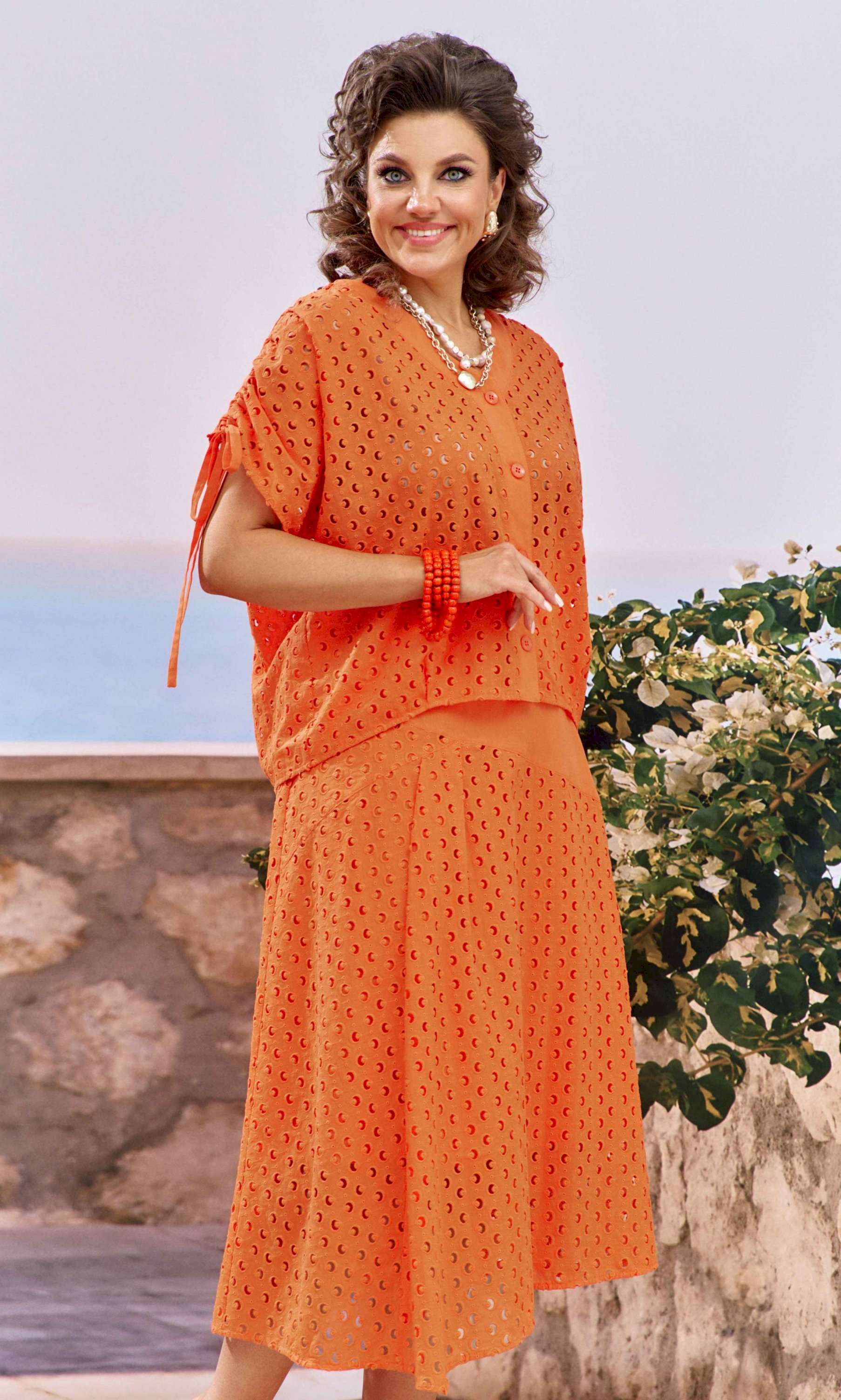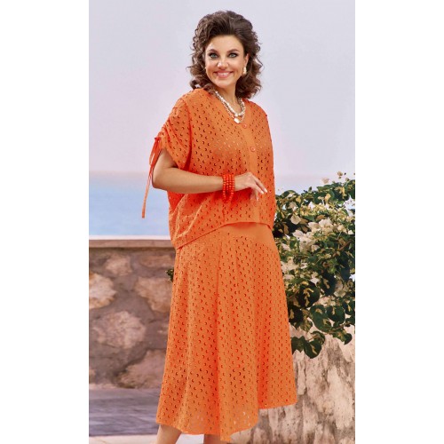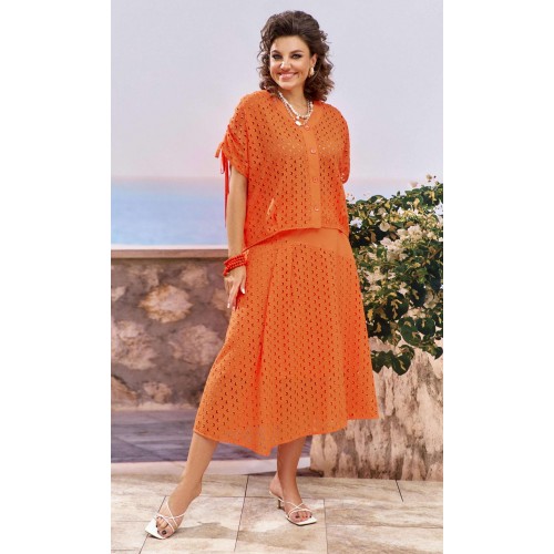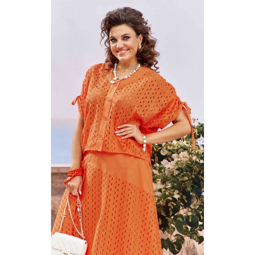 Женский летний костюм, состоящий из блузки и юбки в модном коралловом оттенке, представляет собой великолепное сочетание стиля, лёгкости и изысканности. Коралловый цвет, обладающий уникальной способностью подчеркивать загар, а детали ришелье создают уникальный образ. Так летний костюм становится настоящим воплощением летней элегантности, позволяя каждой женщине чувствовать себя уверенно и привлекательно. Блузка в сочетании ткани ришелье и однотонной ткани , свободного силуэта с центральной застёжкой на петли-пуговицы по планке. Плечевой шов с декоративной кулисой на сборку со шнурком для регулировки длинны рукава. Спинка и перед по низу со складками. Юбка трапециевидного силуэта из ришелье и однотонной ткани. Пояс притачной со вставкой резинки по задней части. Юбка на подкладке в боковом шве застежка на молнию и пуговицу на поясе. Обращаем Ваше внимание, что фурнитура может незначительно отличаться от фото. Длина блузы по спинке 59 см(р.48-52), 60 см (р.54-58). Длина рукава(плеча в собранном виде) 28 см(р.48-52), 29 см (р.54-58). Длина юбки 82 см (р.48-52), 82,5 см (р.54-58).