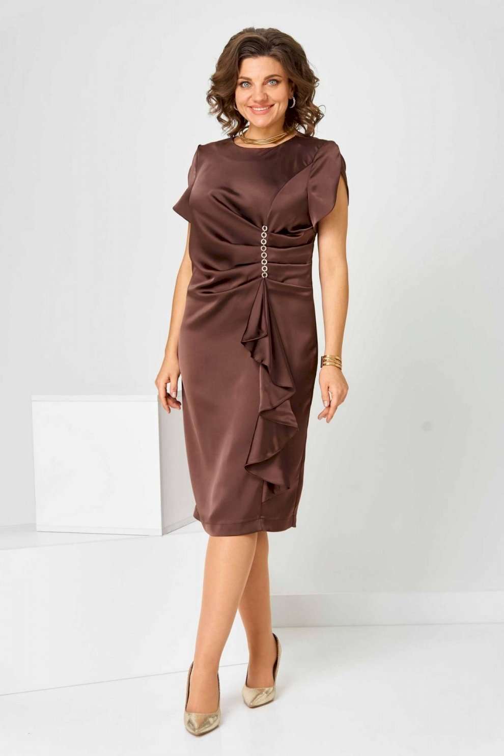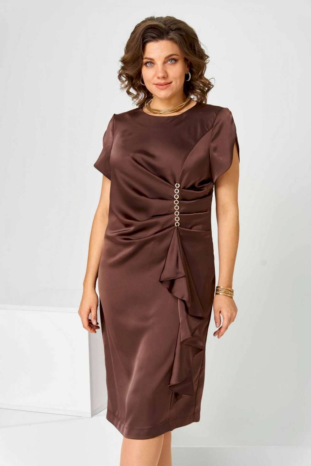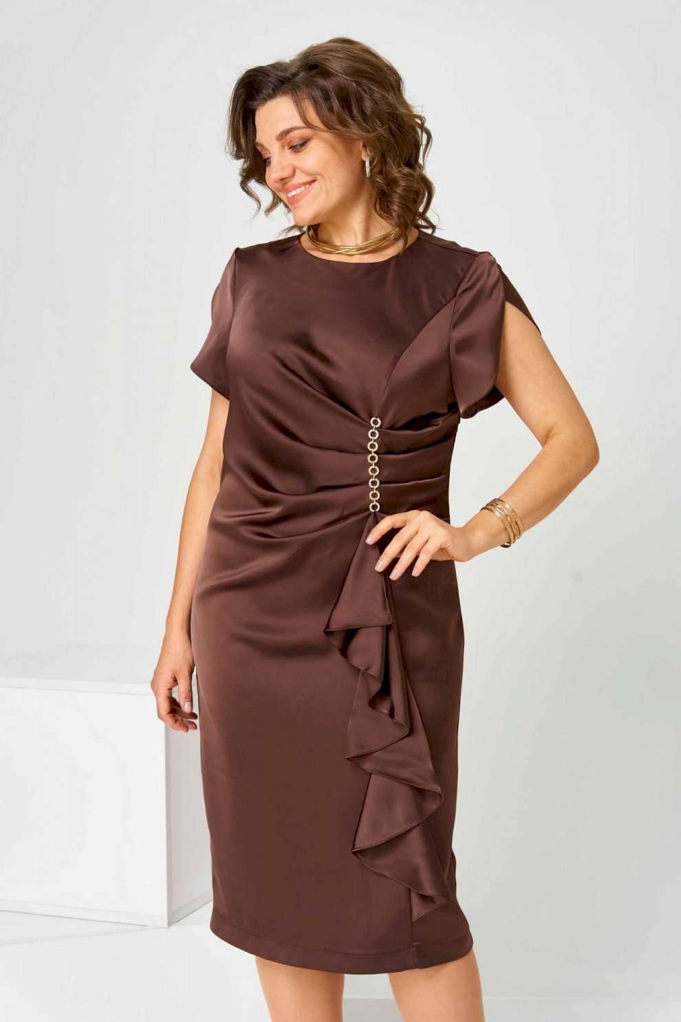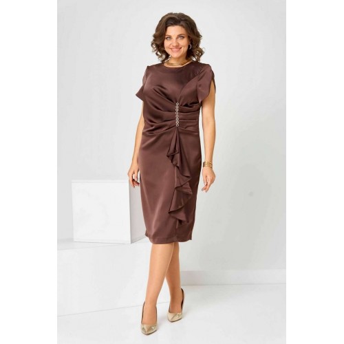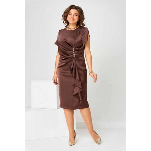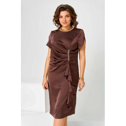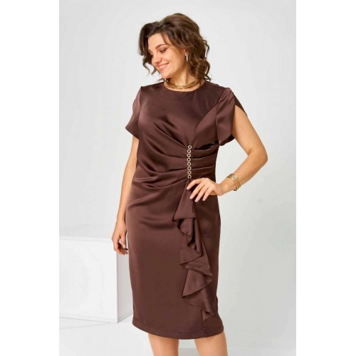 Элегантное женское платье в коричневом цвете с насыщенным шоколадным оттенком. Платье имеет полуприлегающий силуэт, который гармонично обрамляет фигуру, придавая ей женственные очертания. Выполнено из высококачественной плательной ткани. Дизайн изделия украшен уникальными деталями: асимметричный рельеф на передней части создает неповторимую драпировку, дополненную каскадом, благодаря чему платье выглядит объемным и динамичным. Округлый вырез горловины идеально смотрится с различными аксессуарами. Застежка на тесьму-молнию, расположенная на спинке в центральном шве, обеспечивает удобство при надевании. Верхний шлиц добавляет простор для движения, делая модель максимально комфортной к носке на протяжении всего дня. Платье доступно в нескольких размерах, обеспечивая идеальную посадку: объём груди, талии и бёдер варьируется на основе размера, гарантируя удобство и свободу движений. Ширина спинки также адаптирована для разных пропорций фигуры.