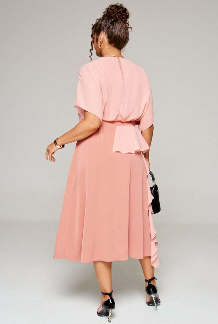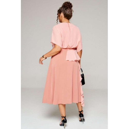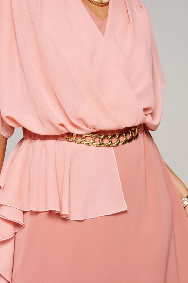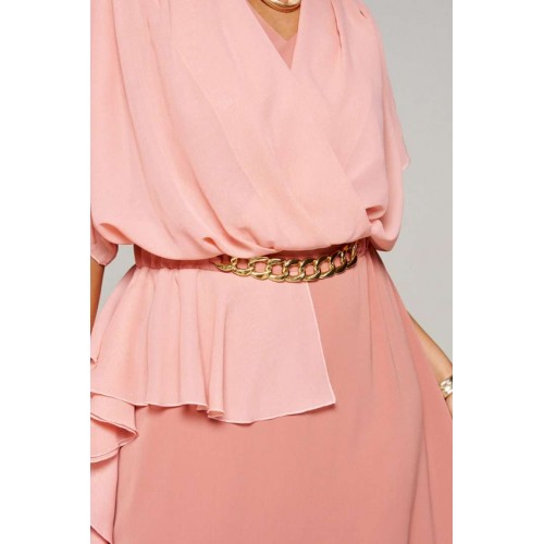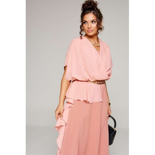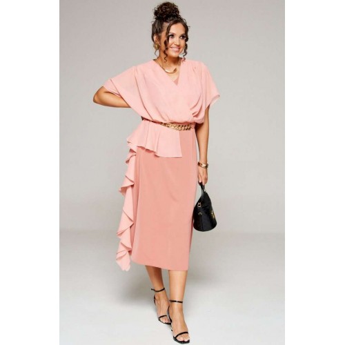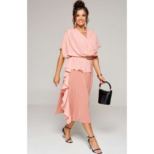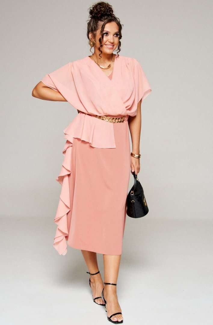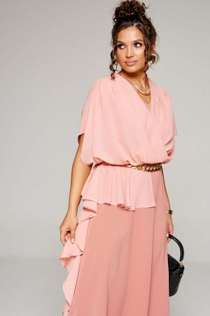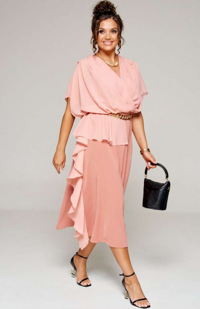 Платье! Нежное и воздушное. Идеальный вариант на каждый день и на деловую встречу. Платье женское в нарядно-романтическом стиле, отрезное по линии талии и декорированное отделочным элементом «под золото», выполнено из комбинации двух тканей: лёгкого струящегося шифона и смесового полотна. У этой ткани нежная, гладко-бархатистая фактура, приятная на ощупь и матовая поверхность, она легко драпируется и очень выгодно и дорого подчеркивает неповторимость образа, а шифон дополняет изысканностью и придаёт индивидуальность. Передняя верхняя часть платья двухслойная. Внутренняя часть, прилегающая к телу, с боковыми рельефами от проймы. Наружная часть из воздушного шифона выполнена на запах, на талии и на плече заложены глубокие складки. Верхняя часть спинки также двухслойная, разрезная по середине. На внутренней спинке для прилегания по талии застрочены вытачки, в средний шов вставлена длинная потайная молния. Средний шов наружной части оформлен в виде щелевидного разреза. По талии заложены мягкие складки. Конструкция верхней части платья выполнена в свободном стиле, нижняя часть платья А-силуэта (передняя цельная, задняя состоит из 2-х частей). На талии расположен пояс, который спереди декорирован отделочным элементом «цепь», а на боковых участках вставлена эластичная тесьма. Справа на юбке спереди и сзади располагаются асимметричные воланы, которые переходят в боковой шов. Рукав цельнокроеный, объёмный, свободный. Горловина округлой формы. Длина изделия по спинке: ~ 122-123 см. Длина рукава: ~ 33-34 см.