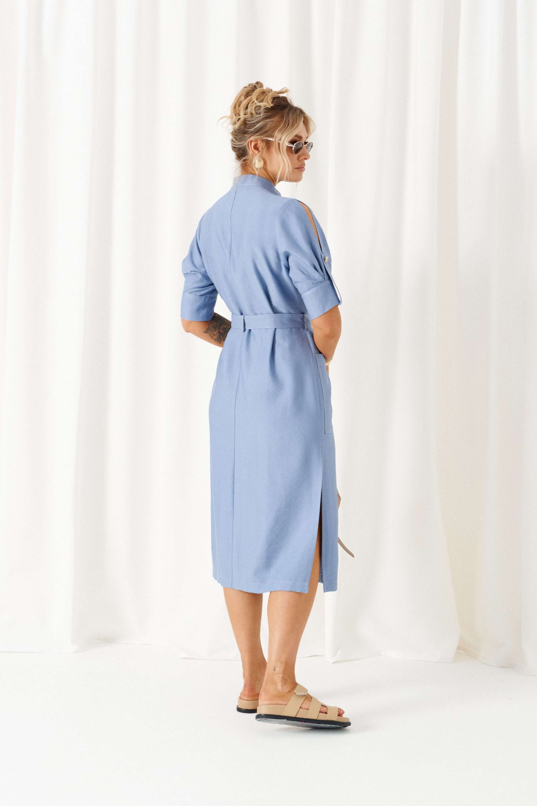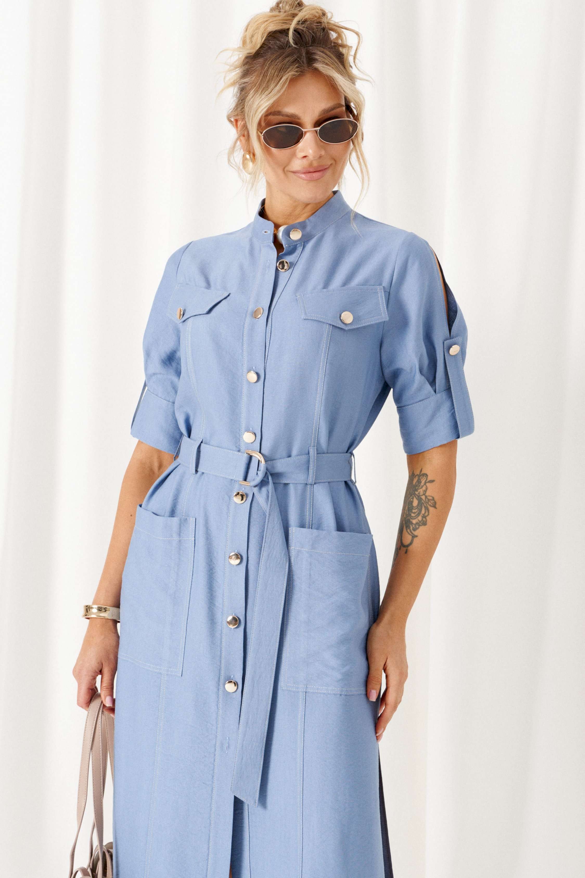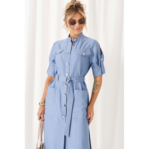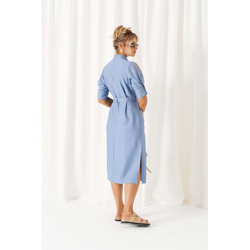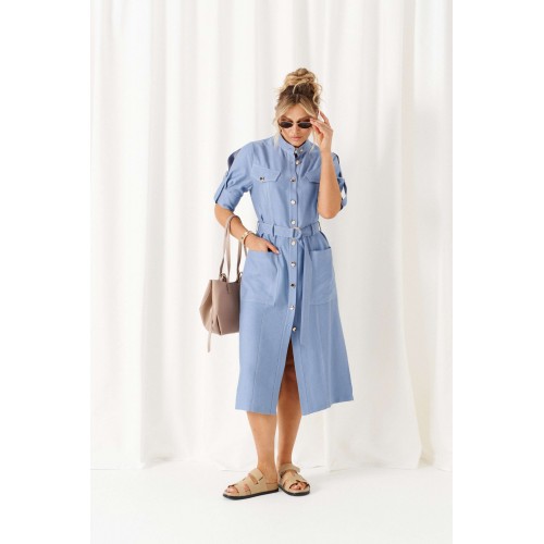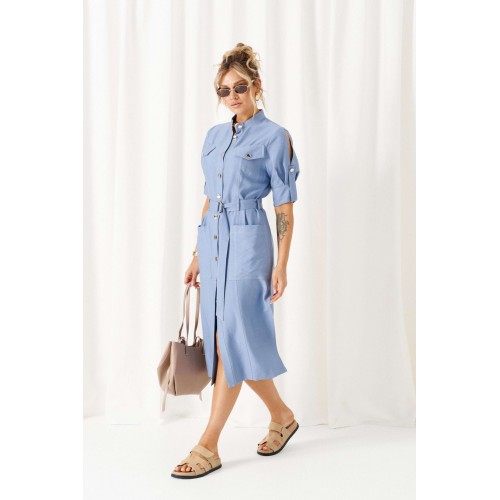Обстоятельства, когда кажется, что нечего надеть, легко меняет льняное платье. Строгий и свободный крой с акцентными деталями, актуальная цветовая палитра стиля «деним» - всё, что необходимо для комфорта и уверенности! Платье женское полуприлегающего силуэта, длиной «миди», в строгом и практичном стиле «деним» из смесового полотна с натуральными волокнами – лен и вискоза. Перед распашной с фигурными рельефами от проймы. В верхней части выполнены клапаны с фиксацией на пуговицу. В нижней части на уровне бедра расположены функциональные накладные карманы. Спинка разрезная по среднему шву. Воротник - стойка. Рукав втачной двухшовный длиной до локтя, с оформлением низа на притачной манжете и двумя мягкими встречными складками от неё. Застёжка центральная по притачной планке на петли и пуговицы. Низ ровный, боковых швах предусмотрены разрезы. В комплекте к платью прилагается пояс на декоративной пряжке-полукольцо. Длина изделия по спинке ~ 117 см. Длина рукава ~ 33 см.
