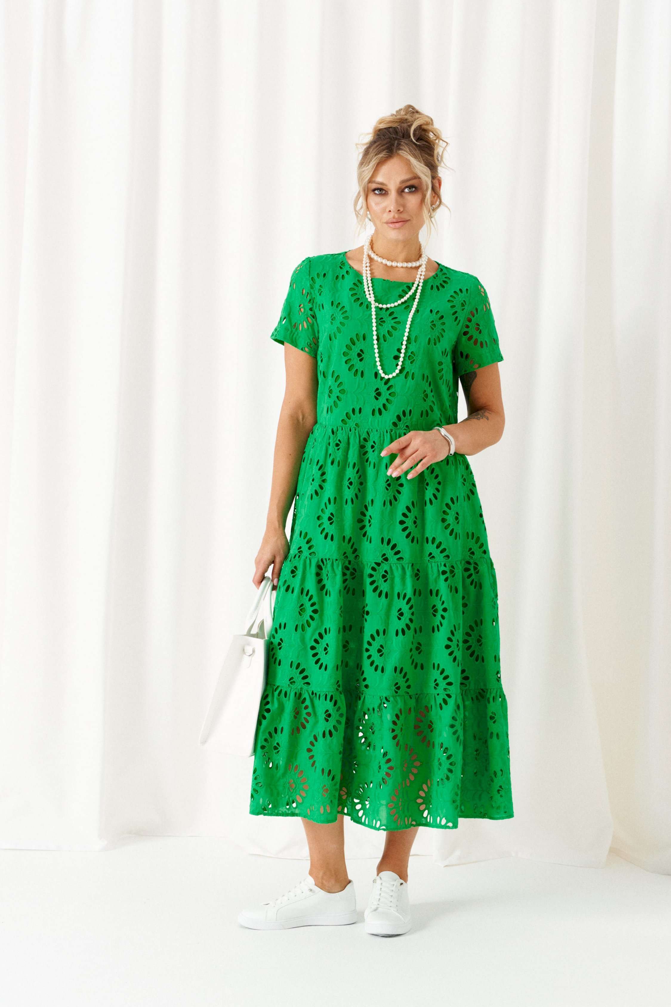 Легкое, струящееся платье из хлопка – идеальный выбор для лета! Универсального фасона, подходящее для любого мероприятия, длинное платье свободного силуэта из хлопка станет любимым в гардеробе! Даже в самый жаркий день вы будете чувствовать уверенно и комфортно. Платье позволяет скрыть особенности фигуры, на которые не хочется акцентировать внимание. В городских буднях, а также на отдыхе просто не обойтись без модели из хлопковой ткани! Платье длинной в пол, на хлопковой подкладке, отрезное по линии талии. Верхняя часть переда цельнокроеная с двумя нагрудными вытачками от бокового шва. Спинка цельнокроеная с двумя вытачками на талии. Низ платья объемный, широкий состоит из трех воланов одинаковой ширины. Рукав короткий, одношовный, втачной. Горловина округлая. Длина изделия по спинке ~ 128 см. Длина рукава ~ 24 см.