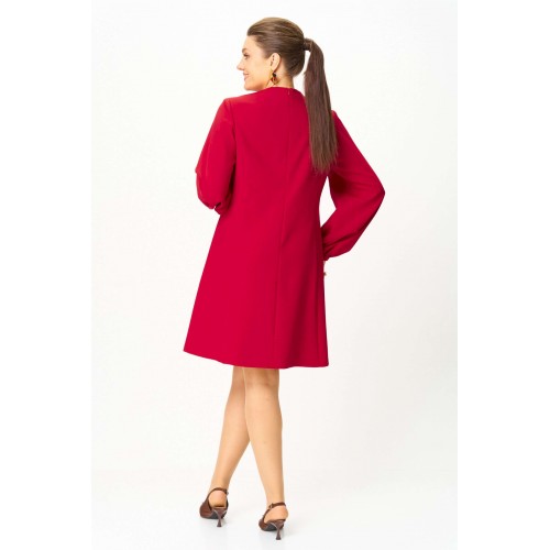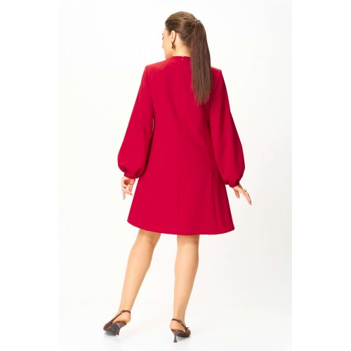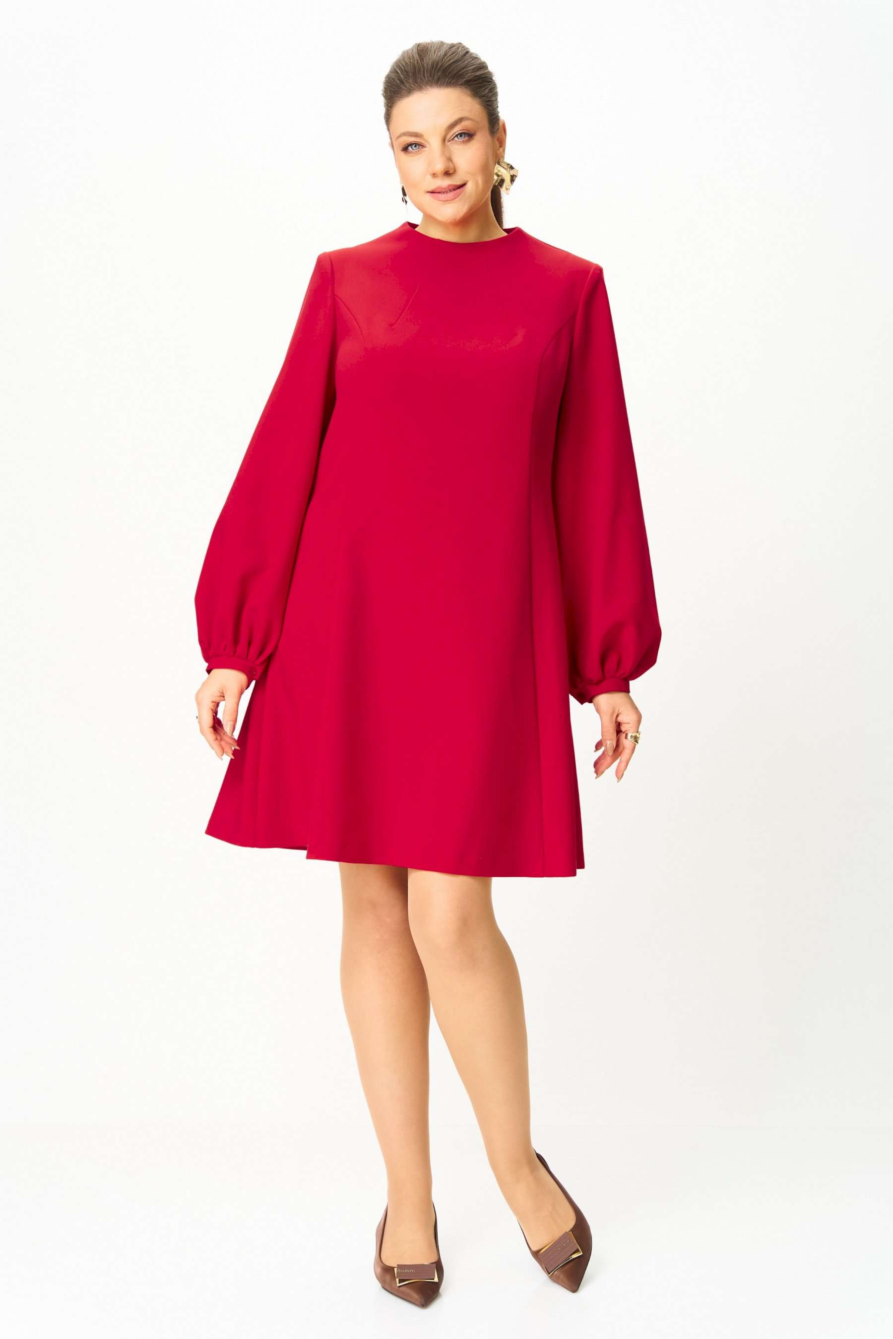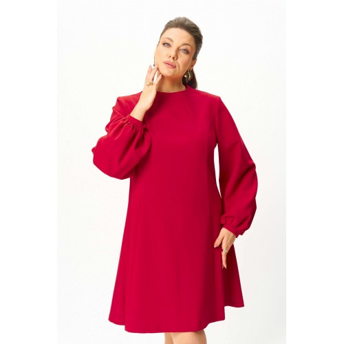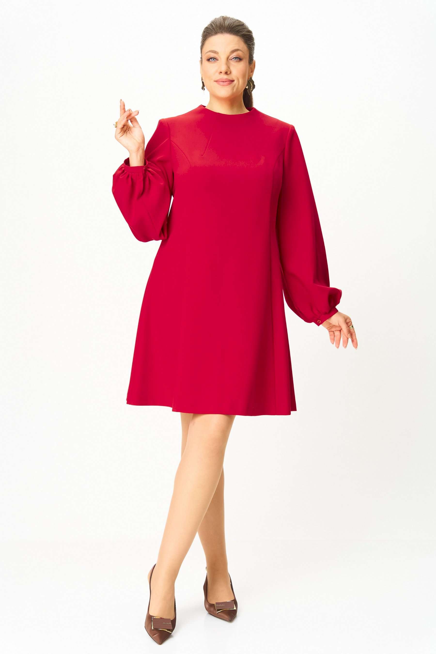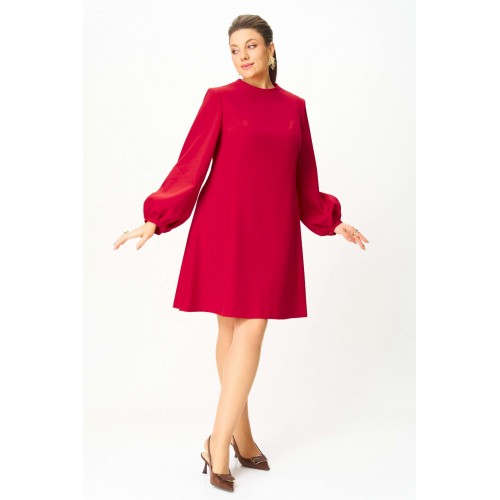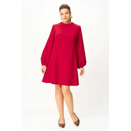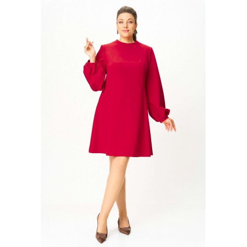 Стильное женское платье из плательной ткани с содержанием вискозы. Платье «А» образного силуэта с рельефными швами по переду и спинке. Горловина круглая с цельновыкроенной стойкой. Застежка на тесьму молния в центральном шве спинки. Рукава втачные, со сборкой по низу, на узком манжете с застежкой на петлю и пуговицу. Платье без подкладки. Длина платья – 97 см. Длина рукава – 64 см.