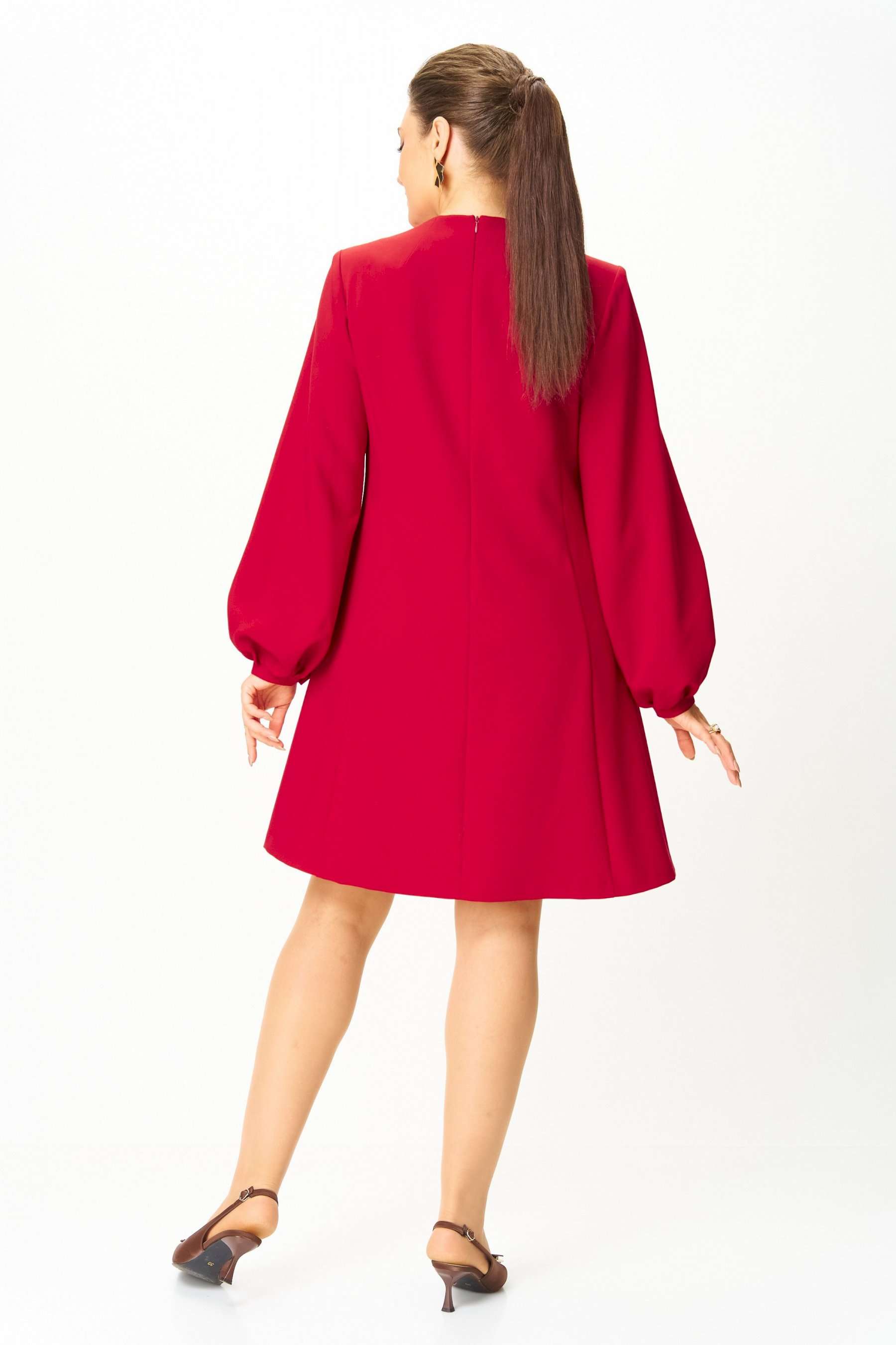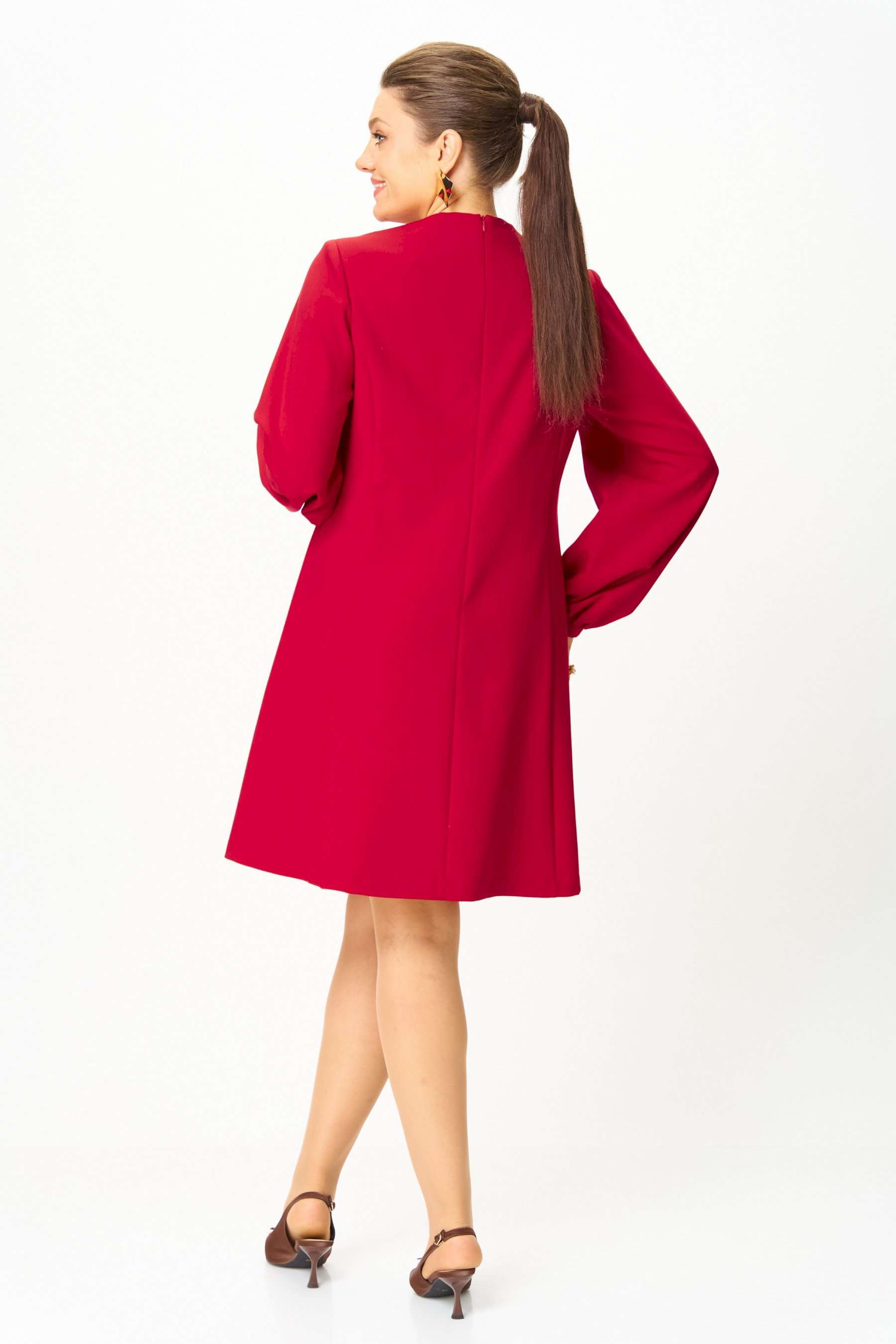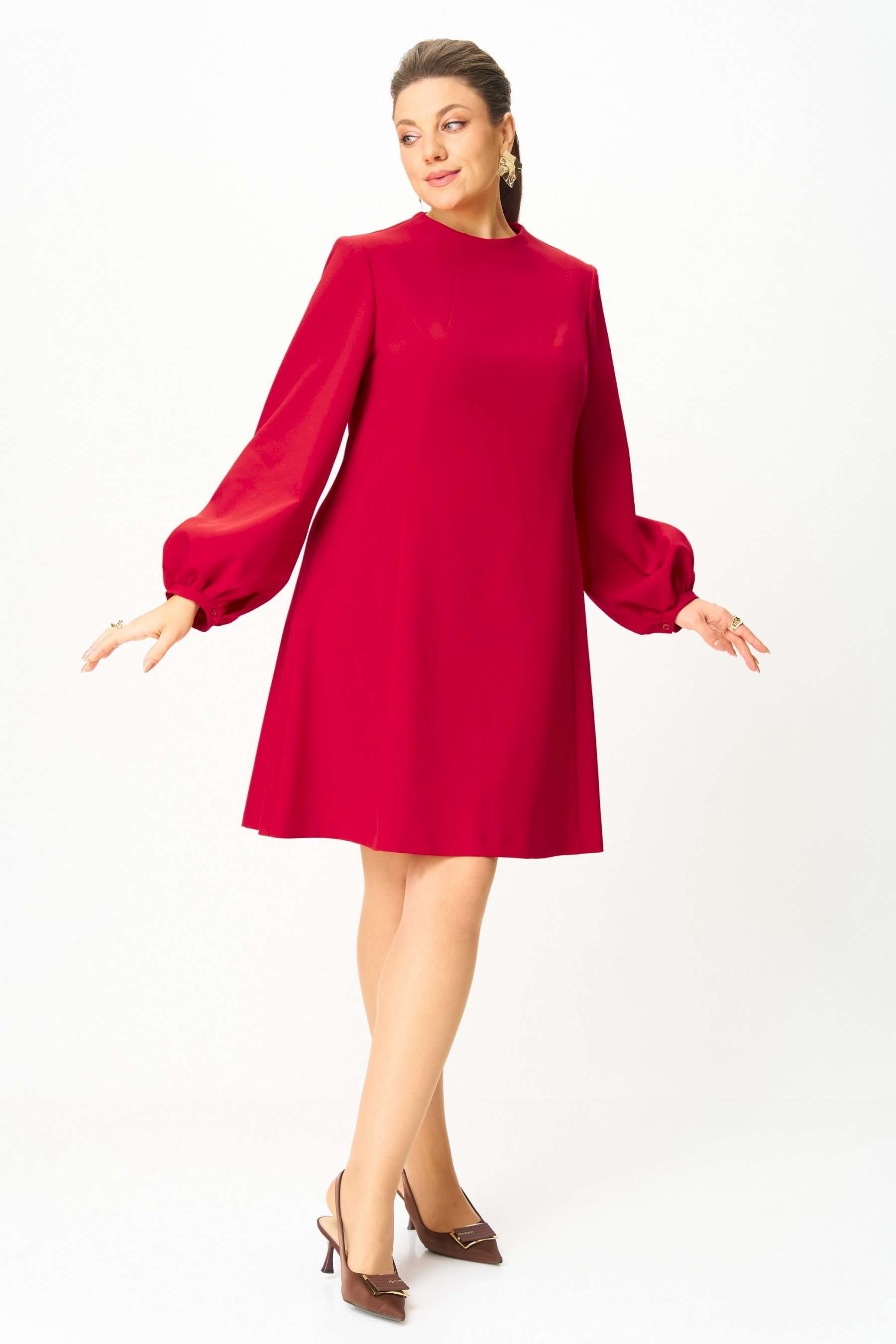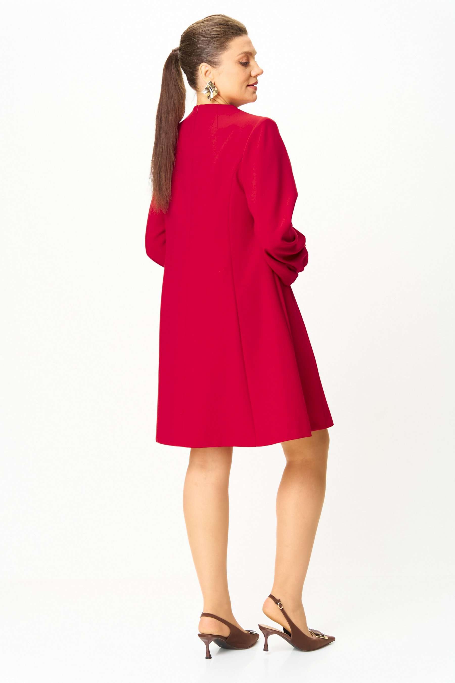 Стильное женское платье из плательной ткани с содержанием вискозы. Платье «А» образного силуэта с рельефными швами по переду и спинке. Горловина круглая с цельновыкроенной стойкой. Застежка на тесьму молния в центральном шве спинки. Рукава втачные, со сборкой по низу, на узком манжете с застежкой на петлю и пуговицу. Платье без подкладки. Длина платья – 97 см. Длина рукава – 64 см.