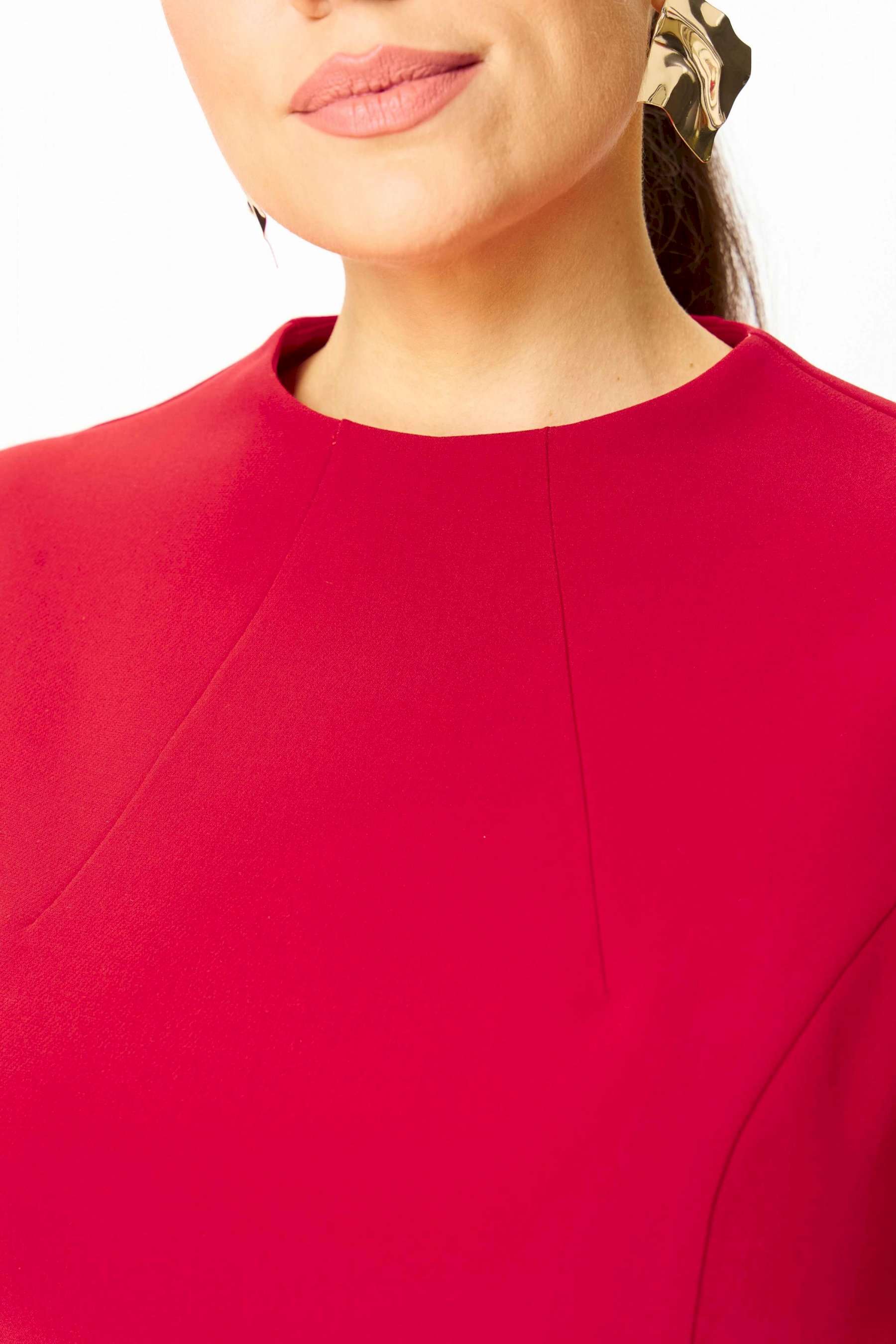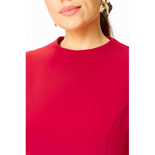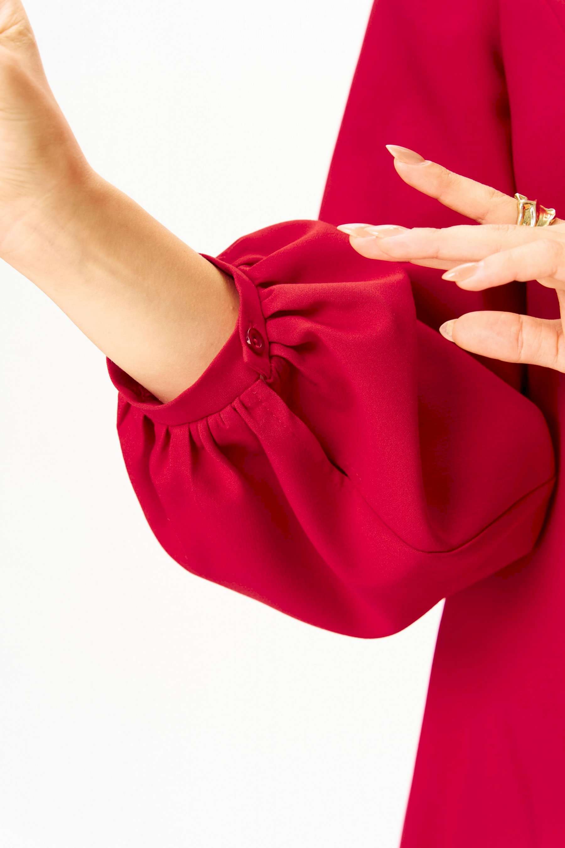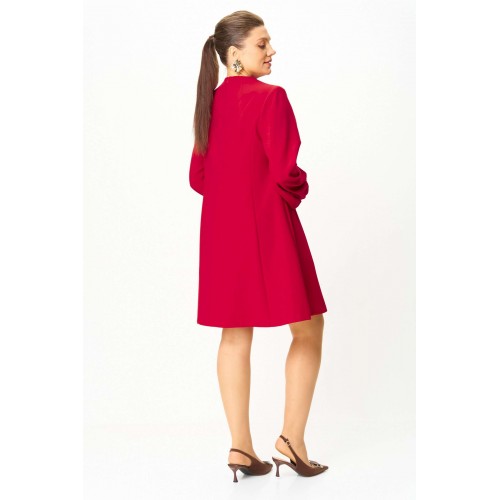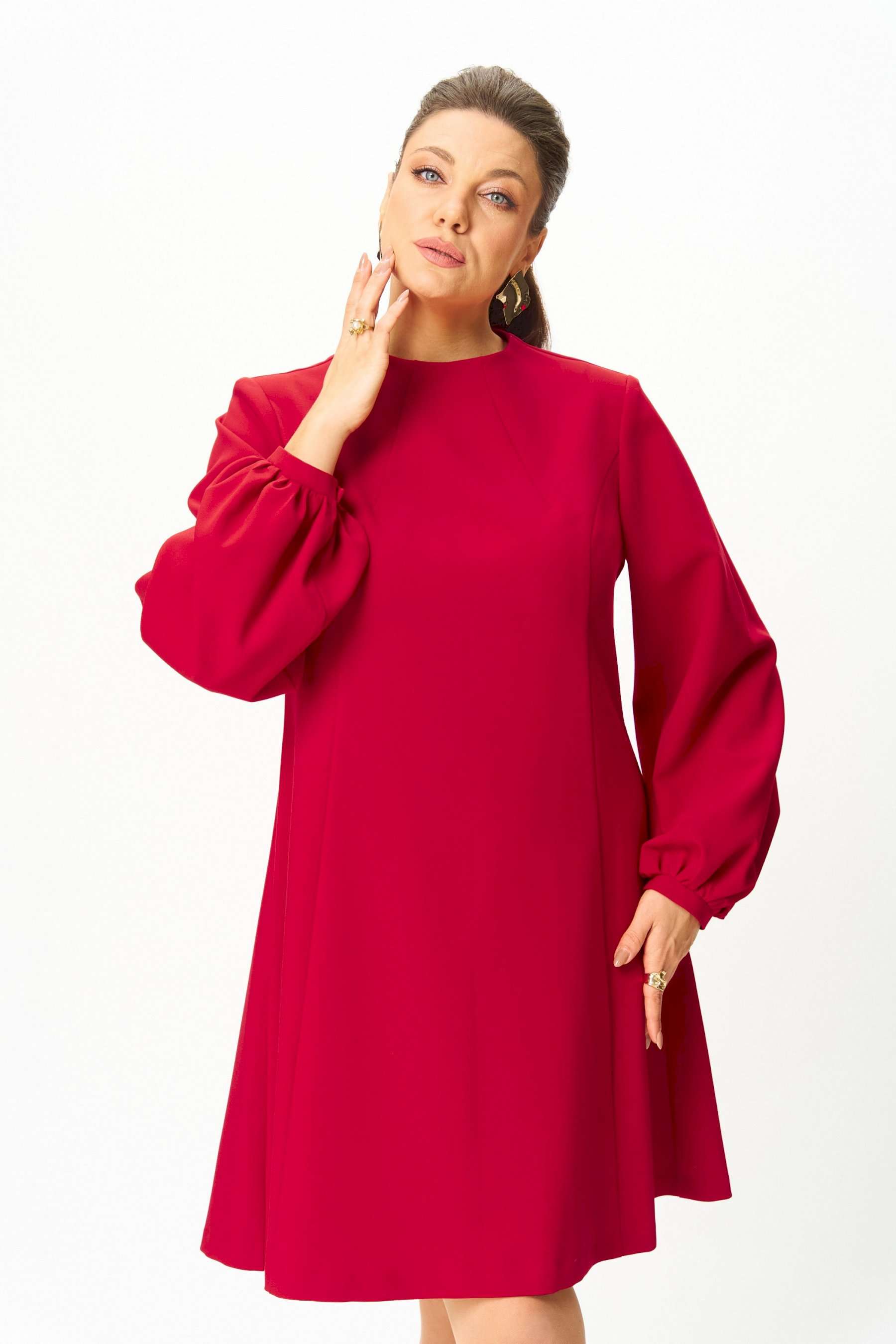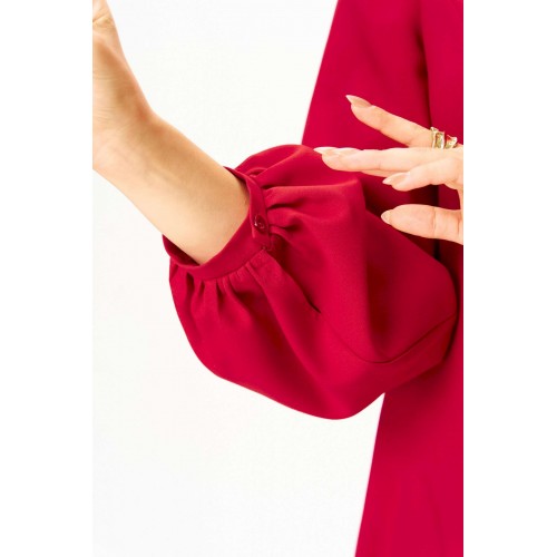 Стильное женское платье из плательной ткани с содержанием вискозы. Платье «А» образного силуэта с рельефными швами по переду и спинке. Горловина круглая с цельновыкроенной стойкой. Застежка на тесьму молния в центральном шве спинки. Рукава втачные, со сборкой по низу, на узком манжете с застежкой на петлю и пуговицу. Платье без подкладки. Длина платья – 97 см. Длина рукава – 64 см.