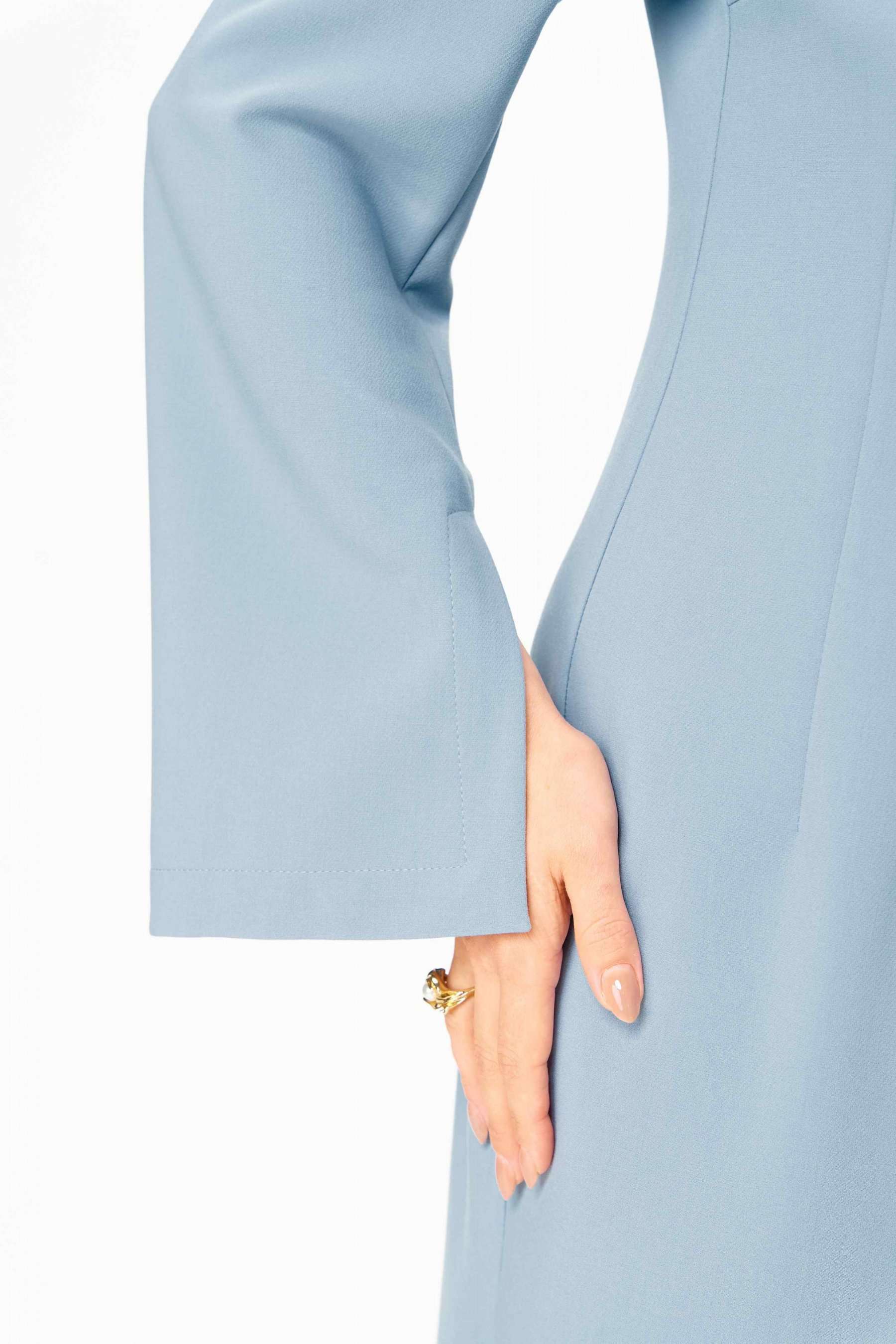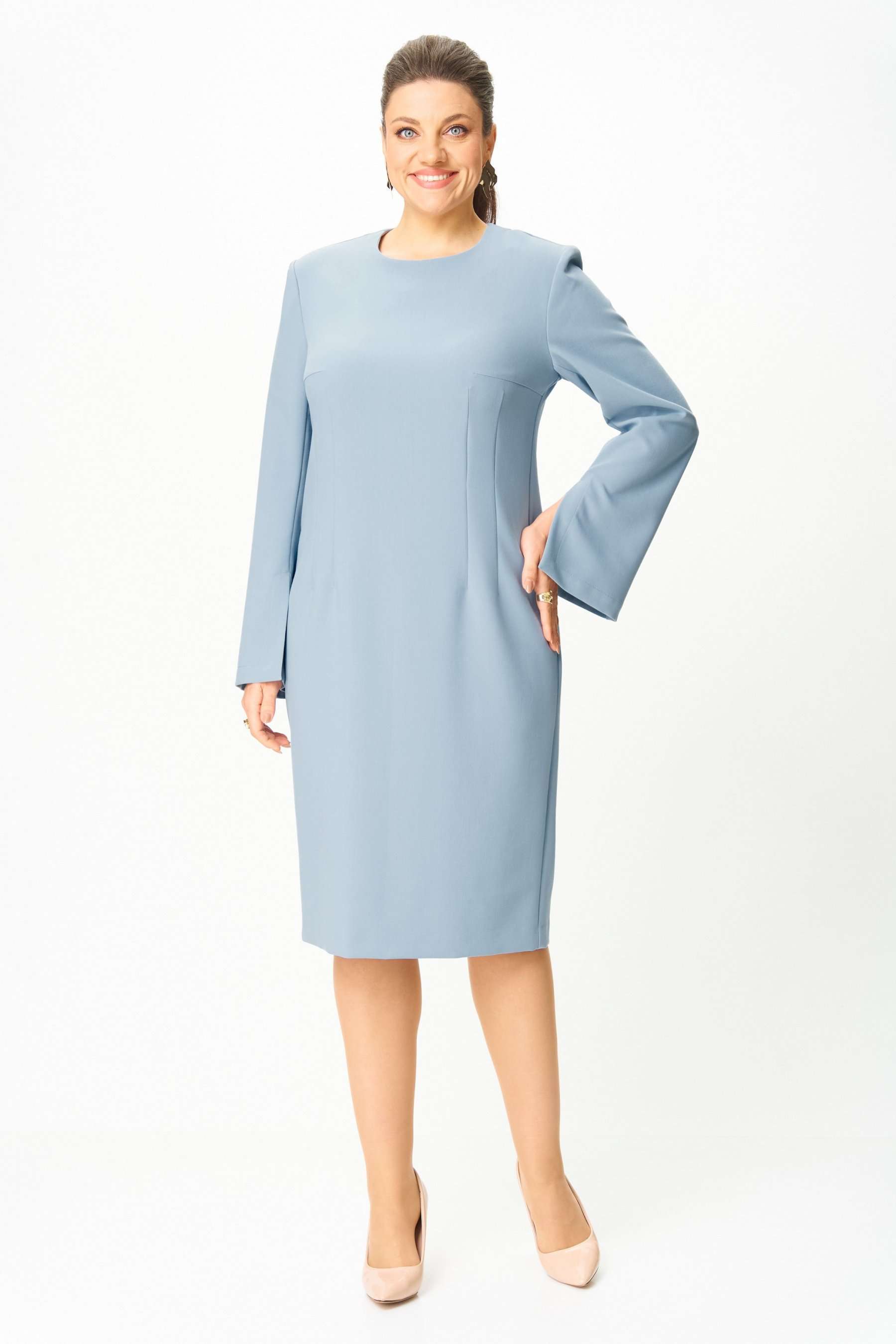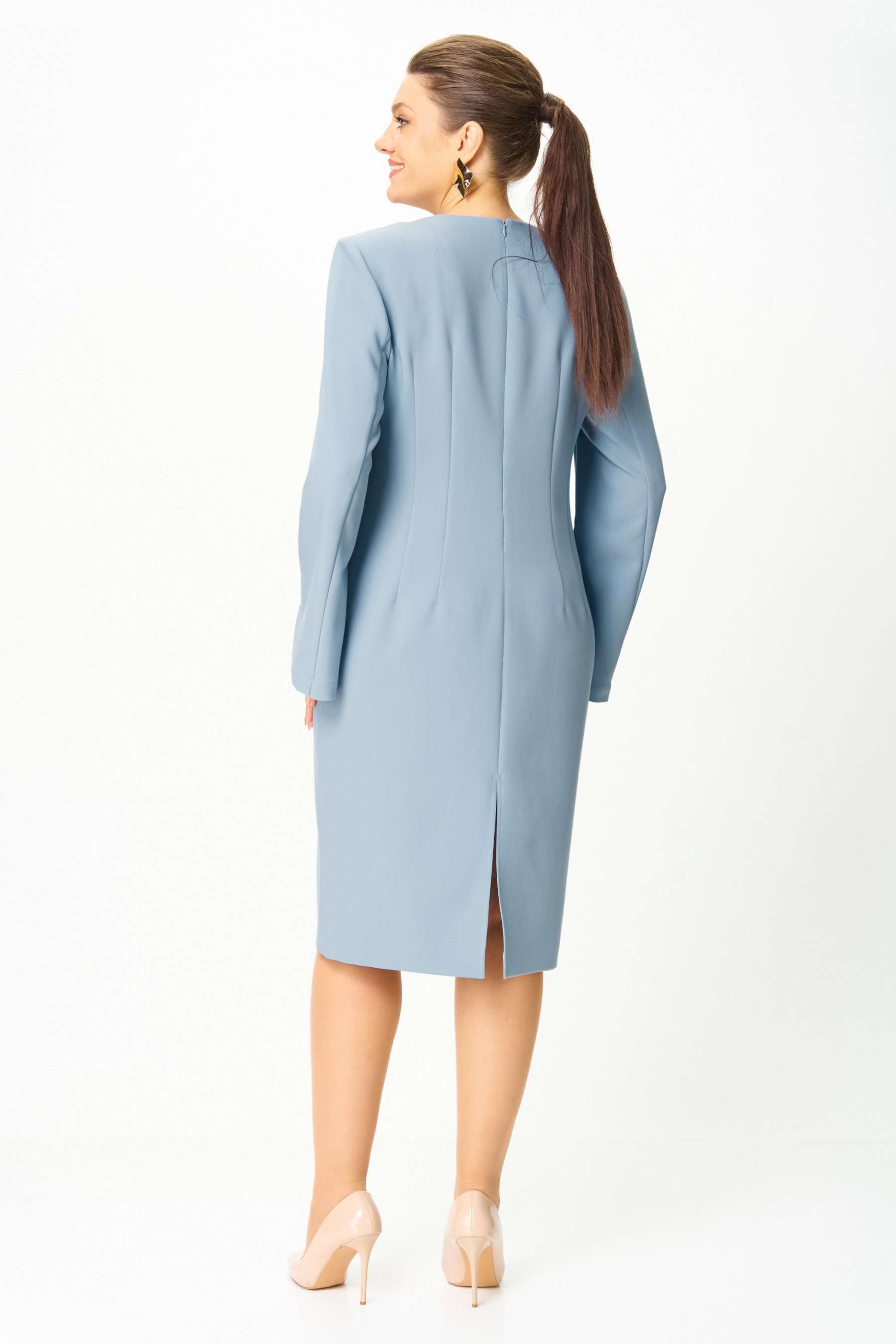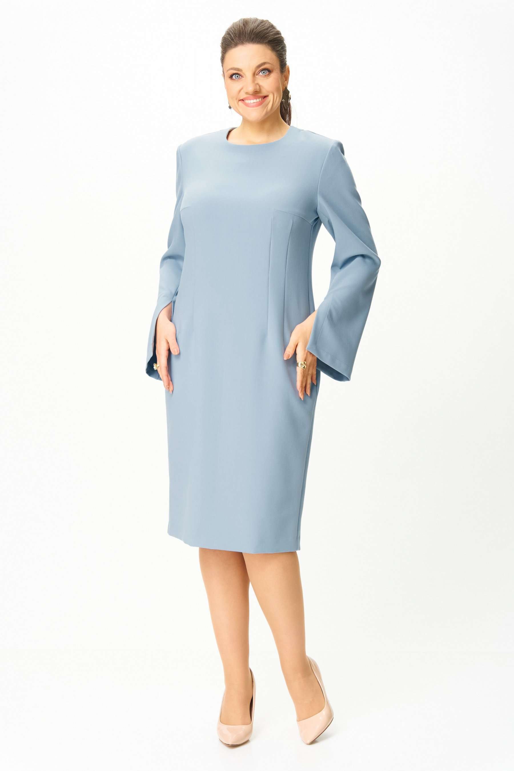 Элегантное женское платье, прилегающего силуэта: по переду и спинке вытачки по талии. Горловина круглая. Застежка на молнию в центральном шве спинки. Рукава втачные, двухшовные, расширенные к низу, в переднем шве, по низу, разрез. Платье без подкладки. Длина платья – 106 см. Длина рукава – 62 см.