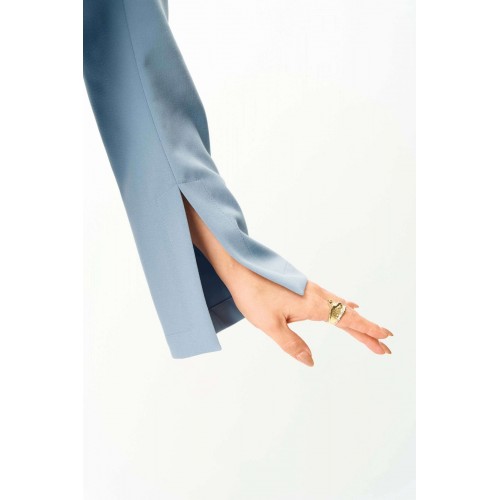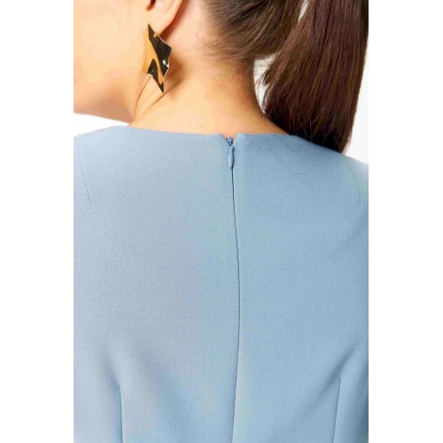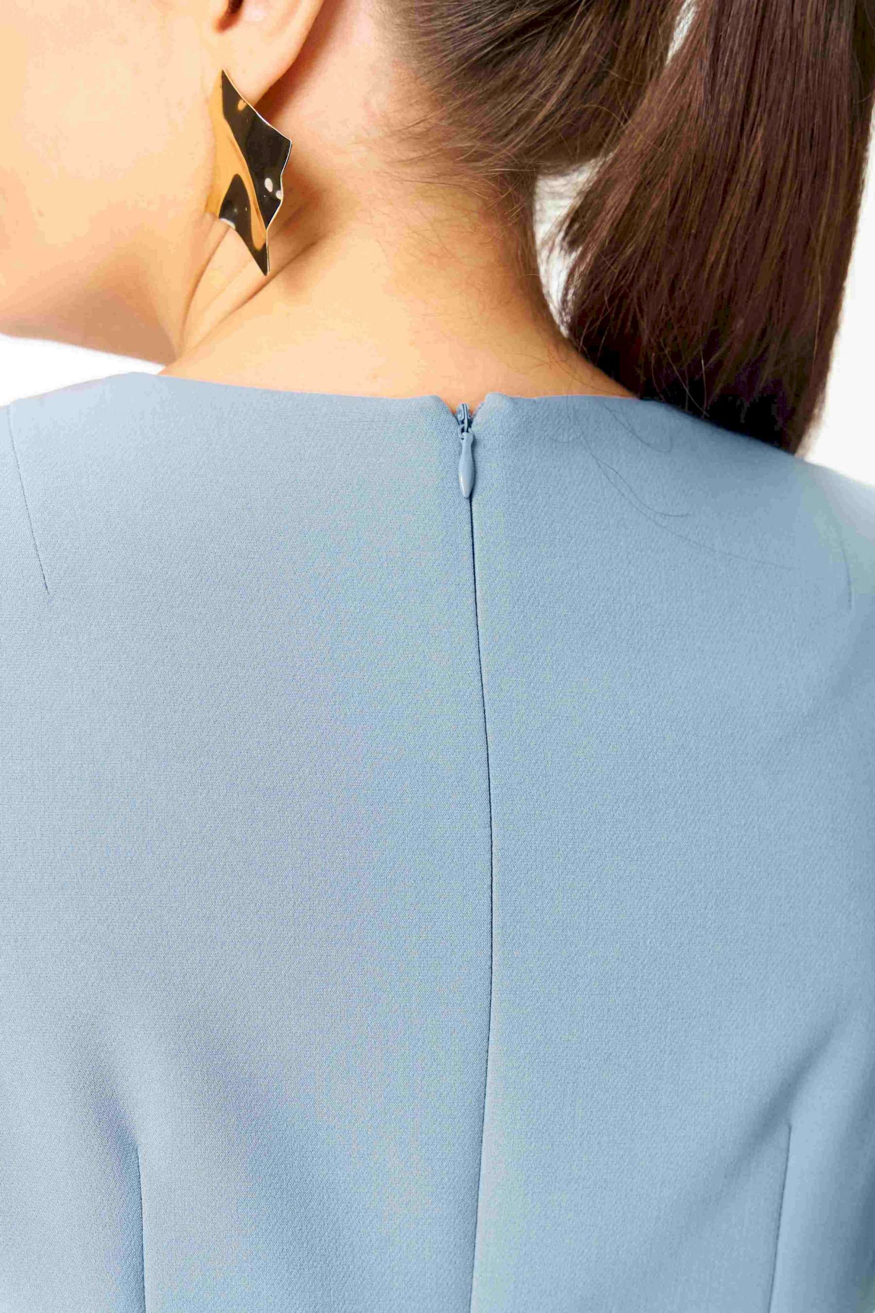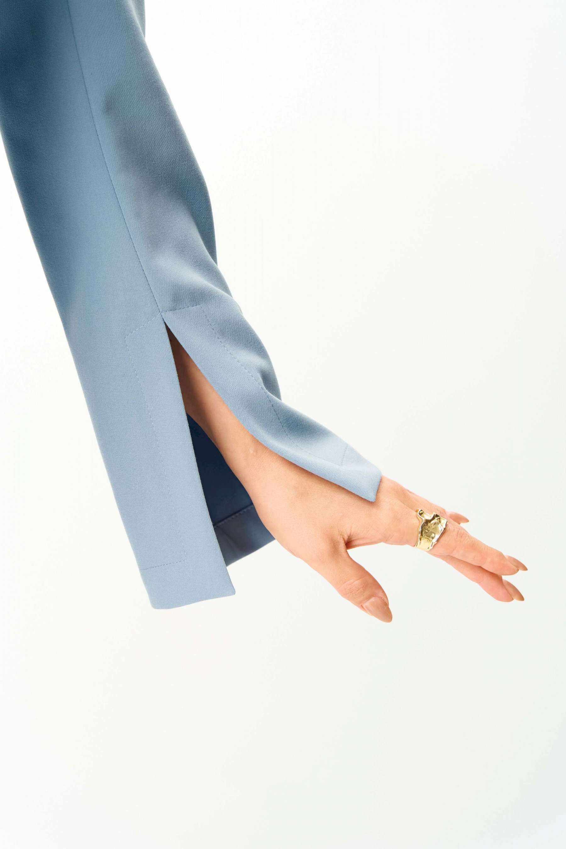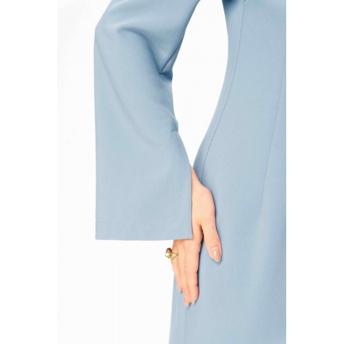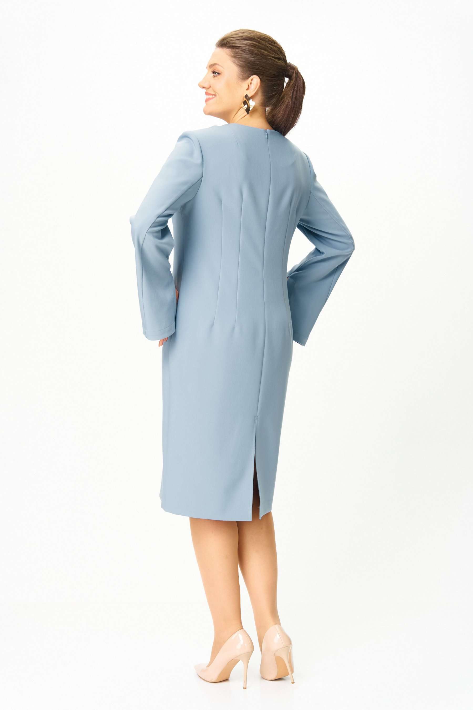 Элегантное женское платье, прилегающего силуэта: по переду и спинке вытачки по талии. Горловина круглая. Застежка на молнию в центральном шве спинки. Рукава втачные, двухшовные, расширенные к низу, в переднем шве, по низу, разрез. Платье без подкладки. Длина платья – 106 см. Длина рукава – 62 см.
