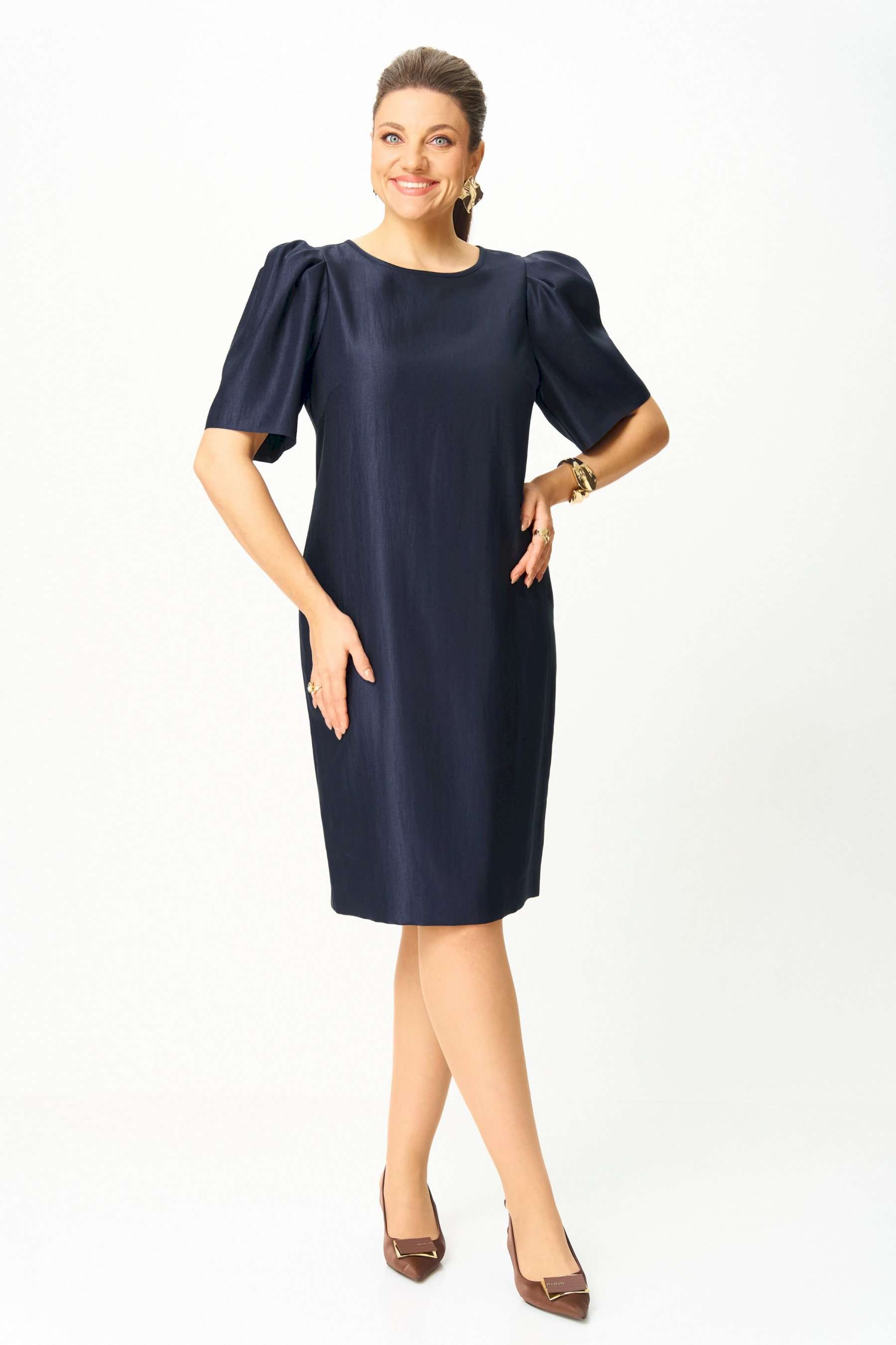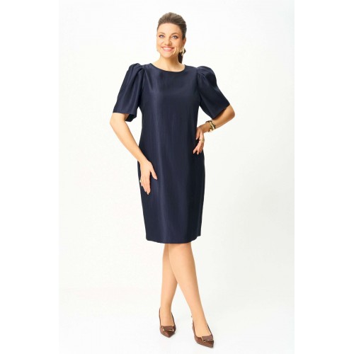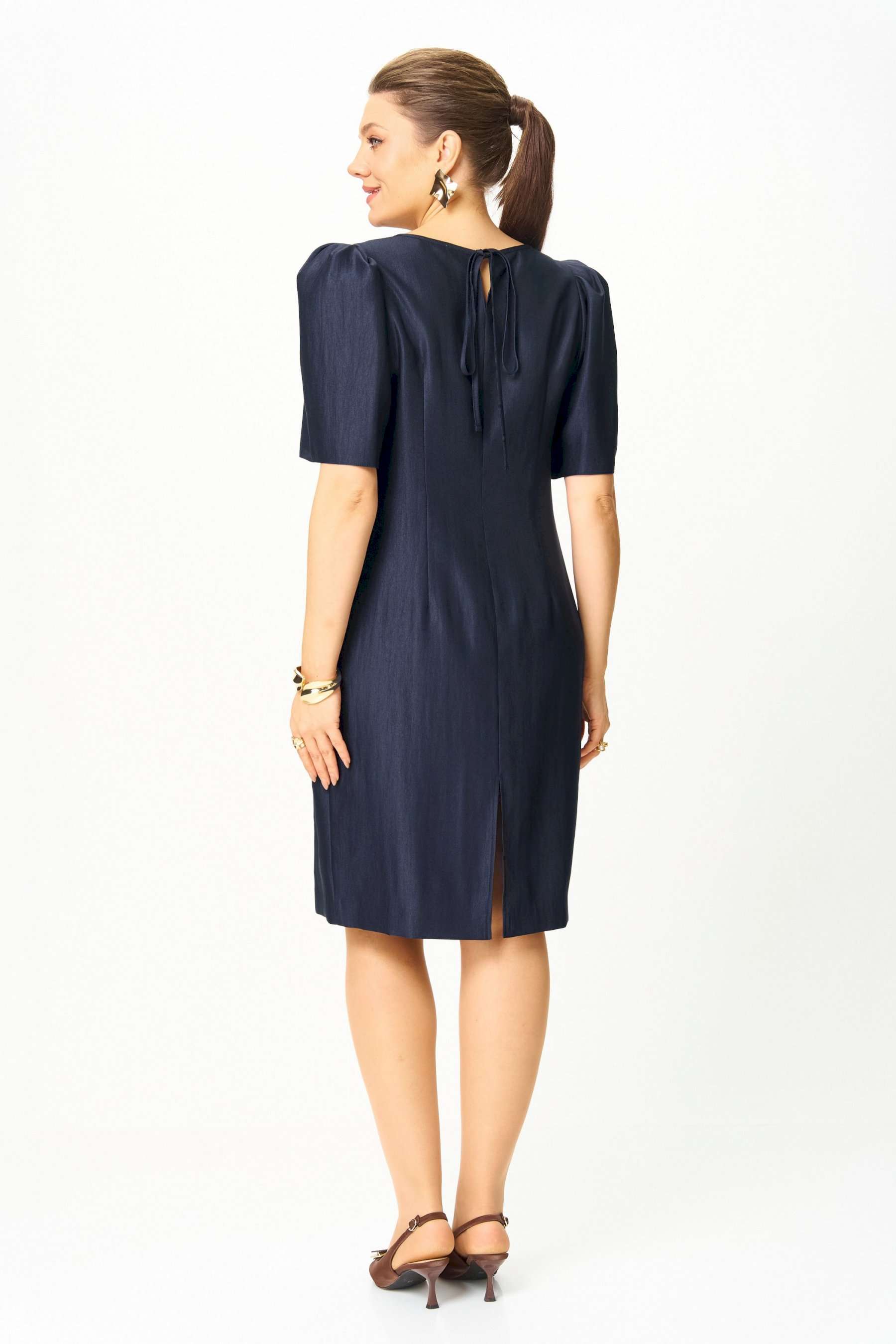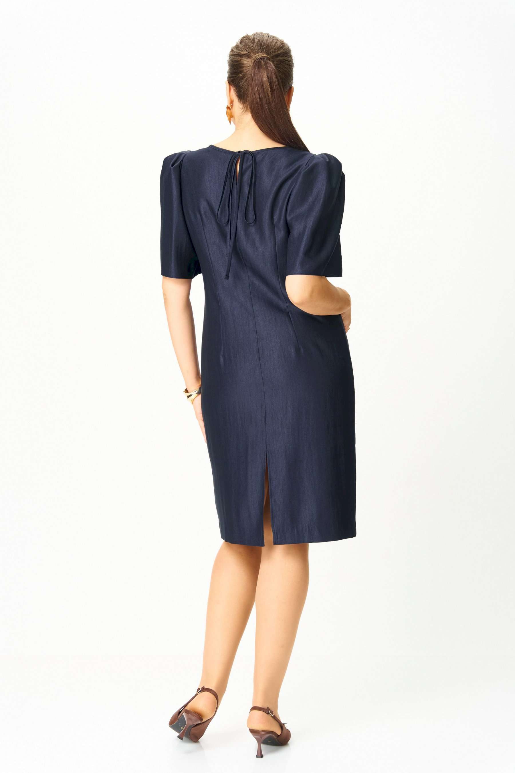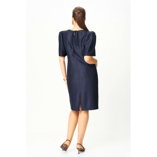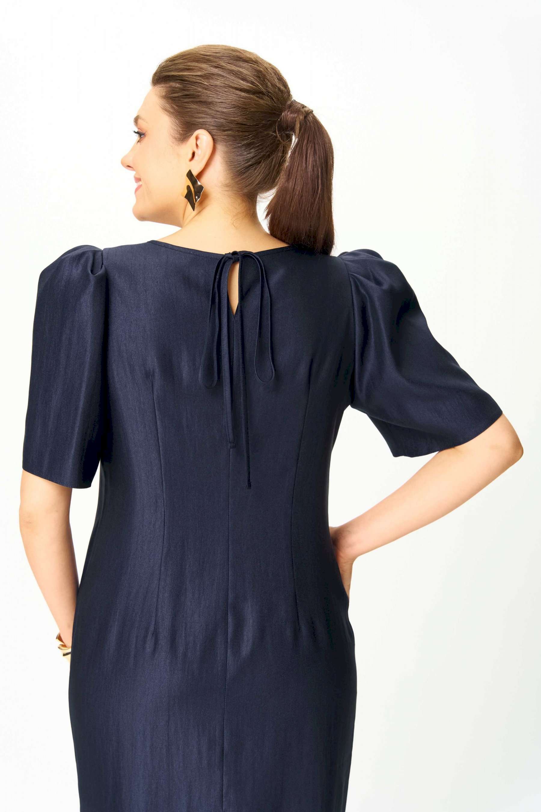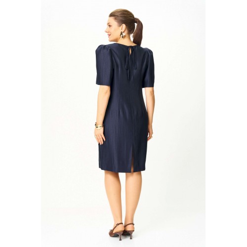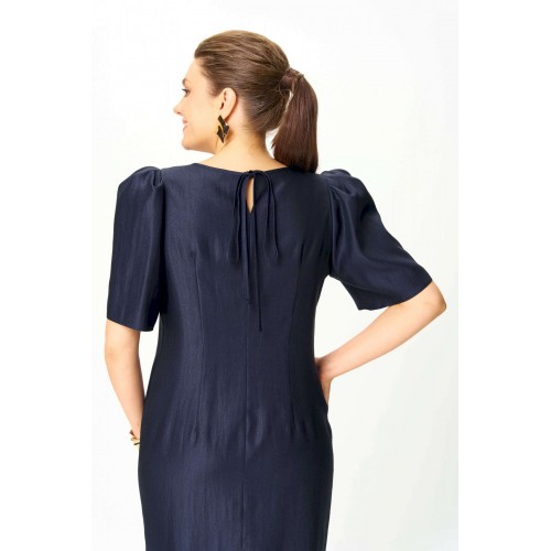 Элегантное женское платье, выполнено из плательной ткани с небольшим блеском. Платье полуприлегающего силуэта, горловина круглая. По спинке в центральном шве разрез возле горловины с завязкой и разрез по низу. Платье без подкладки. Длина платья – 97 см. Длина рукава – 36 см.
