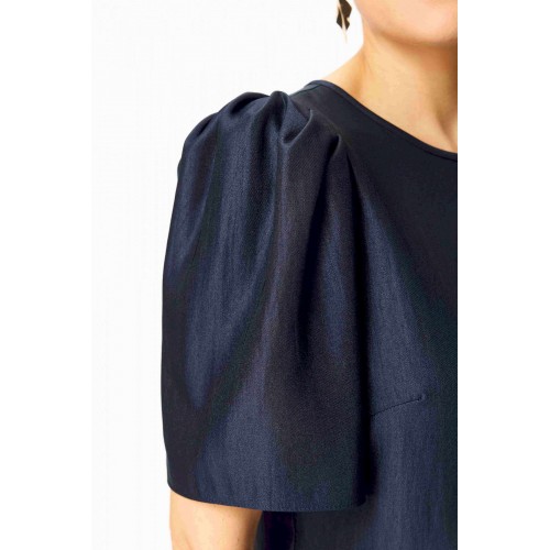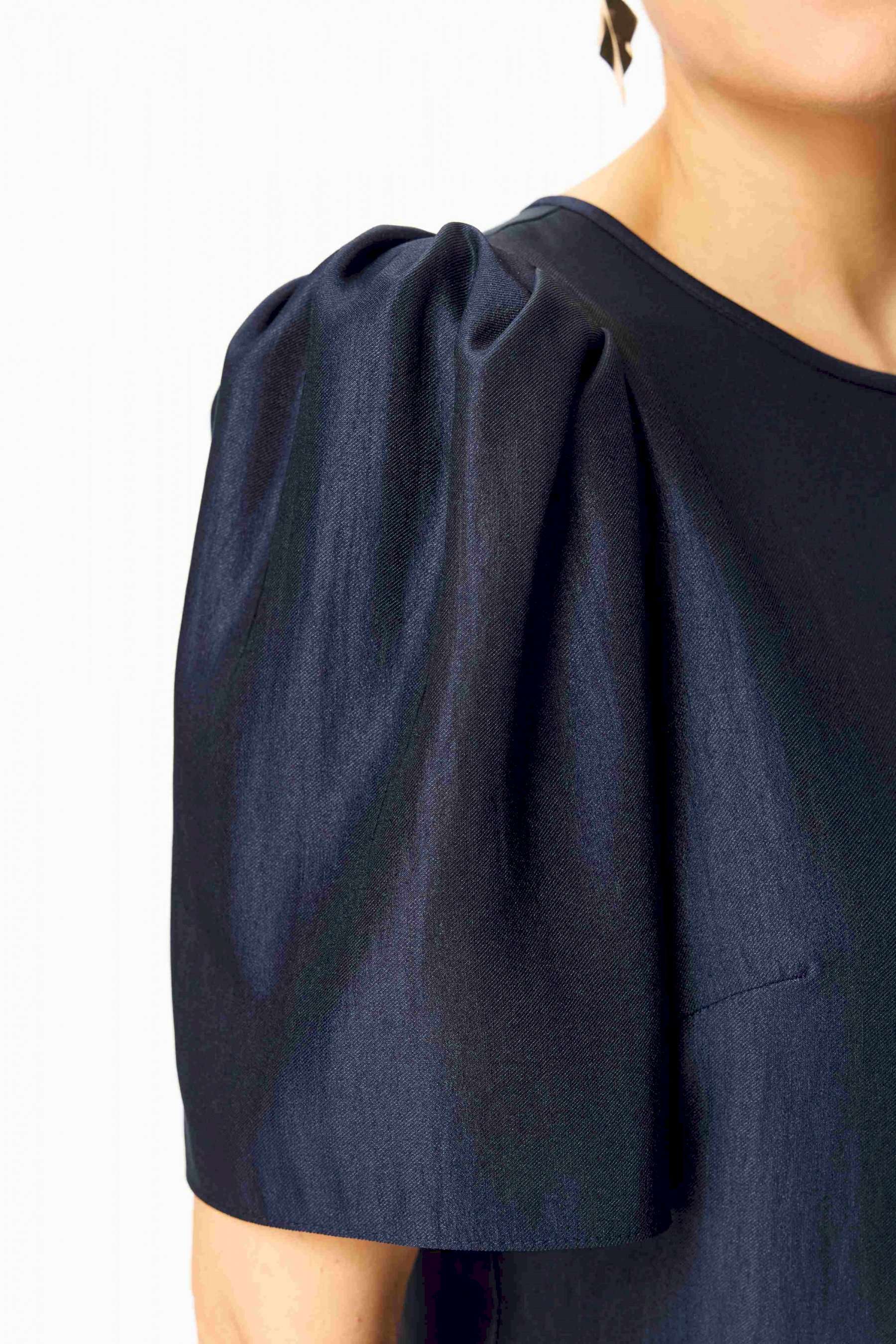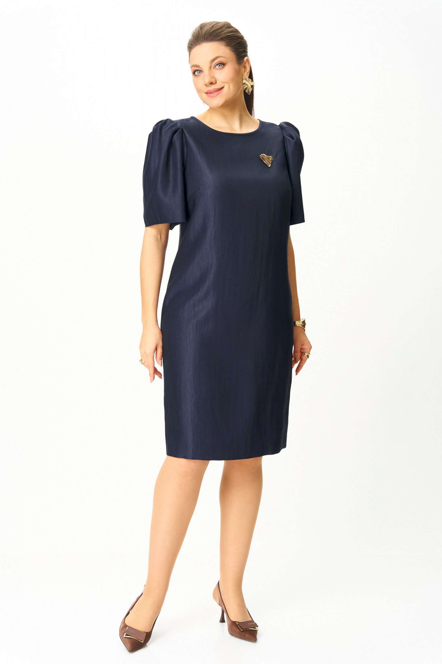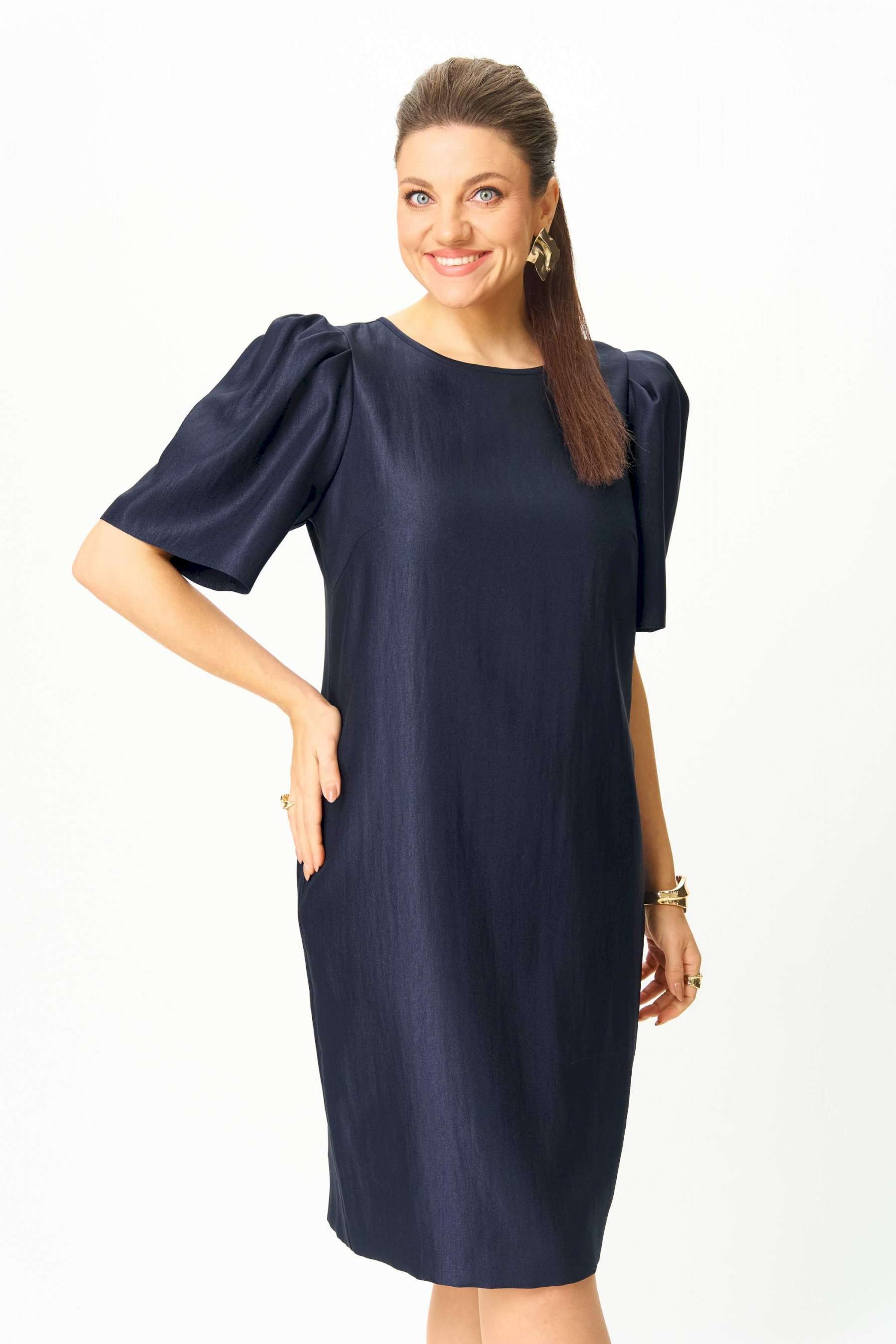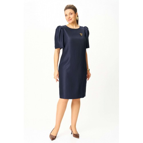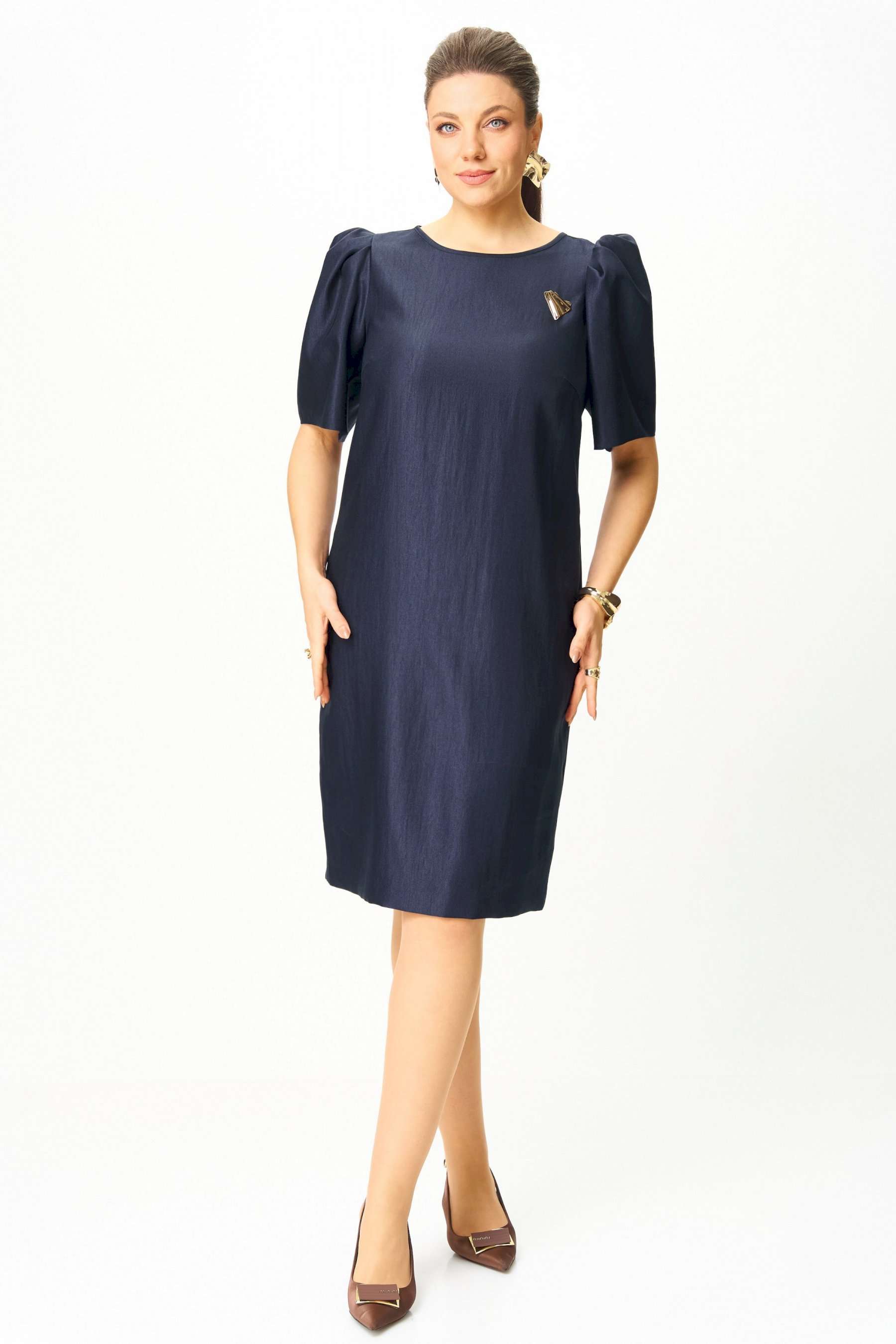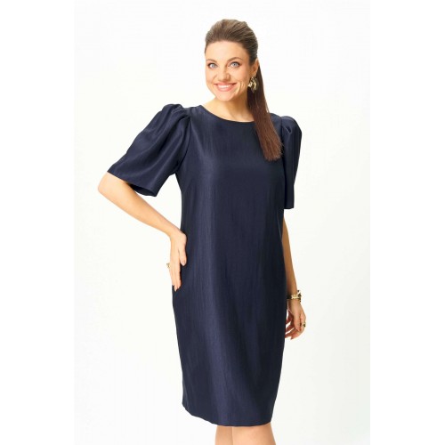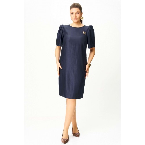 Элегантное женское платье, выполнено из плательной ткани с небольшим блеском. Платье полуприлегающего силуэта, горловина круглая. По спинке в центральном шве разрез возле горловины с завязкой и разрез по низу. Платье без подкладки. Длина платья – 97 см. Длина рукава – 36 см.