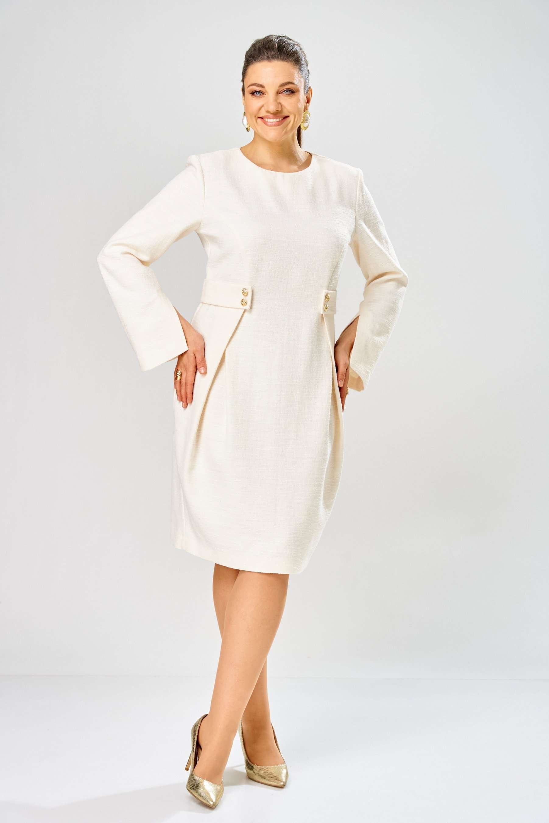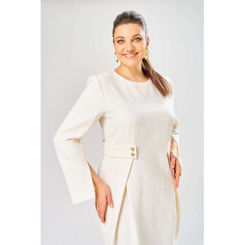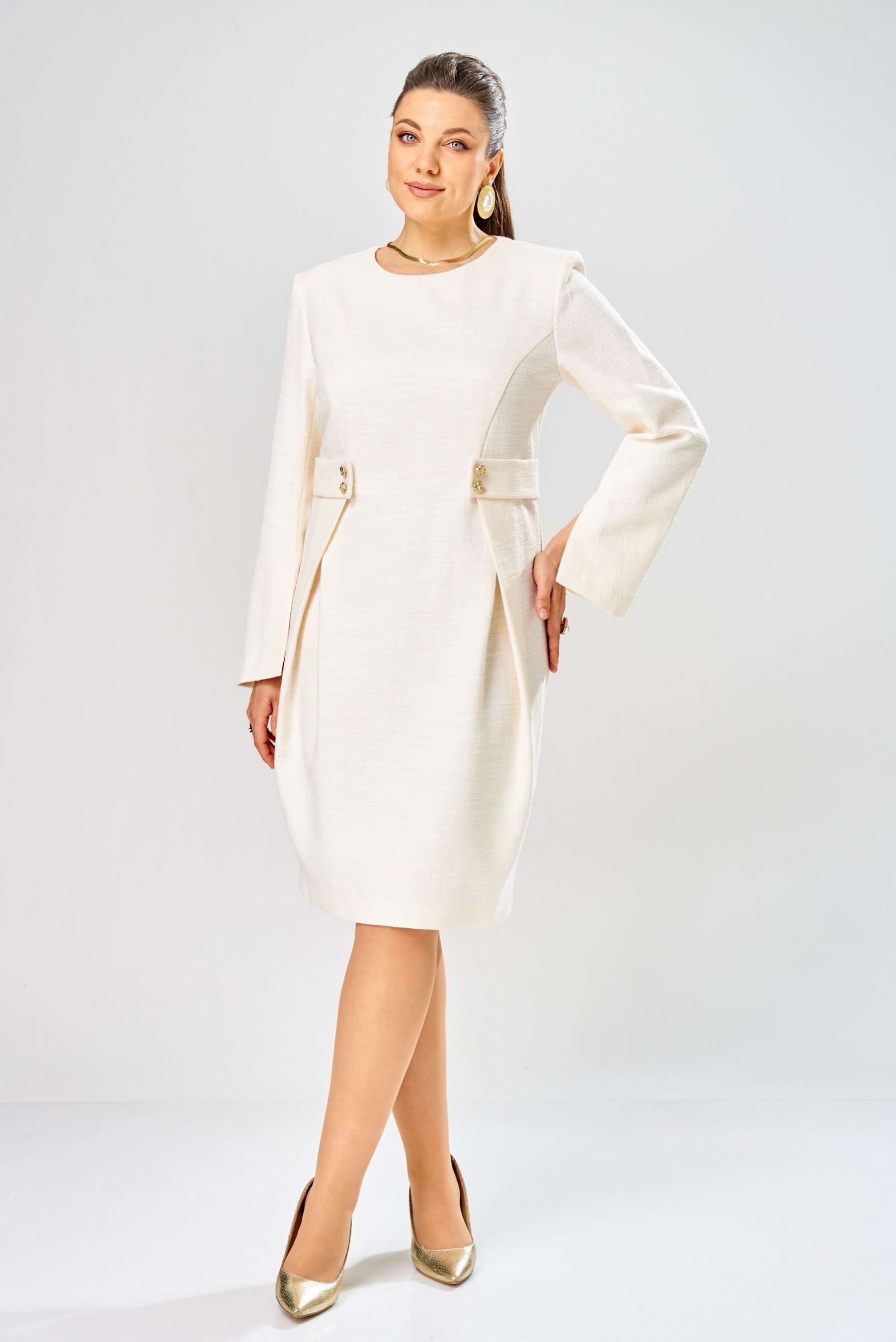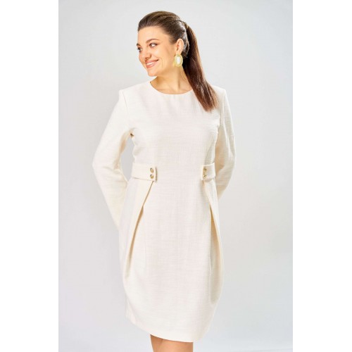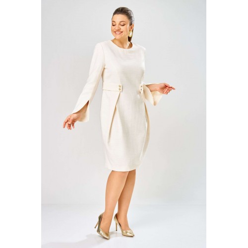 Элегантное женское платье выполнено из жаккардовой ткани с большим содержанием хлопка. Платье полуприлегающего силуэта, по переду в верхней части лифа отрезные бочки. Горловина круглая, по линии талии декоративные элементы с пуговицами. Рукава втачные расширенные к низу, по переднему шву с разрезом. Застежка на тесьму молнию в среднем шве спинки. Платье без подкладки. Длина платья – 100 см Длина рукава – 63 см
