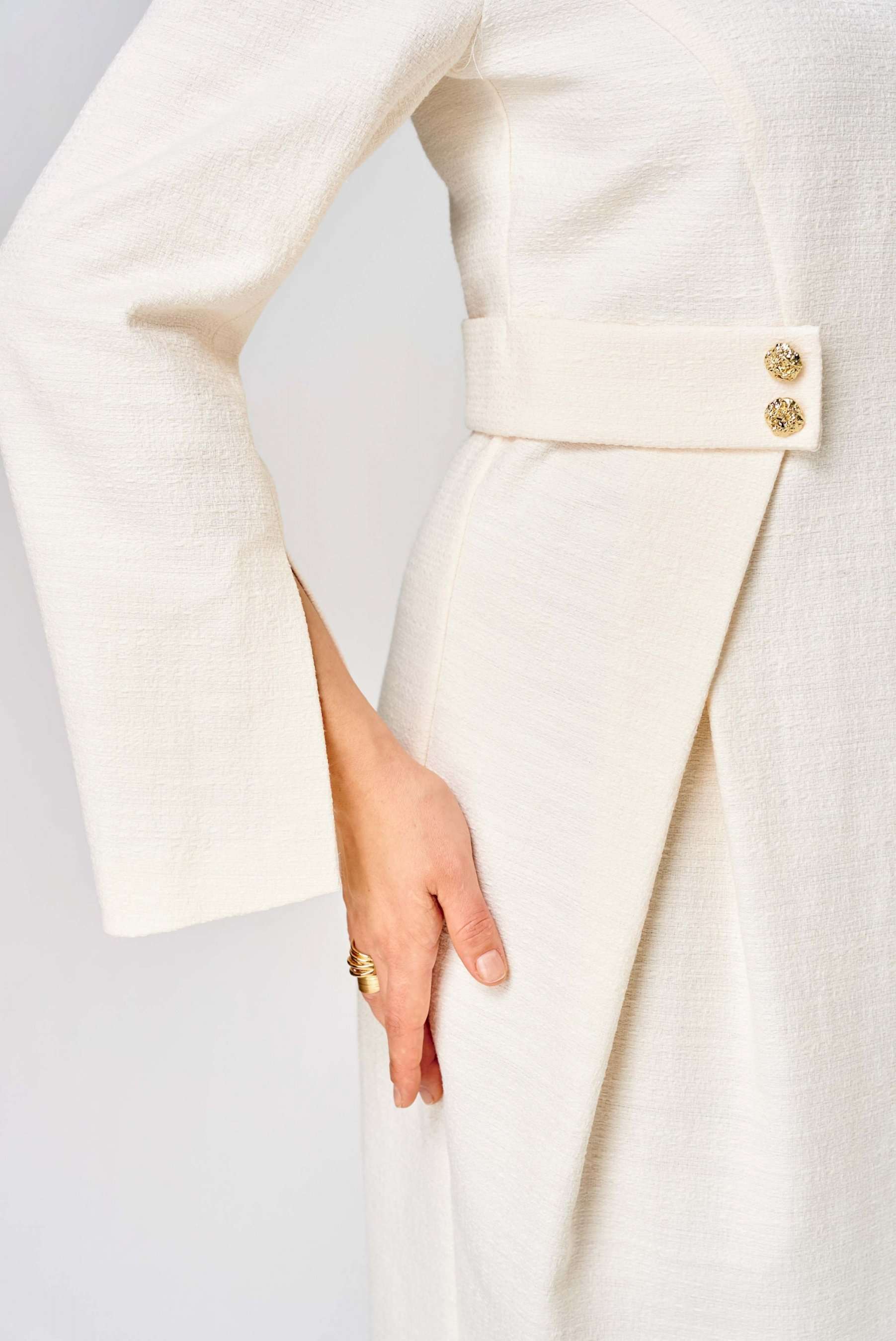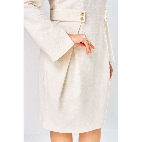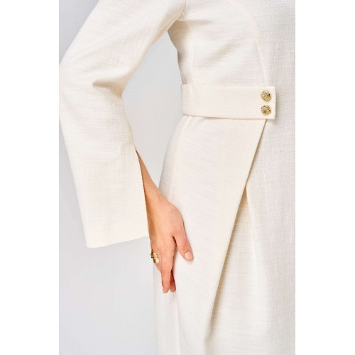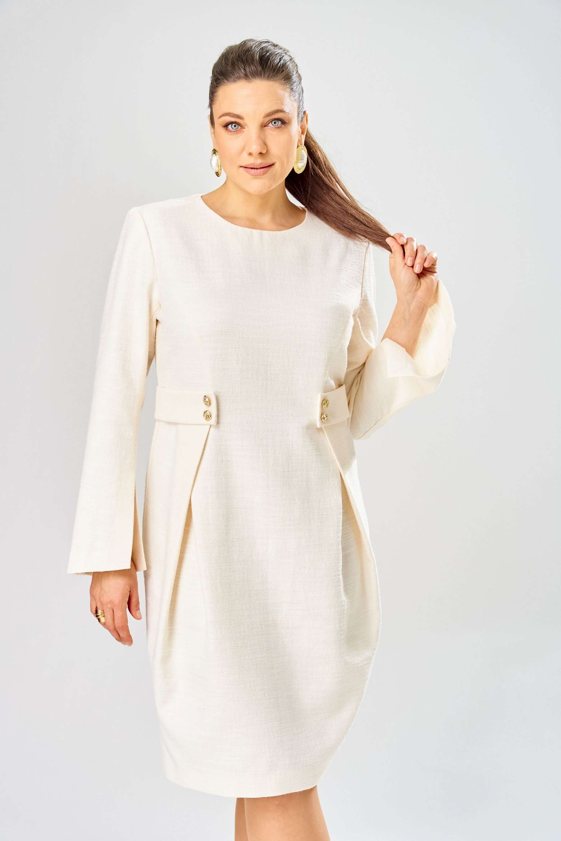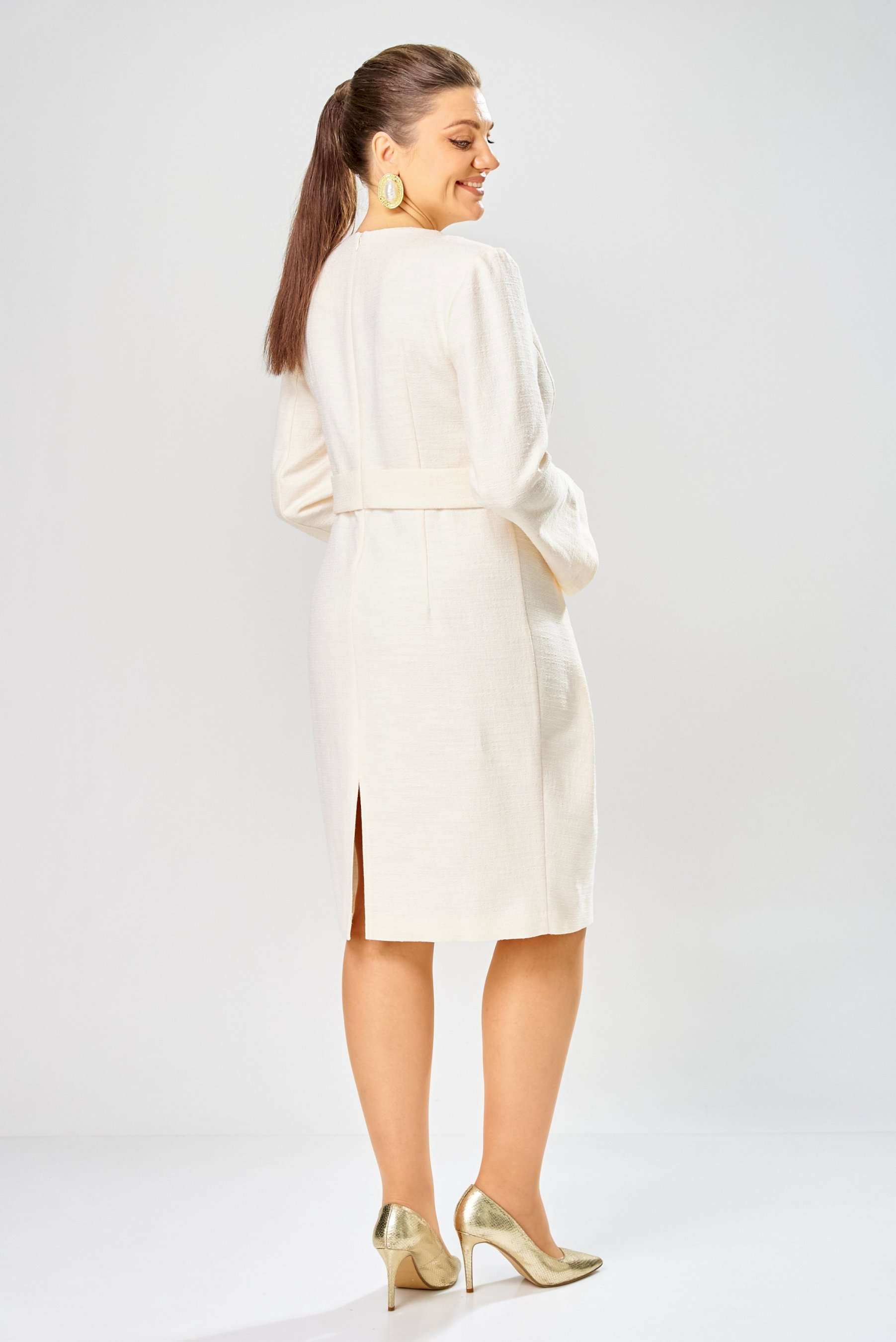 Элегантное женское платье выполнено из жаккардовой ткани с большим содержанием хлопка. Платье полуприлегающего силуэта, по переду в верхней части лифа отрезные бочки. Горловина круглая, по линии талии декоративные элементы с пуговицами. Рукава втачные расширенные к низу, по переднему шву с разрезом. Застежка на тесьму молнию в среднем шве спинки. Платье без подкладки. Длина платья – 100 см Длина рукава – 63 см