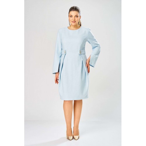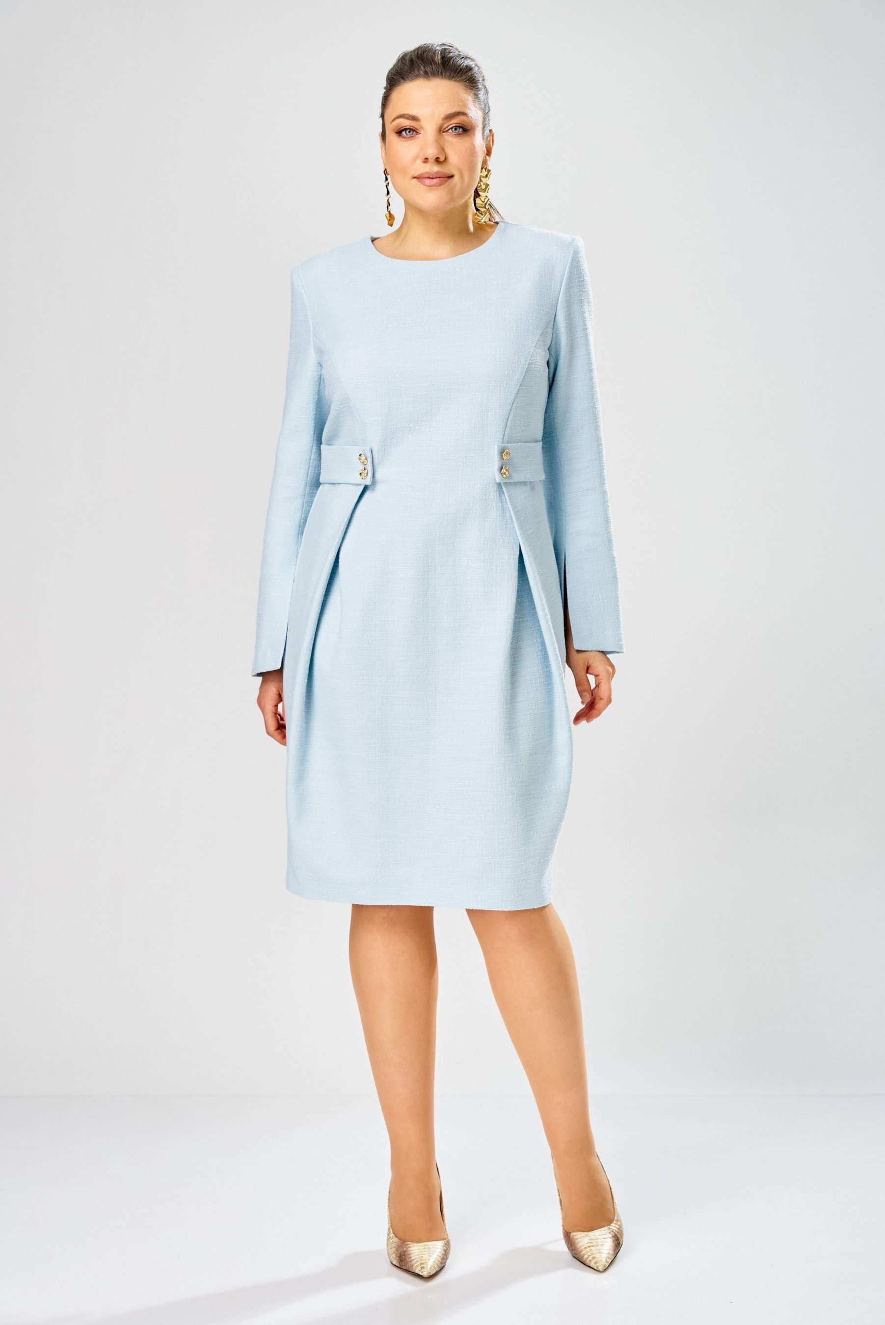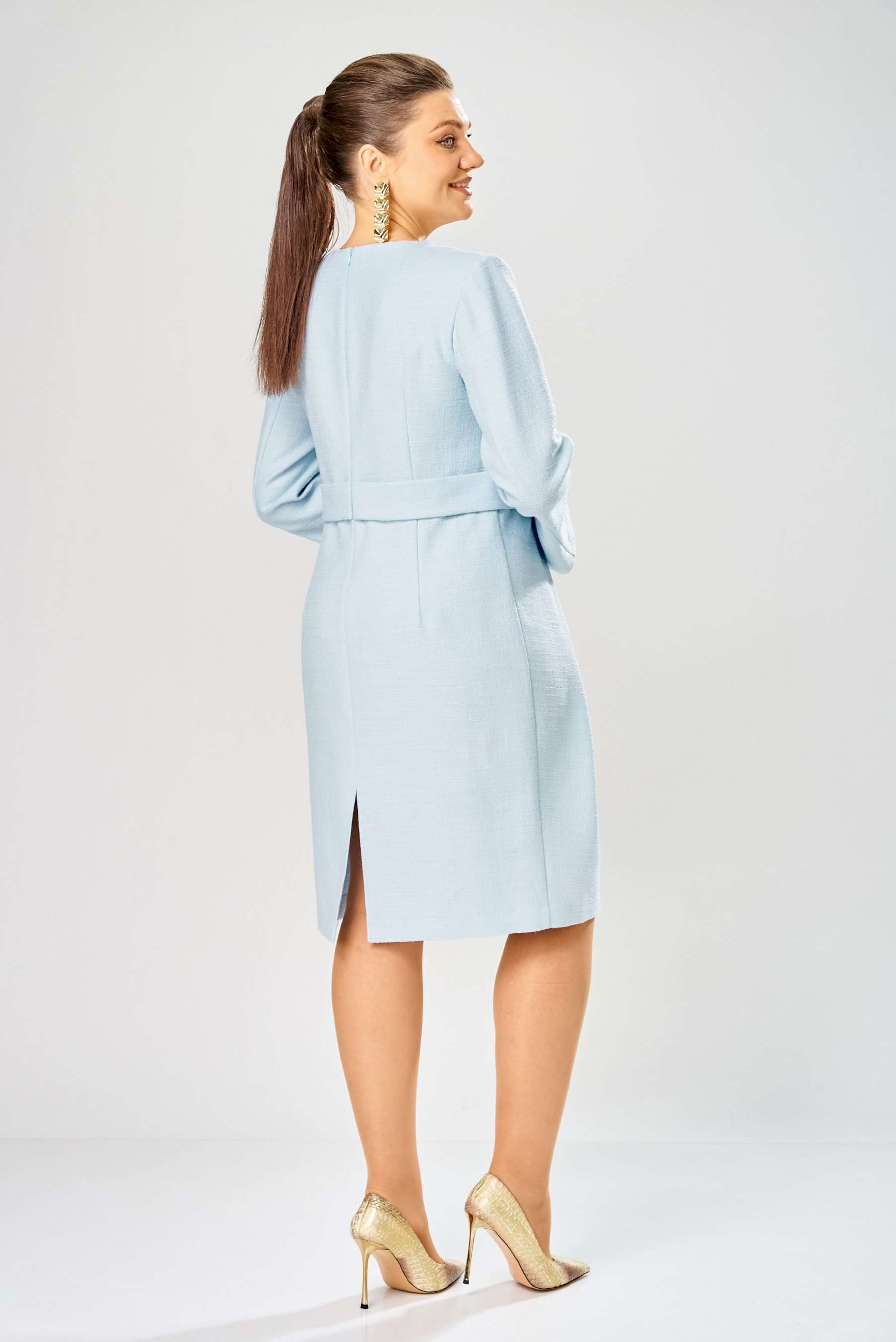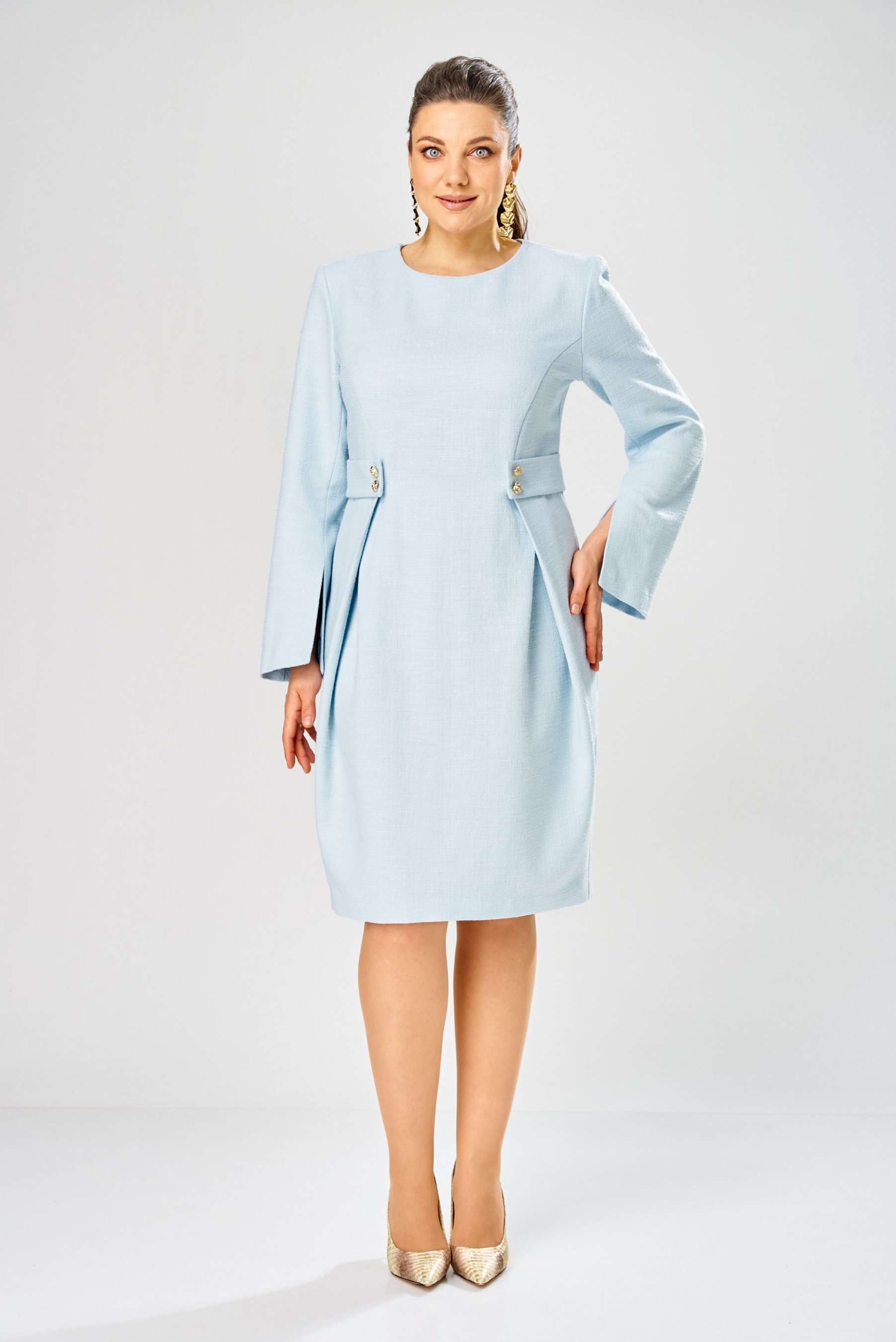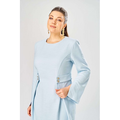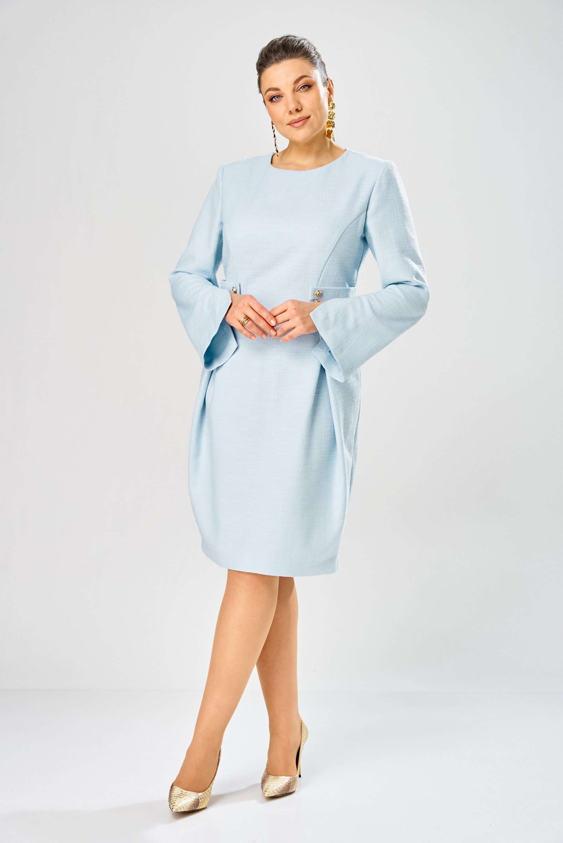 Элегантное женское платье выполнено из жаккардовой ткани с большим содержанием хлопка. Платье полуприлегающего силуэта, по переду в верхней части лифа отрезные бочки. Горловина круглая, по линии талии декоративные элементы с пуговицами. Рукава втачные расширенные к низу, по переднему шву с разрезом. Застежка на тесьму молнию в среднем шве спинки. Платье без подкладки. Длина платья – 100 см Длина рукава – 63 см