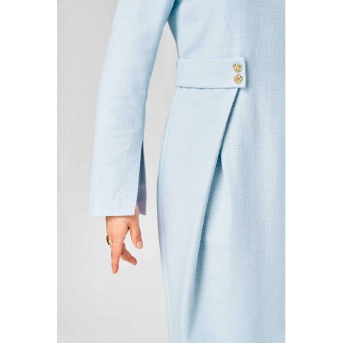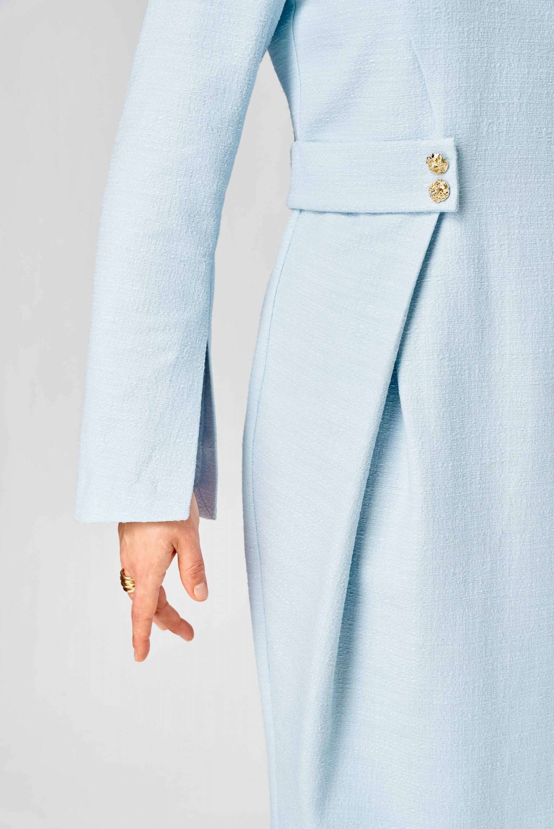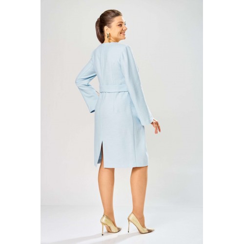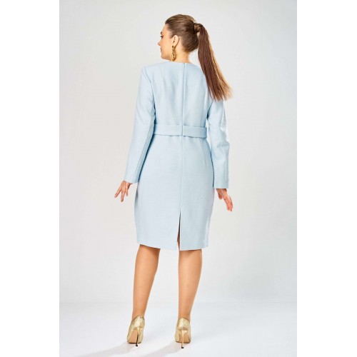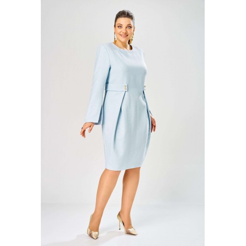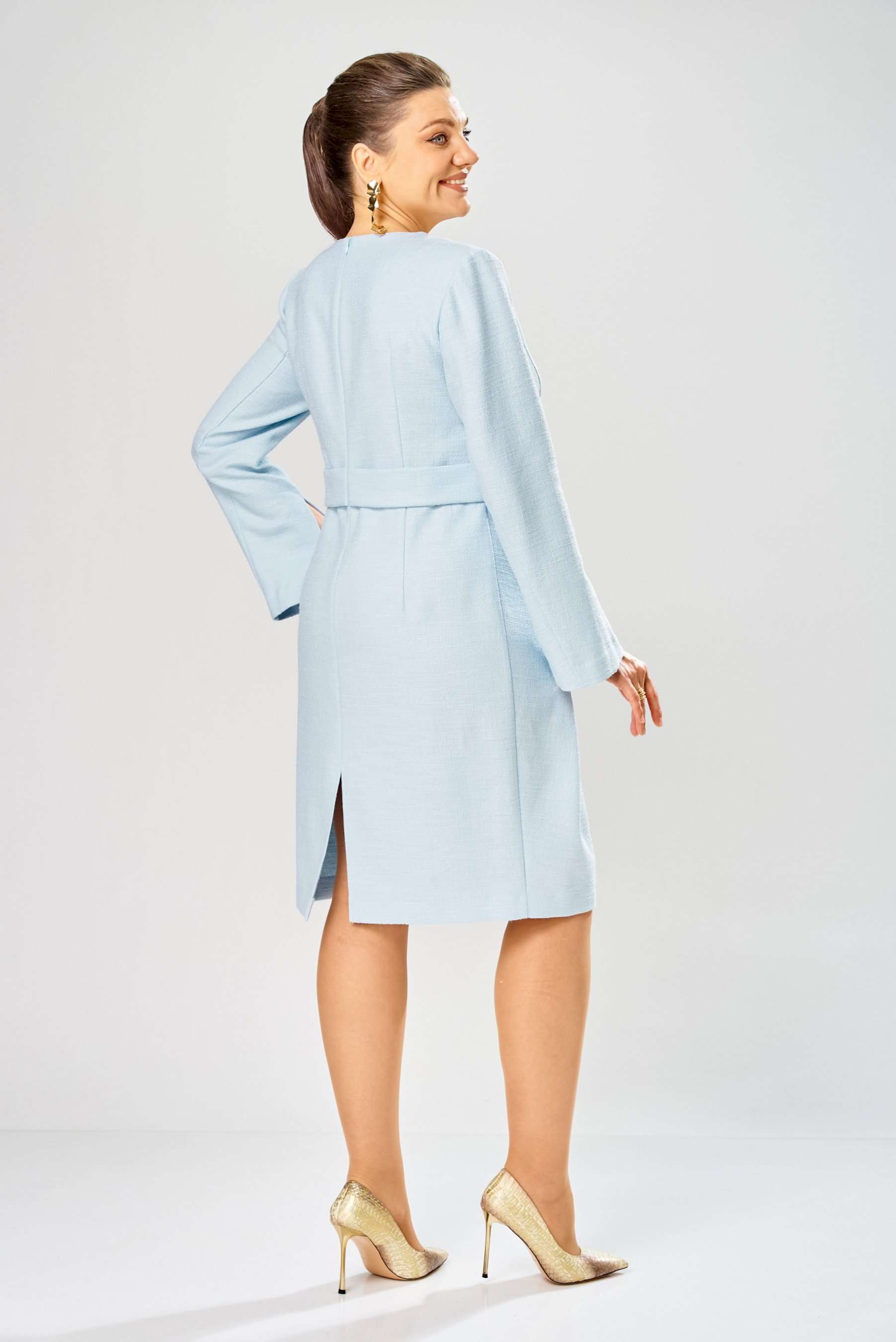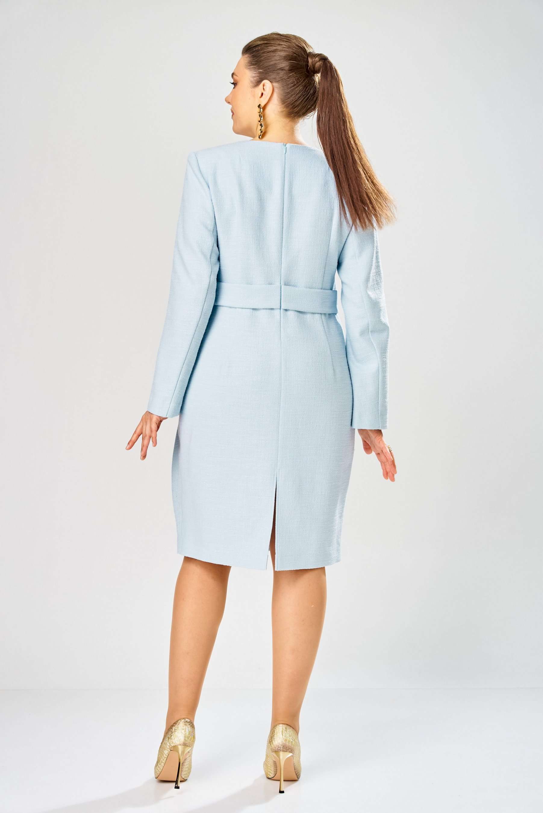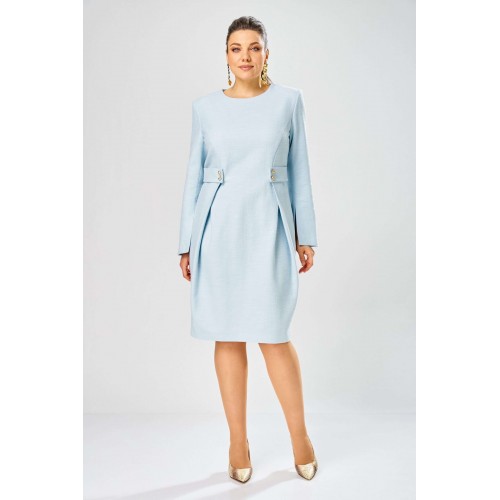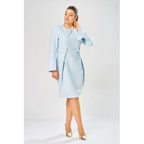 Элегантное женское платье выполнено из жаккардовой ткани с большим содержанием хлопка. Платье полуприлегающего силуэта, по переду в верхней части лифа отрезные бочки. Горловина круглая, по линии талии декоративные элементы с пуговицами. Рукава втачные расширенные к низу, по переднему шву с разрезом. Застежка на тесьму молнию в среднем шве спинки. Платье без подкладки. Длина платья – 100 см Длина рукава – 63 см