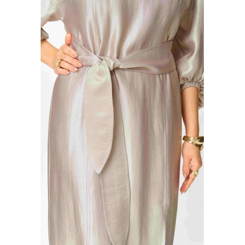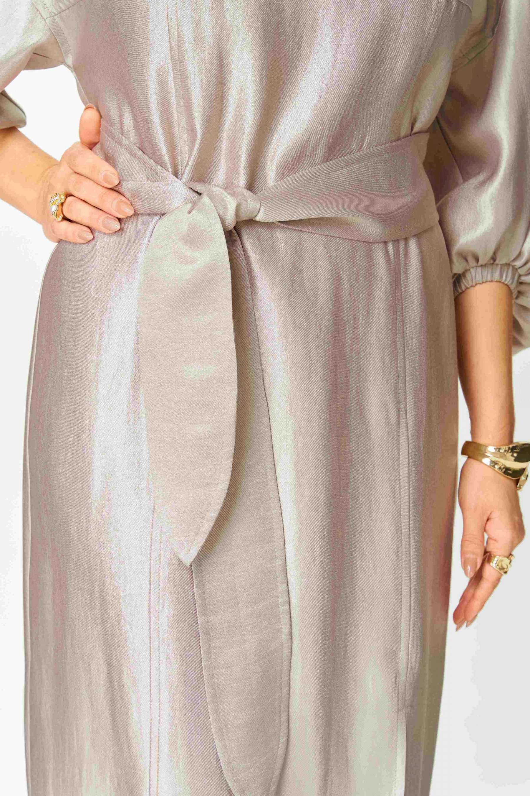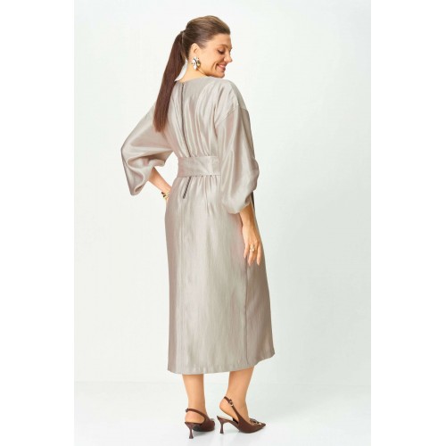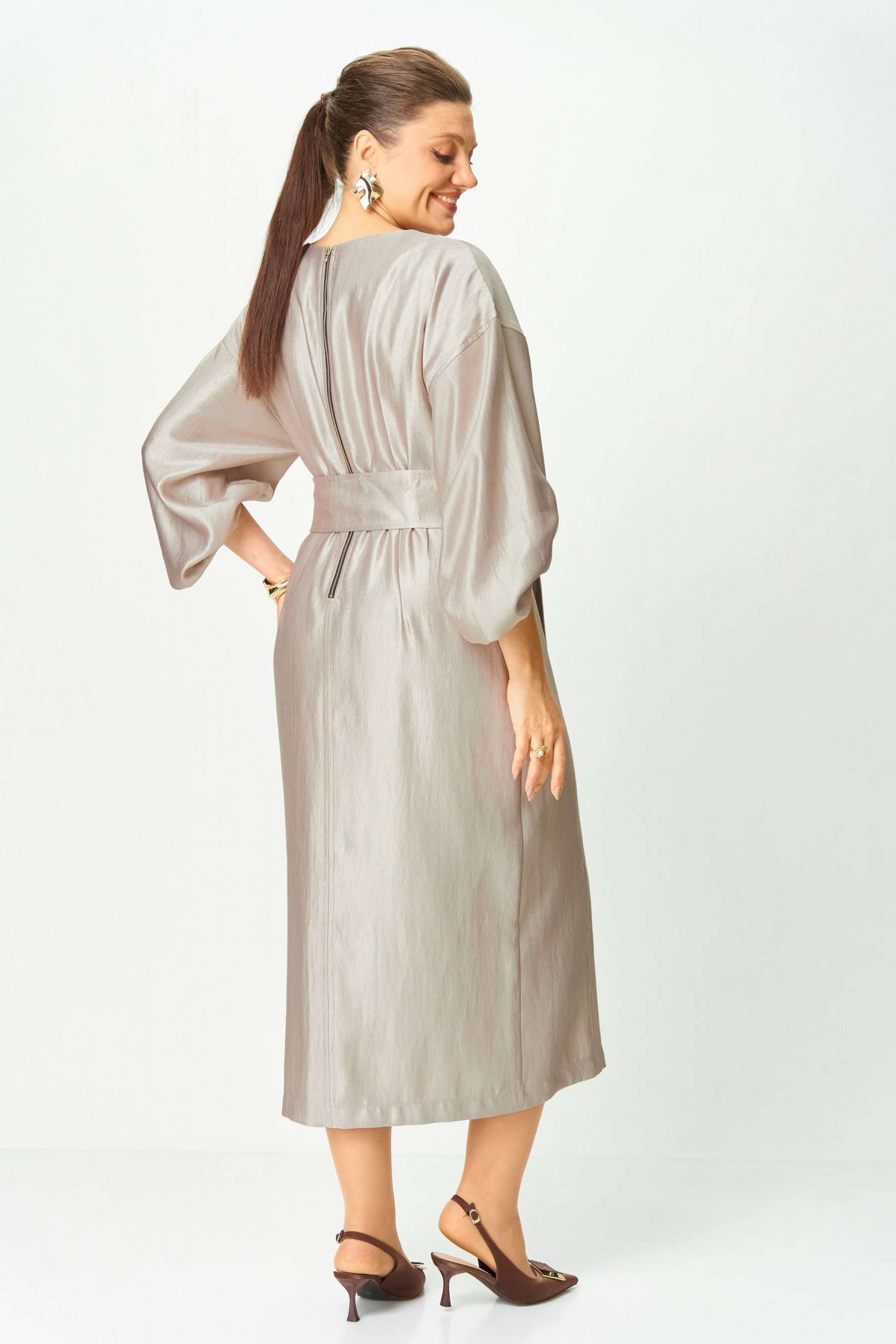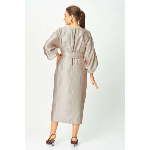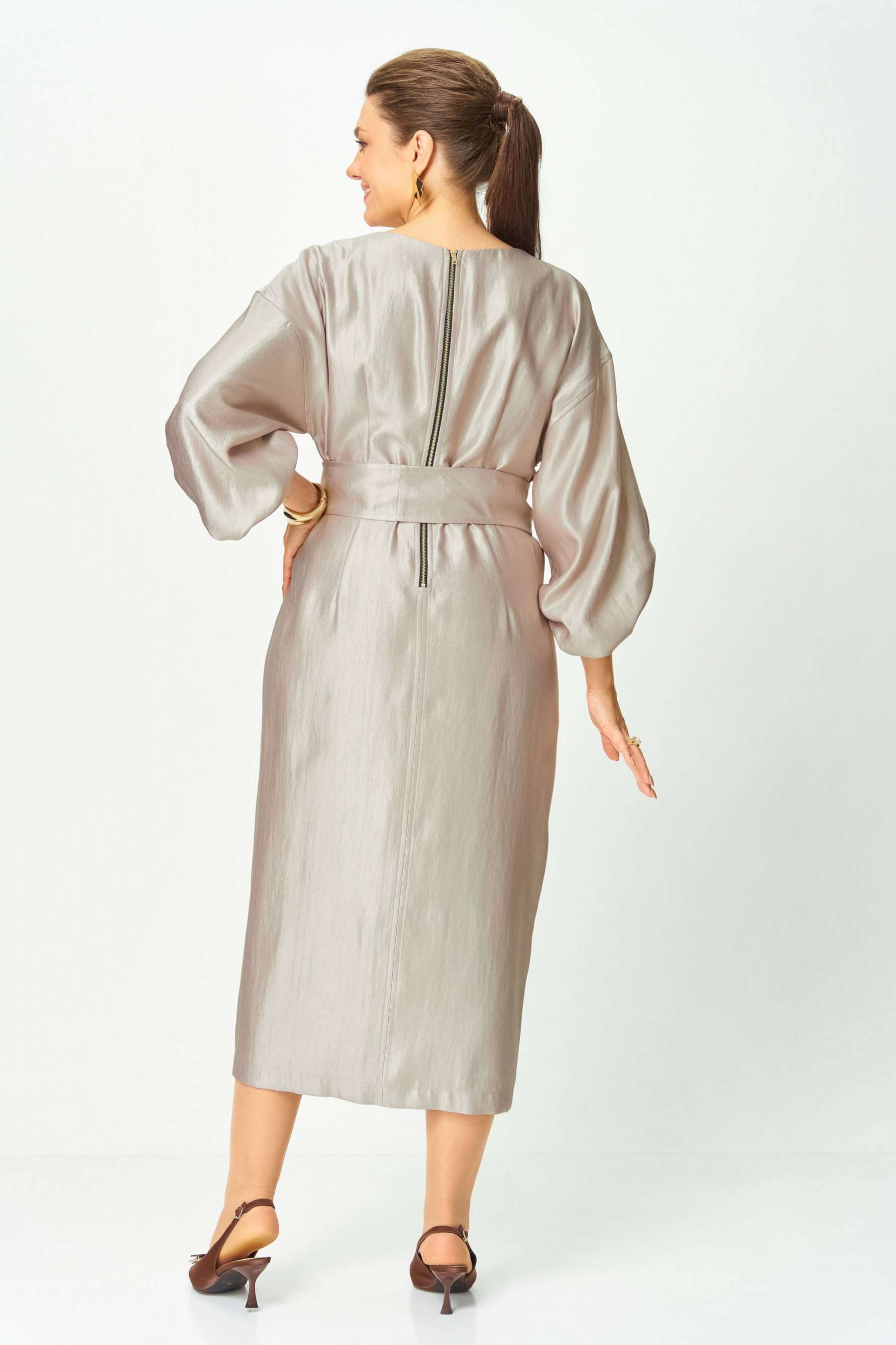 Стильное женское платье, выполнено из плательной ткани с небольшим блеском. Платье прямого силуэта, с отрезными бочками и разрезом по низу платья. Застежка на декоративную молнию в центральном шве спинки. Горловина круглая. Рукава со спущенной проймой. Рукав широкий, с асимметричным низом, собранным на резинку. В комплект входит пояс их основной ткани. Платье без подкладки. Длина платья – 121 см. Длина рукава – 37 см.