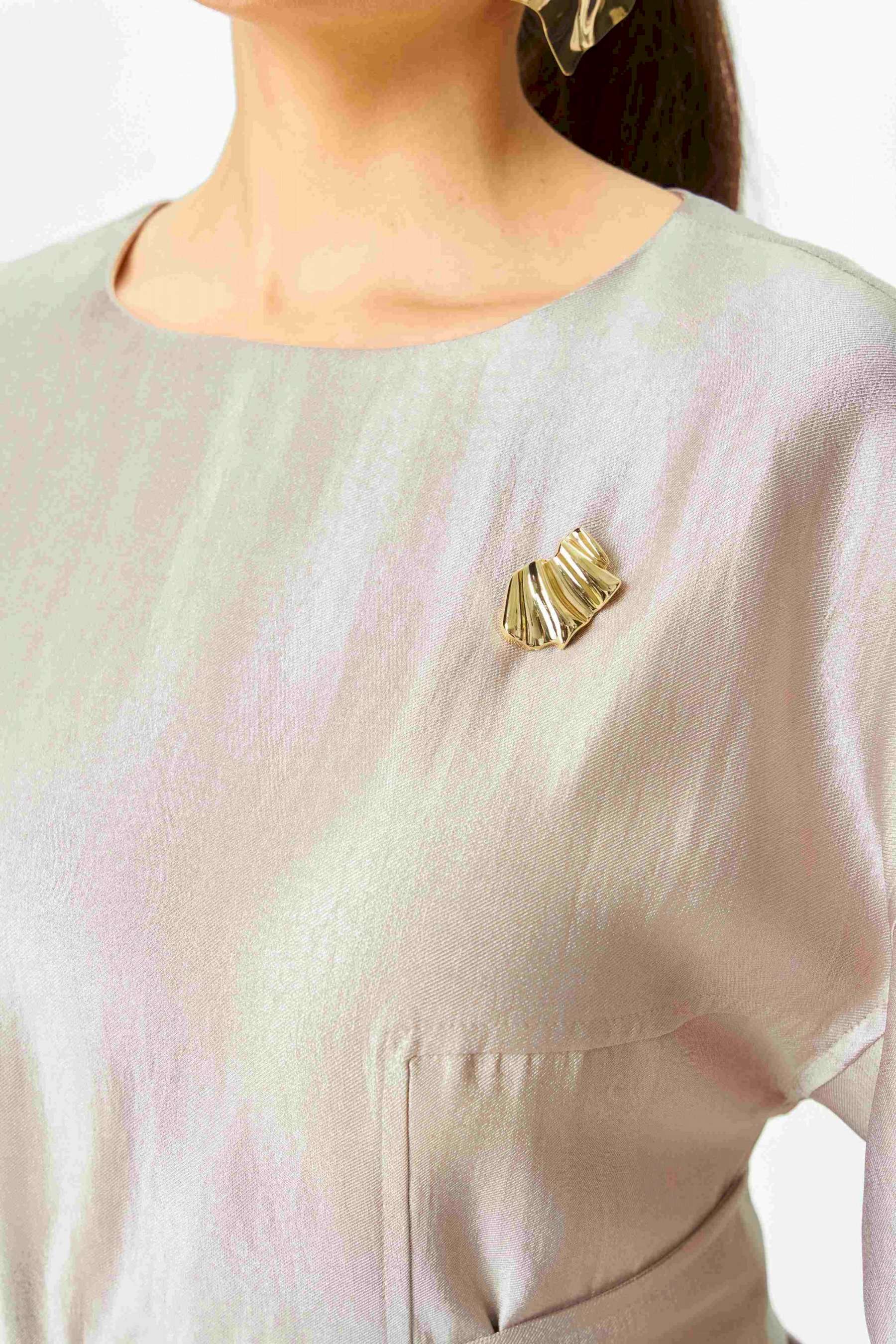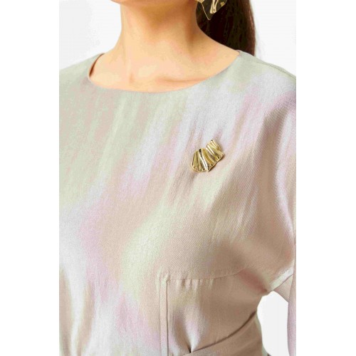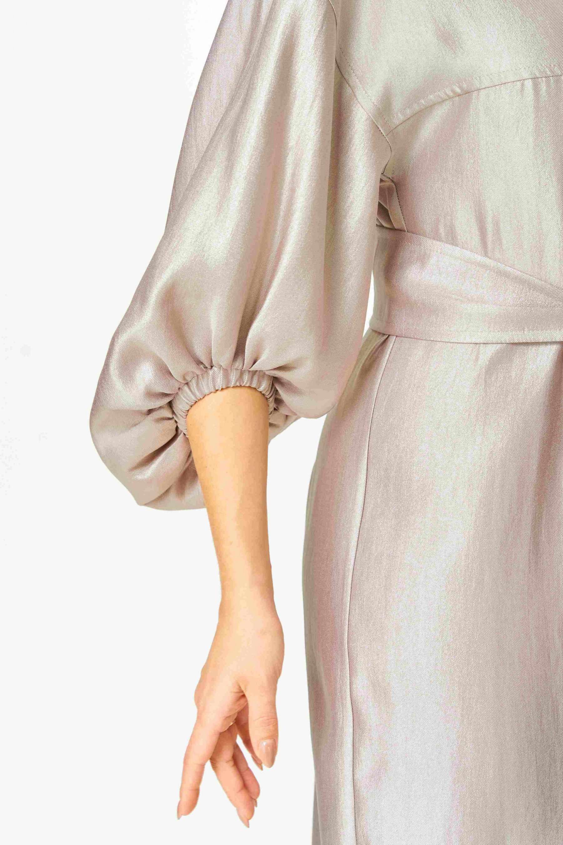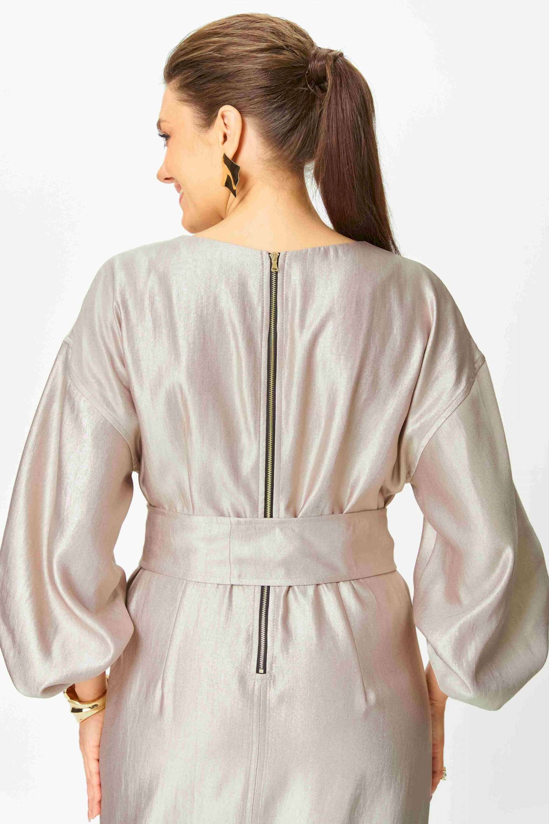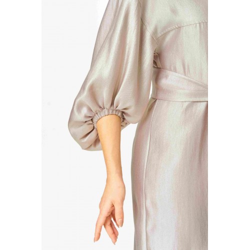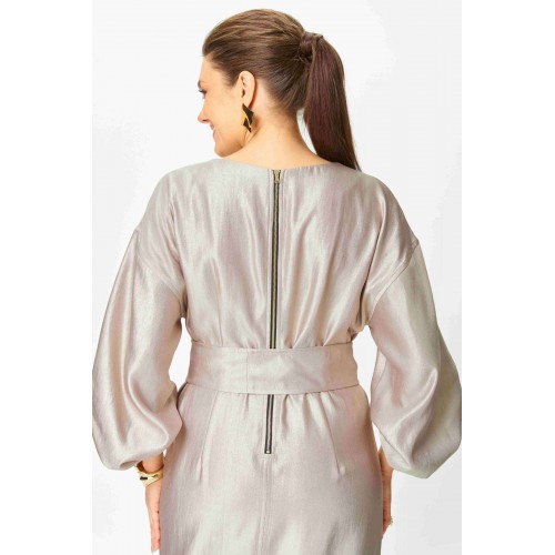 Стильное женское платье, выполнено из плательной ткани с небольшим блеском. Платье прямого силуэта, с отрезными бочками и разрезом по низу платья. Застежка на декоративную молнию в центральном шве спинки. Горловина круглая. Рукава со спущенной проймой. Рукав широкий, с асимметричным низом, собранным на резинку. В комплект входит пояс их основной ткани. Платье без подкладки. Длина платья – 121 см. Длина рукава – 37 см.