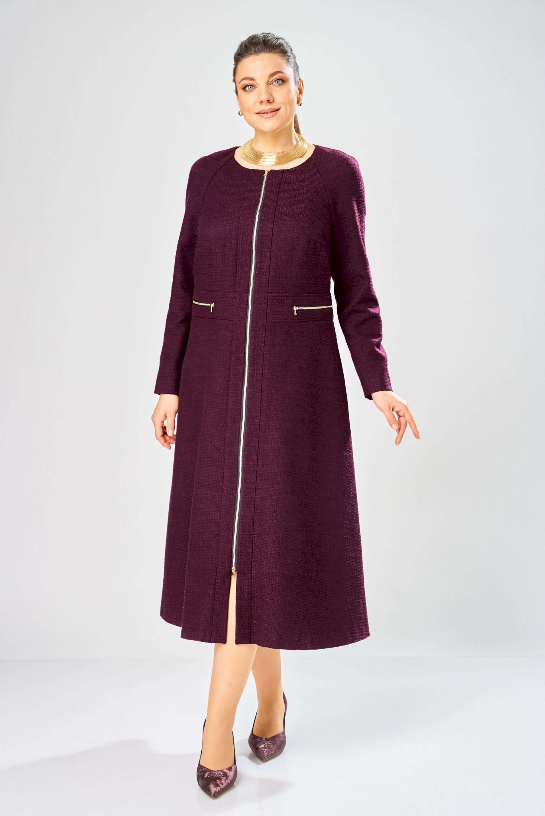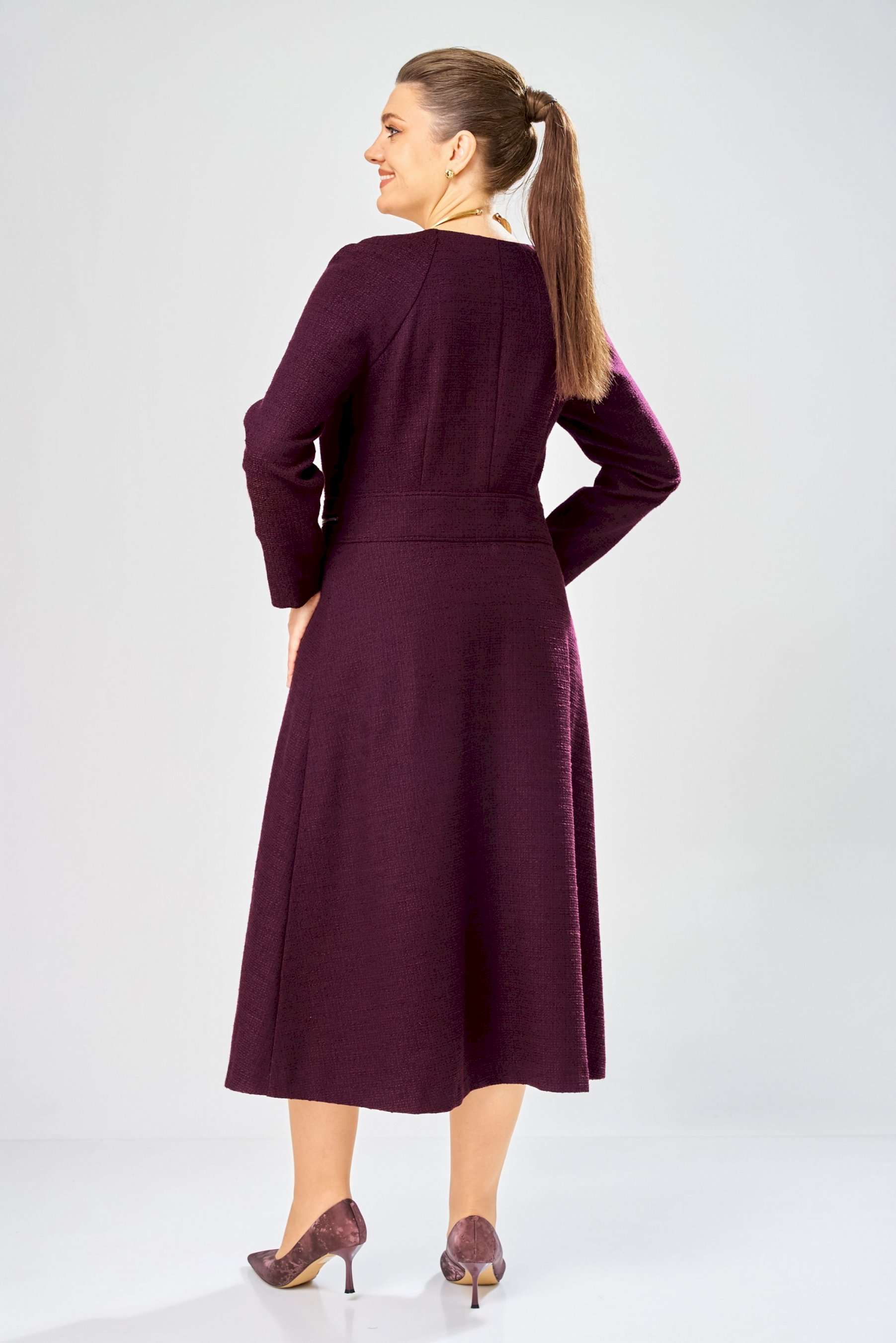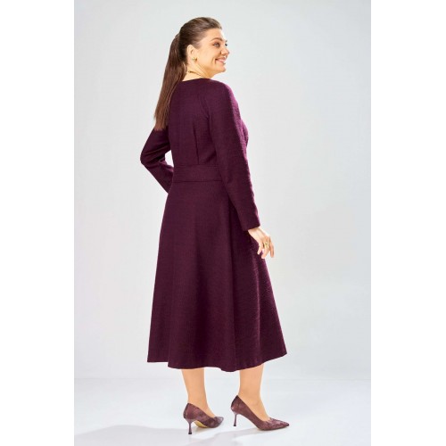 Элегантное женское платье полуприлегающего силуэта с большим содержанием хлопка. Платье в актуальной длине миди, из жаккардовой ткани. Платье с центральной застежкой на тесьму молния, отрезное по линии талии с широким втачным поясом на поясе обработаны декоративные молнии. Горловина круглая. Рукава реглан с плечевой вытачкой. Платье без подкладки. Длина платья – 120 см Длина рукава – 71 см