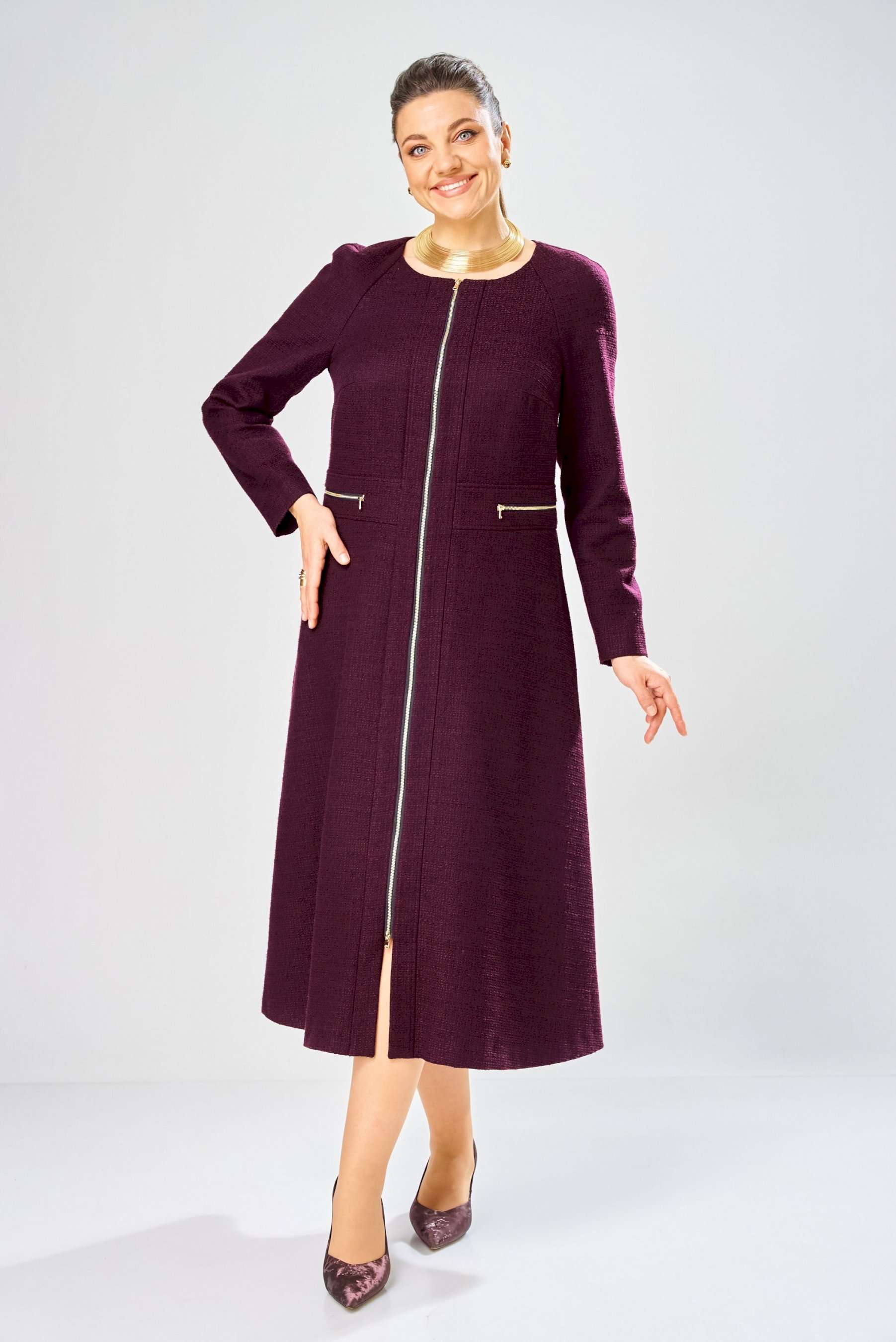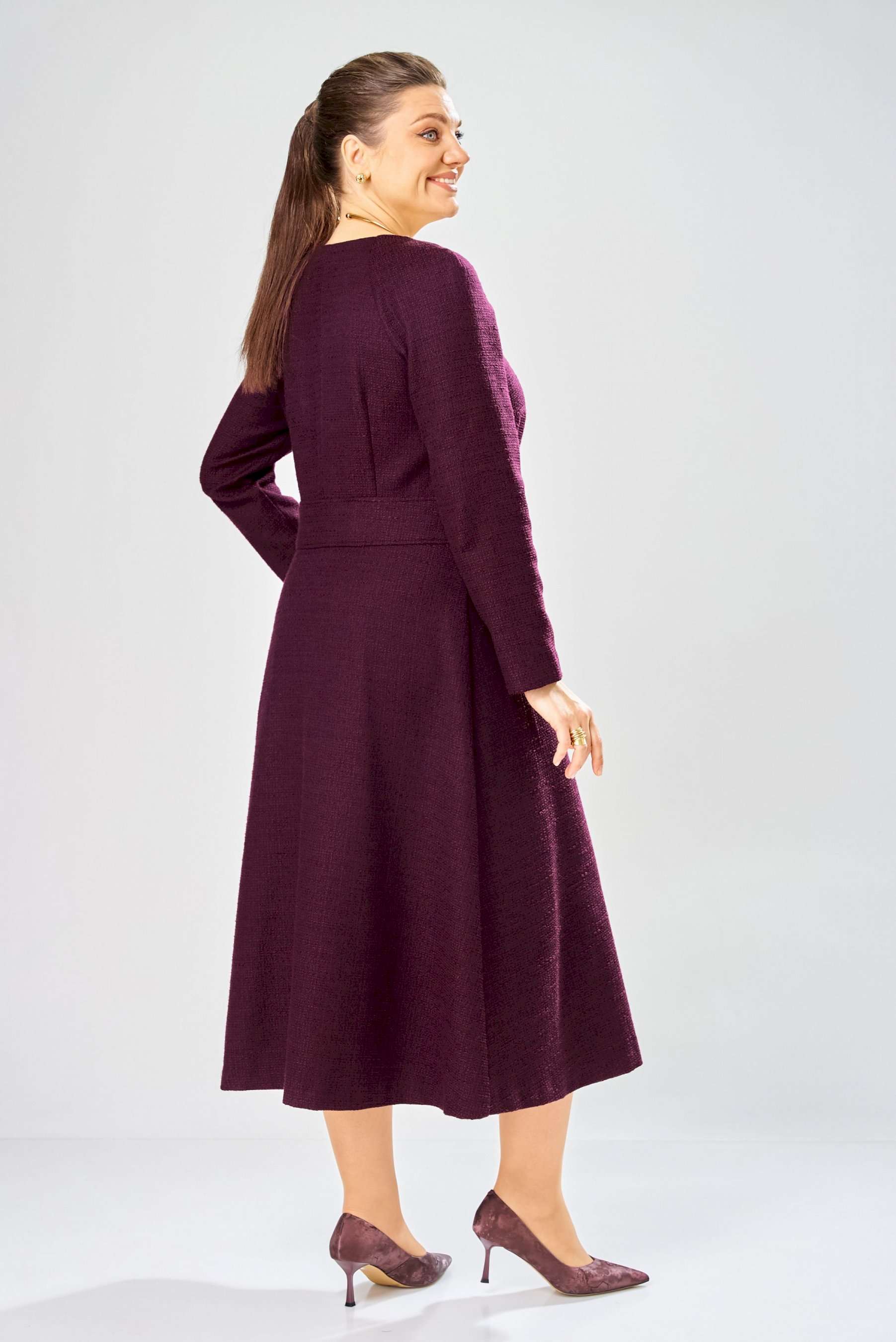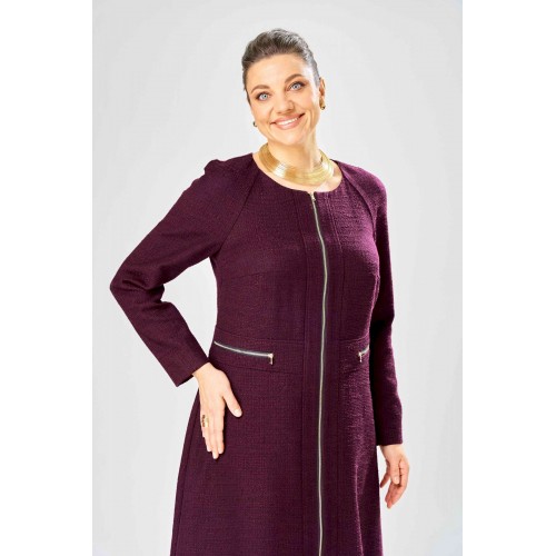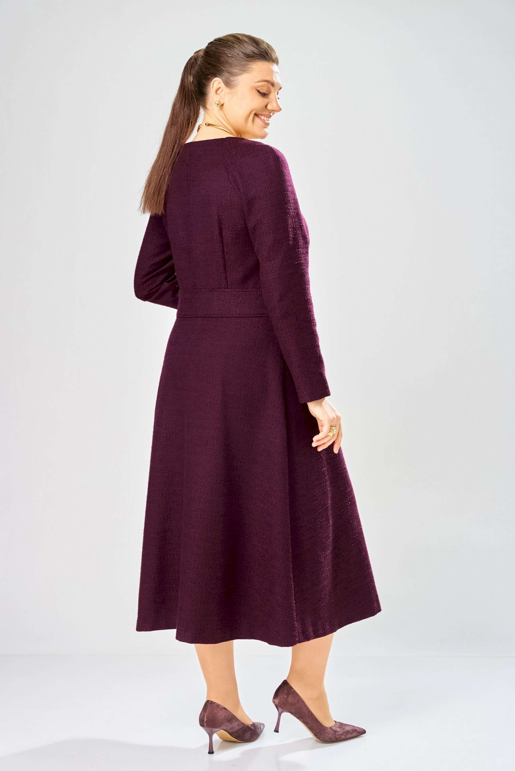 Элегантное женское платье полуприлегающего силуэта с большим содержанием хлопка. Платье в актуальной длине миди, из жаккардовой ткани. Платье с центральной застежкой на тесьму молния, отрезное по линии талии с широким втачным поясом на поясе обработаны декоративные молнии. Горловина круглая. Рукава реглан с плечевой вытачкой. Платье без подкладки. Длина платья – 120 см Длина рукава – 71 см