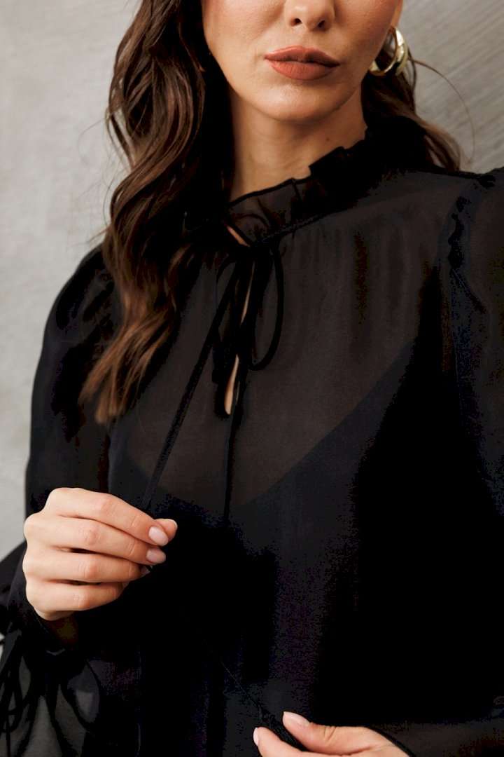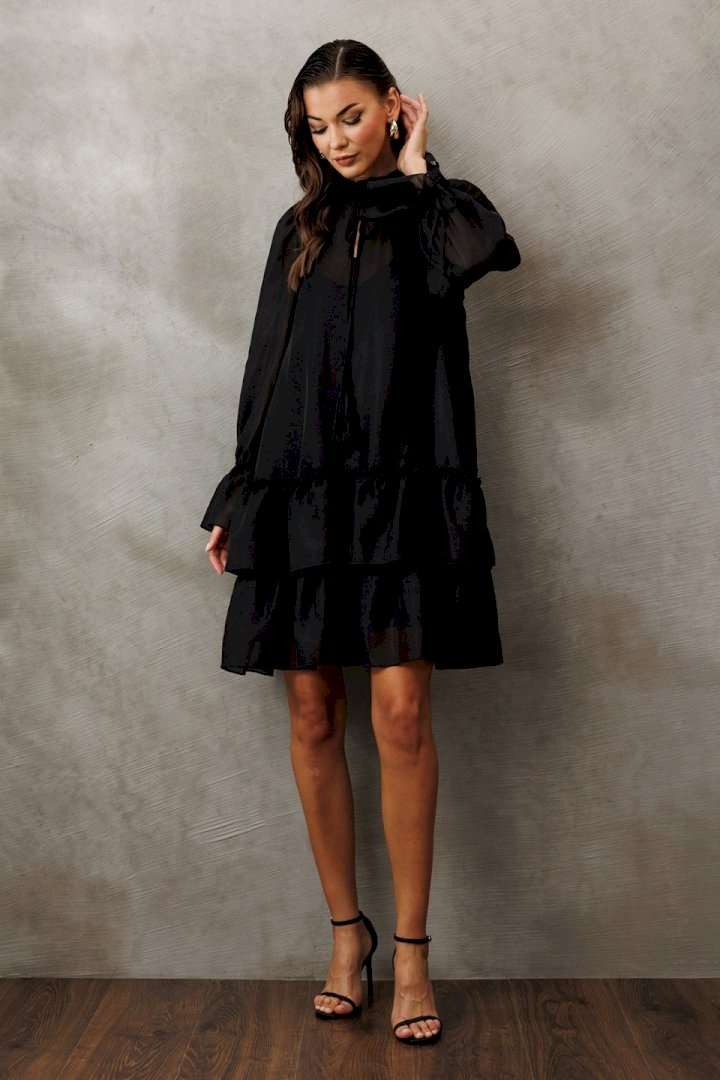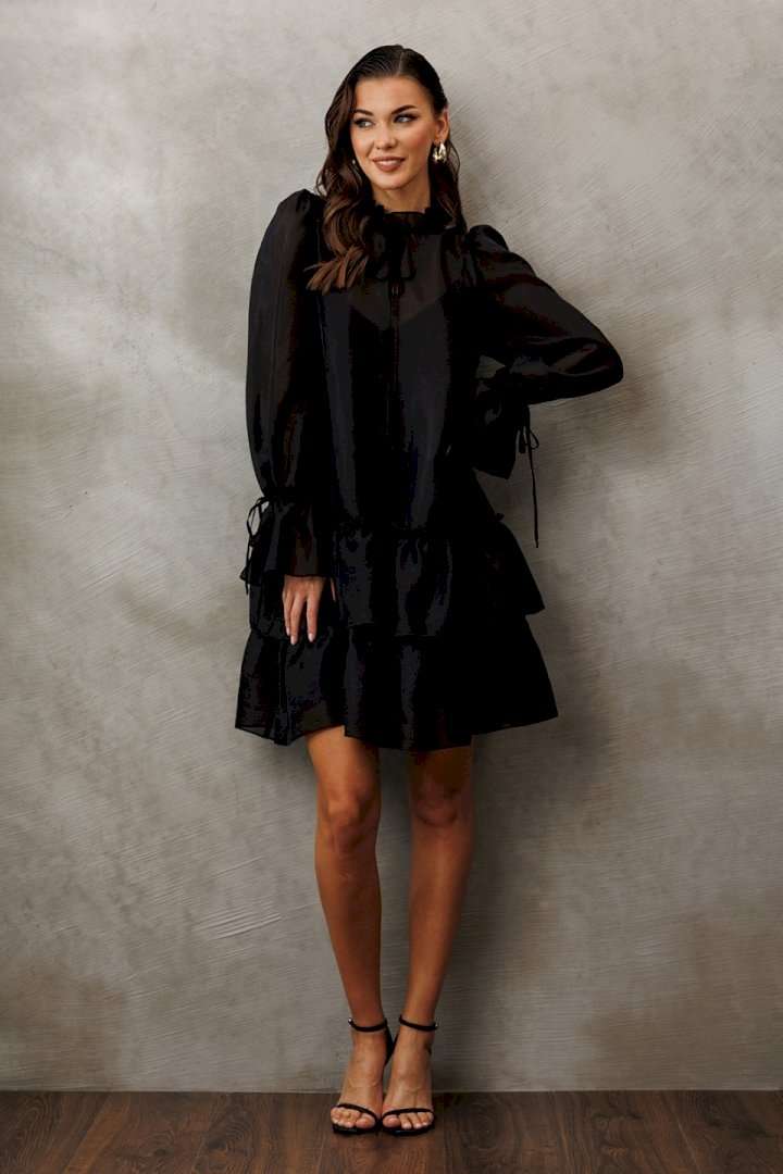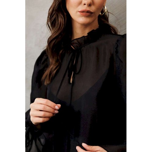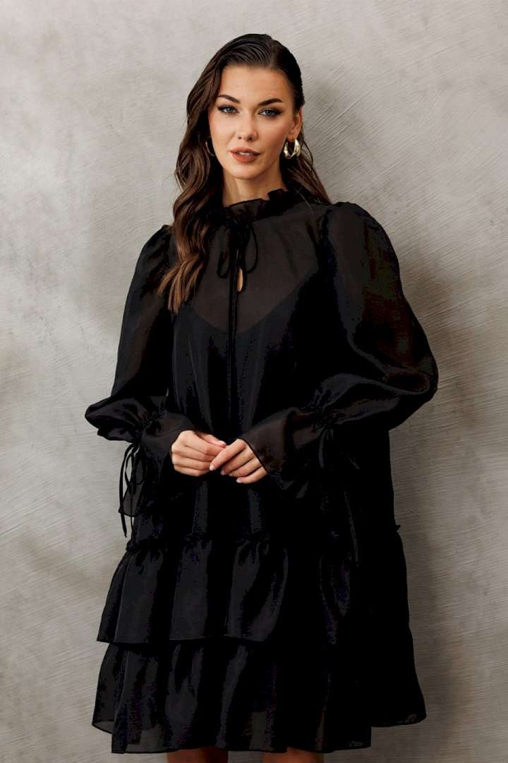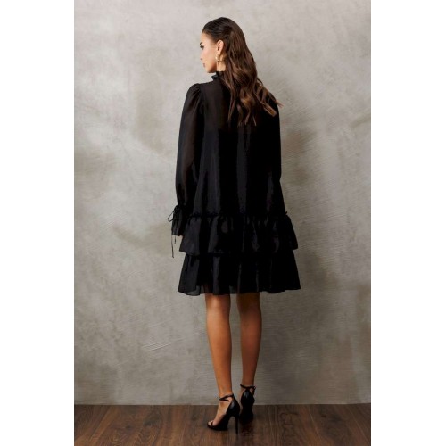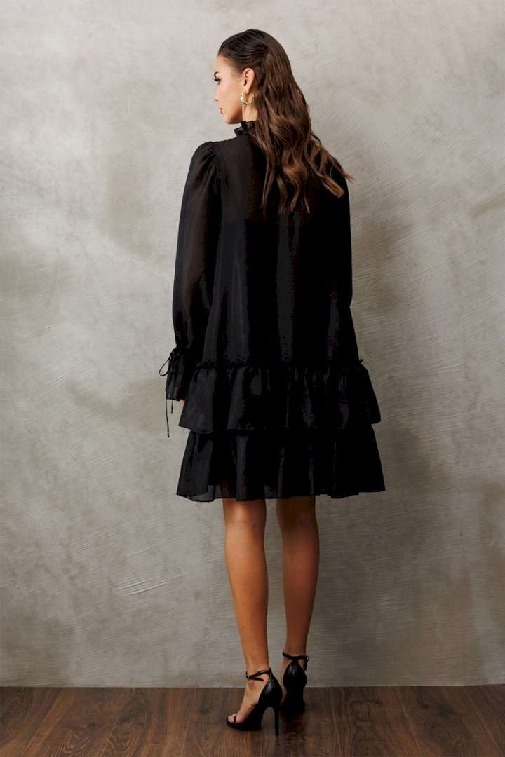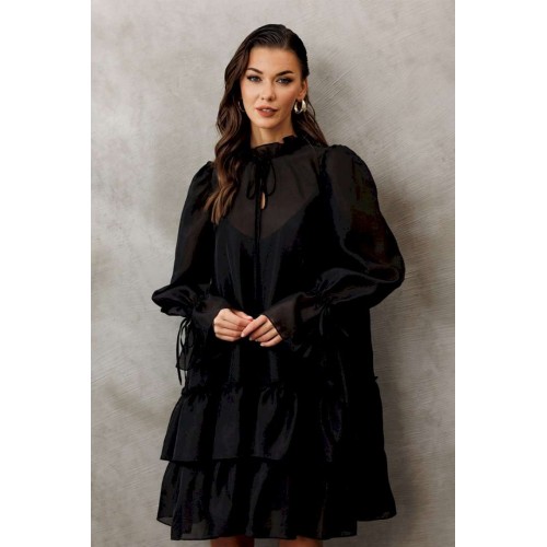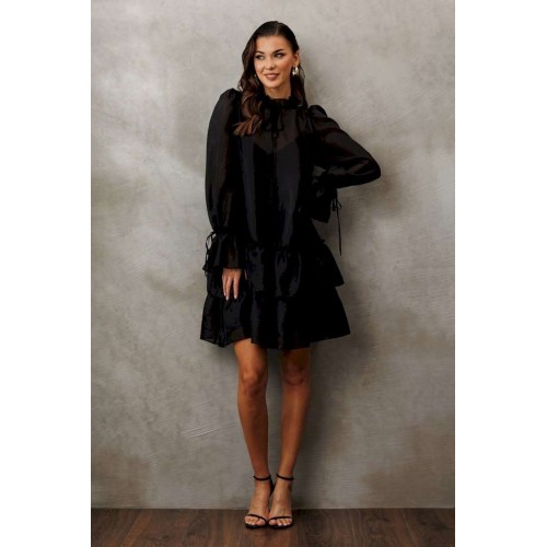 Платье из креп-шифона с напылением А-силуэта, состоящее из 2-х слоев. Верхний слой: Втачной длинный рукав со сборкой по окату и внизу на завязке, полочка и спинка с притачными слегка присборенным воланом с рюшей,в оротник стойка-рюша и вырезом каплей по переду на завязке. Нижний слой: платье на бретелях