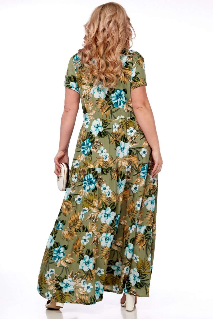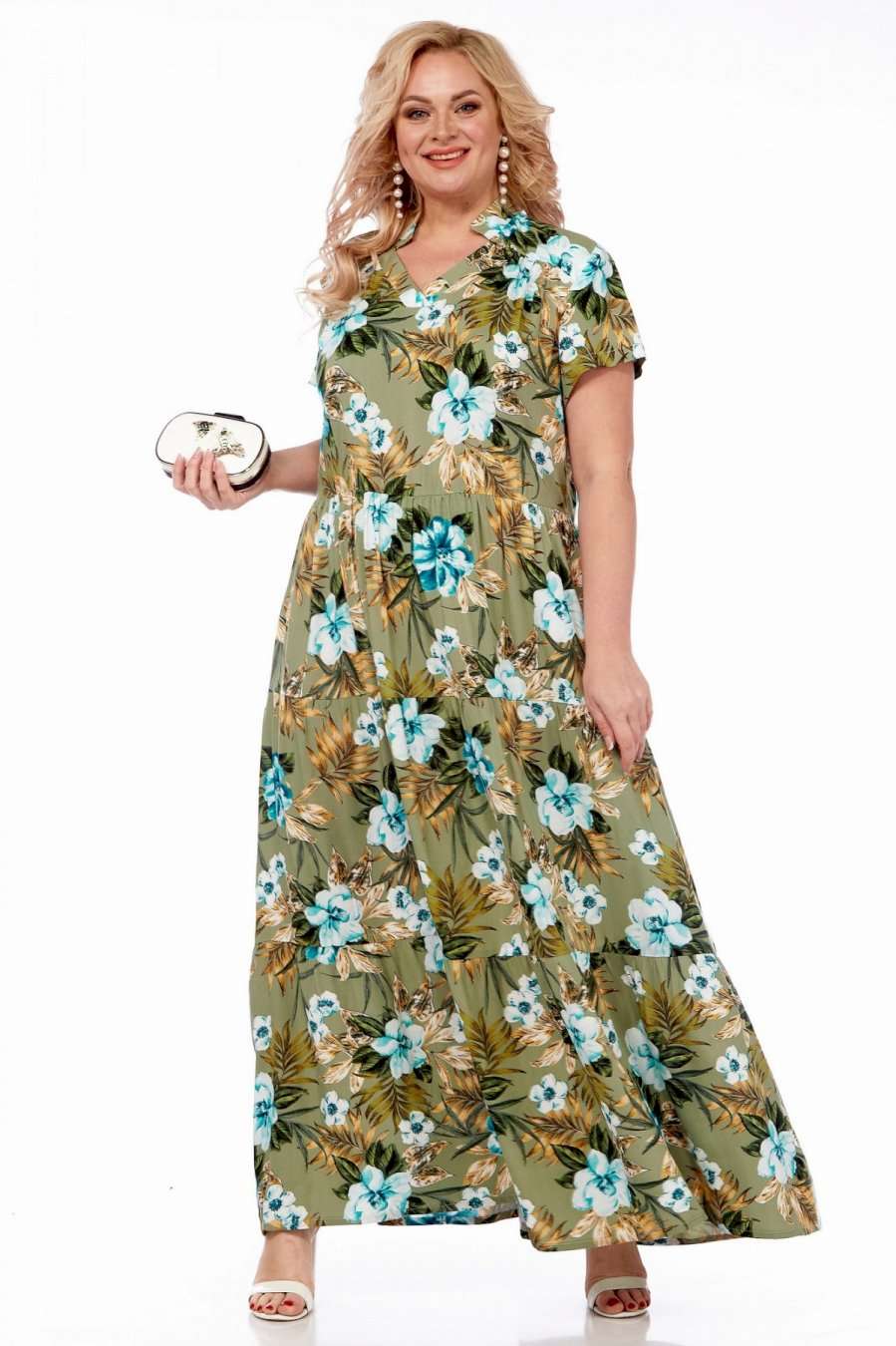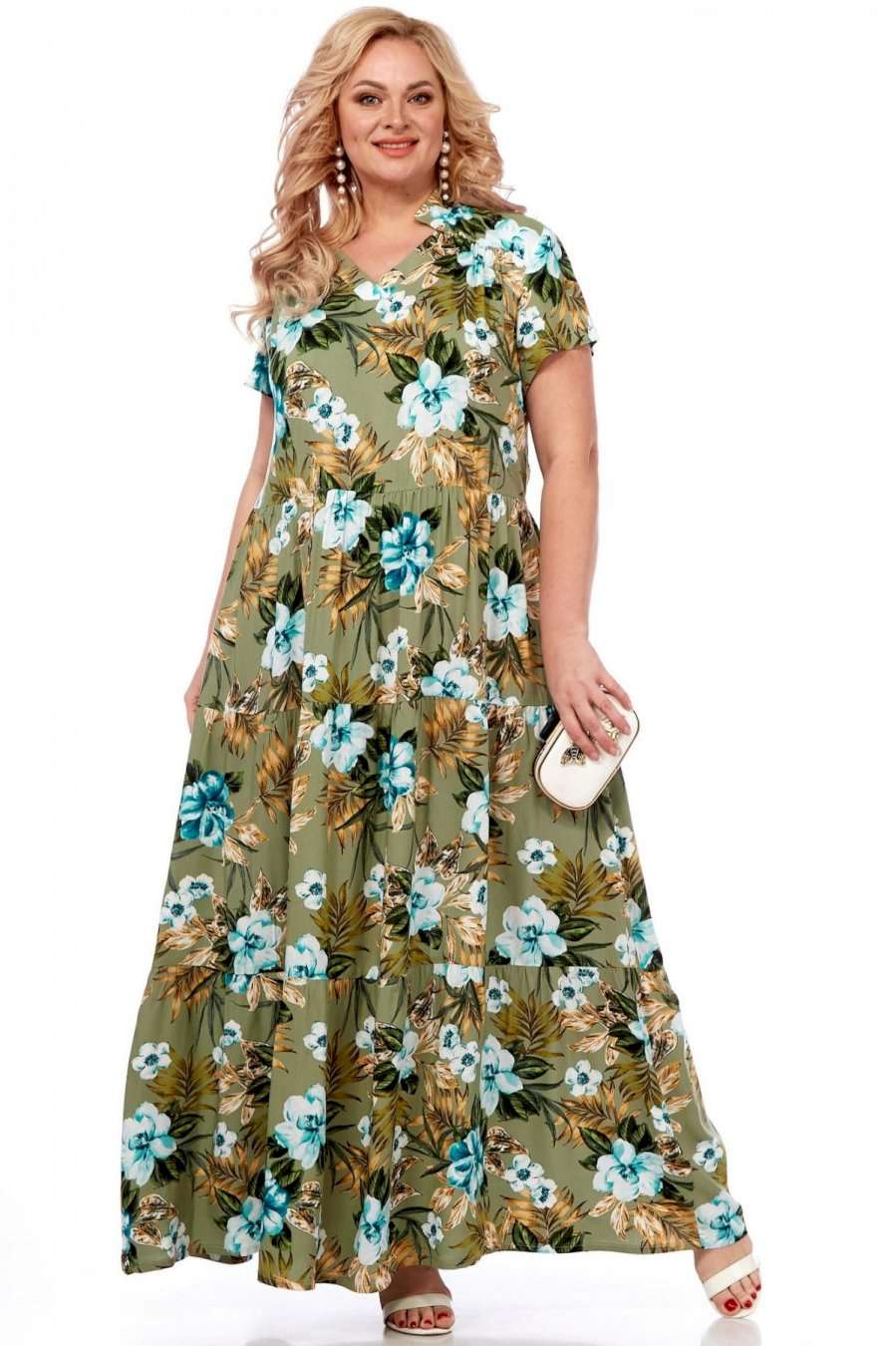 Летнее платье в пол от Celentano из натурального вискозного полотна. Платье отрезное по линии талии с воланами, каждый волан со сборкой. Вырез горловины V-образный, обработан планкой и украшен декоративной стойкой. Спинка цельная, в боковых швах выполнены функциональные карманы. Платье выполнено из мягкой штапельной ткани устойчивой окраски. Рекомендуется вертикальная сушка. Длина изделия по спинке 150 см, длина рукава 20 см.