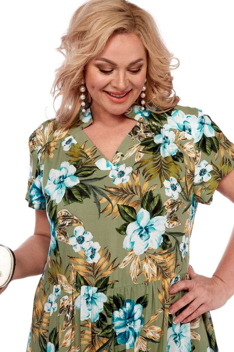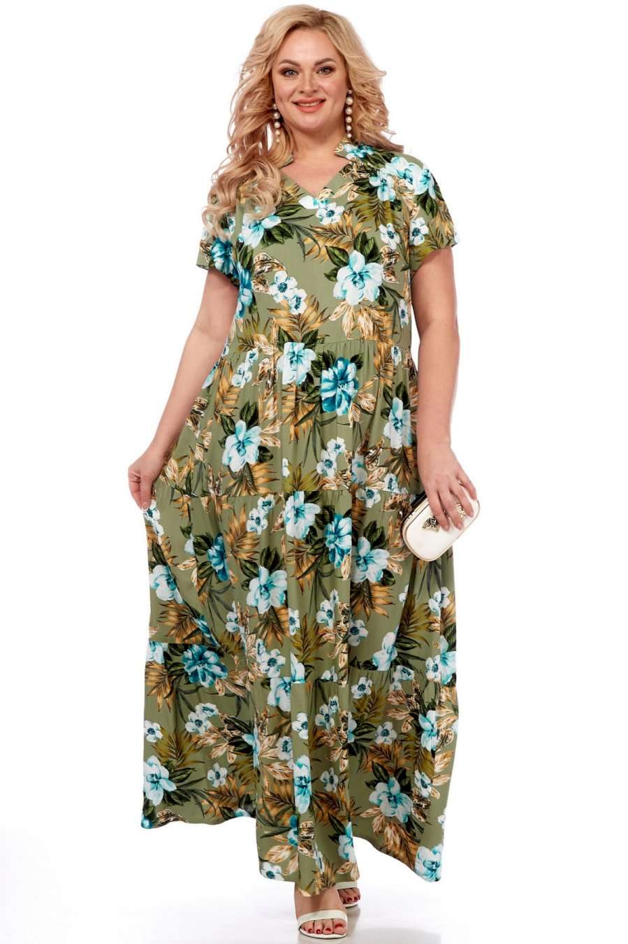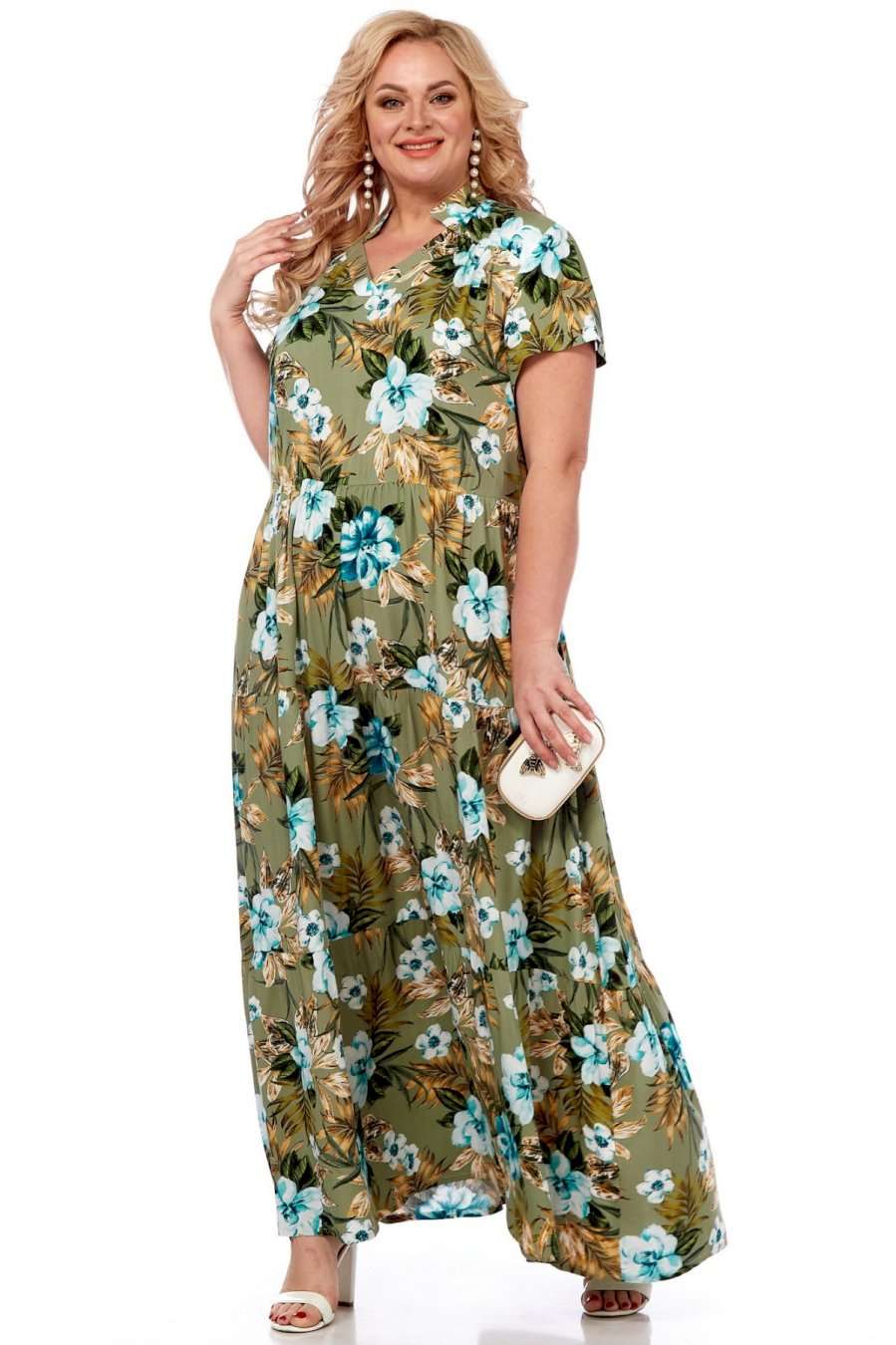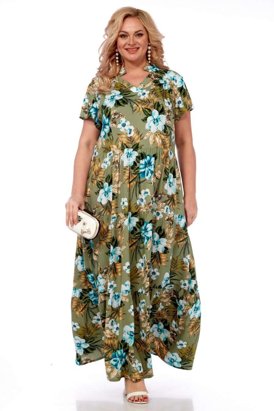 Летнее платье в пол от Celentano из натурального вискозного полотна. Платье отрезное по линии талии с воланами, каждый волан со сборкой. Вырез горловины V-образный, обработан планкой и украшен декоративной стойкой. Спинка цельная, в боковых швах выполнены функциональные карманы. Платье выполнено из мягкой штапельной ткани устойчивой окраски. Рекомендуется вертикальная сушка. Длина изделия по спинке 150 см, длина рукава 20 см.