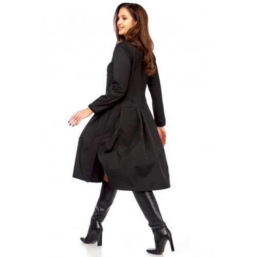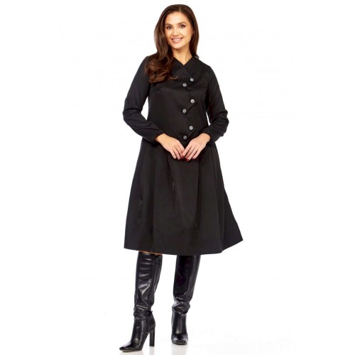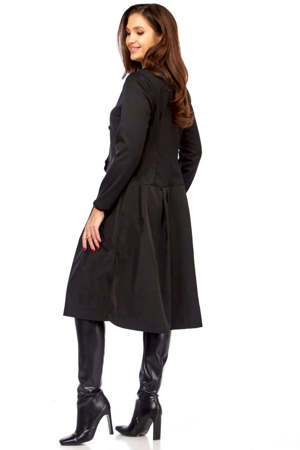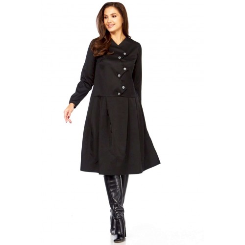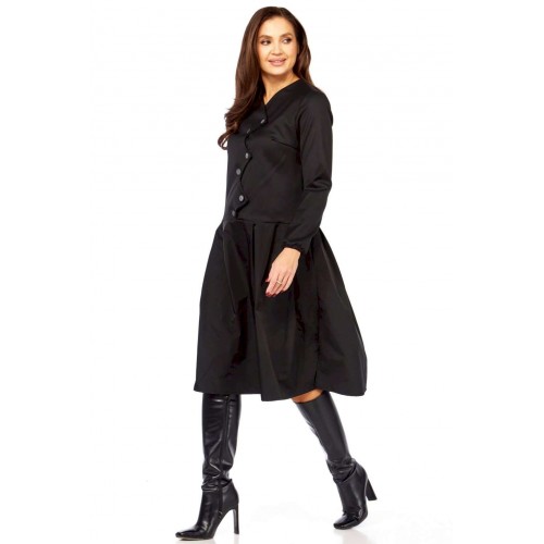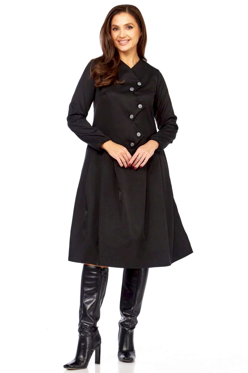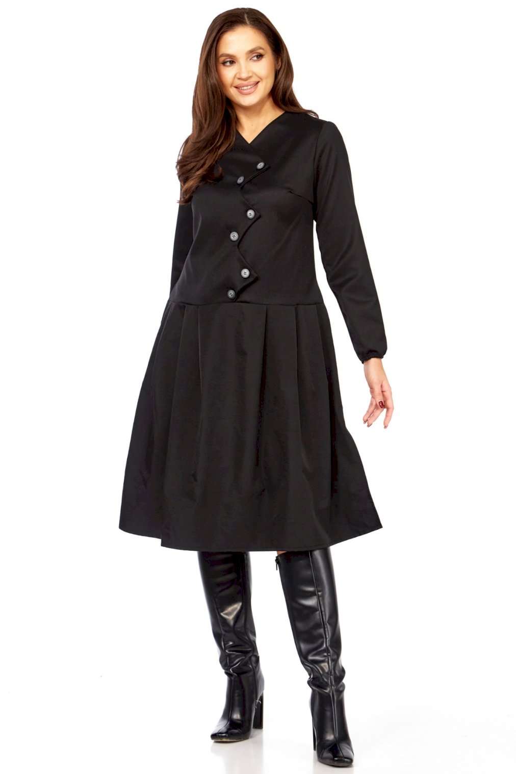 Платье с характером: Ваша новая визитная карточка стиля! Устали от обыденности? Ищете платье, которое расскажет о вас без слов? Встречайте модель, сочетающую в себе изысканность и смелый дизайн! Это миди-платье притягивает взгляд своей нестандартной асимметричной застежкой. Ряд контрастных светлых пуговиц, словно жемчужная дорожка, подчеркивает изящный крой и придает образу особую динамику и утонченность. Она не только придает платью неповторимый шарм, но и визуально вытягивает силуэт, делая его еще более стройным и грациозным. Идеальный крой – приталенный лиф, подчеркивающий талию, и расклешенная юбка со складками, создающая воздушный и женственный силуэт. Длинные рукава добавляют завершенности и элегантности. Это платье в глубоком черном цвете — настоящая находка для тех, кто ценит универсальность без компромиссов в стиле. Оно одинаково великолепно смотрится с лодочками для делового мероприятия, с ботильонами для похода в театр или с высокими сапогами для осенней прогулки. Почувствуйте себя неотразимой! Комфортное, стильное и абсолютно уникальное – оно создано, чтобы вы чувствовали себя на высоте. Откройте для себя совершенство в деталях! Длина платья 110см, длина рукава 62см • Горловина: V-образная, формируемая за счет асимметричной планки, имитирующей запах или глубокий нахлест. • Застежка: Центральная, асимметричная, выполнена на крупных круглых пуговицах. Пуговицы расположены по диагонали, от плеча к боковой части талии. • Рукава: Втачные, длинные, прямые, одношовные. Манжеты простые, без дополнительного декора, на резинке. • Лиф: Для обеспечения прилегания и формы на полочке (передней части лифа) расположены вытачки. • Юбка: От талии, А-образного силуэта, расклешенная к низу. • Детали: От линии талии заложены глубокие складки, обеспечивающие объем и плавное расширение юбки. • Спинка: • Верхняя часть: Отрезная по линии талии, имеет вертикальные вытачки для придания формы.