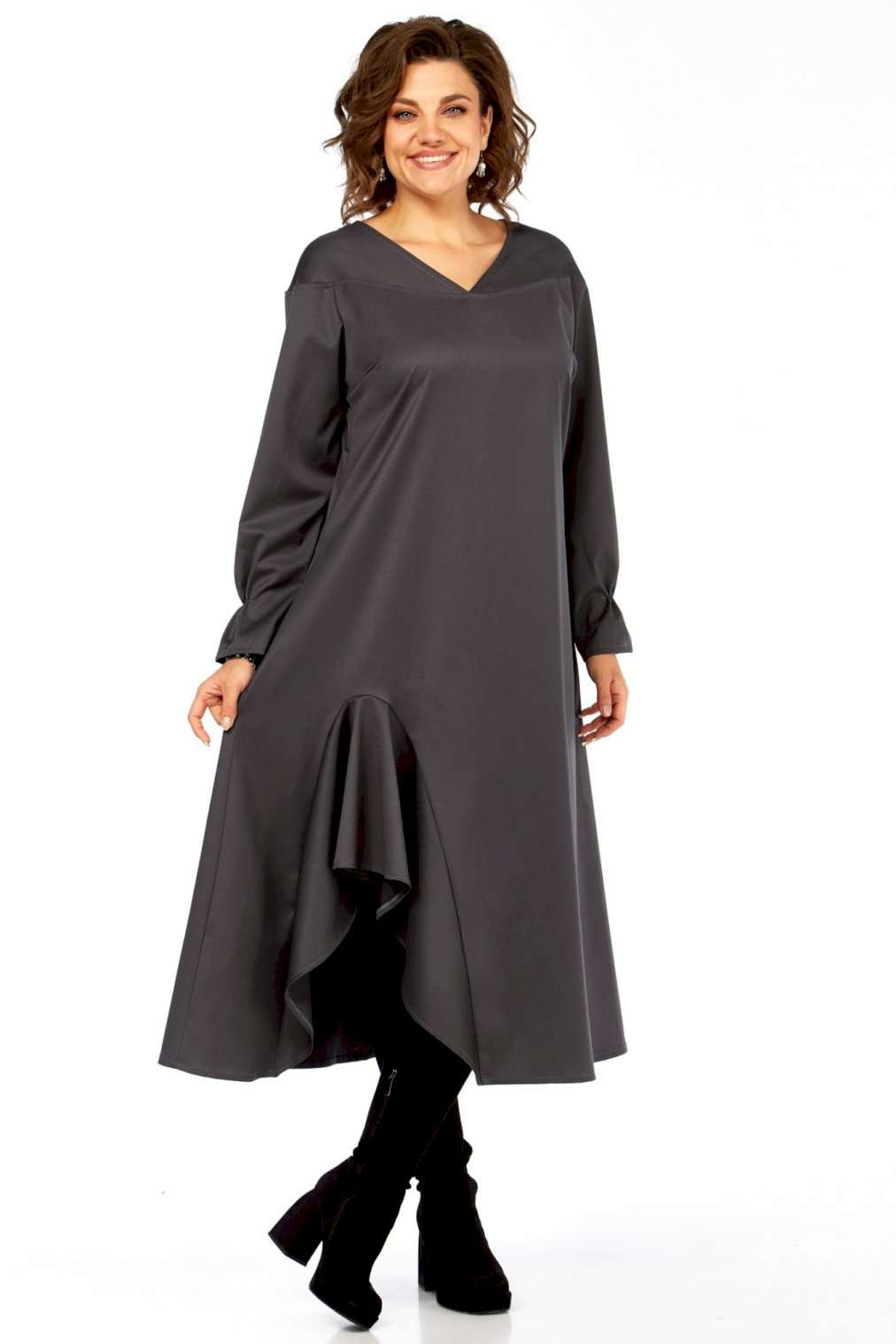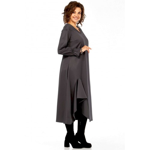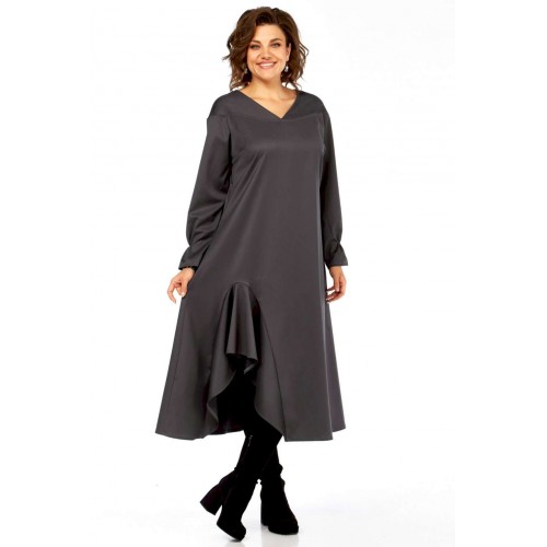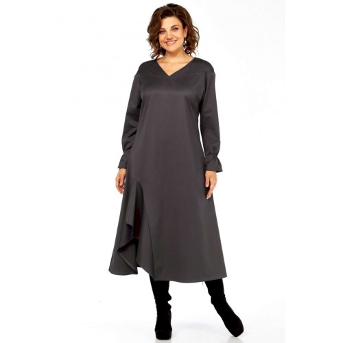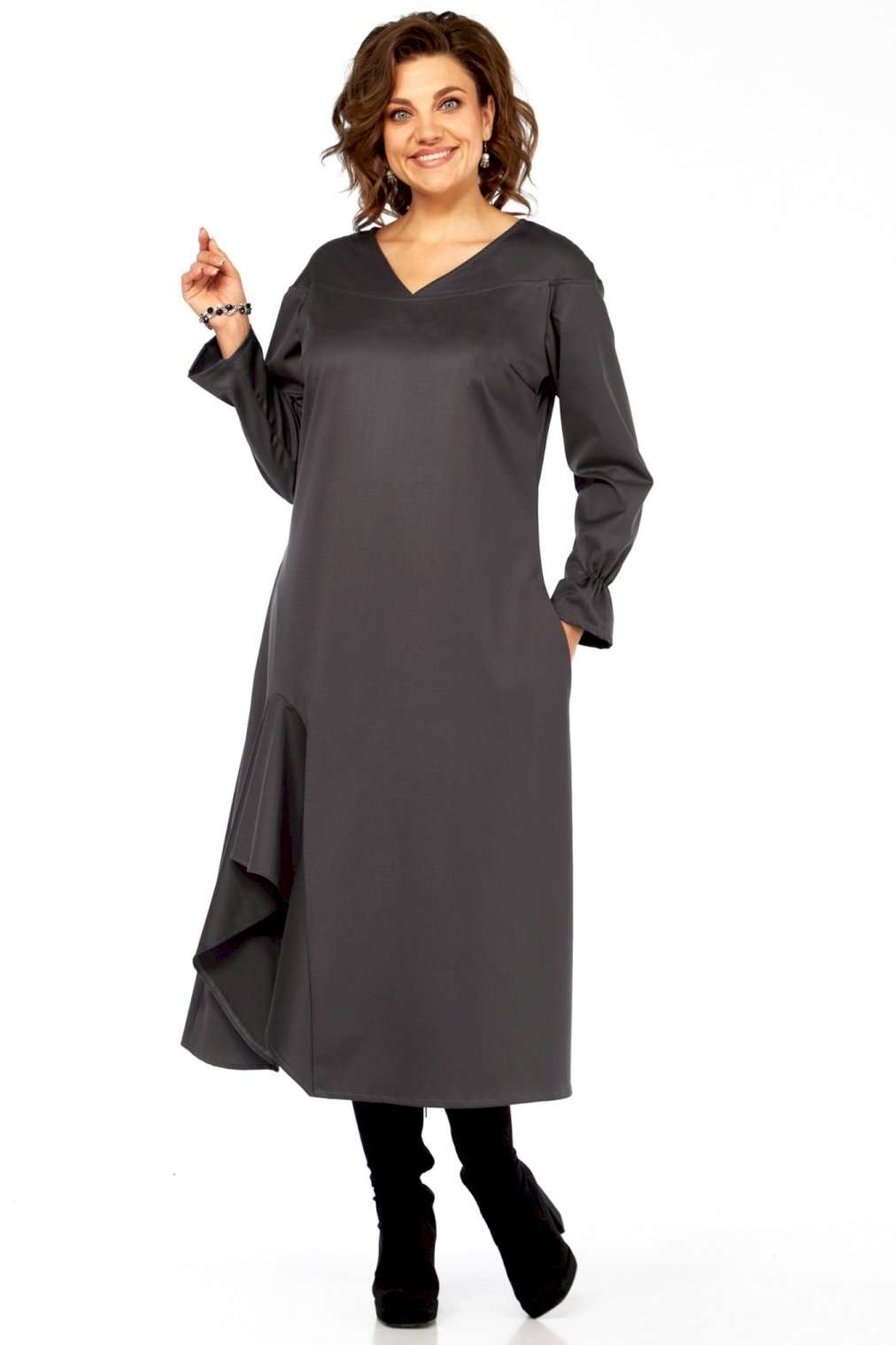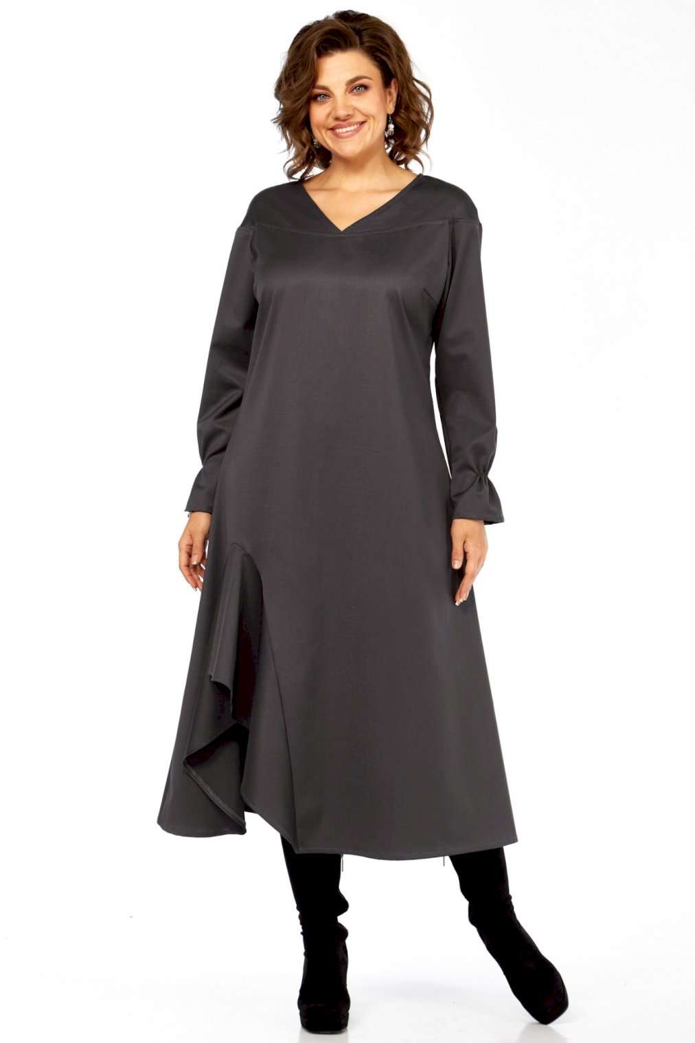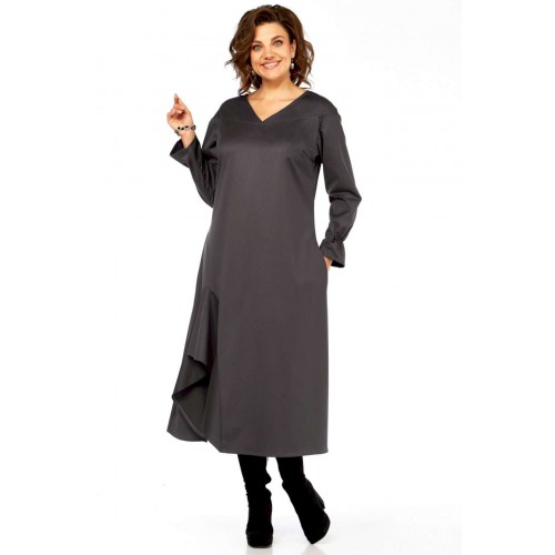 Это платье — прекрасный образец сочетания минимализма и авангардного дизайна, где классический силуэт преображается за счет одной яркой архитектурной детали. Главная изюминка - объемный волан - делает эту модель неповторимой. Вы будете выделяться, не нарушая дресс-кода. Свободный крой оверсайз и длина миди мастерски скрывают любые недостатки фигуры, даря абсолютный комфорт. Вертикальные выточки на спинке дополнительно вытягивают силуэт. Благодаря ткани и глубокому цвету, платье идеально подходит для осенне-зимнего сезона. Оно легко трансформируется из делового наряда (с классическими лодочками) в вечерний образ (с массивными украшениями и ботильонами). Добавьте это платье-шедевр в свою коллекцию. Создайте свой неповторимый стиль! Модель: Платье-миди архитектурного кроя. Силуэт: Свободный, трапециевидный, с выраженным расширением к низу, обеспечивающий комфортную посадку оверсайз. Глубокий V-образный вырез, визуально удлиняющий шею. • Линия плеча слегка спущенная, что придает верхней части мягкость и объем. • Рукава длинные, втачные. Заканчиваются аккуратной манжетой с легкой сборкой, добавляющей женственности. • Основная особенность: Асимметричная объемная драпировка (волан) в левой нижней части подола. Эта деталь выполнена из того же материала, создавая эффект динамичного, сложенного элемента, который придает платью уникальный архитектурный вид. • Спинка со средним швом и выточками, для лучшего прилегания изделия. • Ткань: Натуральная высокого качества. Длина платья 125см, длина рукава 62 см.