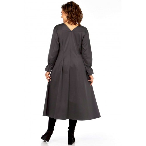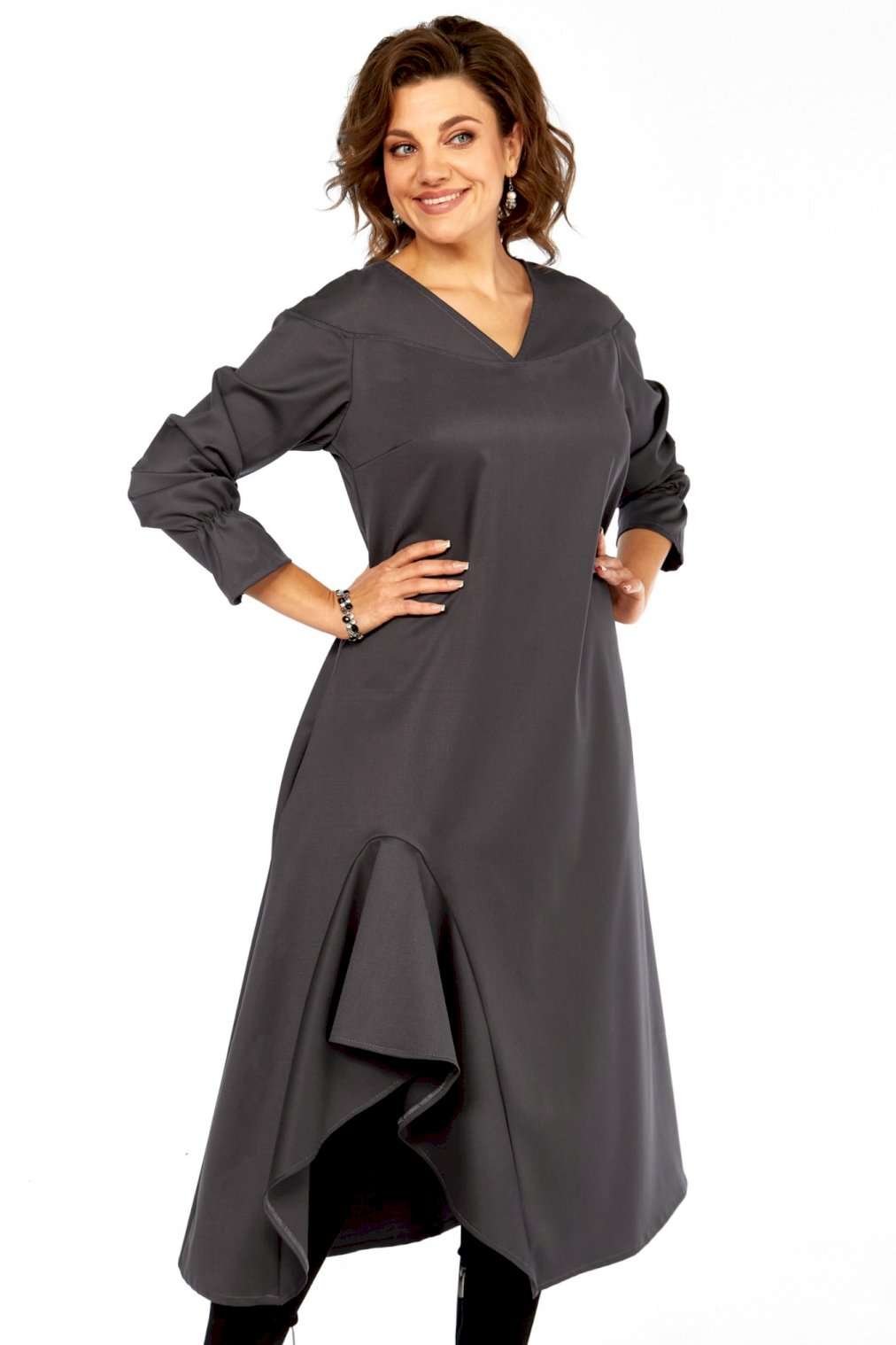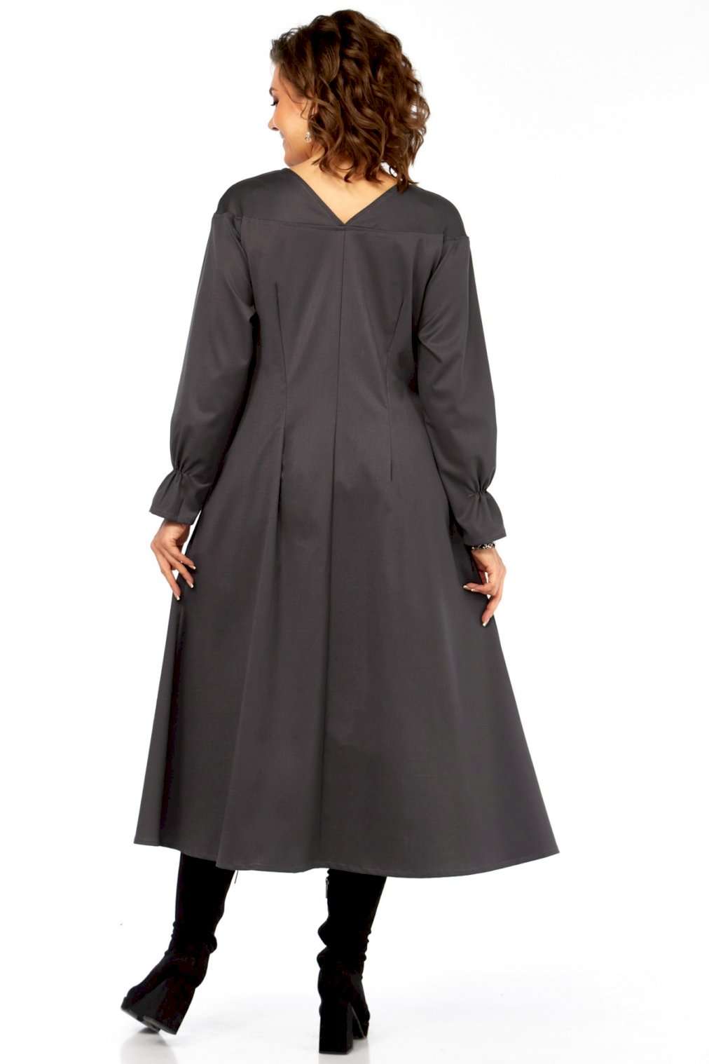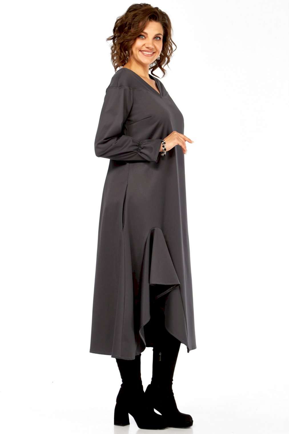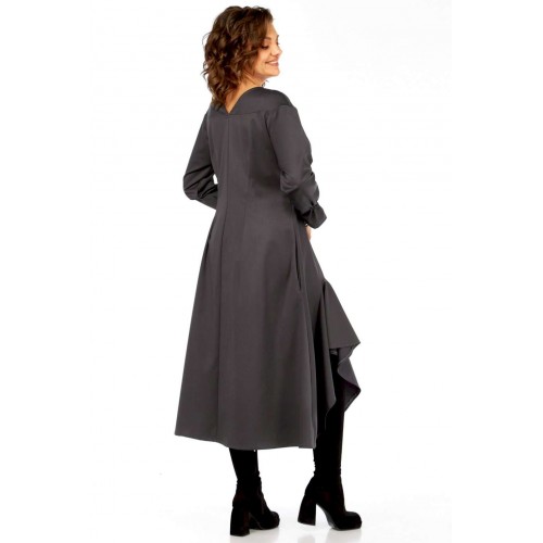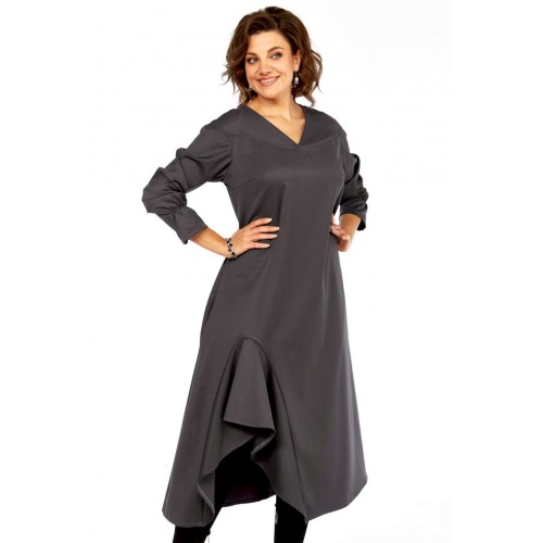 Это платье — прекрасный образец сочетания минимализма и авангардного дизайна, где классический силуэт преображается за счет одной яркой архитектурной детали. Главная изюминка - объемный волан - делает эту модель неповторимой. Вы будете выделяться, не нарушая дресс-кода. Свободный крой оверсайз и длина миди мастерски скрывают любые недостатки фигуры, даря абсолютный комфорт. Вертикальные выточки на спинке дополнительно вытягивают силуэт. Благодаря ткани и глубокому цвету, платье идеально подходит для осенне-зимнего сезона. Оно легко трансформируется из делового наряда (с классическими лодочками) в вечерний образ (с массивными украшениями и ботильонами). Добавьте это платье-шедевр в свою коллекцию. Создайте свой неповторимый стиль! Модель: Платье-миди архитектурного кроя. Силуэт: Свободный, трапециевидный, с выраженным расширением к низу, обеспечивающий комфортную посадку оверсайз. Глубокий V-образный вырез, визуально удлиняющий шею. • Линия плеча слегка спущенная, что придает верхней части мягкость и объем. • Рукава длинные, втачные. Заканчиваются аккуратной манжетой с легкой сборкой, добавляющей женственности. • Основная особенность: Асимметричная объемная драпировка (волан) в левой нижней части подола. Эта деталь выполнена из того же материала, создавая эффект динамичного, сложенного элемента, который придает платью уникальный архитектурный вид. • Спинка со средним швом и выточками, для лучшего прилегания изделия. • Ткань: Натуральная высокого качества. Длина платья 125см, длина рукава 62 см.