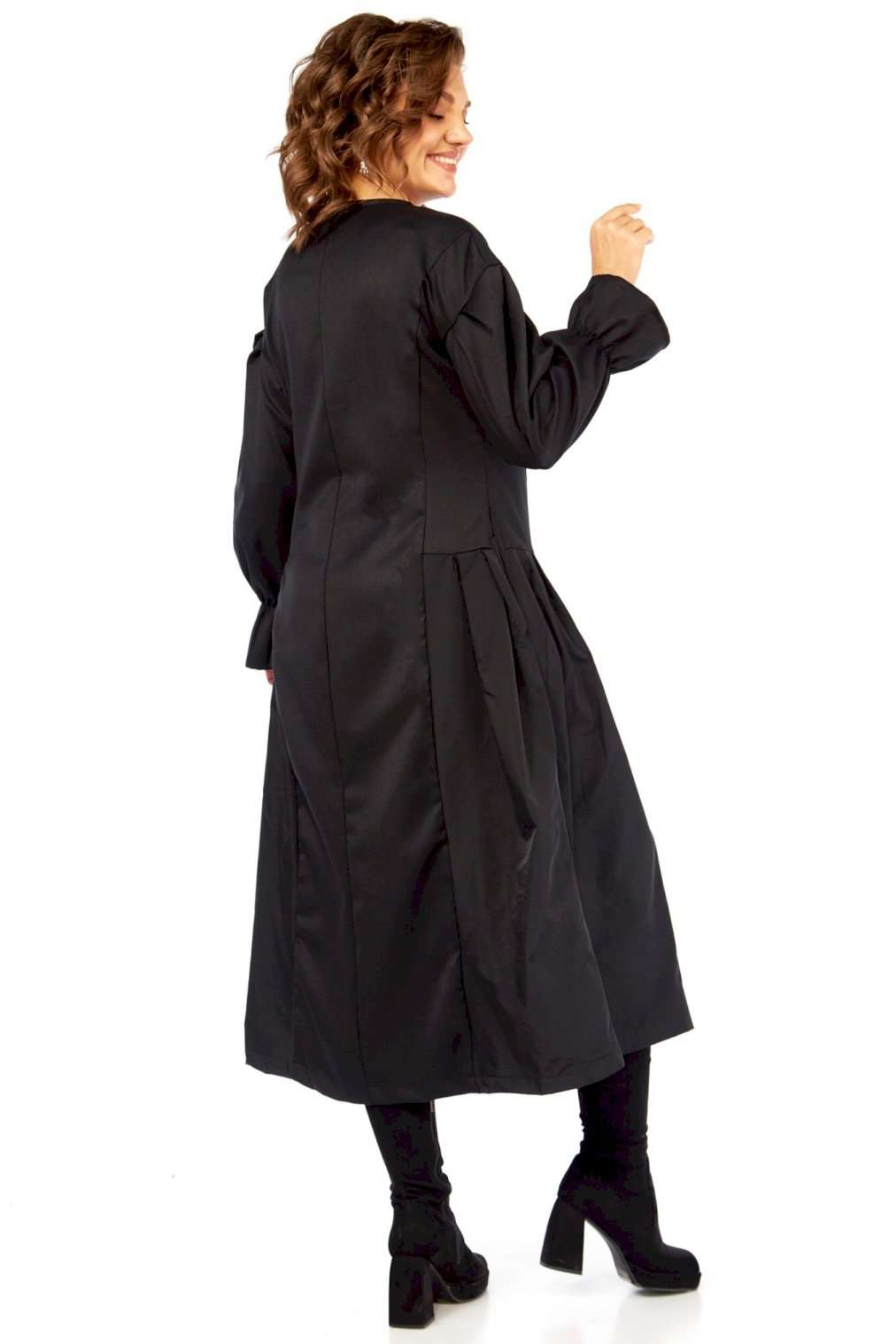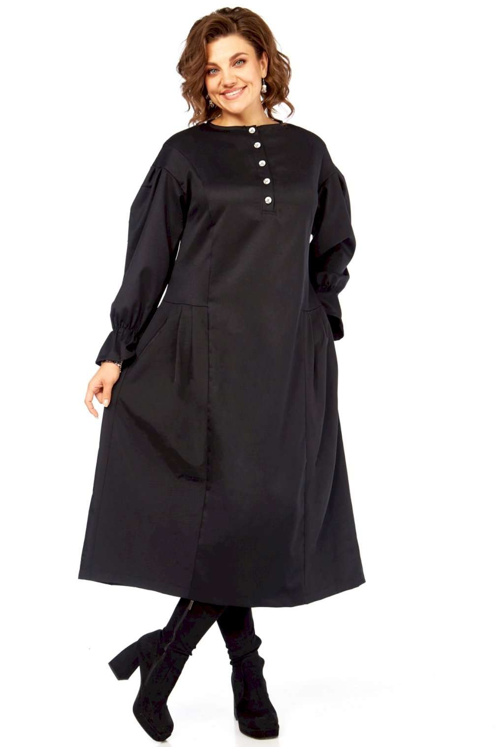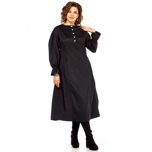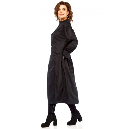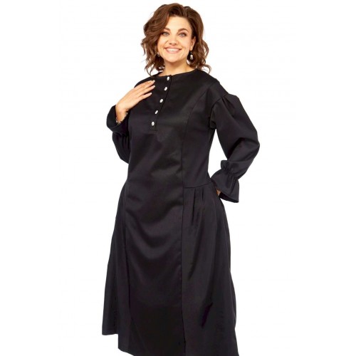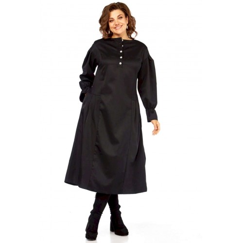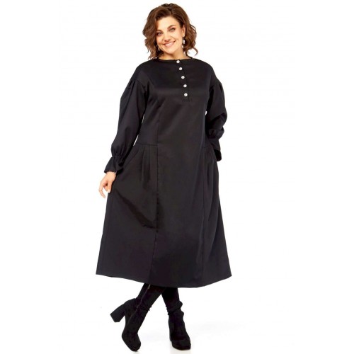 Это платье — воплощение современного комфорта, сочетающего в себе элементы винтажной романтики и структурированного минимализма. Свободный крой оверсайз гарантирует, что вы будете чувствовать себя комфортно в любой ситуации. Складки в нижней части платья мастерски скрывают область бедер и живота, создавая визуально стройный и летящий силуэт. Объемные рукава — это главный модный акцент сезона. Они придают образу современный шик и динамику, превращая простое черное платье в заявление о стиле. Это платье — идеальная база. Носите его с высокими сапогами и пальто для деловых встреч, или дополните яркими аксессуарами и грубыми ботинками для стильного городского образа. Платье-миди в стиле оверсайз. Силуэт свободный, прямой в верхней части, расширяющийся к низу за счет глубоких складок. Техническое описание: • Горловина закрытая, круглая, обеспечивающая строгий, но элегантный вид. Застежка на петли пуговицы. • Линия плеча спущенная, что усиливает эффект оверсайз. • Рукава объемные, типа «фонарик», с выраженной сборкой по окату и внизу. Заканчиваются манжетами на резинке. • В юбке объем создается за счет глубоких, вертикальных встречных складок , расположенных симметрично спереди и сзади. Складки начинаются примерно от линии бедра, обеспечивая идеальную посадку и свободу движения. • Дополнительно: имеются боковые карманы в швах для удобства. длина платья 125см, длина рукава 62 см.