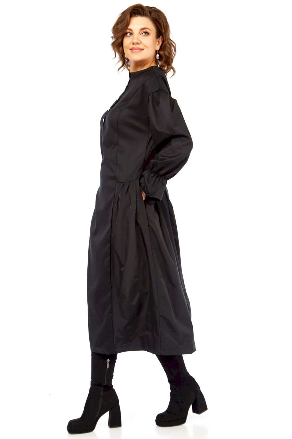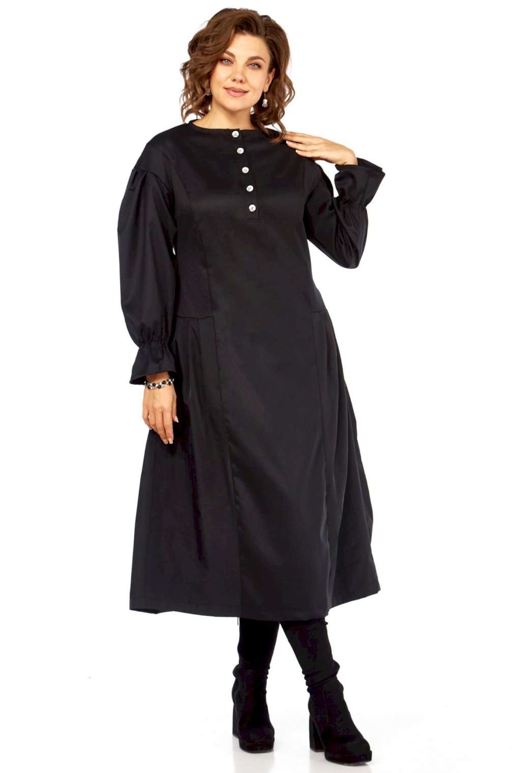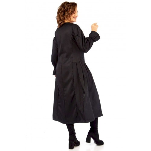 Это платье — воплощение современного комфорта, сочетающего в себе элементы винтажной романтики и структурированного минимализма. Свободный крой оверсайз гарантирует, что вы будете чувствовать себя комфортно в любой ситуации. Складки в нижней части платья мастерски скрывают область бедер и живота, создавая визуально стройный и летящий силуэт. Объемные рукава — это главный модный акцент сезона. Они придают образу современный шик и динамику, превращая простое черное платье в заявление о стиле. Это платье — идеальная база. Носите его с высокими сапогами и пальто для деловых встреч, или дополните яркими аксессуарами и грубыми ботинками для стильного городского образа. Платье-миди в стиле оверсайз. Силуэт свободный, прямой в верхней части, расширяющийся к низу за счет глубоких складок. Техническое описание: • Горловина закрытая, круглая, обеспечивающая строгий, но элегантный вид. Застежка на петли пуговицы. • Линия плеча спущенная, что усиливает эффект оверсайз. • Рукава объемные, типа «фонарик», с выраженной сборкой по окату и внизу. Заканчиваются манжетами на резинке. • В юбке объем создается за счет глубоких, вертикальных встречных складок , расположенных симметрично спереди и сзади. Складки начинаются примерно от линии бедра, обеспечивая идеальную посадку и свободу движения. • Дополнительно: имеются боковые карманы в швах для удобства. длина платья 125см, длина рукава 62 см.