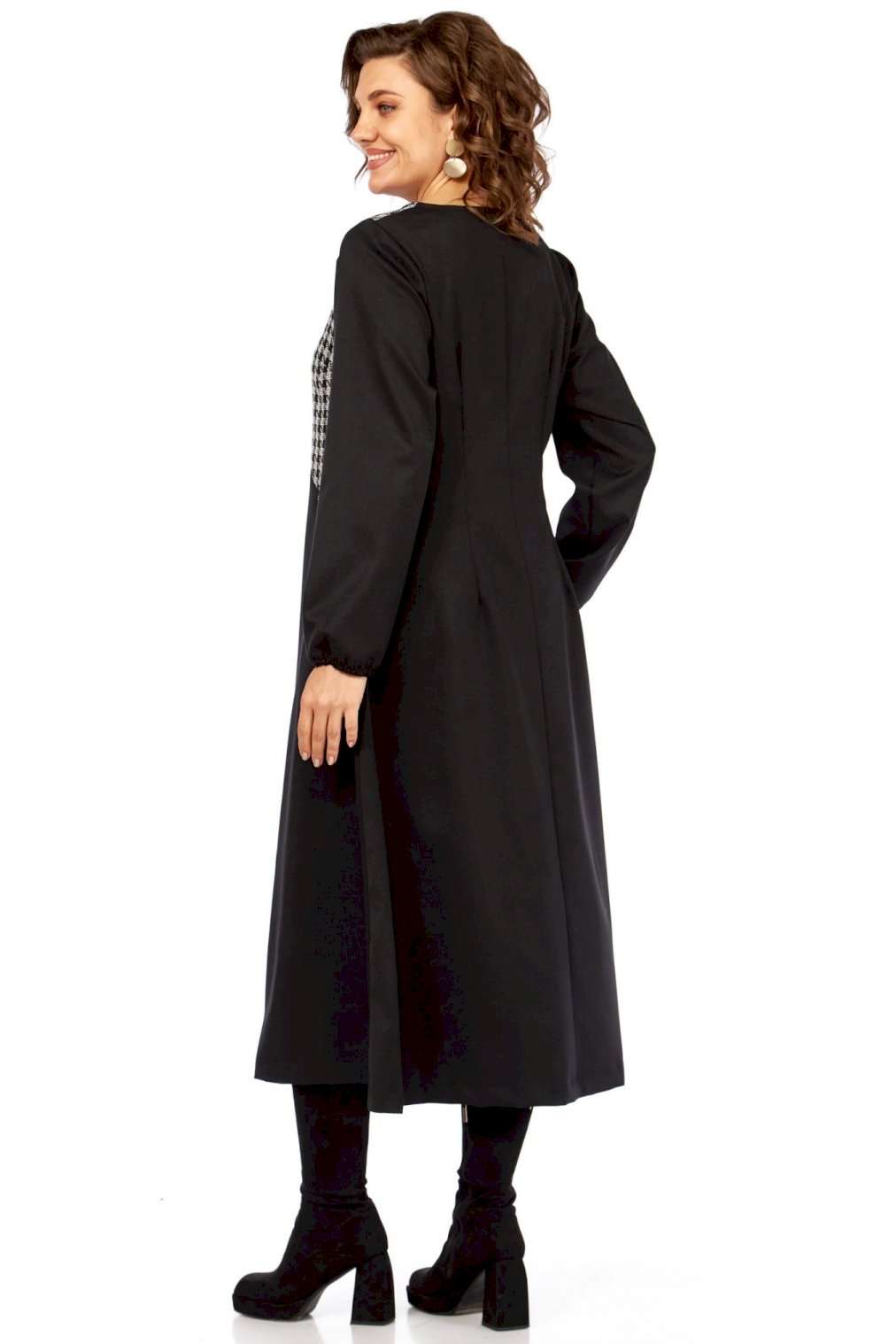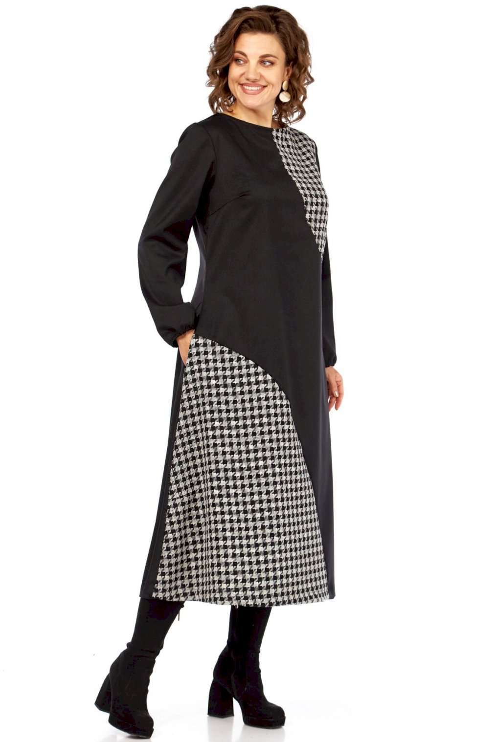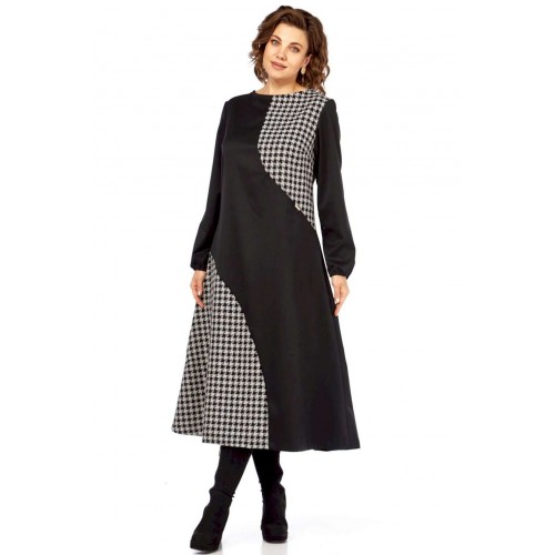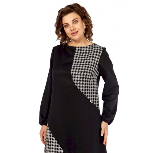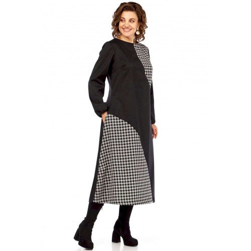 «Геометрия Стиля»- это платье воплощение современного шика, где классический принт \"\"гусиная лапка\"\" встречается с авангардным асимметричным кроем, создавая динамичный и элегантный образ. Оно идеально подходит для женщины, которая ценит индивидуальность, смелость в сочетании классики и современности, а также любит одежду, которая заявляет о себе без крика. Платье выглядит одновременно строго и игриво, сдержанно, но при этом очень эффектно. Это выбор для тех, кто хочет выглядеть стильно, уверенно и незабываемо. Платье-миди А-силуэта с асимметричными вставками. Диагональная линия, делящая платье, создает интересную композицию, визуально вытягивают фигуру, делая ее более стройной и пропорциональной. Принт \"\"гусиная лапка\"\" располагается диагонально на лифе слева и переходит на юбку справа, создавая эффект \"\"сдвига\"\" и визуальной динамики. Горловина округлой формы, рукава длинные, втачные. На концах имеют легкую сборку, что добавляет романтичности. Юбка, с боковыми карманами и плавным расширением к низу, обеспечивающим комфорт и свободу движения. Длина платья 125см, длина рукава 62 см.