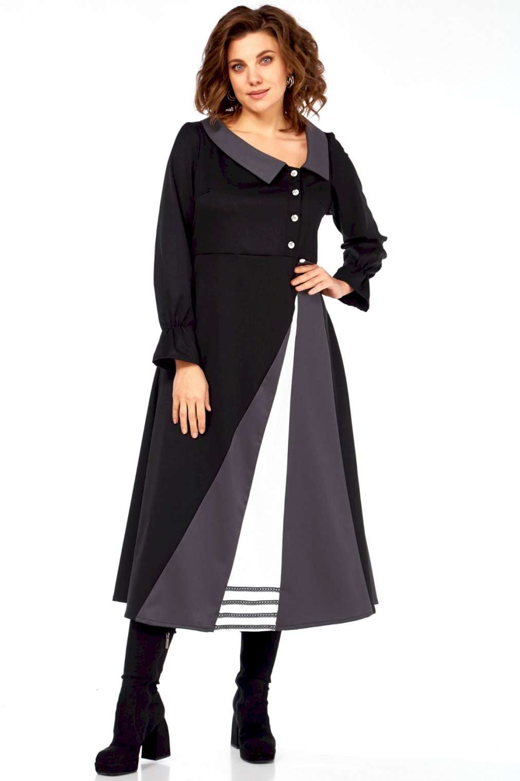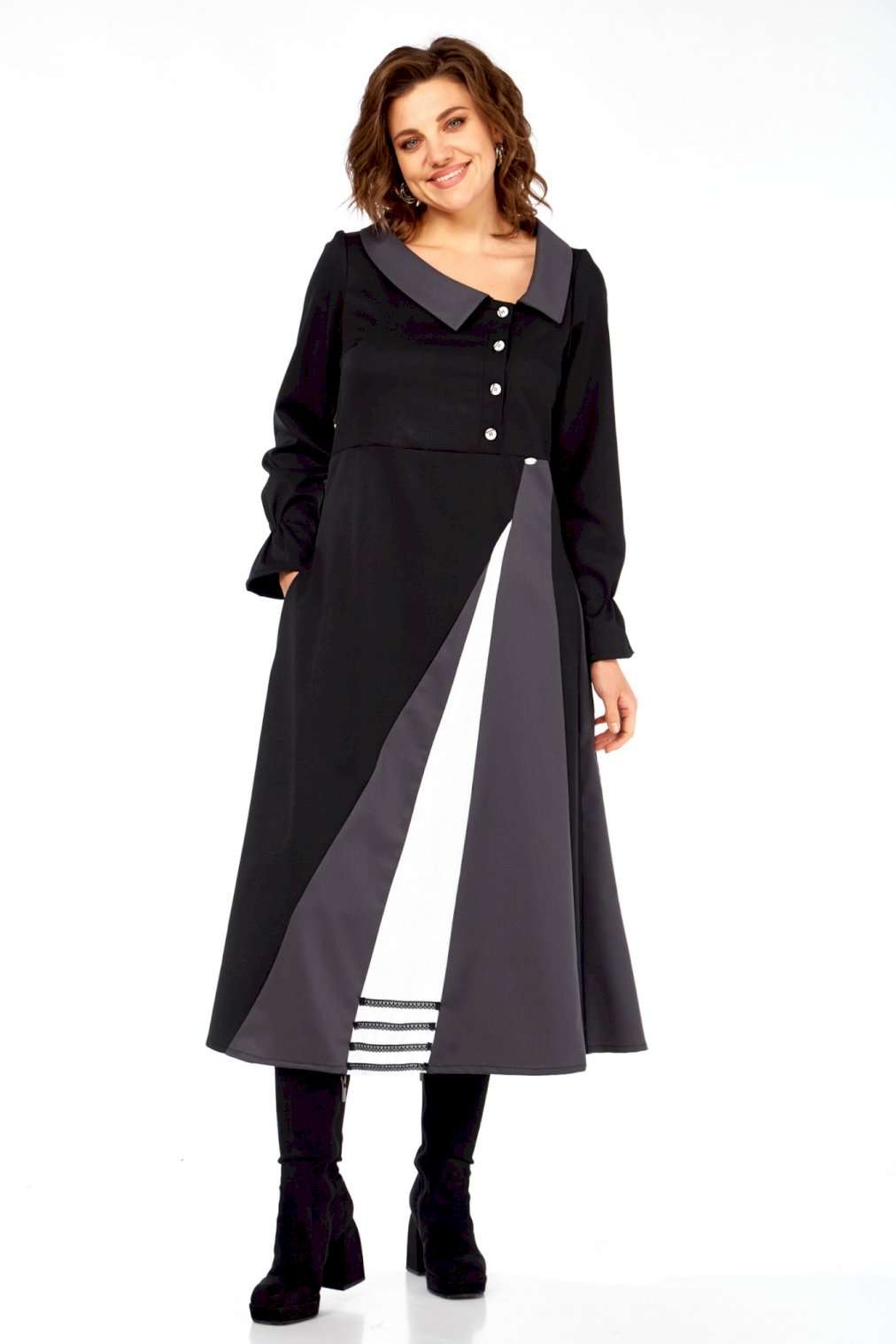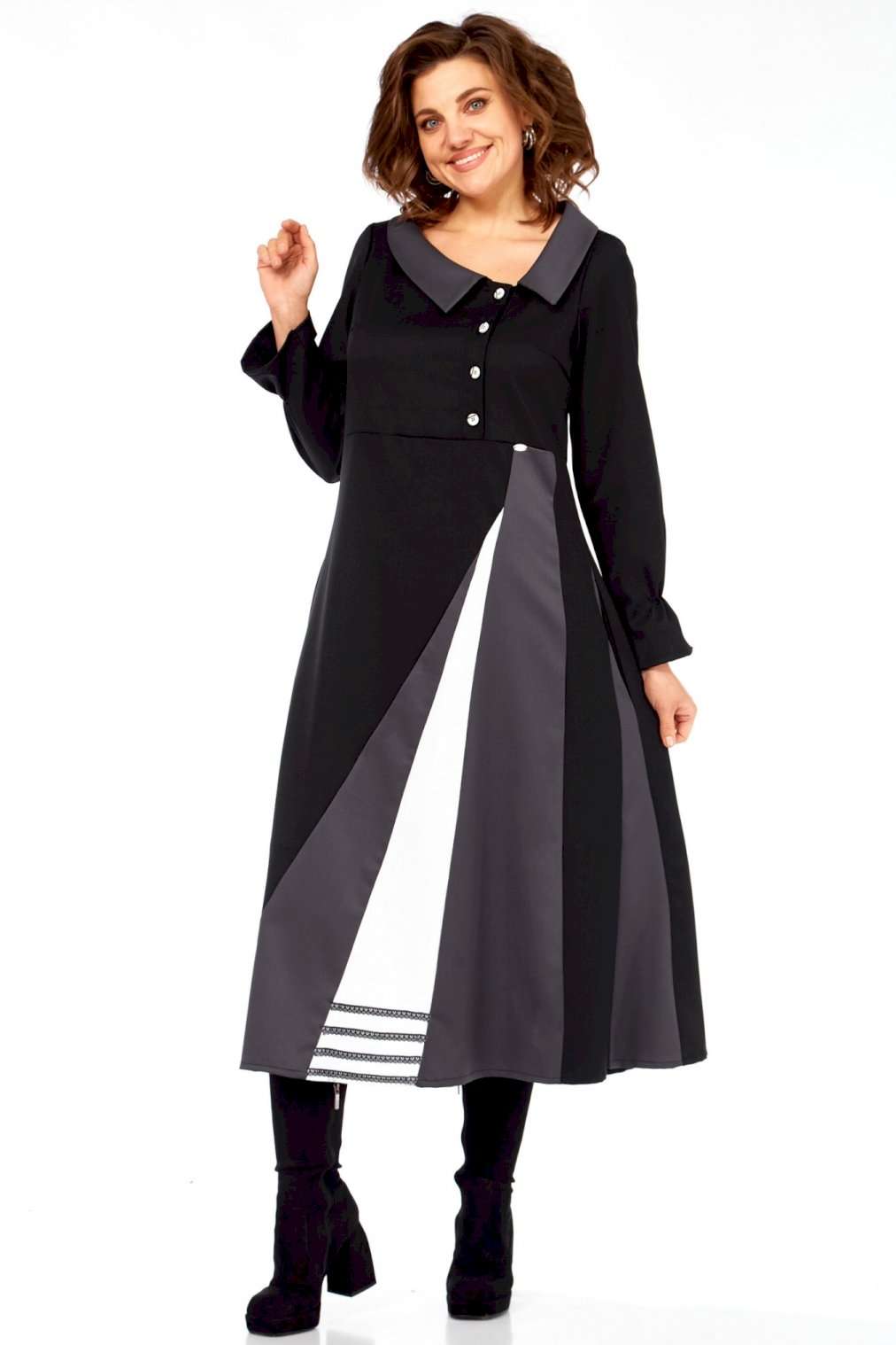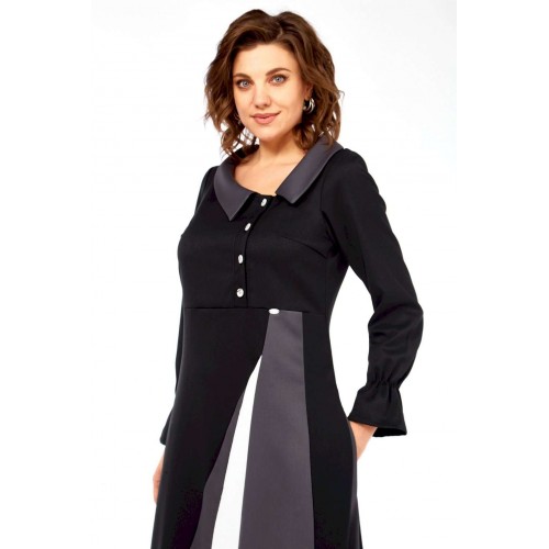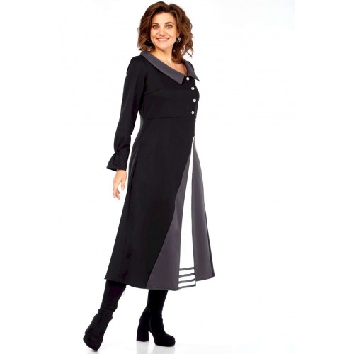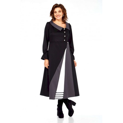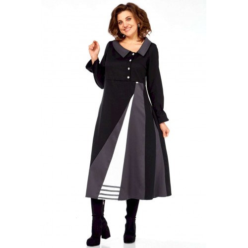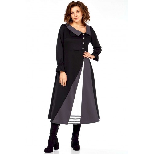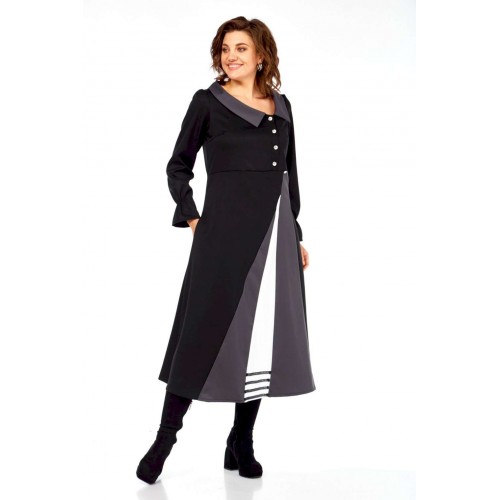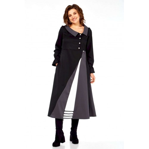 Это платье-ода элегантности движения и архитектурной точности, где каждый элемент продуман до мелочей. Асимметричные диагональные линии и расклешенный подол визуально вытягивают фигуру, делая ее стройнее и изящнее. Вы будете чувствовать себя уверенно и грациозно. Контраст черного, серого и белого создает графический, но не резкий образ, ассиметричные линии и \"разрез\" на юбке придают платью динамику, словно оно находится в постоянном, но контролируемом движении. Широкий воротник и декоративные пуговицы напоминают о винтажных патьях и шинелях, добавляя нотку ретро-шика и благородства. Забудьте о скучных нарядах! Это платье — произведение искусства, где каждая линия и каждый цвет продуманы, Вы будете ловить восхищенные взгляды, куда бы ни пошли. Техническое описание: Платье миди сложного асимметричного кроя, силуэт полуприлегающий в верхней части, переходящий в расклешенный А-силуэт к низу, создающий эффект удлиненной и струящейся фигуры. Воротник широкий, плоский, отложной, с закругленными краями, выполненный из темно-серой ткани, что придает ему элегантность и слегка винтажный акцент. Лиф приталенный, с застежкой на петли пуговицы. Декоративный ряд контрастных пуговиц, расположенных асимметрично, подчеркивает V-образный вырез и утончает силуэт. Рукава длинные, втачные, с легкой сборкой на манжетах, что добавляет мягкости и женственности. Основная часть низа выполнена из плотной черной ткани. Главная изюминка — асимметричный крой с вертикальными контрастными вставками, создающими эффект интригующего запаха или разреза. Контрастные вставки из черного основания юбки вырываются две широкие клиновидные вставки: одна темно-серая, другая — ярко-белая. Они расположены диагонально, пересекаясь, и создают визуальную игру. Белая вставка имеет выраженный декор в нижней части — три горизонтальные кружевные полоски, что добавляет графичности и уникальности. Спинка цельнокроеная с двумя выточками для лучшего прилегания фигуры, выполнена из основной черной ткани, подчеркивая стройность силуэта. Длина спинки 125см, длина рукава 6см.