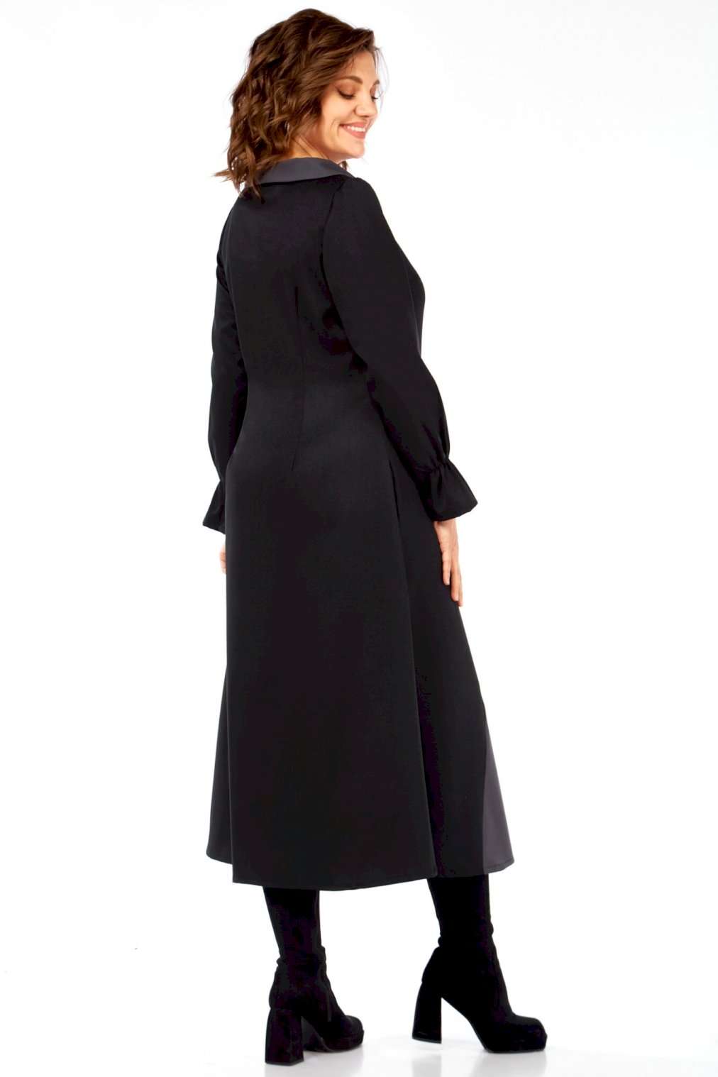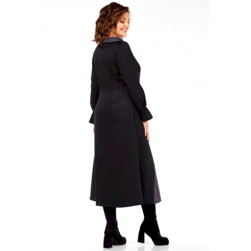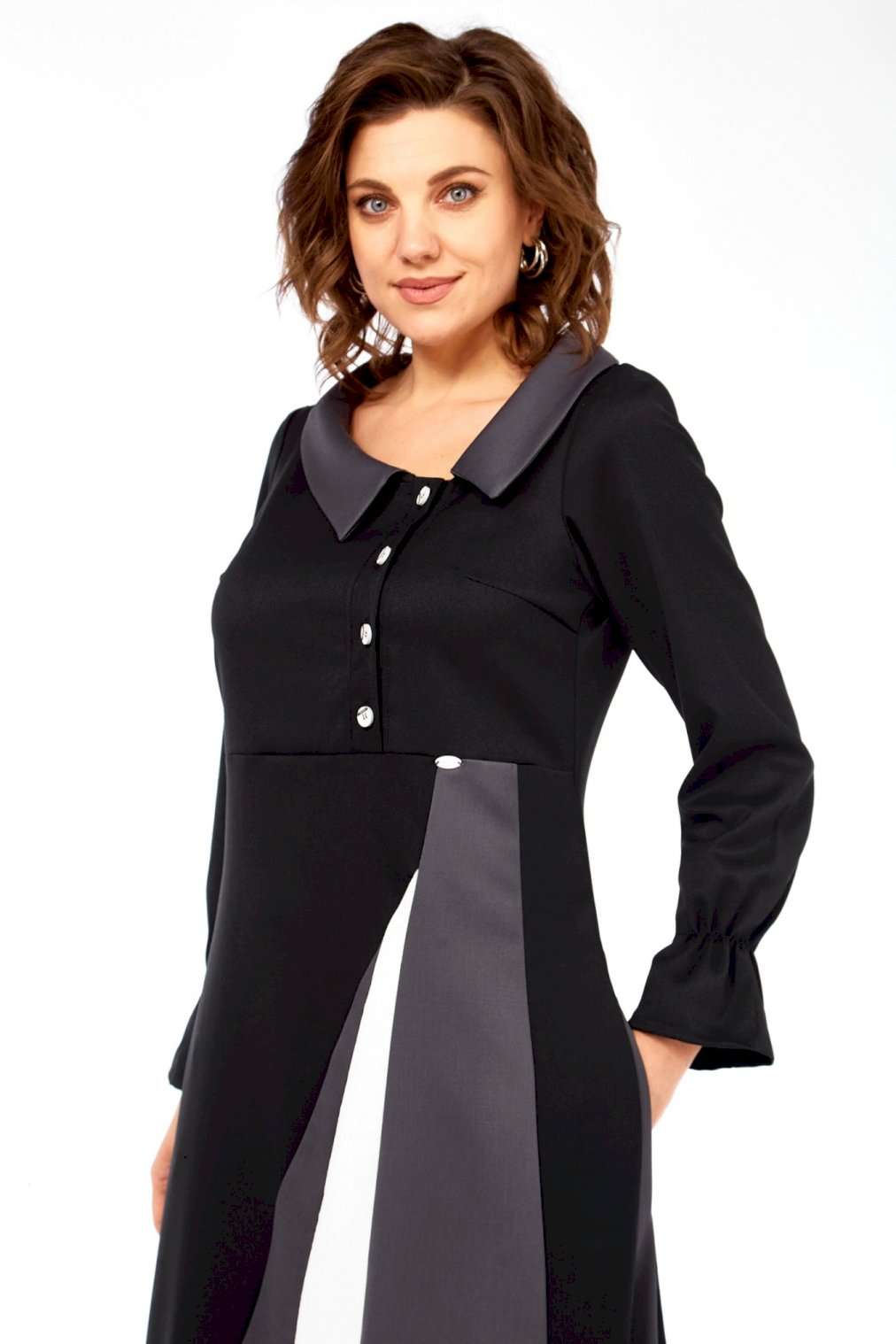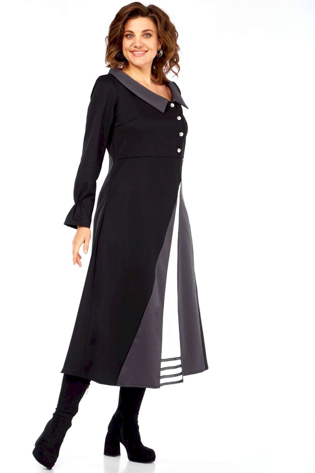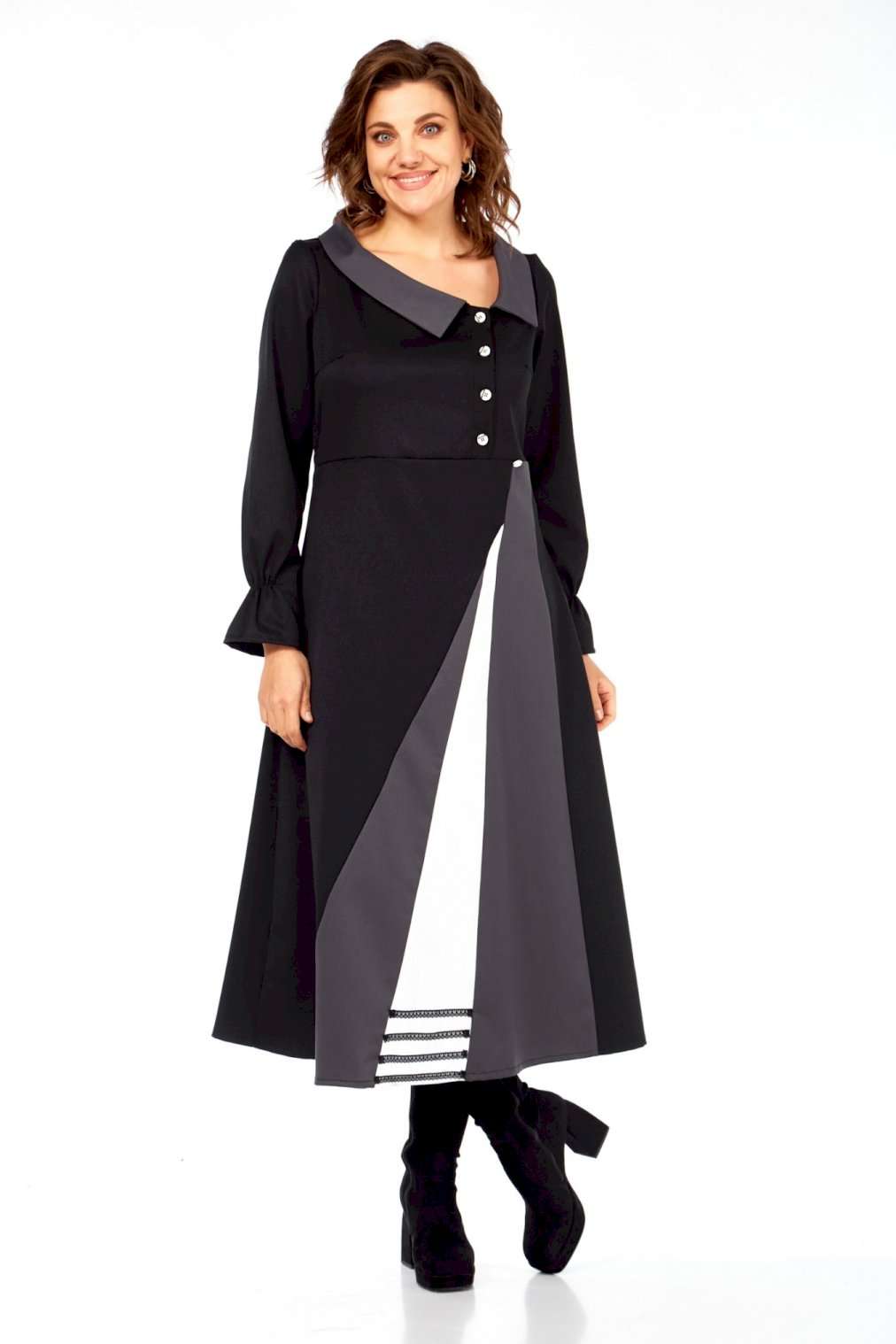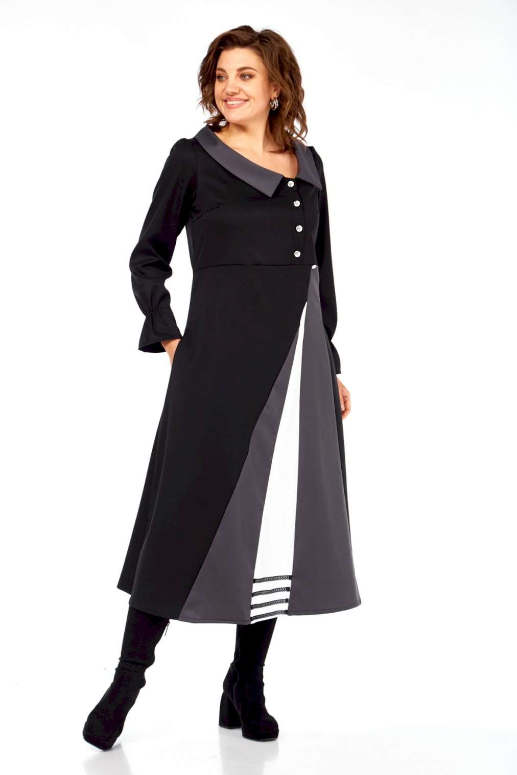 Это платье-ода элегантности движения и архитектурной точности, где каждый элемент продуман до мелочей. Асимметричные диагональные линии и расклешенный подол визуально вытягивают фигуру, делая ее стройнее и изящнее. Вы будете чувствовать себя уверенно и грациозно. Контраст черного, серого и белого создает графический, но не резкий образ, ассиметричные линии и \"разрез\" на юбке придают платью динамику, словно оно находится в постоянном, но контролируемом движении. Широкий воротник и декоративные пуговицы напоминают о винтажных патьях и шинелях, добавляя нотку ретро-шика и благородства. Забудьте о скучных нарядах! Это платье — произведение искусства, где каждая линия и каждый цвет продуманы, Вы будете ловить восхищенные взгляды, куда бы ни пошли. Техническое описание: Платье миди сложного асимметричного кроя, силуэт полуприлегающий в верхней части, переходящий в расклешенный А-силуэт к низу, создающий эффект удлиненной и струящейся фигуры. Воротник широкий, плоский, отложной, с закругленными краями, выполненный из темно-серой ткани, что придает ему элегантность и слегка винтажный акцент. Лиф приталенный, с застежкой на петли пуговицы. Декоративный ряд контрастных пуговиц, расположенных асимметрично, подчеркивает V-образный вырез и утончает силуэт. Рукава длинные, втачные, с легкой сборкой на манжетах, что добавляет мягкости и женственности. Основная часть низа выполнена из плотной черной ткани. Главная изюминка — асимметричный крой с вертикальными контрастными вставками, создающими эффект интригующего запаха или разреза. Контрастные вставки из черного основания юбки вырываются две широкие клиновидные вставки: одна темно-серая, другая — ярко-белая. Они расположены диагонально, пересекаясь, и создают визуальную игру. Белая вставка имеет выраженный декор в нижней части — три горизонтальные кружевные полоски, что добавляет графичности и уникальности. Спинка цельнокроеная с двумя выточками для лучшего прилегания фигуры, выполнена из основной черной ткани, подчеркивая стройность силуэта. Длина спинки 125см, длина рукава 6см.
