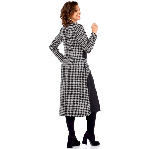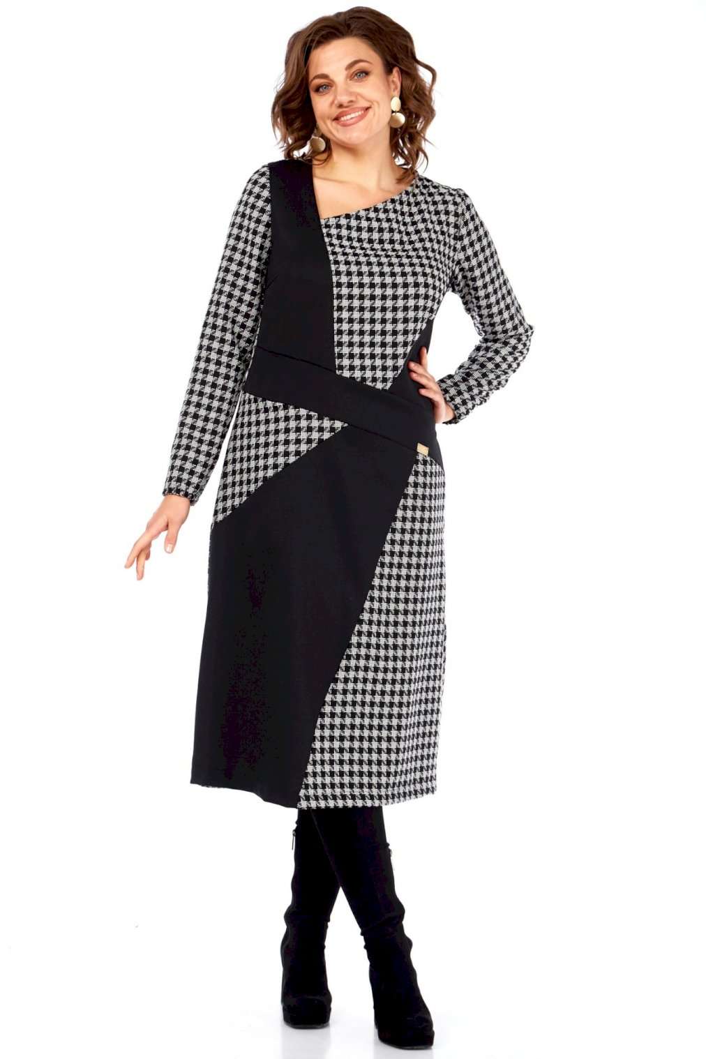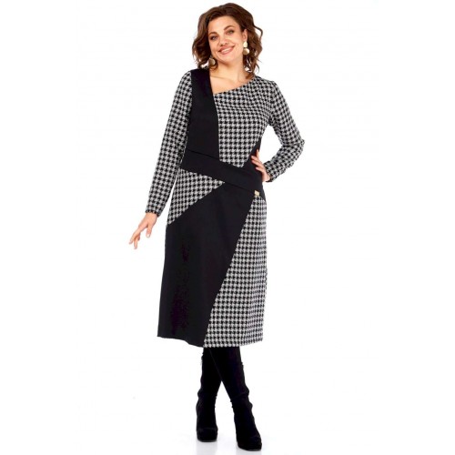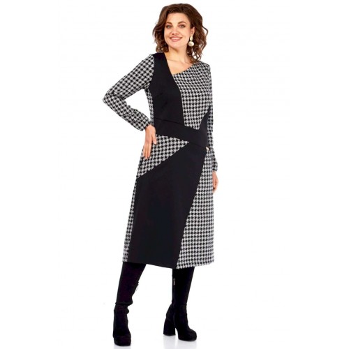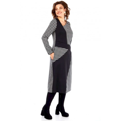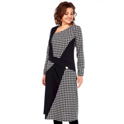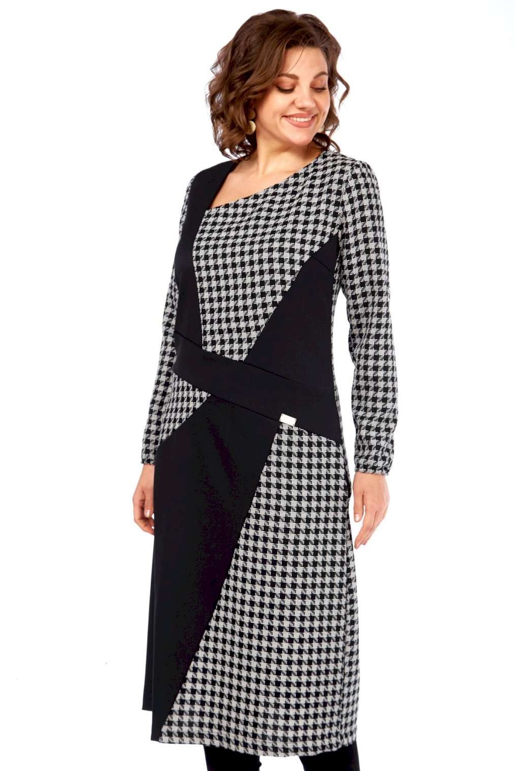 Это платье — манифест графического минимализма и интеллектуальной моды. Оно смело переосмысливает классику, превращая узнаваемый принт \"\"гусиная лапка\"\" в основу для футуристической, но при этом невероятно элегантной композиции. Асимметричный вырез горловины и сложный, но гармоничный геометрический крой на лифе и юбке создают ощущение движения и оптической иллюзии, притягивая взгляд и не давая ему заскучать. Черные панели словно вырезаны из пространства, играя с объемами и линиями, и выстраивая новую архитектуру силуэта. Продуманное расположение черных геометрических вставок оптически стройнит и вытягивает силуэт, создавая идеальные пропорции. Вы будете чувствовать себя уверенно и выглядеть безупречно. Платье для женщины, которая не боится быть в центре внимания, но делает это с помощью изысканности и продуманного стиля, а не ярких кричащих деталей. Это одежда для тех, кто ценит модернизм, смелость в дизайне и безупречный вкус, способный сочетать строгость и динамичность. В этом платье чувствуется уверенность, внутренняя сила и понимание тонких нюансов современного стиля. Длина платья (117 см) и рукава (62 см)