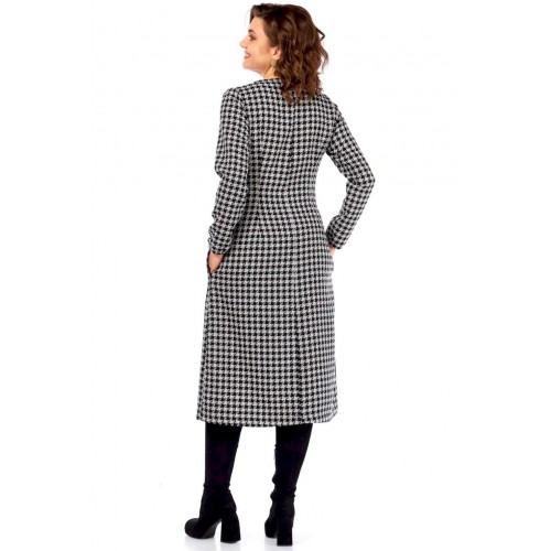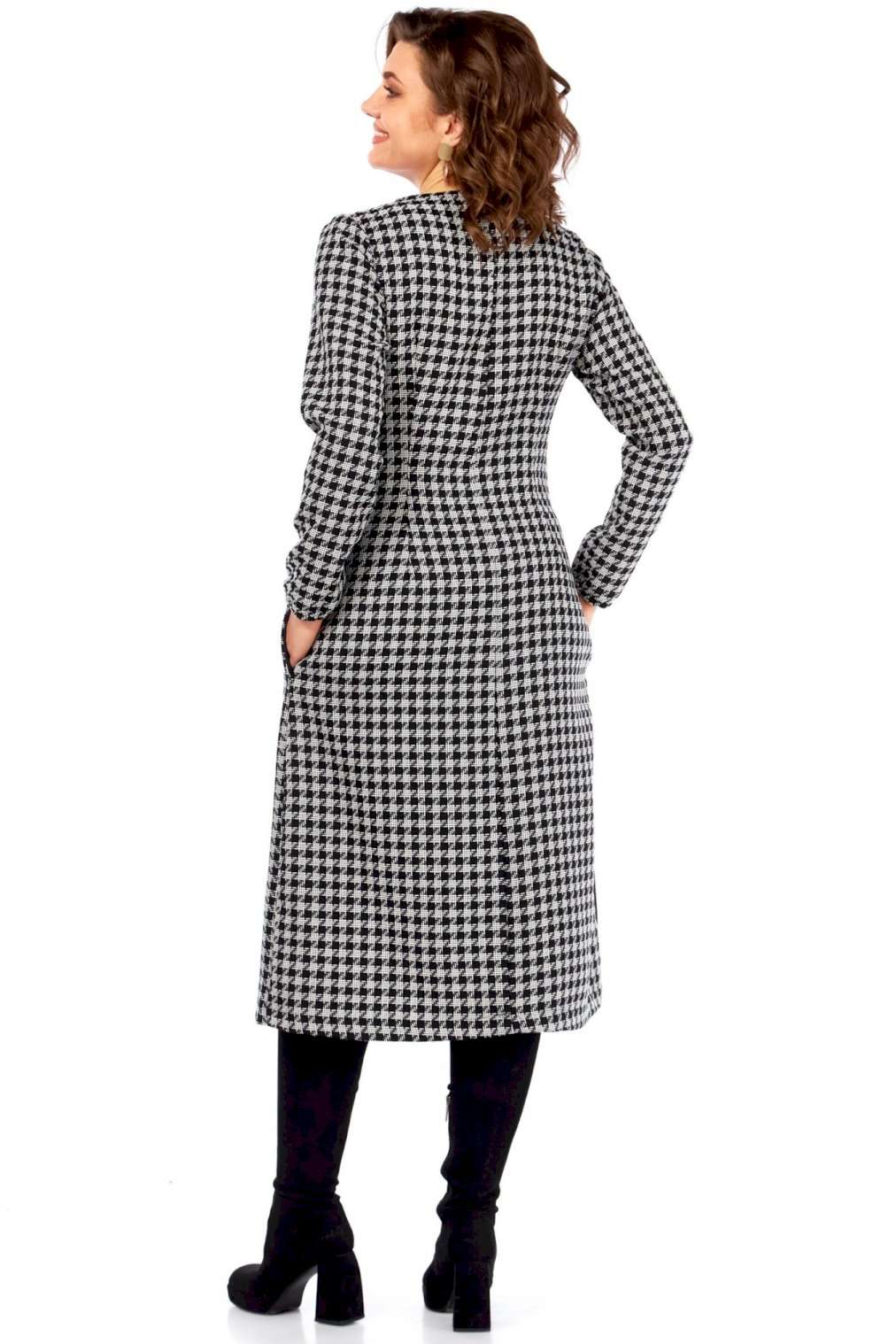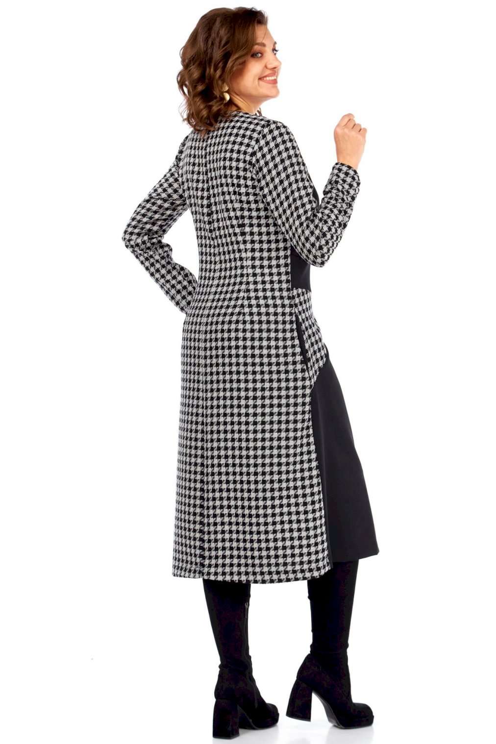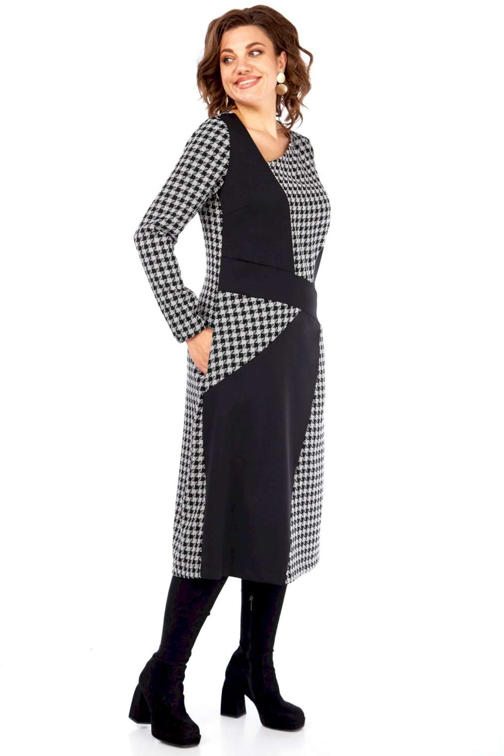 Это платье — манифест графического минимализма и интеллектуальной моды. Оно смело переосмысливает классику, превращая узнаваемый принт \"\"гусиная лапка\"\" в основу для футуристической, но при этом невероятно элегантной композиции. Асимметричный вырез горловины и сложный, но гармоничный геометрический крой на лифе и юбке создают ощущение движения и оптической иллюзии, притягивая взгляд и не давая ему заскучать. Черные панели словно вырезаны из пространства, играя с объемами и линиями, и выстраивая новую архитектуру силуэта. Продуманное расположение черных геометрических вставок оптически стройнит и вытягивает силуэт, создавая идеальные пропорции. Вы будете чувствовать себя уверенно и выглядеть безупречно. Платье для женщины, которая не боится быть в центре внимания, но делает это с помощью изысканности и продуманного стиля, а не ярких кричащих деталей. Это одежда для тех, кто ценит модернизм, смелость в дизайне и безупречный вкус, способный сочетать строгость и динамичность. В этом платье чувствуется уверенность, внутренняя сила и понимание тонких нюансов современного стиля. Длина платья (117 см) и рукава (62 см)