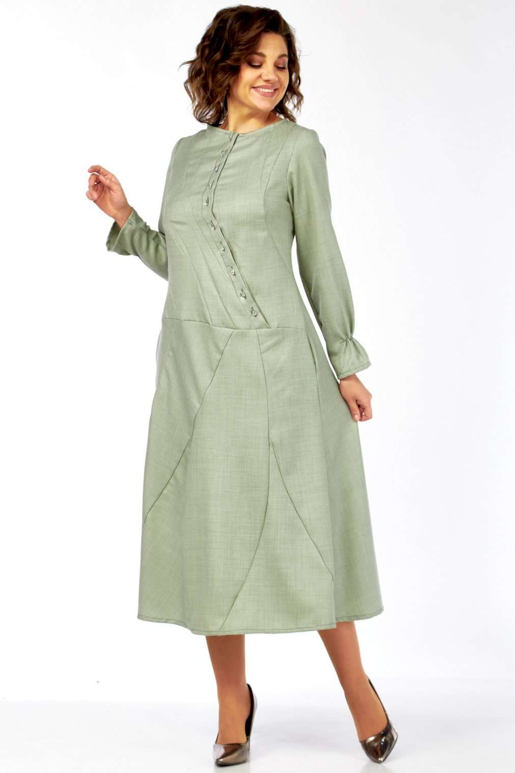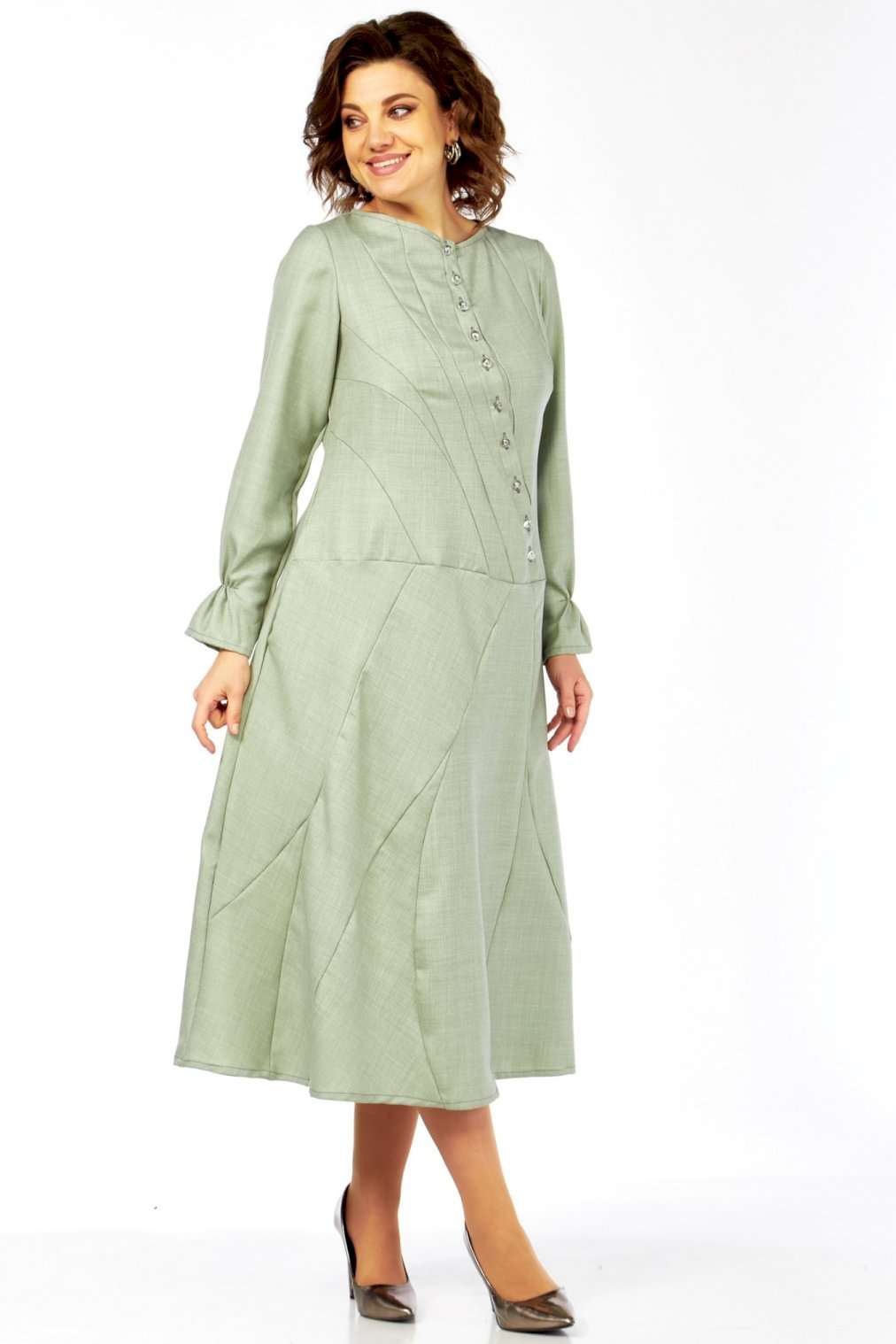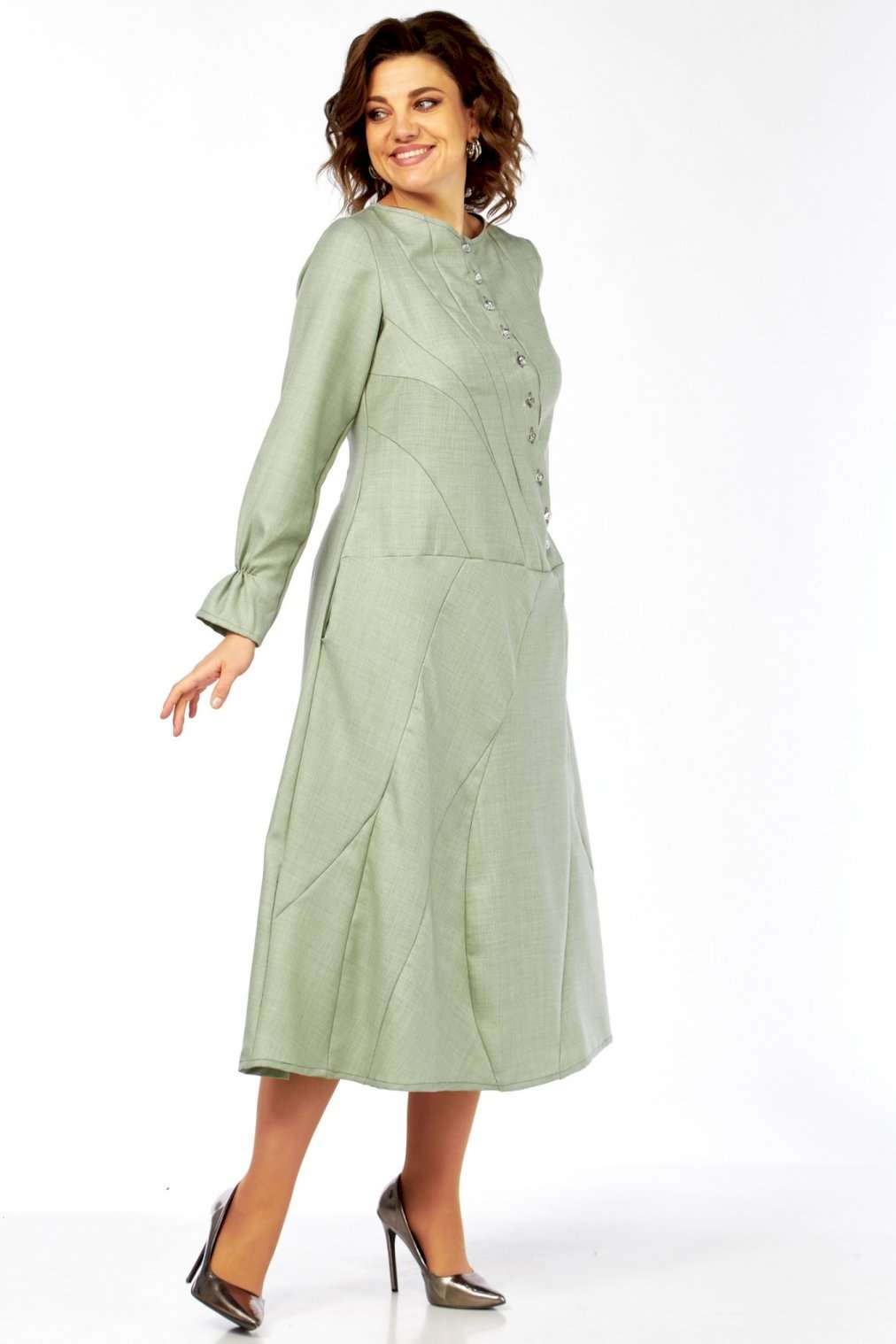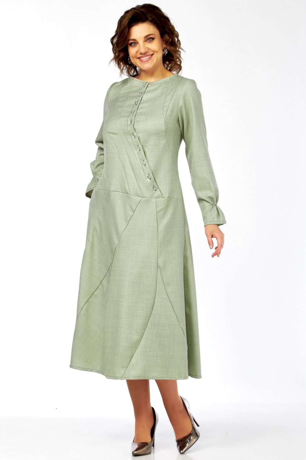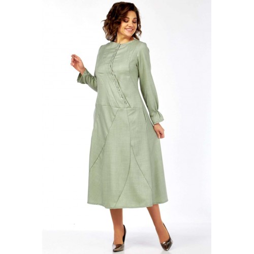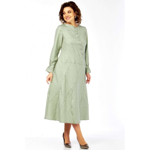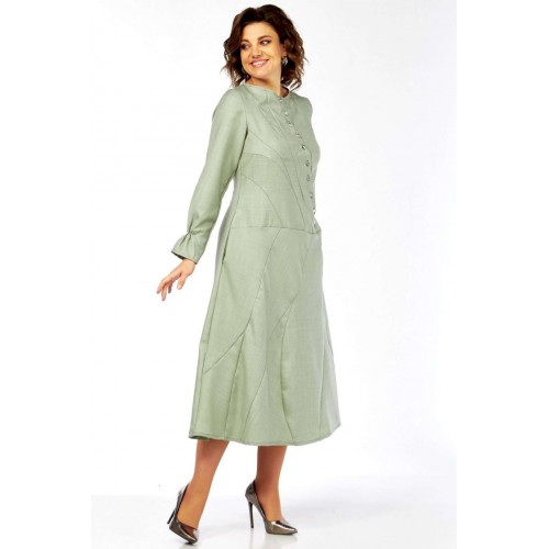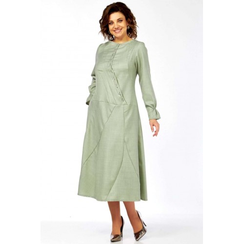 Это платье – воплощение сдержанной элегантности и утонченного стиля. Оттенок платья напоминает пыльную мяту, нежную фисташку или приглушенный шалфей. Это спокойный, благородный тон, который прекрасно вписывается в офисный гардероб, но при этом достаточно свеж. Изящный округлый вырез под горло выглядит скромно, но стильно, акцентируя внимание на шее. Главная изюминка лифа – это асимметричная декоративная планка с рядом блестящих пуговиц, придающих динамику и визуально вытягивающих силуэт. От планки расходятся диагональные рельефные швы, которые не только формируют фигуру, но и создают интересный архитектурный узор, добавляя сложности и шарма. Длинные, классические рукава завершаются изящными манжетами с деликатной сборкой. Этот ненавязчивый элемент придает платью нотку романтичности и женственности. Юбка длины миди, выполнена из нескольких клиньев, соединенных фигурными, диагональными швами, которые повторяют линии лифа. Эти швы не просто соединяют детали, они создают уникальный рисунок, а также визуально стройнят фигуру. Практичные и незаметные боковые карманы, органично вписаны в линию кроя, добавляют функциональности без ущерба для стиля. Длина изделия по спинке 120 см., длина рукава 62 см.