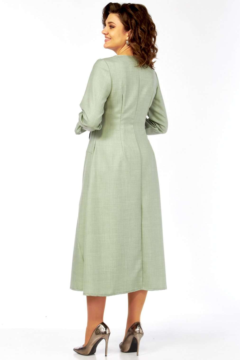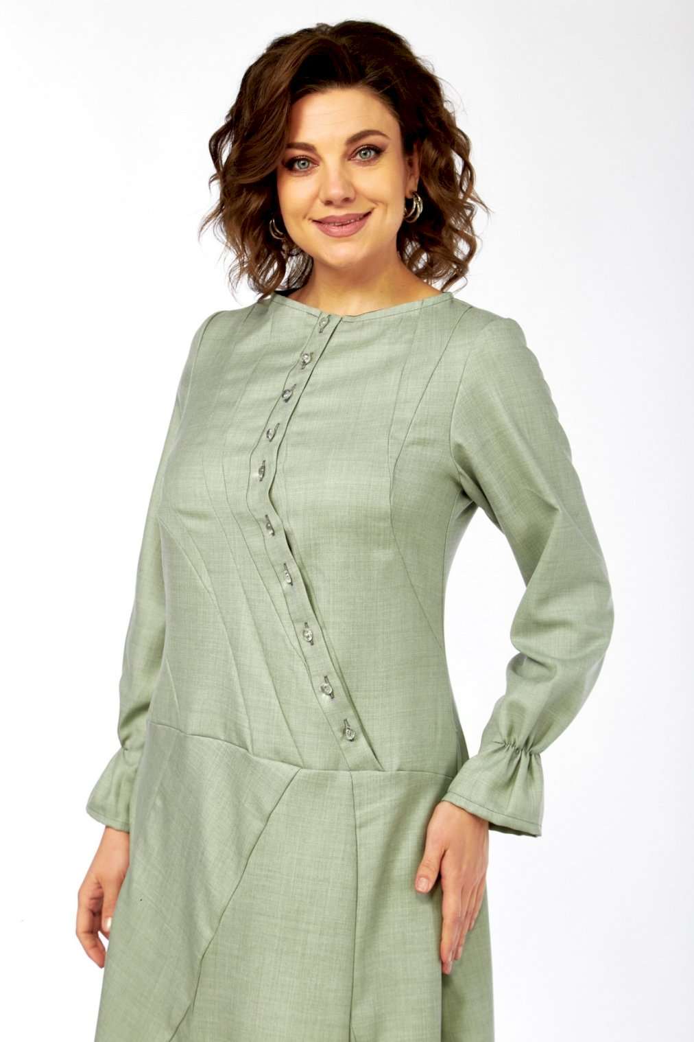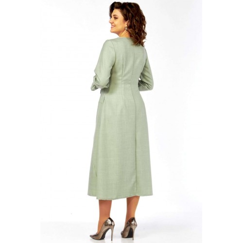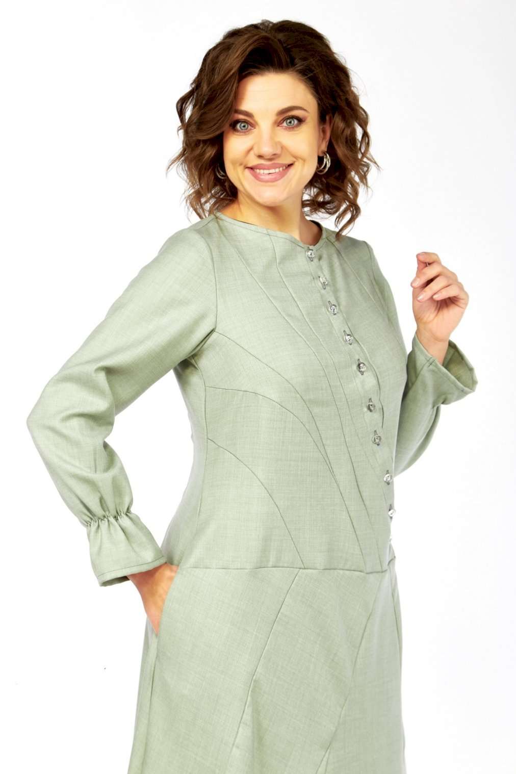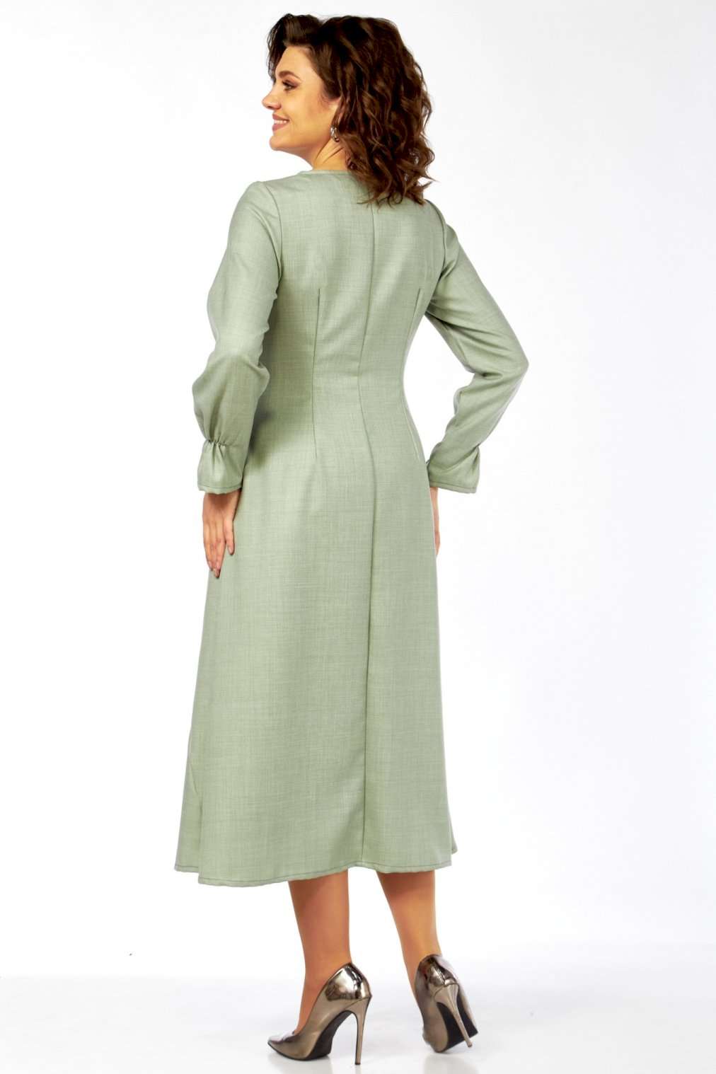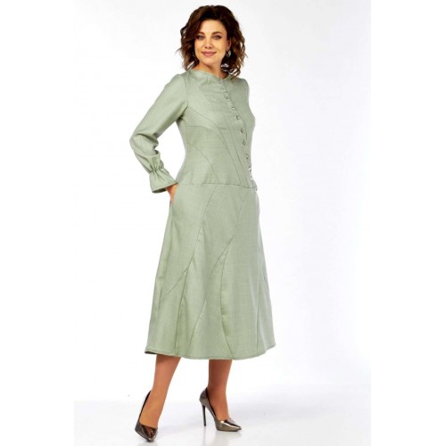 Это платье – воплощение сдержанной элегантности и утонченного стиля. Оттенок платья напоминает пыльную мяту, нежную фисташку или приглушенный шалфей. Это спокойный, благородный тон, который прекрасно вписывается в офисный гардероб, но при этом достаточно свеж. Изящный округлый вырез под горло выглядит скромно, но стильно, акцентируя внимание на шее. Главная изюминка лифа – это асимметричная декоративная планка с рядом блестящих пуговиц, придающих динамику и визуально вытягивающих силуэт. От планки расходятся диагональные рельефные швы, которые не только формируют фигуру, но и создают интересный архитектурный узор, добавляя сложности и шарма. Длинные, классические рукава завершаются изящными манжетами с деликатной сборкой. Этот ненавязчивый элемент придает платью нотку романтичности и женственности. Юбка длины миди, выполнена из нескольких клиньев, соединенных фигурными, диагональными швами, которые повторяют линии лифа. Эти швы не просто соединяют детали, они создают уникальный рисунок, а также визуально стройнят фигуру. Практичные и незаметные боковые карманы, органично вписаны в линию кроя, добавляют функциональности без ущерба для стиля. Длина изделия по спинке 120 см., длина рукава 62 см.