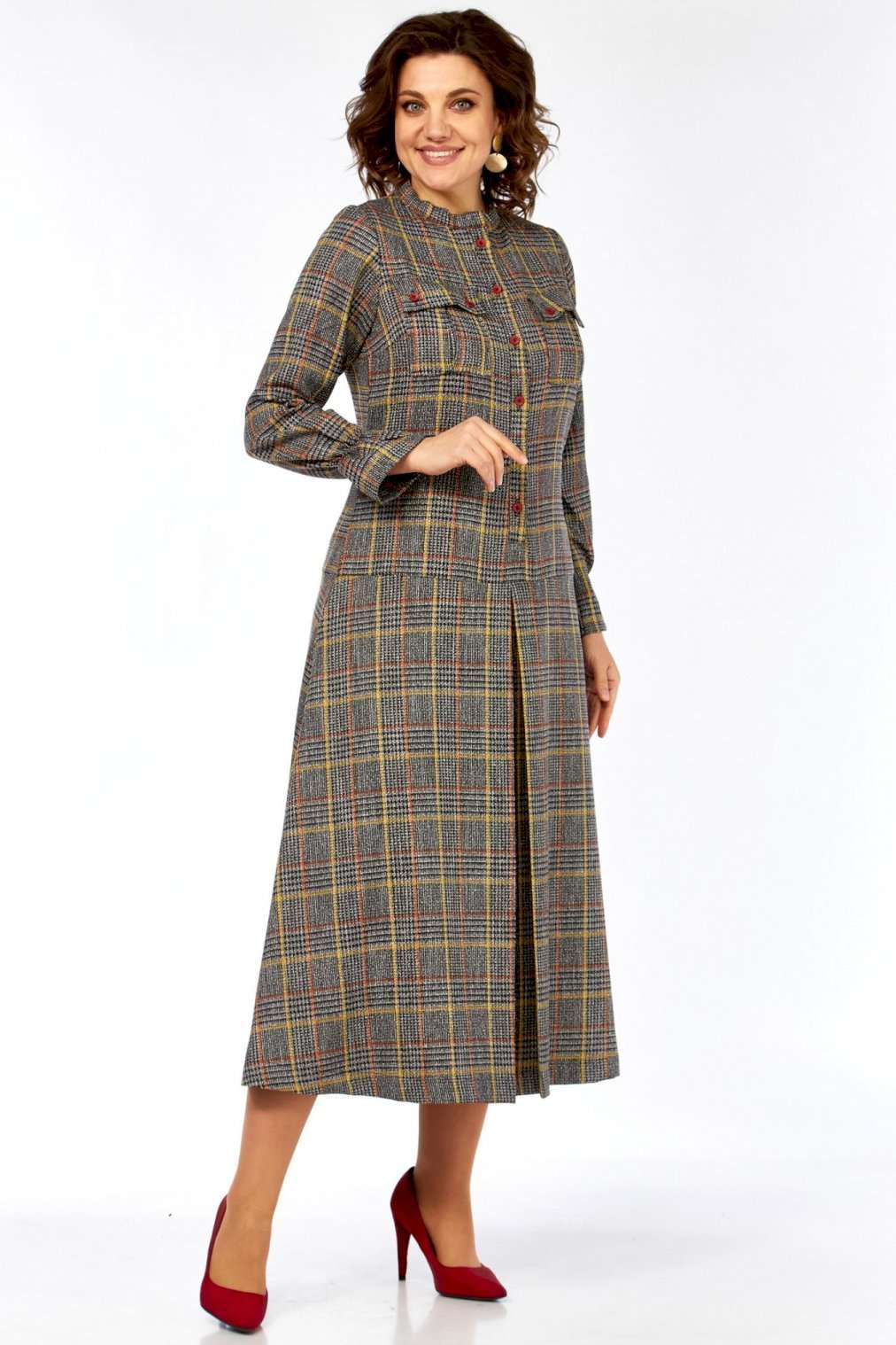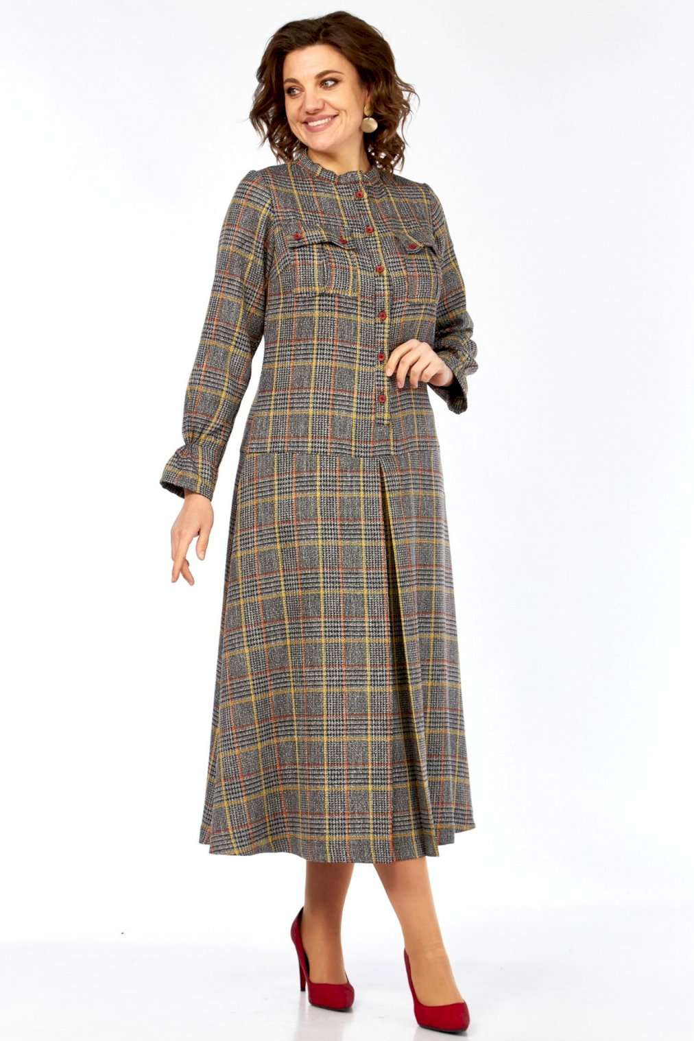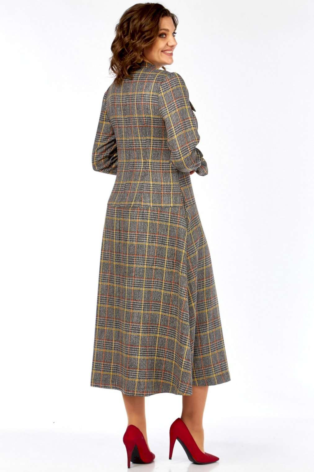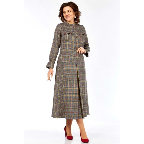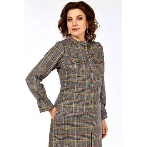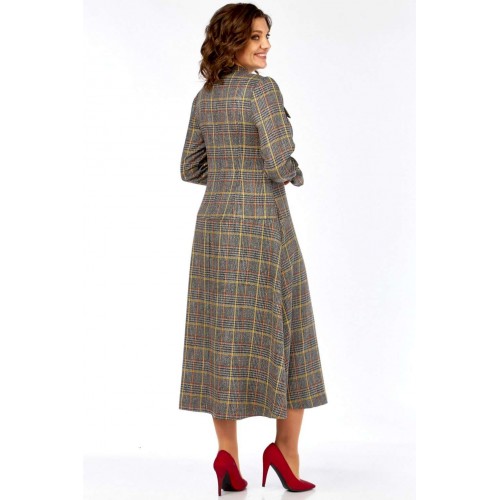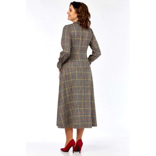Платье А- силуэта в клетку от Celentano. Воротник-стойка, по полочке и спинке идет подрез чуть ниже линии талии, от которого на полочке выполнена встречная складка. Полочка с центральной застежкой на петли-пуговицы, нагрудными вытачками и карманами-хулиганами. Спинка с центральным швом и таллиевыми вытачками. Рукав втачной одношовныйа на конце манжета с легкой сборкой. Длина изделия по спинке 120 см., длина рукава 62 см.