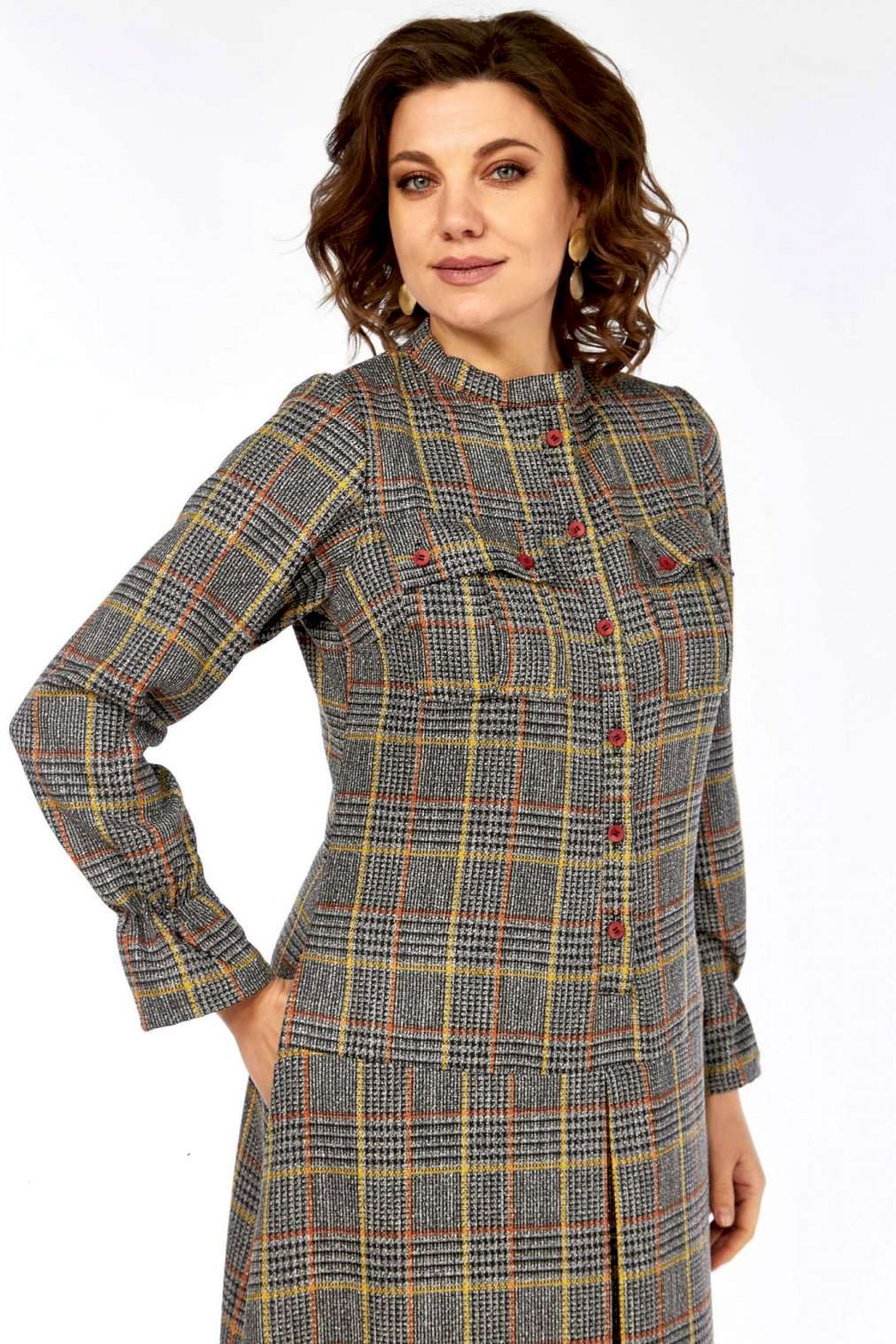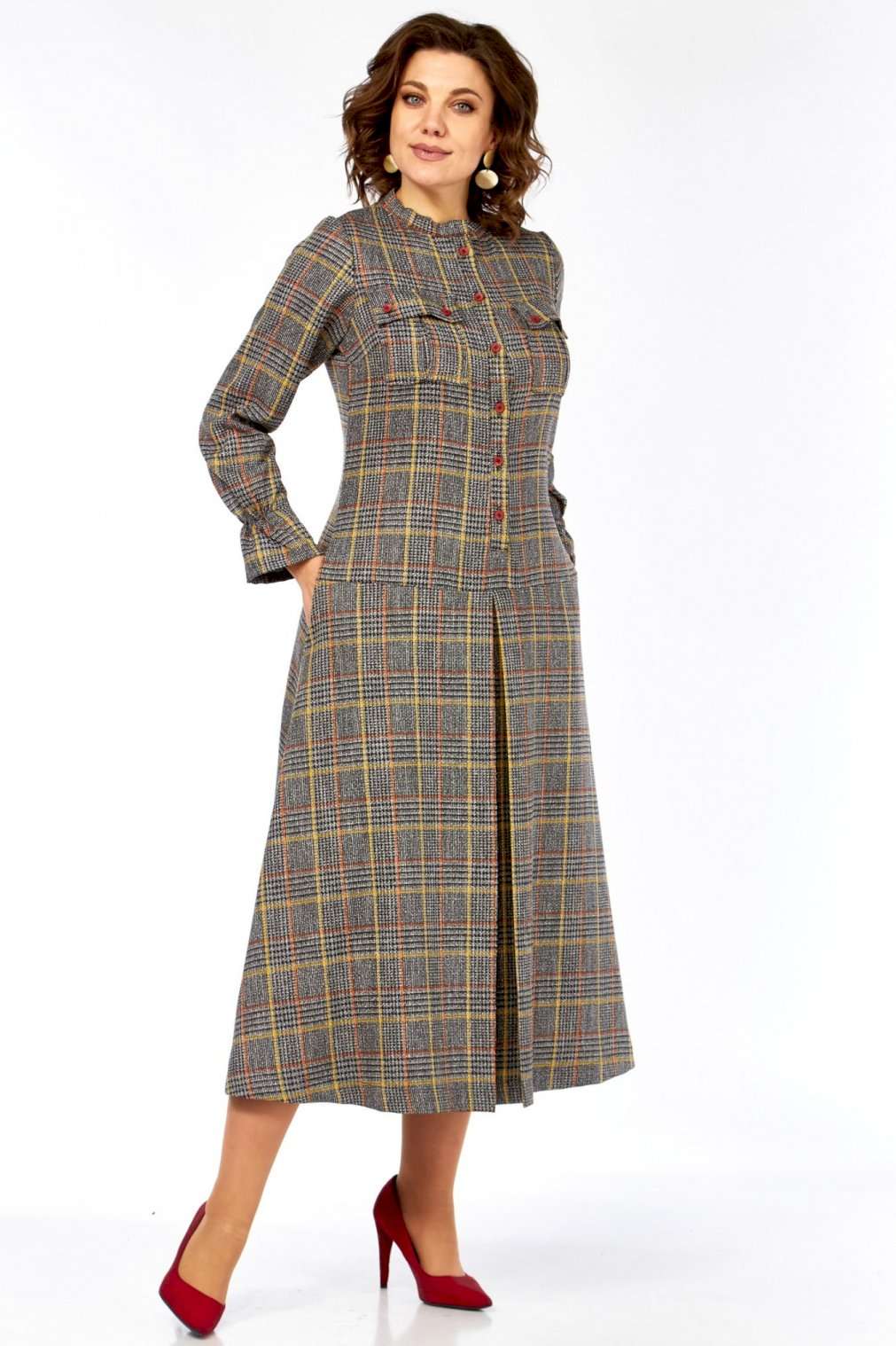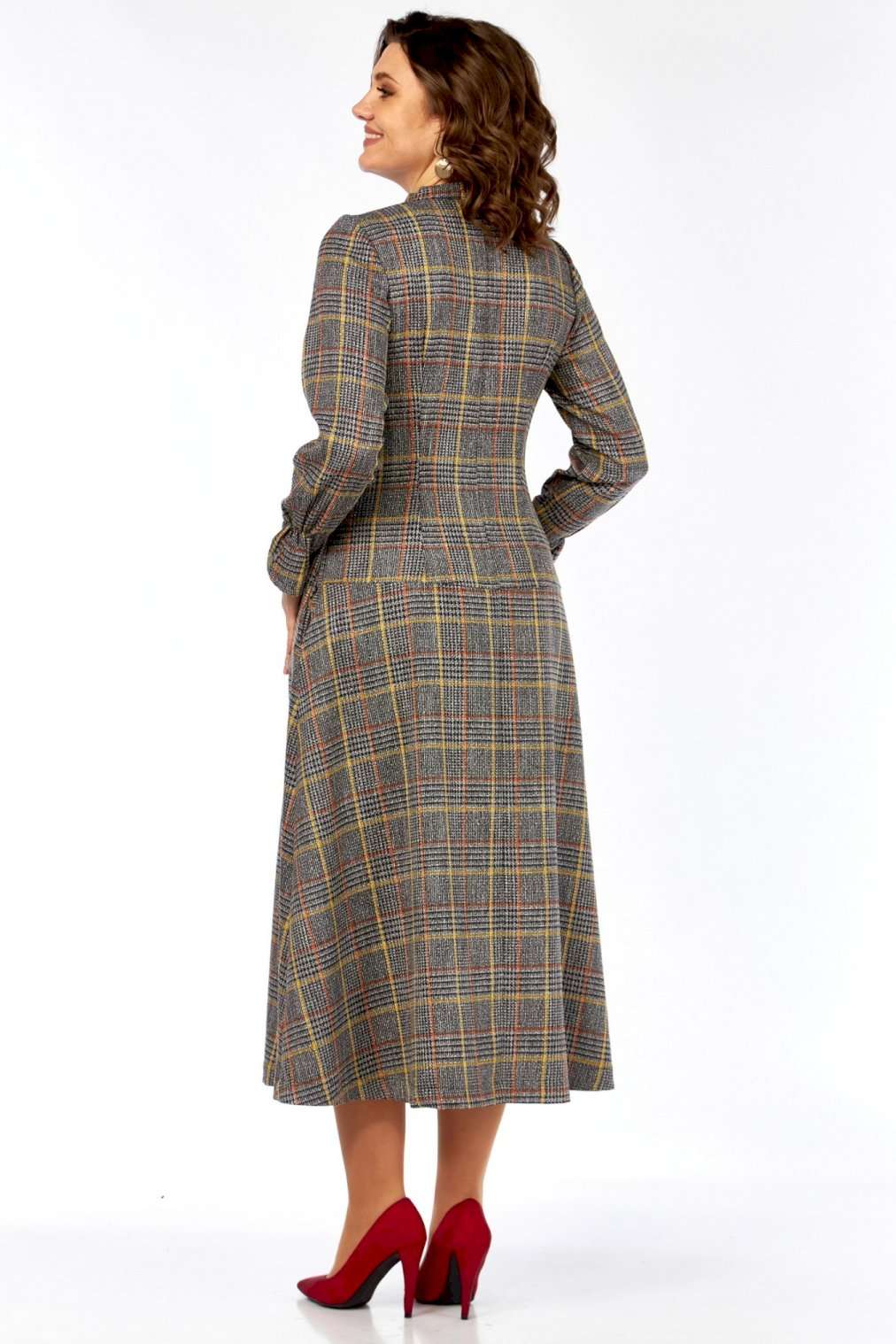 Платье А- силуэта в клетку от Celentano. Воротник-стойка, по полочке и спинке идет подрез чуть ниже линии талии, от которого на полочке выполнена встречная складка. Полочка с центральной застежкой на петли-пуговицы, нагрудными вытачками и карманами-хулиганами. Спинка с центральным швом и таллиевыми вытачками. Рукав втачной одношовныйа на конце манжета с легкой сборкой. Длина изделия по спинке 120 см., длина рукава 62 см.