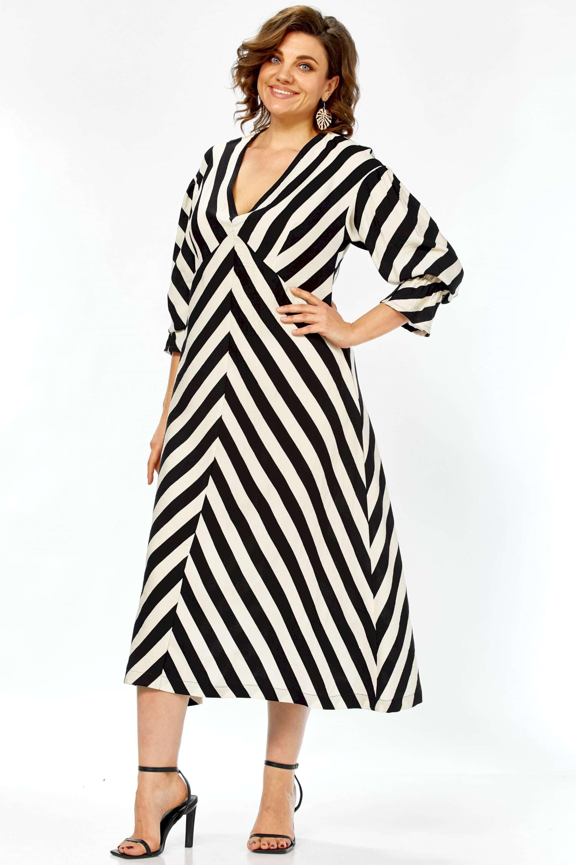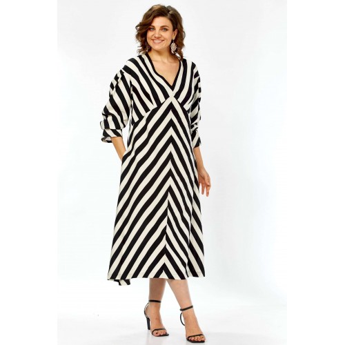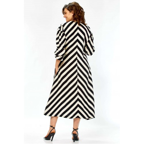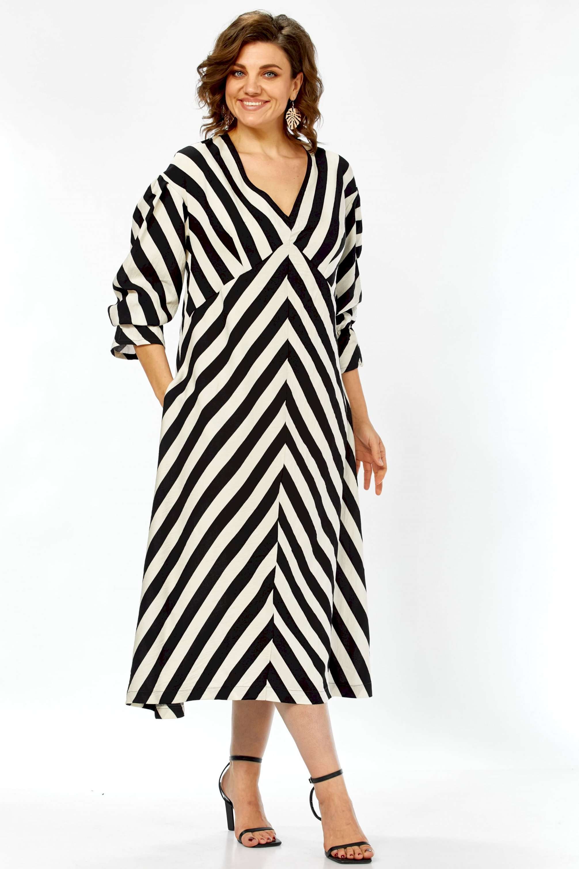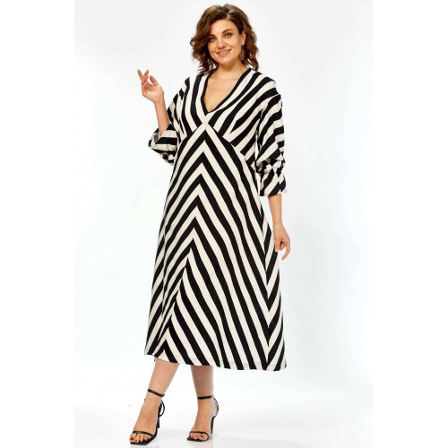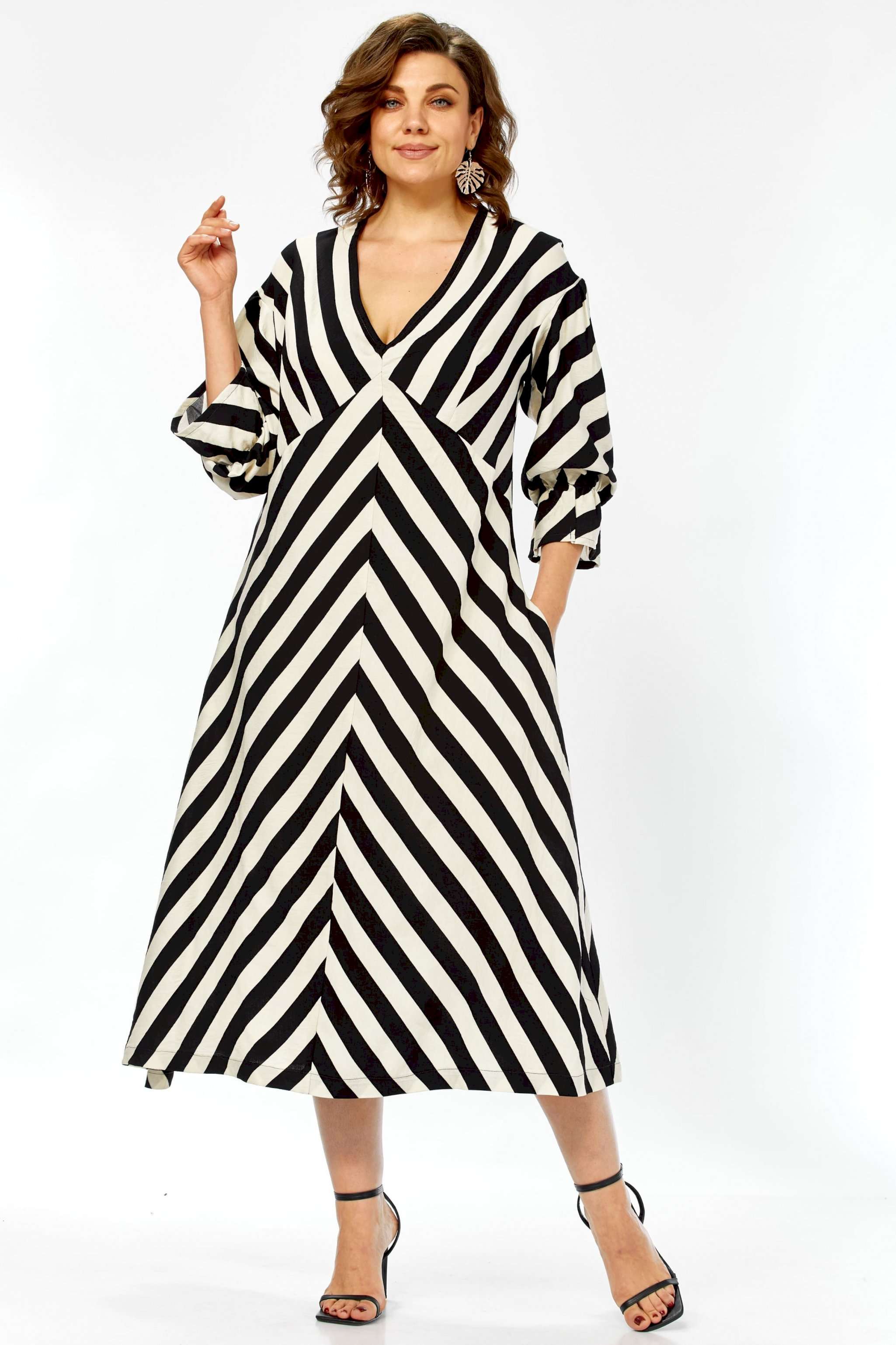 \"\"\"Графический акцент\"\" Это платье — воплощение летней элегантности и комфорта. Созданное из натурального хлопка, оно подарит ощущение легкости и свободы, а благодаря своему выразительному дизайну станет настоящим украшением вашего гардероба. Платье имеет прямой, но свободный силуэт, который создает ощущение непринужденности и комфорта. Оно не сковывает движений, но при этом сохраняет женственность благодаря продуманному крою. Длина — миди, элегантно прикрывающая колени, длина платья составляет 125см, длина рукава 62см Главная изюминка модели — контрастный черно-белый принт в широкую полоску. Уникальность ему придают особым образом расположенные полосы: на лифе они идут по диагонали, а на юбке — вертикально, сходясь по центру передней полочки (полоска не совмещается). Такое расположение полос придает платью графичность и визуально вытягивает силуэт. Детали: • Вырез: Элегантный V-образный вырез декольте создает женственный образ. • Рукава: Оригинальные рукава длиной три четверти выполнены в стиле \"\"фонарик\"\" добавляют образу легкости и романтичности. • Карманы: Удобные прорезные карманы по бокам — практичный элемент, который дополняет свободный стиль платья. • Крой лифа: Вертикальные швы на лифе, где сходятся диагональные полосы, создают акцент и подчеркивают центральную часть. Это платье — идеальный выбор для весенне-летнего сезона. Оно прекрасно подойдет для прогулок, встреч с друзьями, отпуска или для повседневной носки. Благодаря своему яркому принту и натуральной ткани, оно выглядит свежо и стильно. Легко сочетается как с босоножками на каблуке, так и с сандалиями или кедами, позволяя создавать разнообразные образы. Платье подарит ощущение свободы, легкости и уверенности в себе. Это одежда для современной женщины, которая любит привлекать внимание своим стилем, ценит комфорт и выбирает натуральные ткани. Оно выглядит одновременно эффектно и непринужденно.