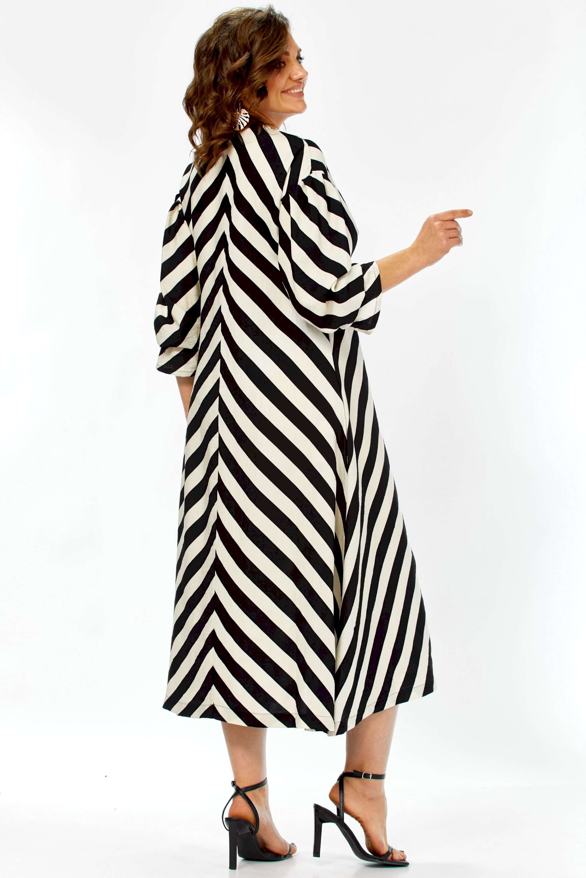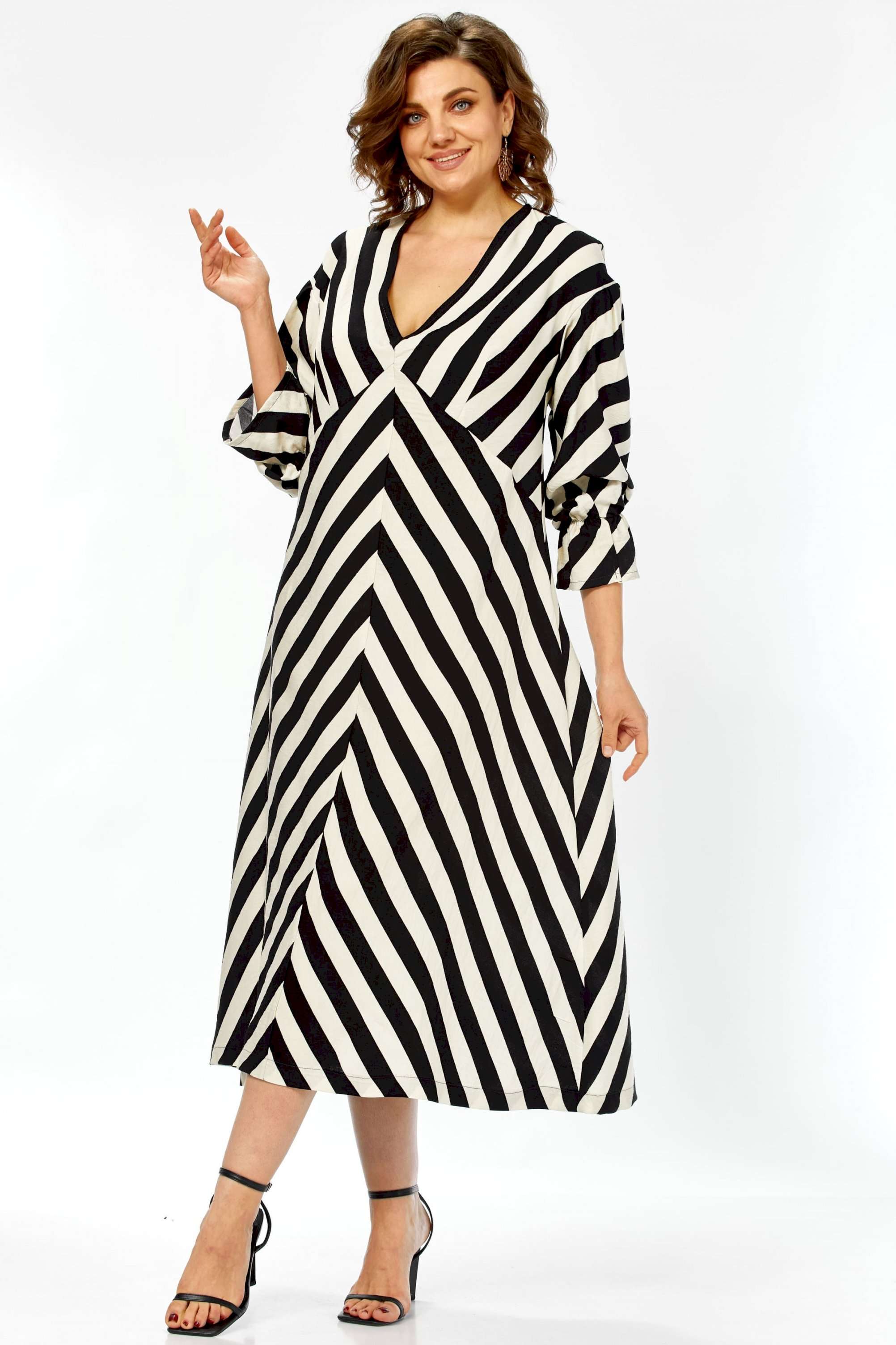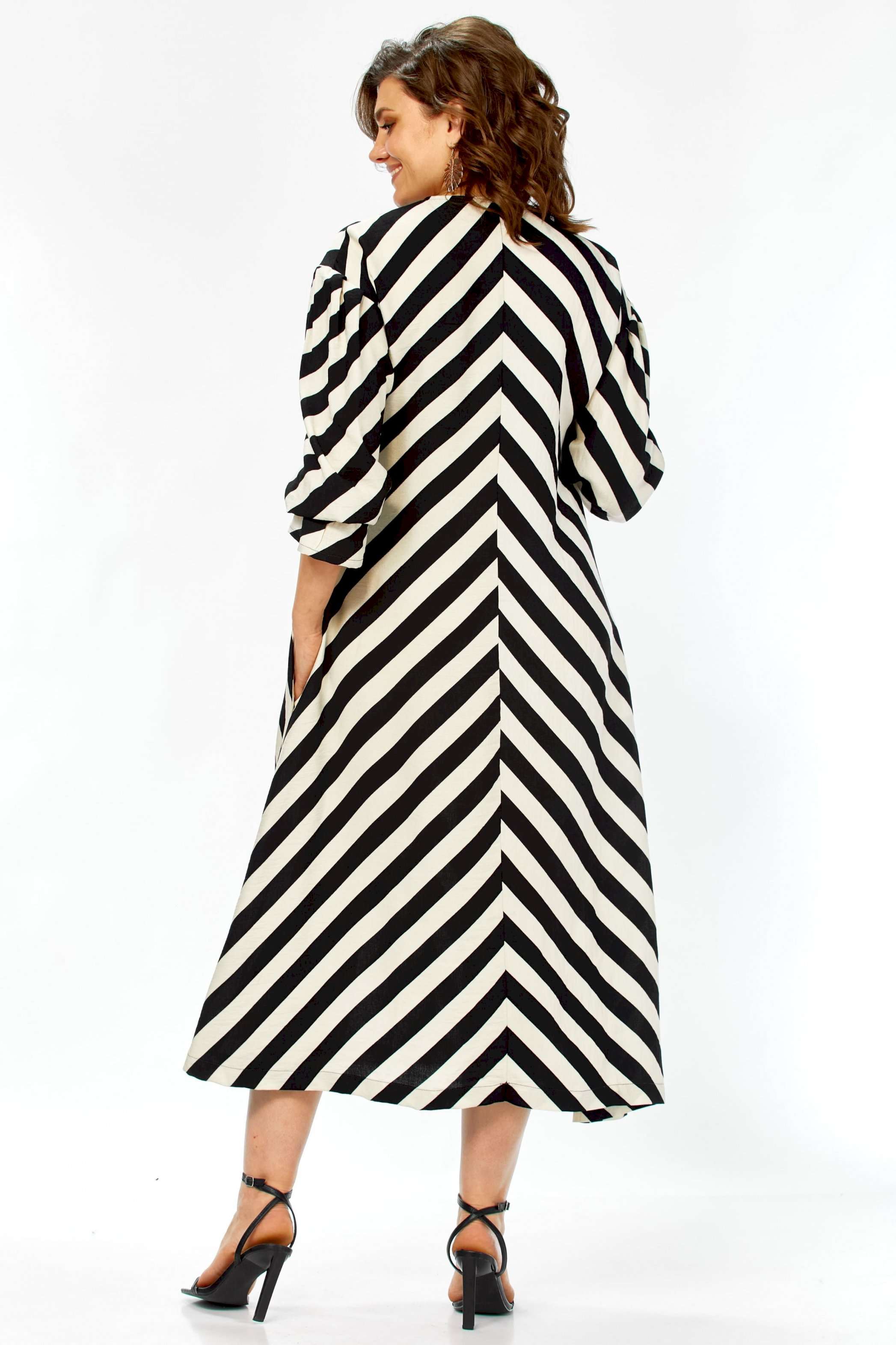 \"\"\"Графический акцент\"\" Это платье — воплощение летней элегантности и комфорта. Созданное из натурального хлопка, оно подарит ощущение легкости и свободы, а благодаря своему выразительному дизайну станет настоящим украшением вашего гардероба. Платье имеет прямой, но свободный силуэт, который создает ощущение непринужденности и комфорта. Оно не сковывает движений, но при этом сохраняет женственность благодаря продуманному крою. Длина — миди, элегантно прикрывающая колени, длина платья составляет 125см, длина рукава 62см Главная изюминка модели — контрастный черно-белый принт в широкую полоску. Уникальность ему придают особым образом расположенные полосы: на лифе они идут по диагонали, а на юбке — вертикально, сходясь по центру передней полочки (полоска не совмещается). Такое расположение полос придает платью графичность и визуально вытягивает силуэт. Детали: • Вырез: Элегантный V-образный вырез декольте создает женственный образ. • Рукава: Оригинальные рукава длиной три четверти выполнены в стиле \"\"фонарик\"\" добавляют образу легкости и романтичности. • Карманы: Удобные прорезные карманы по бокам — практичный элемент, который дополняет свободный стиль платья. • Крой лифа: Вертикальные швы на лифе, где сходятся диагональные полосы, создают акцент и подчеркивают центральную часть. Это платье — идеальный выбор для весенне-летнего сезона. Оно прекрасно подойдет для прогулок, встреч с друзьями, отпуска или для повседневной носки. Благодаря своему яркому принту и натуральной ткани, оно выглядит свежо и стильно. Легко сочетается как с босоножками на каблуке, так и с сандалиями или кедами, позволяя создавать разнообразные образы. Платье подарит ощущение свободы, легкости и уверенности в себе. Это одежда для современной женщины, которая любит привлекать внимание своим стилем, ценит комфорт и выбирает натуральные ткани. Оно выглядит одновременно эффектно и непринужденно.